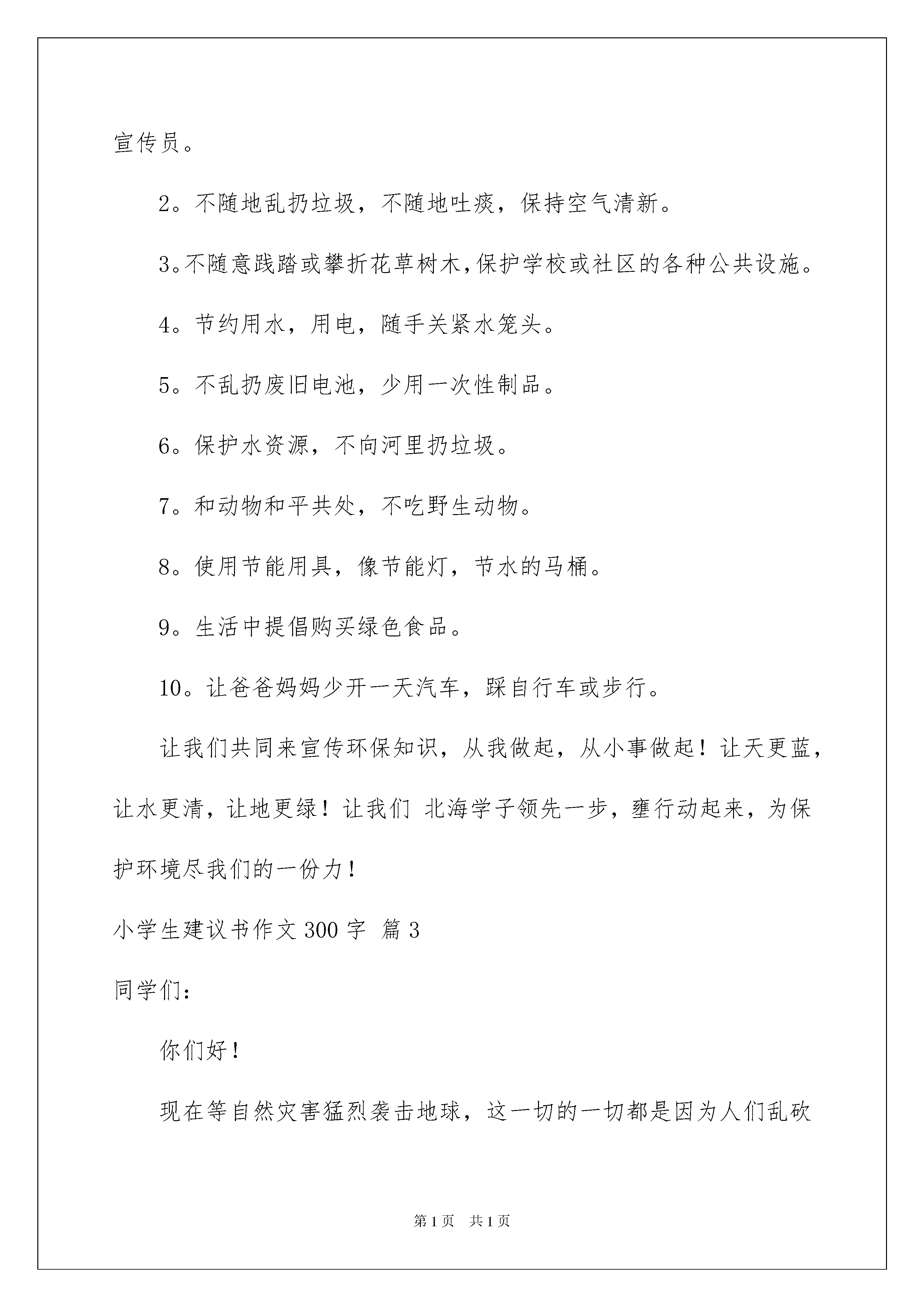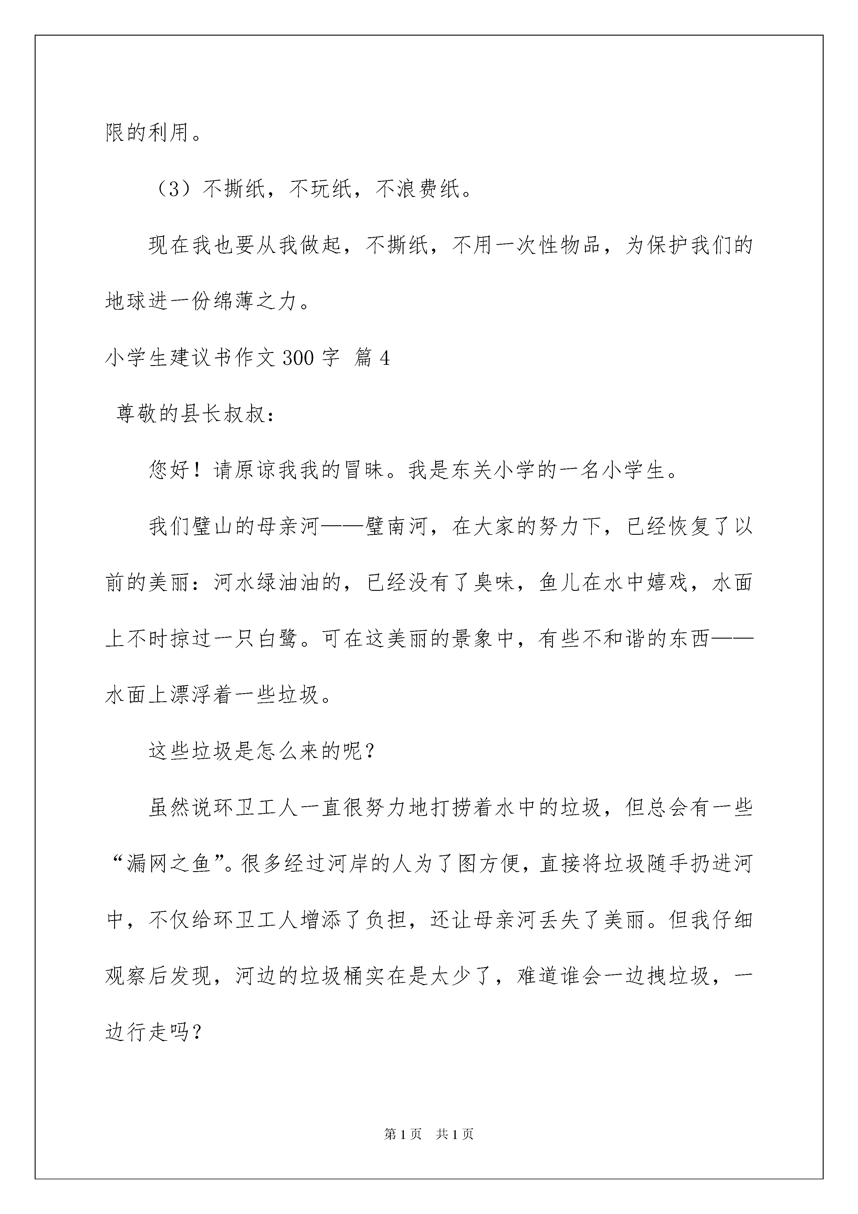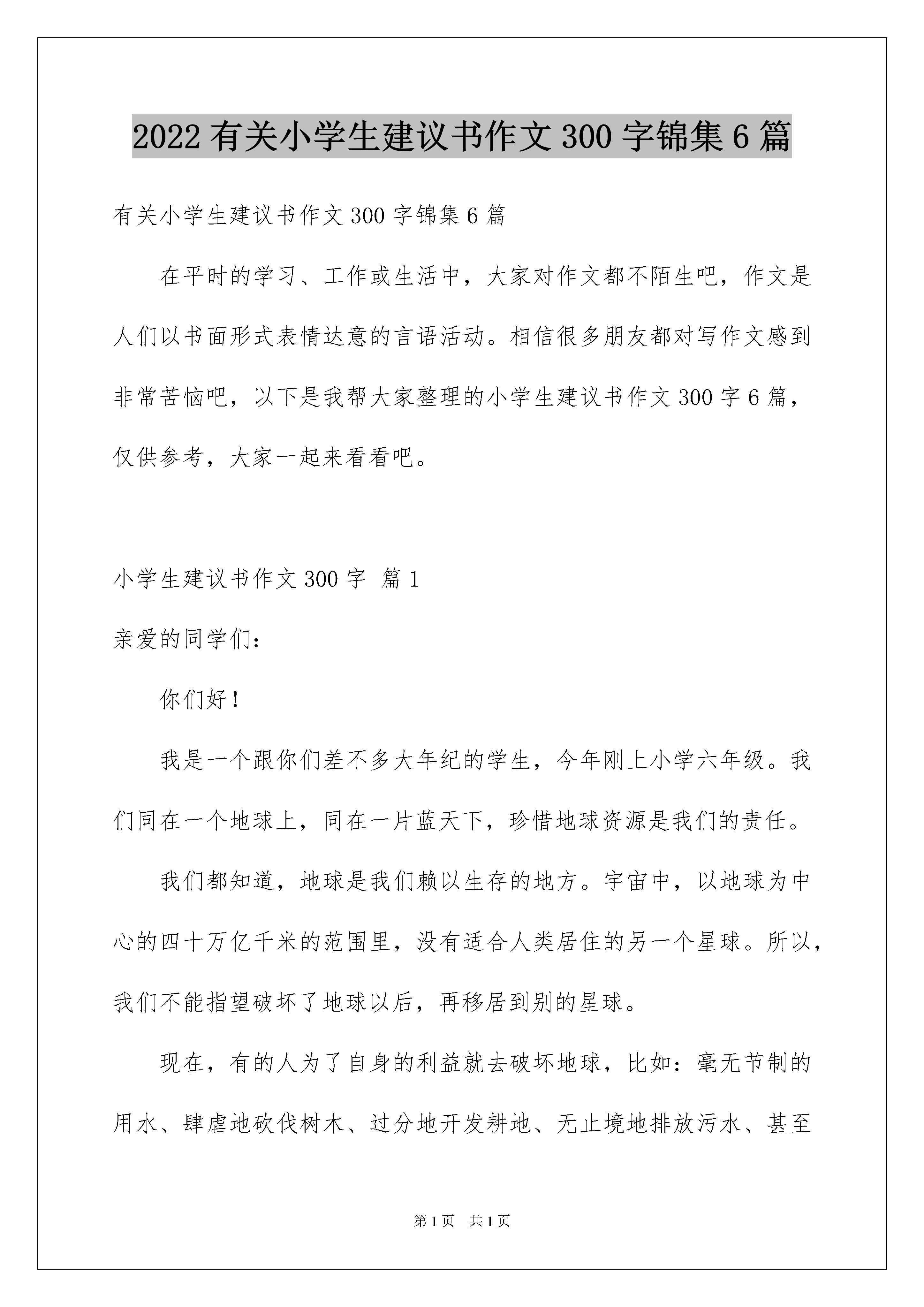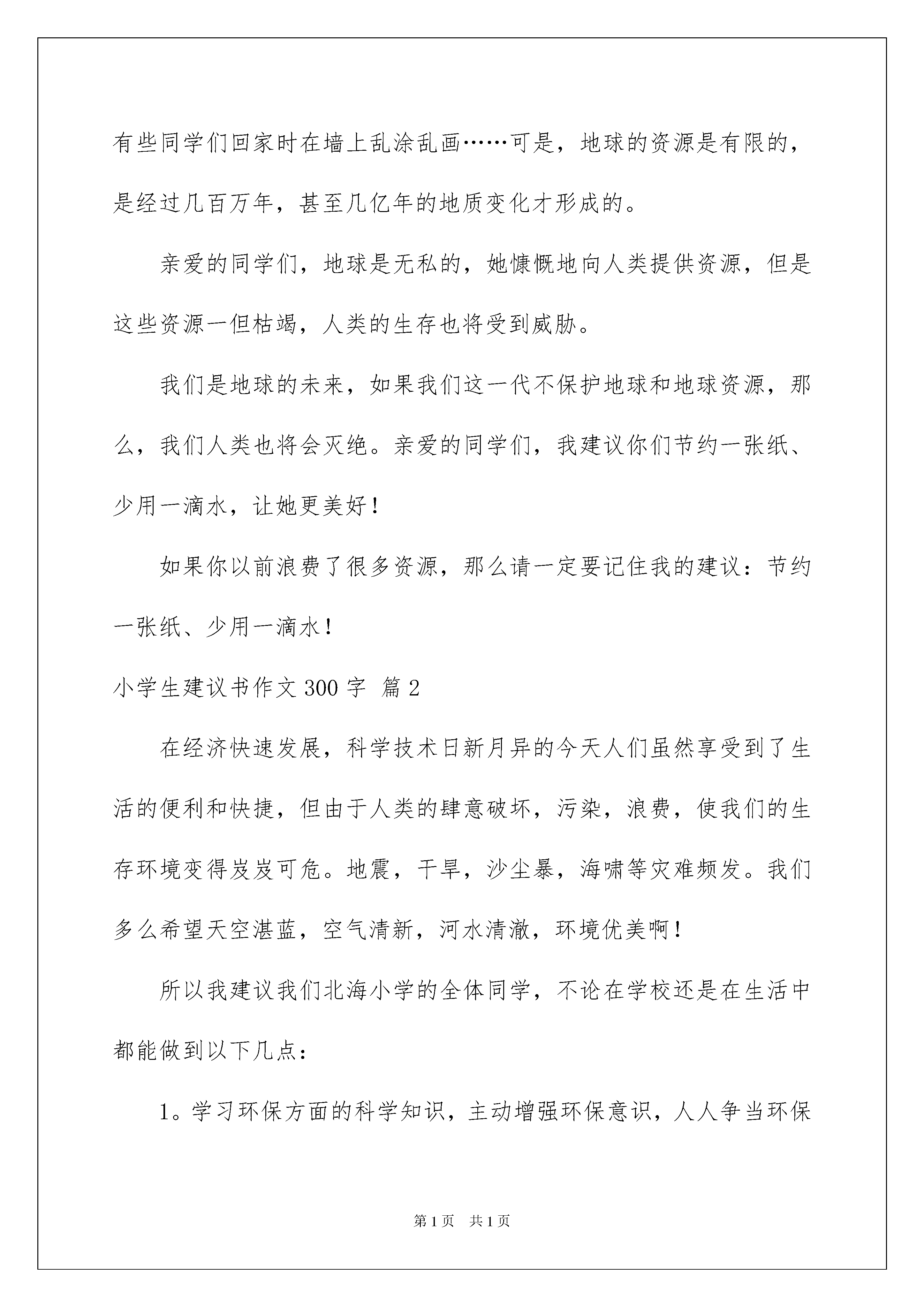 2022有关小学生建议书作文300字锦集6篇有关小学生建议书作文300字锦集6篇在平时的学习、工作或生活中,大家对作文都不陌生吧,作文是人们以书面形式表情达意的言语活动。相信很多朋友都对写作文感到非常苦恼吧,以下是我帮大家整理的小学生建议书作文300字6篇,仅供参考,大家一起来看看吧。小学生建议书作文300字篇1亲爱的同学们:你们好!我是一个跟你们差不多大年纪的学生,今年刚上小学六年级。我们同在一个地球上,同在一片蓝天下,珍惜地球资源是我们的责任。我们都知道,地球是我们赖以生存的地方。宇宙中,以地球为中心的四十万亿千米的范围里,没有适合人类居住的另一个星球。所以,我们不能指望破坏了地球以后,再移居到别的星球。现在,有的人为了自身的利益就去破坏地球,比如:毫无节制的用水、肆虐地砍伐树木、过分地开发耕地、无止境地排放污水、甚至有些同学们回家时在墙上乱涂乱画……可是,地球的资源是有限的,是经过几百万年,甚至几亿年的地质变化才形成的。亲爱的同学们,地球是无私的,她慷慨地向人类提供资源,但是这些资源一但枯竭,人类的生存也将受到威胁。我们是地球的未来,如果我们这一代不保护地球和地球资源,那么,我们人类也将会灭绝。亲爱的同学们,我建议你们节约一张纸、少用一滴水,让她更美好!如果你以前浪费了很多资源,那么请一定要记住我的建议:节约一张纸、少用一滴水!小学生建议书作文300字篇2在经济快速发展,科学技术日新月异的今天人们虽然享受到了生活的便利和快捷,但由于人类的肆意破坏,污染,浪费,使我们的生存环境变得岌岌可危。地震,干旱,沙尘暴,海啸等灾难频发。我们多么希望天空湛蓝,空气清新,河水清澈,环境优美啊!所以我建议我们北海小学的全体同学,不论在学校还是在生活中都能做到以下几点:1。学习环保方面的科学知识,主动增强环保意识,人人争当环保宣传员。2。不随地乱扔垃圾,不随地吐痰,保持空气清新。3。不随意践踏或攀折花草树木,保护学校或社区的各种公共设施。4。节约用水,用电,随手关紧水笼头。5。不乱扔废旧电池,少用一次性制品。6。保护水资源,不向河里扔垃圾。7。和动物和平共处,不吃野生动物。8。使用节能用具,像节能灯,节水的马桶。9。生活中提倡购买绿色食品。10。让爸爸妈妈少开一天汽车,踩自行车或步行。让我们共同来宣传环保知识,从我做起,从小事做起!让天更蓝,让水更清,让地更绿!让我们北海学子领先一步,壅行动起来,为保护环境尽我们的一份力!小学生建议书作文300字篇3同学们:你们好!现在等自然灾害猛烈袭击地球,这一切的一切都是因为人们乱砍乱伐所造成的后果。过去,人类为了追求自己的利益乱砍乱伐,使得森林资源越来越少,令水土大面积流失,使洪水,温室效应,狂风,沙尘暴泛滥造成了不可挽回的损失。现如今,人们已经认识到森林资源的重要性。大批大批的人投入到栽树的行列中,有些人甚至不惜一切代价花钱请人来栽树;有些人为了保护森林资源献出了宝贵的生命;有些人从乱砍滥伐的行列中重新加入到栽树的行列中……在此我为保护森林提几点建议:(1)少盖木头房子,盖房子尽量用砖瓦作材料。(2)如果一定需要木材,砍一棵树,种一棵树,实现青山常在。(3)不乱扔废电池,研究证明,一节一号电池可使一平方米的土地失去利用价值,并造成永久性公害。在身边我要从我做起:(1)少用或不用一次性用品,一来可以保护木材,二来也可以保护我们的健康。(2)废纸不要扔,送到造纸厂做成再生纸,实现有限的资源,无限的利用。(3)不撕纸,不玩纸,不浪费纸。现在我也要从我做起,不撕纸,不用一次性物品,为保护我们的地球进一份绵薄之力。小学生建议书作文300字篇4尊敬的县长叔叔:您好!请原谅我我的冒昧。我是东关小学的一名小学生。我们璧山的母亲河——璧南河,在大家的努力下,已经恢复了以前的美丽:河水绿油油的,已经没有了臭味,鱼儿在水中嬉戏,水面上不时掠过一只白鹭。可在这美丽的景象中,有些不和谐的东西——水面上漂浮着一些垃圾。这些垃圾是怎么来的呢?虽然说环卫工人一直很努力地打捞着水中的垃圾,但总会有一些“漏网之鱼”。很多经过河岸的人为了图方便,直接将垃圾随手扔进河中,不仅给环卫工人增添了负担,还让母亲河丢失了美丽。但我仔细观察后发现,河边的垃圾桶实在是太少了,难道谁会一边拽垃圾,一边行走吗?所以,我建议,在璧南河两岸多安装一些垃圾桶,这些垃圾桶可以设小些,但要涂上醒目的'颜色,而且要经常倒垃圾,以免垃圾发臭。最好还在桥的护栏上安一些较醒目的小牌子,上面写上提示语,比如:“母亲河不是垃圾桶”、“为了母亲河永远美丽,请勿往河中扔垃圾。”我相信那些人是乐意接受的。为了璧南河的美丽,我希