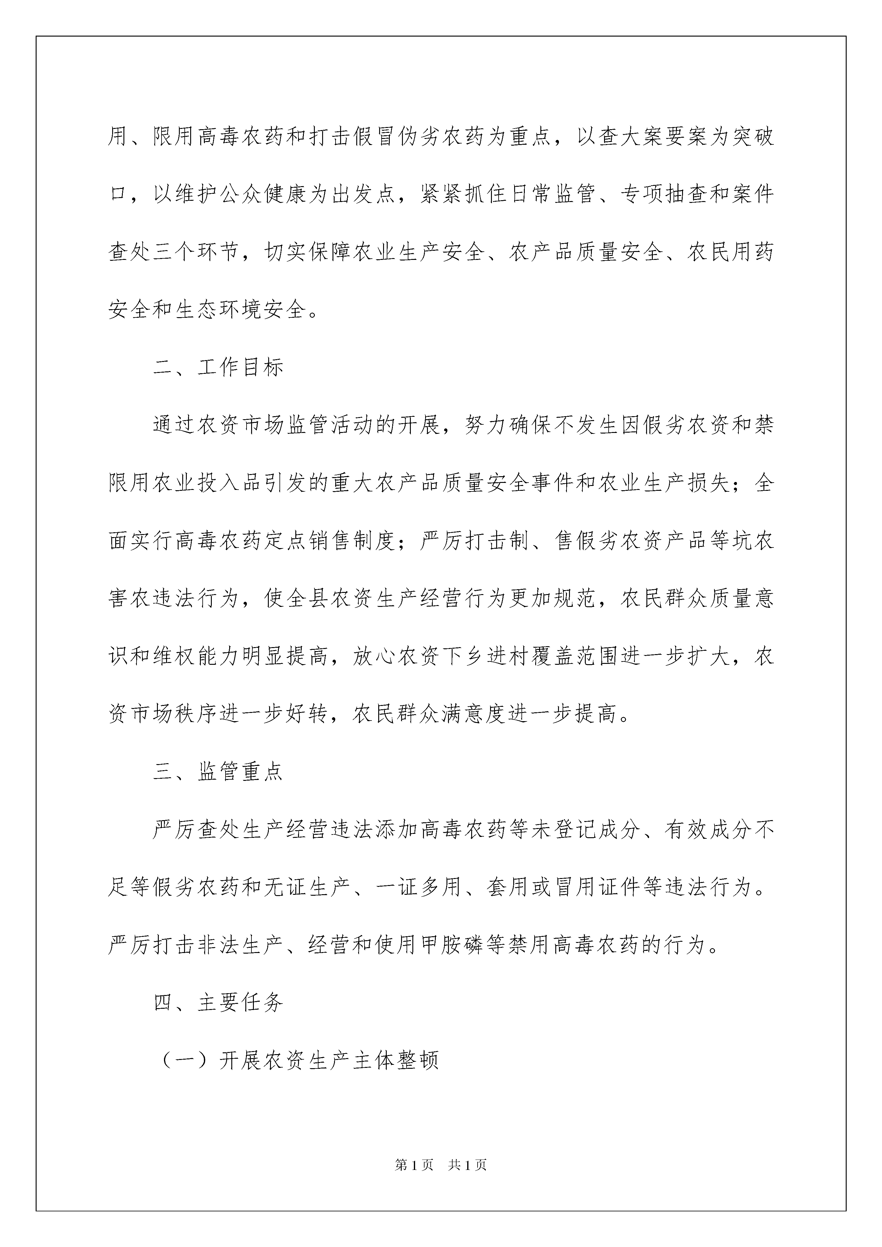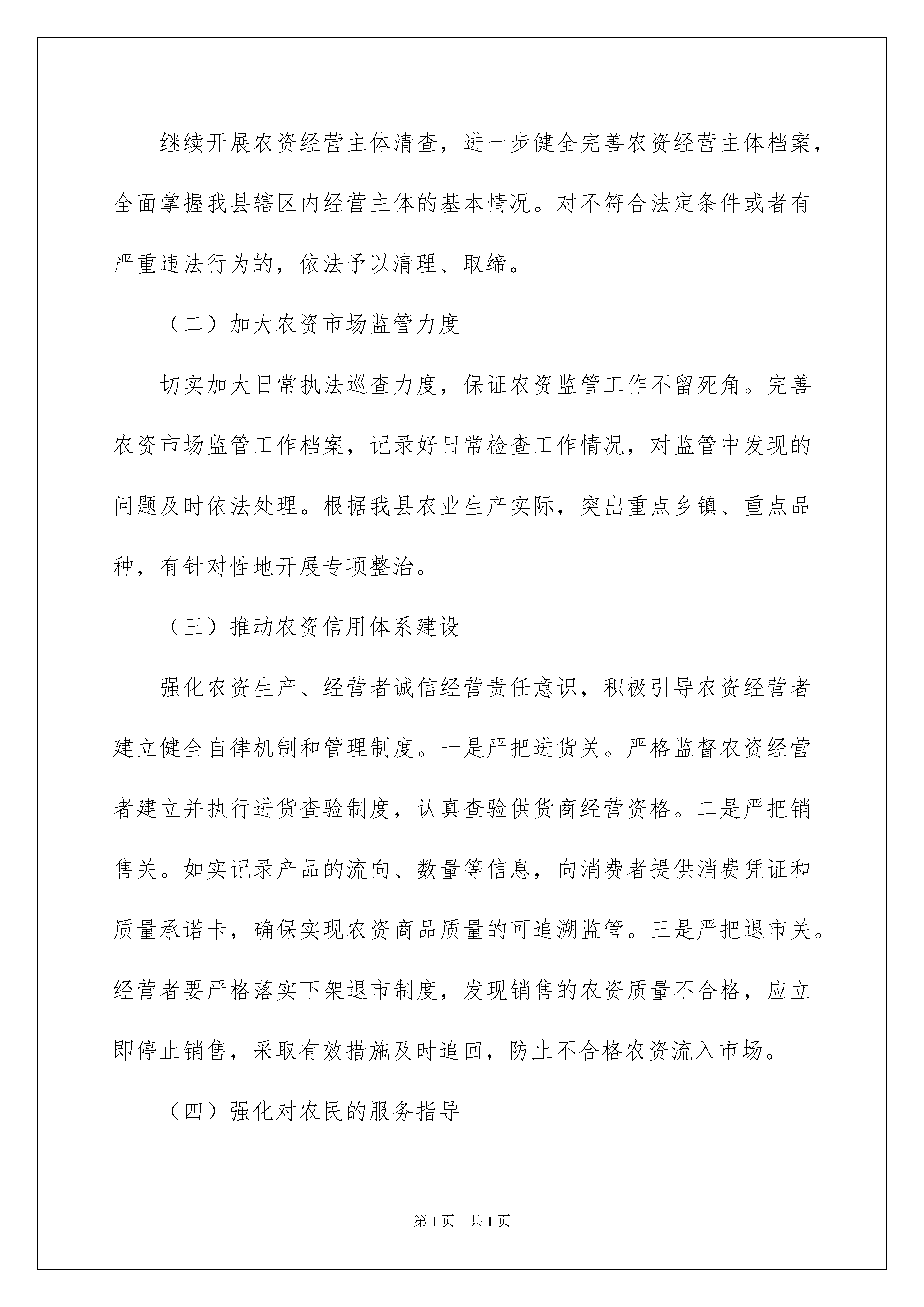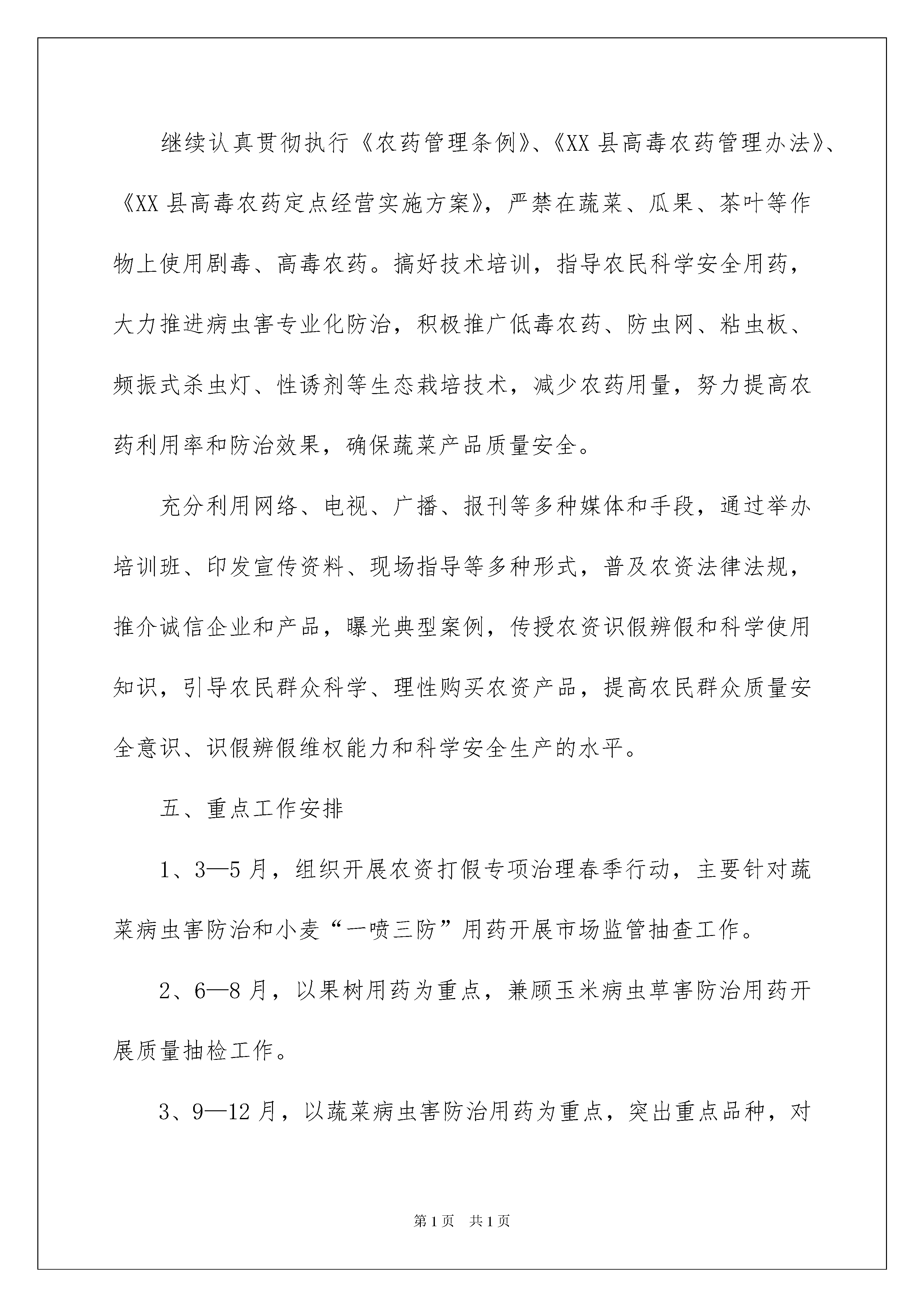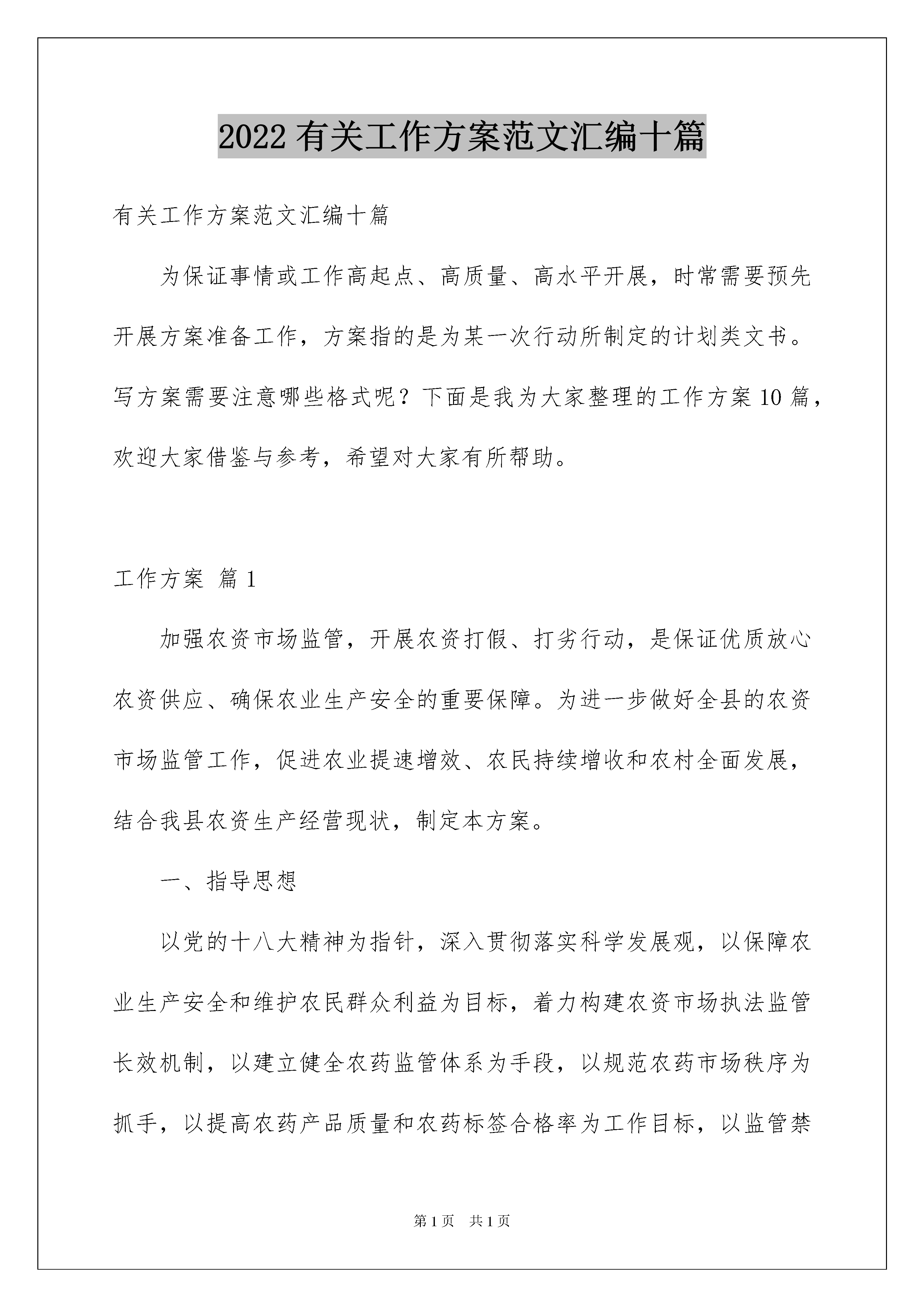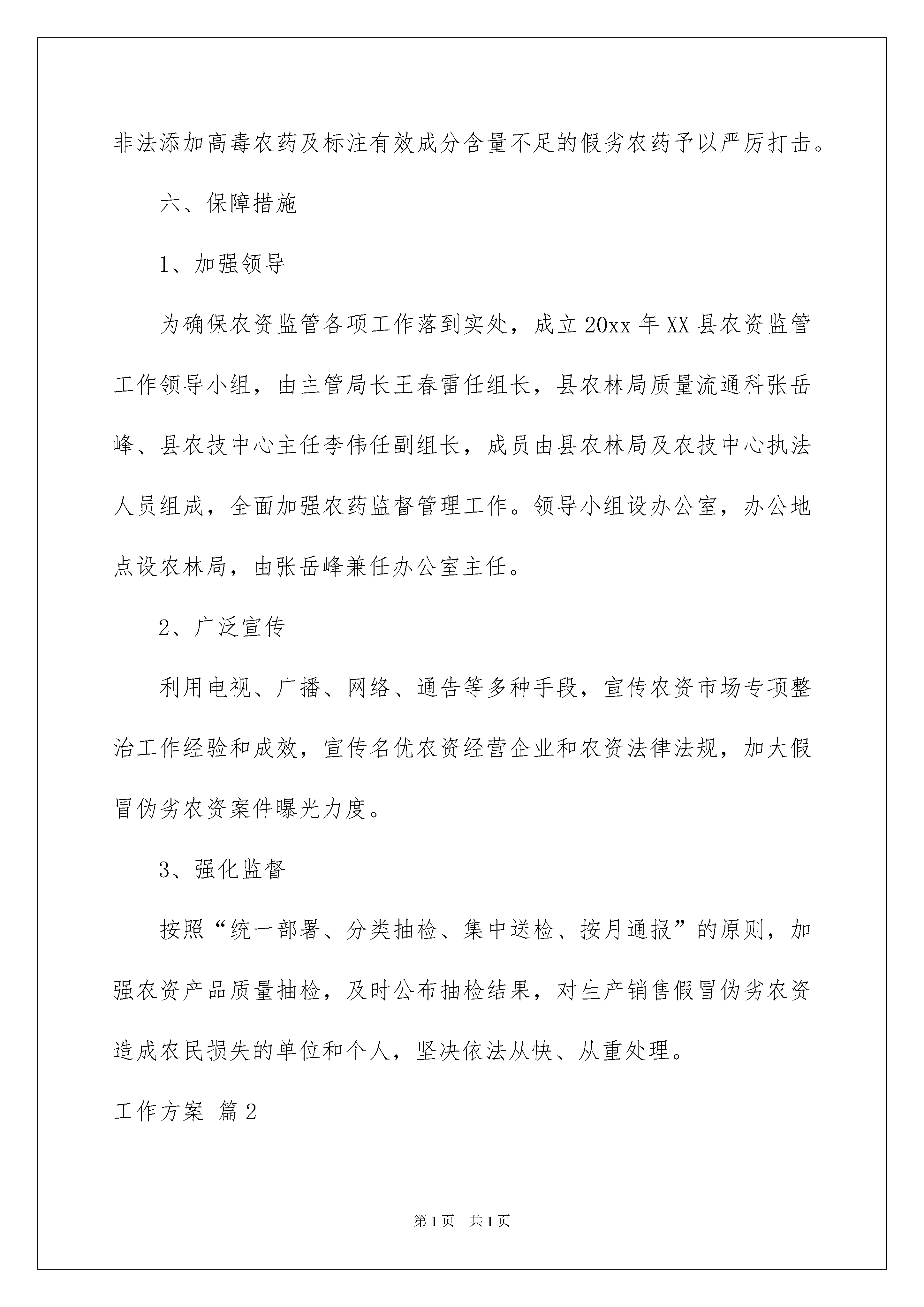 2022有关工作方案范文汇编十篇有关工作方案范文汇编十篇为保证事情或工作高起点、高质量、高水平开展,时常需要预先开展方案准备工作,方案指的是为某一次行动所制定的计划类文书。写方案需要注意哪些格式呢?下面是我为大家整理的工作方案10篇,欢迎大家借鉴与参考,希望对大家有所帮助。工作方案篇1加强农资市场监管,开展农资打假、打劣行动,是保证优质放心农资供应、确保农业生产安全的重要保障。为进一步做好全县的农资市场监管工作,促进农业提速增效、农民持续增收和农村全面发展,结合我县农资生产经营现状,制定本方案。一、指导思想以党的十八大精神为指针,深入贯彻落实科学发展观,以保障农业生产安全和维护农民群众利益为目标,着力构建农资市场执法监管长效机制,以建立健全农药监管体系为手段,以规范农药市场秩序为抓手,以提高农药产品质量和农药标签合格率为工作目标,以监管禁用、限用高毒农药和打击假冒伪劣农药为重点,以查大案要案为突破口,以维护公众健康为出发点,紧紧抓住日常监管、专项抽查和案件查处三个环节,切实保障农业生产安全、农产品质量安全、农民用药安全和生态环境安全。二、工作目标通过农资市场监管活动的开展,努力确保不发生因假劣农资和禁限用农业投入品引发的重大农产品质量安全事件和农业生产损失;全面实行高毒农药定点销售制度;严厉打击制、售假劣农资产品等坑农害农违法行为,使全县农资生产经营行为更加规范,农民群众质量意识和维权能力明显提高,放心农资下乡进村覆盖范围进一步扩大,农资市场秩序进一步好转,农民群众满意度进一步提高。三、监管重点严厉查处生产经营违法添加高毒农药等未登记成分、有效成分不足等假劣农药和无证生产、一证多用、套用或冒用证件等违法行为。严厉打击非法生产、经营和使用甲胺磷等禁用高毒农药的行为。四、主要任务(一)开展农资生产主体整顿继续开展农资经营主体清查,进一步健全完善农资经营主体档案,全面掌握我县辖区内经营主体的基本情况。对不符合法定条件或者有严重违法行为的,依法予以清理、取缔。(二)加大农资市场监管力度切实加大日常执法巡查力度,保证农资监管工作不留死角。完善农资市场监管工作档案,记录好日常检查工作情况,对监管中发现的问题及时依法处理。根据我县农业生产实际,突出重点乡镇、重点品种,有针对性地开展专项整治。(三)推动农资信用体系建设强化农资生产、经营者诚信经营责任意识,积极引导农资经营者建立健全自律机制和管理制度。一是严把进货关。严格监督农资经营者建立并执行进货查验制度,认真查验供货商经营资格。二是严把销售关。如实记录产品的流向、数量等信息,向消费者提供消费凭证和质量承诺卡,确保实现农资商品质量的可追溯监管。三是严把退市关。经营者要严格落实下架退市制度,发现销售的农资质量不合格,应立即停止销售,采取有效措施及时追回,防止不合格农资流入市场。(四)强化对农民的服务指导继续认真贯彻执行《农药管理条例》、《XX县高毒农药管理办法》、《XX县高毒农药定点经营实施方案》,严禁在蔬菜、瓜果、茶叶等作物上使用剧毒、高毒农药。搞好技术培训,指导农民科学安全用药,大力推进病虫害专业化防治,积极推广低毒农药、防虫网、粘虫板、频振式杀虫灯、性诱剂等生态栽培技术,减少农药用量,努力提高农药利用率和防治效果,确保蔬菜产品质量安全。充分利用网络、电视、广播、报刊等多种媒体和手段,通过举办培训班、印发宣传资料、现场指导等多种形式,普及农资法律法规,推介诚信企业和产品,曝光典型案例,传授农资识假辨假和科学使用知识,引导农民群众科学、理性购买农资产品,提高农民群众质量安全意识、识假辨假维权能力和科学安全生产的水平。五、重点工作安排1、3—5月,组织开展农资打假专项治理春季行动,主要针对蔬菜病虫害防治和小麦“一喷三防”用药开展市场监管抽查工作。2、6—8月,以果树用药为重点,兼顾玉米病虫草害防治用药开展质量抽检工作。3、9—12月,以蔬菜病虫害防治用药为重点,突出重点品种,对非法添加高毒农药及标注有效成分含量不足的假劣农药予以严厉打击。六、保障措施1、加强领导为确保农资监管各项工作落到实处,成立20xx年XX县农资监管工作领导小组,由主管局长王春雷任组长,县农林局质量流通科张岳峰、县农技中心主任李伟任副组长,成员由县农林局及农技中心执法人员组成,全面加强农药监督管理工作。领导小组设办公室,办公地点设农林局,由张岳峰兼任办公室主任。2、广泛宣传利用电视、广播、网络、通告等多种手段,宣传农资市场专项整治工作经验和成效,宣传名优农资经营企业和农资法律法规,加大假冒伪劣农资案件曝光力度。3、强化监督按照“统一部署、分类抽检、集中送检、按月通报”