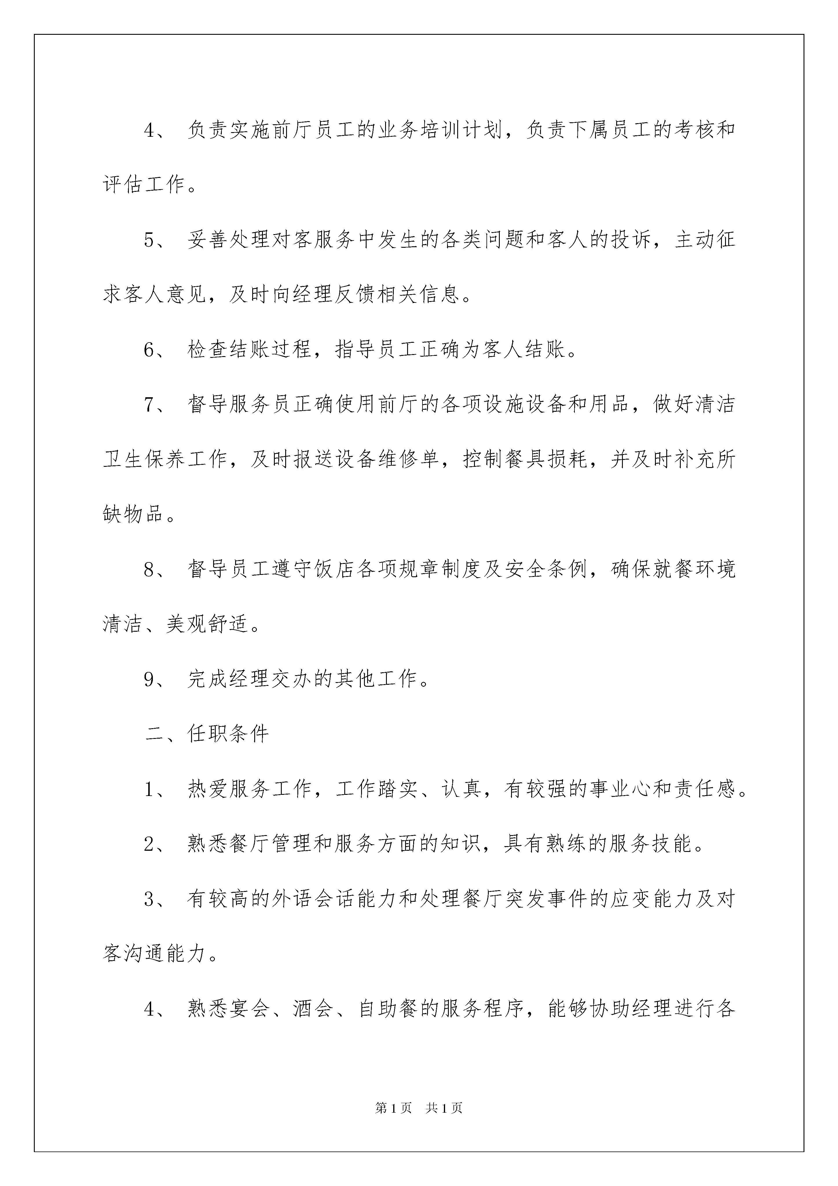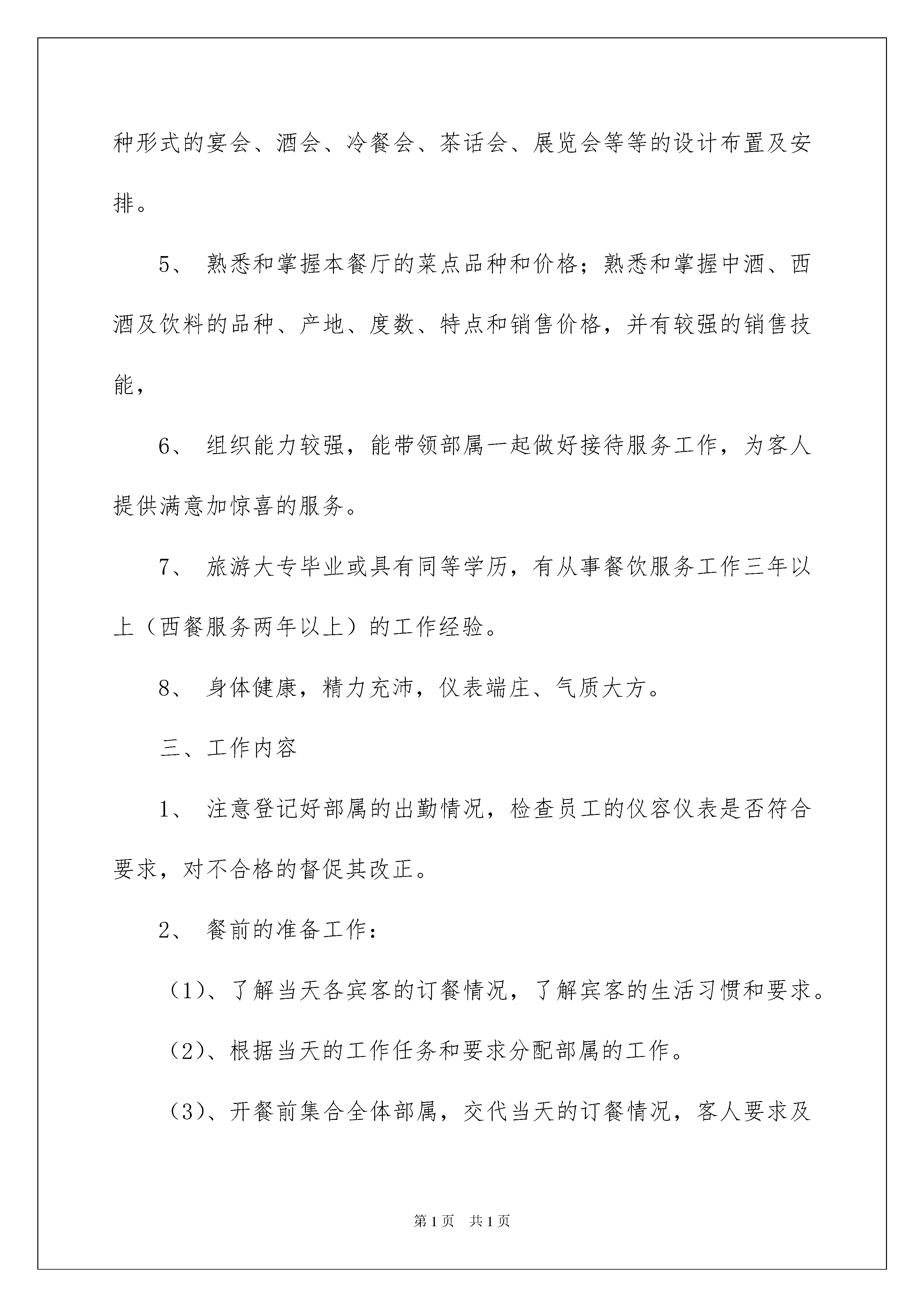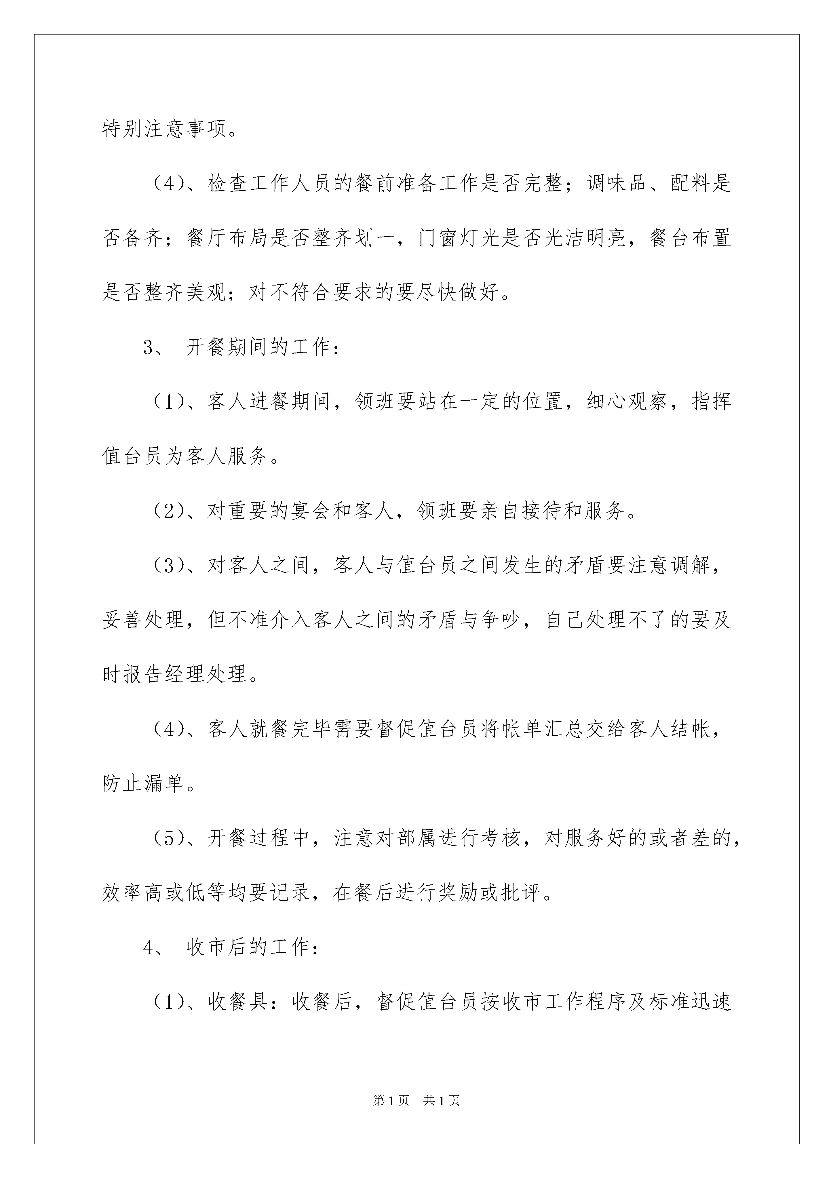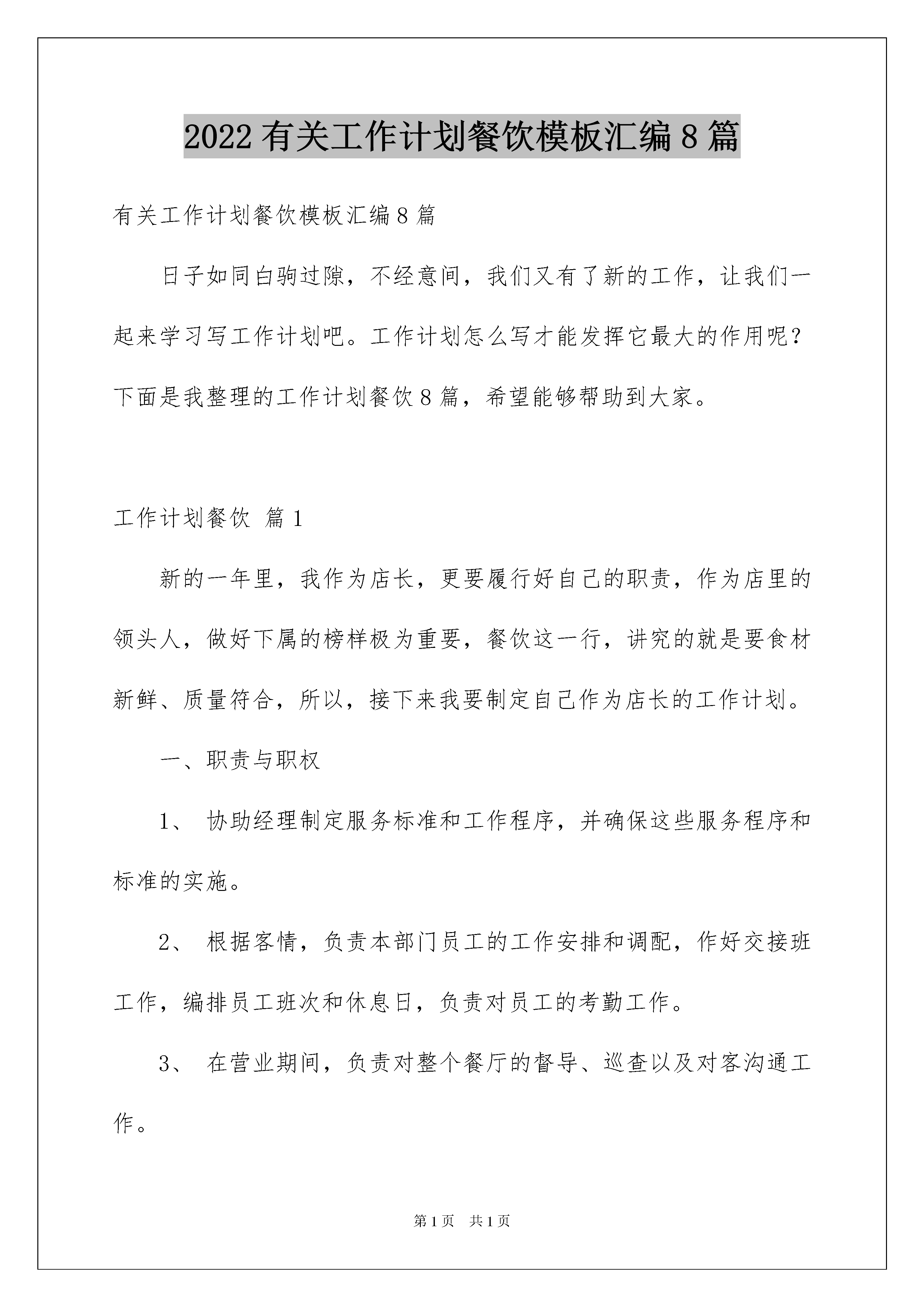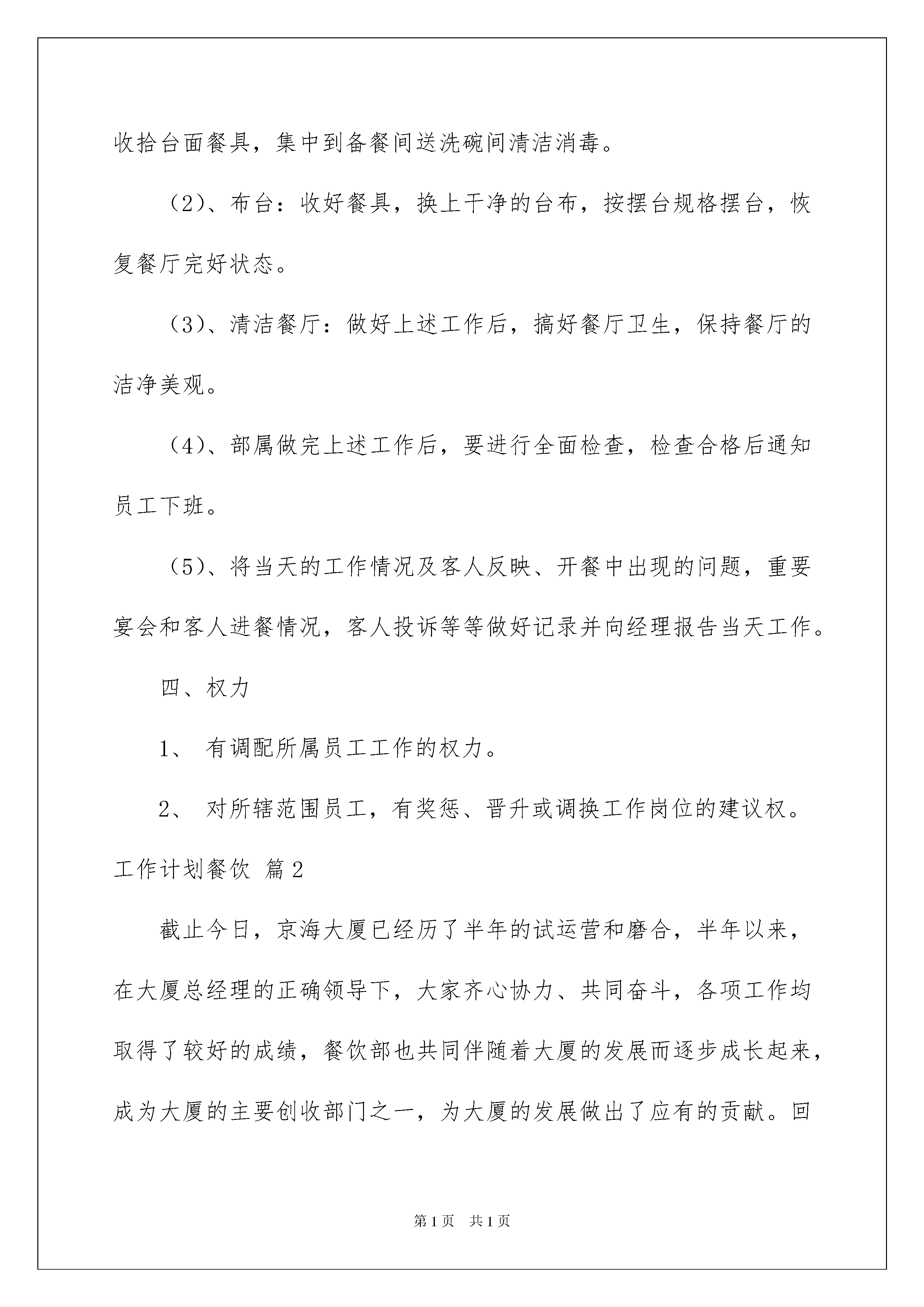 2022有关工作计划餐饮模板汇编8篇有关工作计划餐饮模板汇编8篇日子如同白驹过隙,不经意间,我们又有了新的工作,让我们一起来学习写工作计划吧。工作计划怎么写才能发挥它最大的作用呢?下面是我整理的工作计划餐饮8篇,希望能够帮助到大家。工作计划餐饮篇1新的一年里,我作为店长,更要履行好自己的职责,作为店里的领头人,做好下属的榜样极为重要,餐饮这一行,讲究的就是要食材新鲜、质量符合,所以,接下来我要制定自己作为店长的工作计划。一、职责与职权1、协助经理制定服务标准和工作程序,并确保这些服务程序和标准的实施。2、根据客情,负责本部门员工的工作安排和调配,作好交接班工作,编排员工班次和休息日,负责对员工的考勤工作。3、在营业期间,负责对整个餐厅的督导、巡查以及对客沟通工作。4、负责实施前厅员工的业务培训计划,负责下属员工的考核和评估工作。5、妥善处理对客服务中发生的各类问题和客人的投诉,主动征求客人意见,及时向经理反馈相关信息。6、检查结账过程,指导员工正确为客人结账。7、督导服务员正确使用前厅的各项设施设备和用品,做好清洁卫生保养工作,及时报送设备维修单,控制餐具损耗,并及时补充所缺物品。8、督导员工遵守饭店各项规章制度及安全条例,确保就餐环境清洁、美观舒适。9、完成经理交办的其他工作。二、任职条件1、热爱服务工作,工作踏实、认真,有较强的事业心和责任感。2、熟悉餐厅管理和服务方面的知识,具有熟练的服务技能。3、有较高的外语会话能力和处理餐厅突发事件的应变能力及对客沟通能力。4、熟悉宴会、酒会、自助餐的服务程序,能够协助经理进行各种形式的宴会、酒会、冷餐会、茶话会、展览会等等的设计布置及安排。5、熟悉和掌握本餐厅的菜点品种和价格;熟悉和掌握中酒、西酒及饮料的品种、产地、度数、特点和销售价格,并有较强的销售技能,6、组织能力较强,能带领部属一起做好接待服务工作,为客人提供满意加惊喜的服务。7、旅游大专毕业或具有同等学历,有从事餐饮服务工作三年以上(西餐服务两年以上)的工作经验。8、身体健康,精力充沛,仪表端庄、气质大方。三、工作内容1、注意登记好部属的出勤情况,检查员工的仪容仪表是否符合要求,对不合格的督促其改正。2、餐前的准备工作:(1)、了解当天各宾客的订餐情况,了解宾客的生活习惯和要求。(2)、根据当天的工作任务和要求分配部属的工作。(3)、开餐前集合全体部属,交代当天的订餐情况,客人要求及特别注意事项。(4)、检查工作人员的餐前准备工作是否完整;调味品、配料是否备齐;餐厅布局是否整齐划一,门窗灯光是否光洁明亮,餐台布置是否整齐美观;对不符合要求的要尽快做好。3、开餐期间的工作:(1)、客人进餐期间,领班要站在一定的位置,细心观察,指挥值台员为客人服务。(2)、对重要的宴会和客人,领班要亲自接待和服务。(3)、对客人之间,客人与值台员之间发生的矛盾要注意调解,妥善处理,但不准介入客人之间的矛盾与争吵,自己处理不了的要及时报告经理处理。(4)、客人就餐完毕需要督促值台员将帐单汇总交给客人结帐,防止漏单。(5)、开餐过程中,注意对部属进行考核,对服务好的或者差的,效率高或低等均要记录,在餐后进行奖励或批评。4、收市后的工作:(1)、收餐具:收餐后,督促值台员按收市工作程序及标准迅速收拾台面餐具,集中到备餐间送洗碗间清洁消毒。(2)、布台:收好餐具,换上干净的台布,按摆台规格摆台,恢复餐厅完好状态。(3)、清洁餐厅:做好上述工作后,搞好餐厅卫生,保持餐厅的洁净美观。(4)、部属做完上述工作后,要进行全面检查,检查合格后通知员工下班。(5)、将当天的工作情况及客人反映、开餐中出现的问题,重要宴会和客人进餐情况,客人投诉等等做好记录并向经理报告当天工作。四、权力1、有调配所属员工工作的权力。2、对所辖范围员工,有奖惩、晋升或调换工作岗位的建议权。工作计划餐饮篇2截止今日,京海大厦已经历了半年的试运营和磨合,半年以来,在大厦总经理的正确领导下,大家齐心协力、共同奋斗,各项工作均取得了较好的成绩,餐饮部也共同伴随着大厦的发展而逐步成长起来,成为大厦的主要创收部门之一,为大厦的发展做出了应有的贡献。回顾半年来,餐饮部的各项工作有许多值得我们认真分析、总结和加以改进的地方,为此,餐饮部在20xx年制定了更为全面、系统、合理的工作计划,具体如下:一、经营目标:餐饮部20xx年全年营业预算收入1850万,全年食品成本率平均为42%;酒水成本率平均为48%,全年每月具体营业额预算如下:二、管理目标:1、人员编制:(1)配合人事部将餐饮部的人员编制在规定的范围内,做到合理压缩编制,合理使用人员资源,现