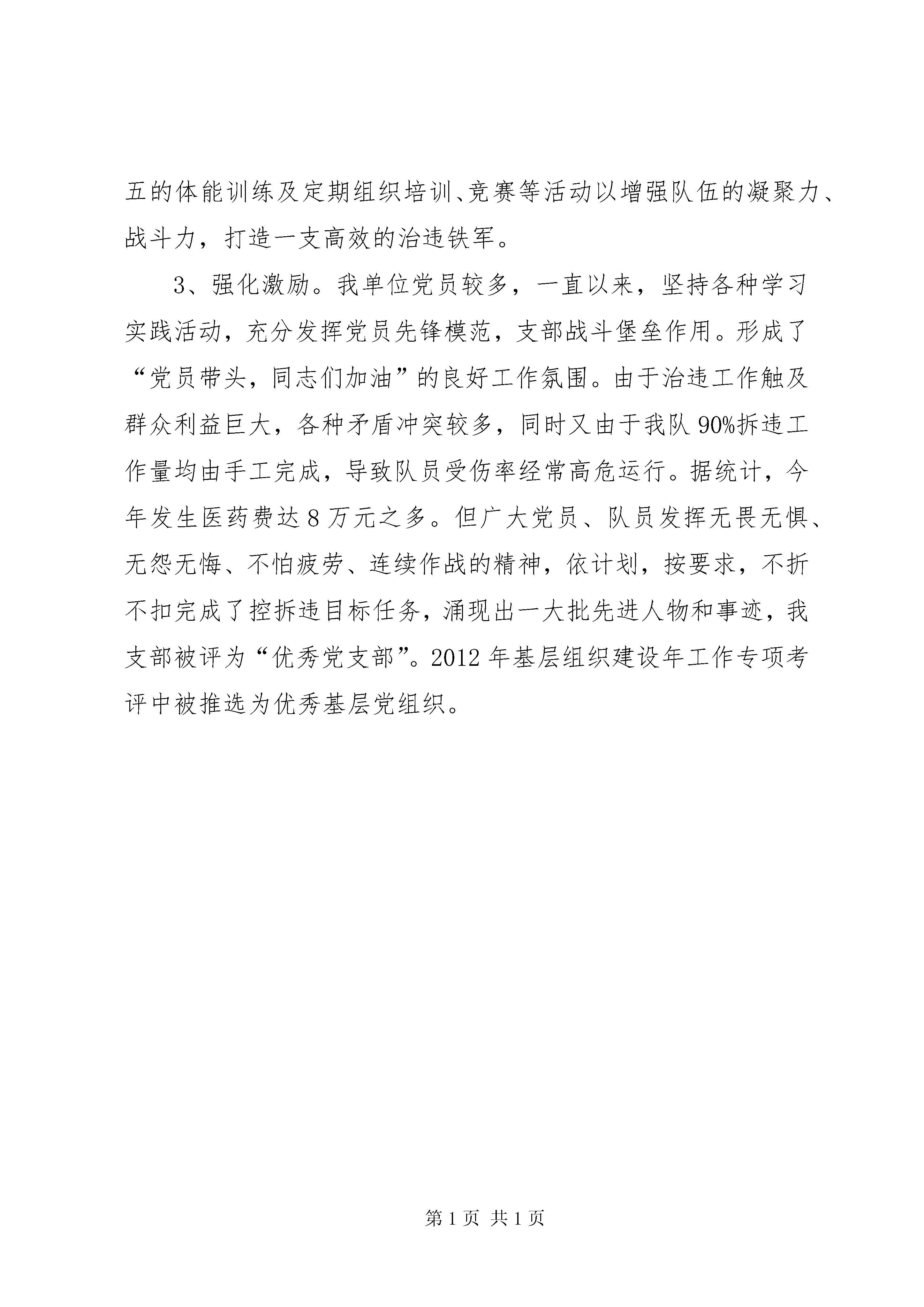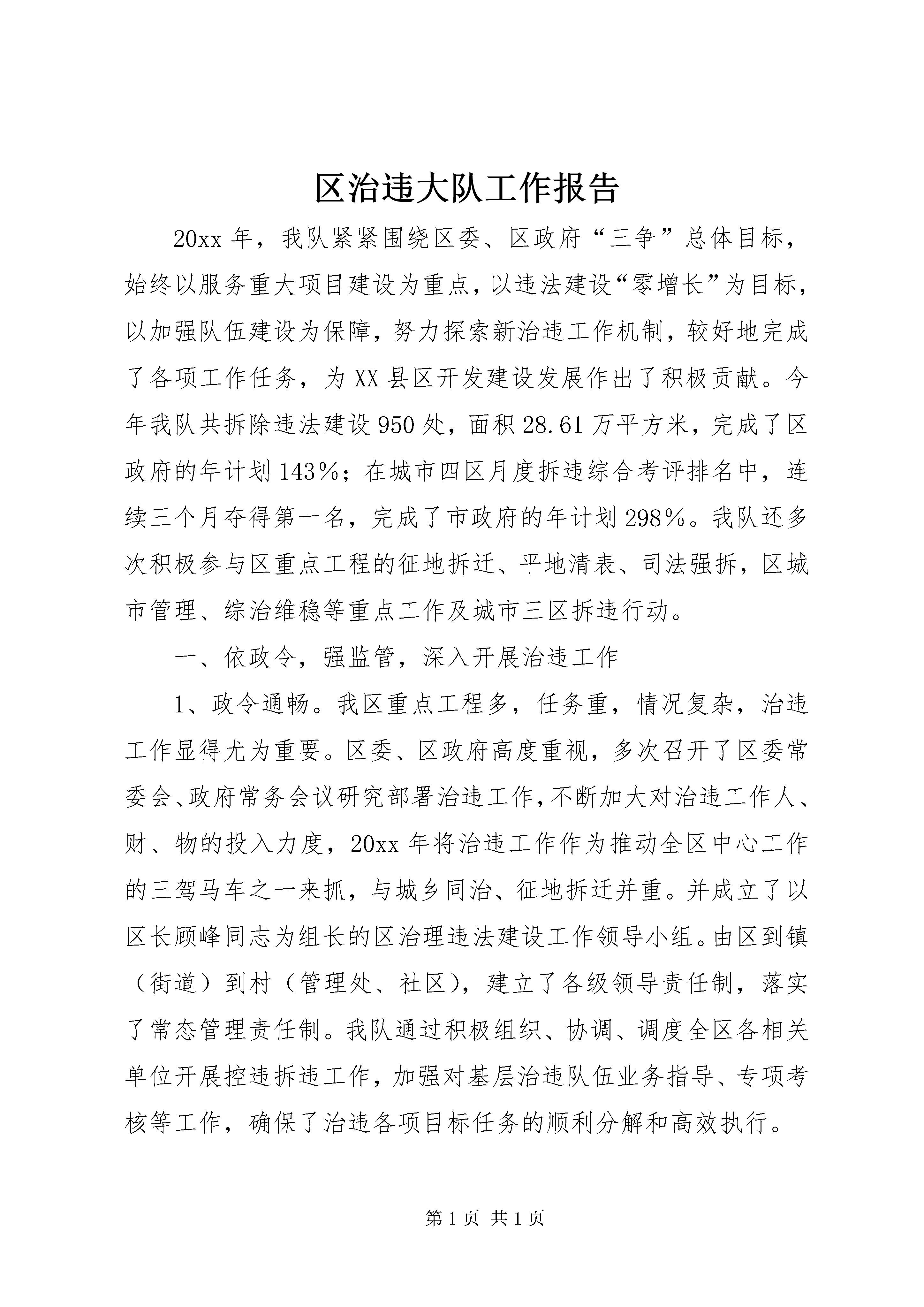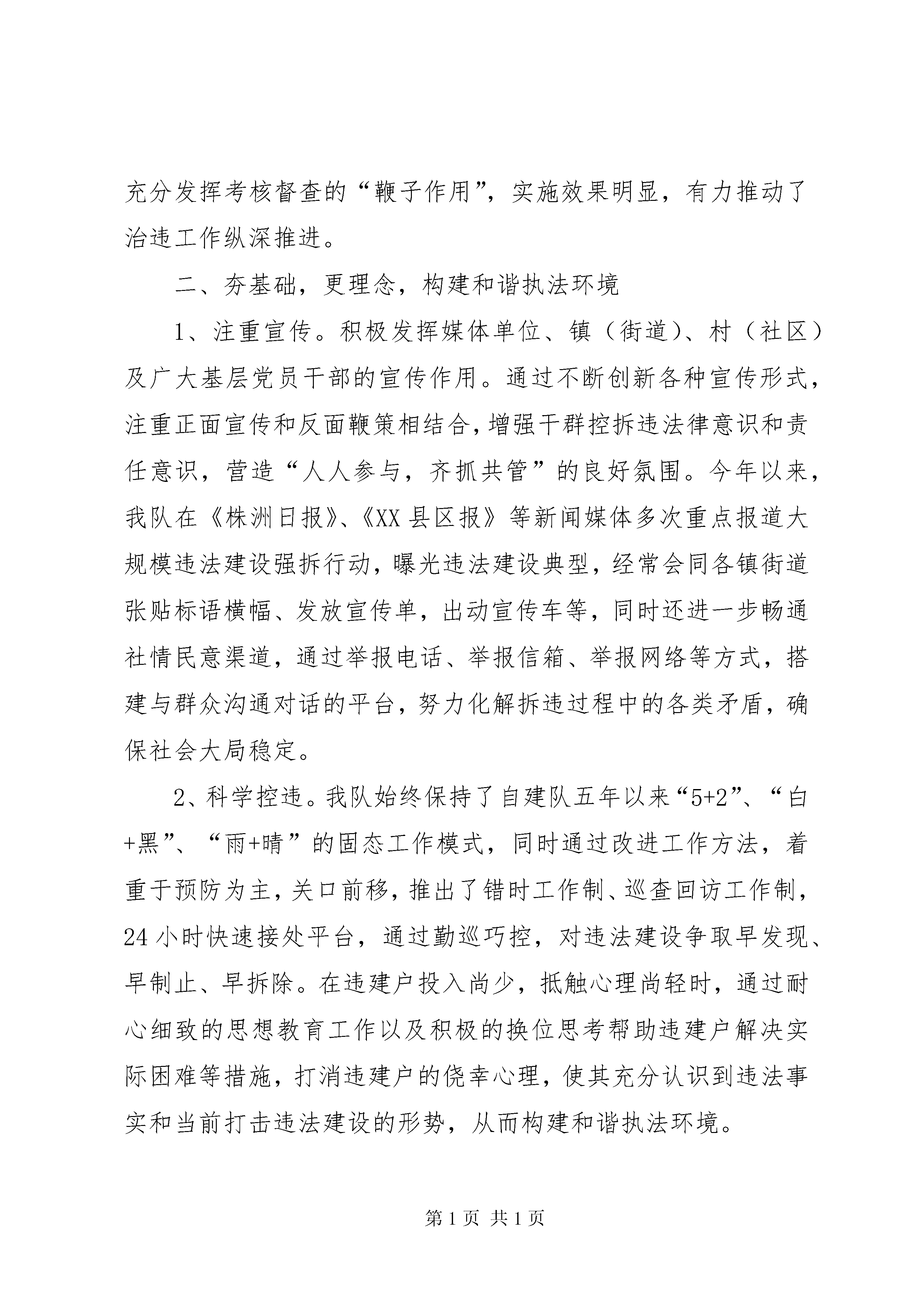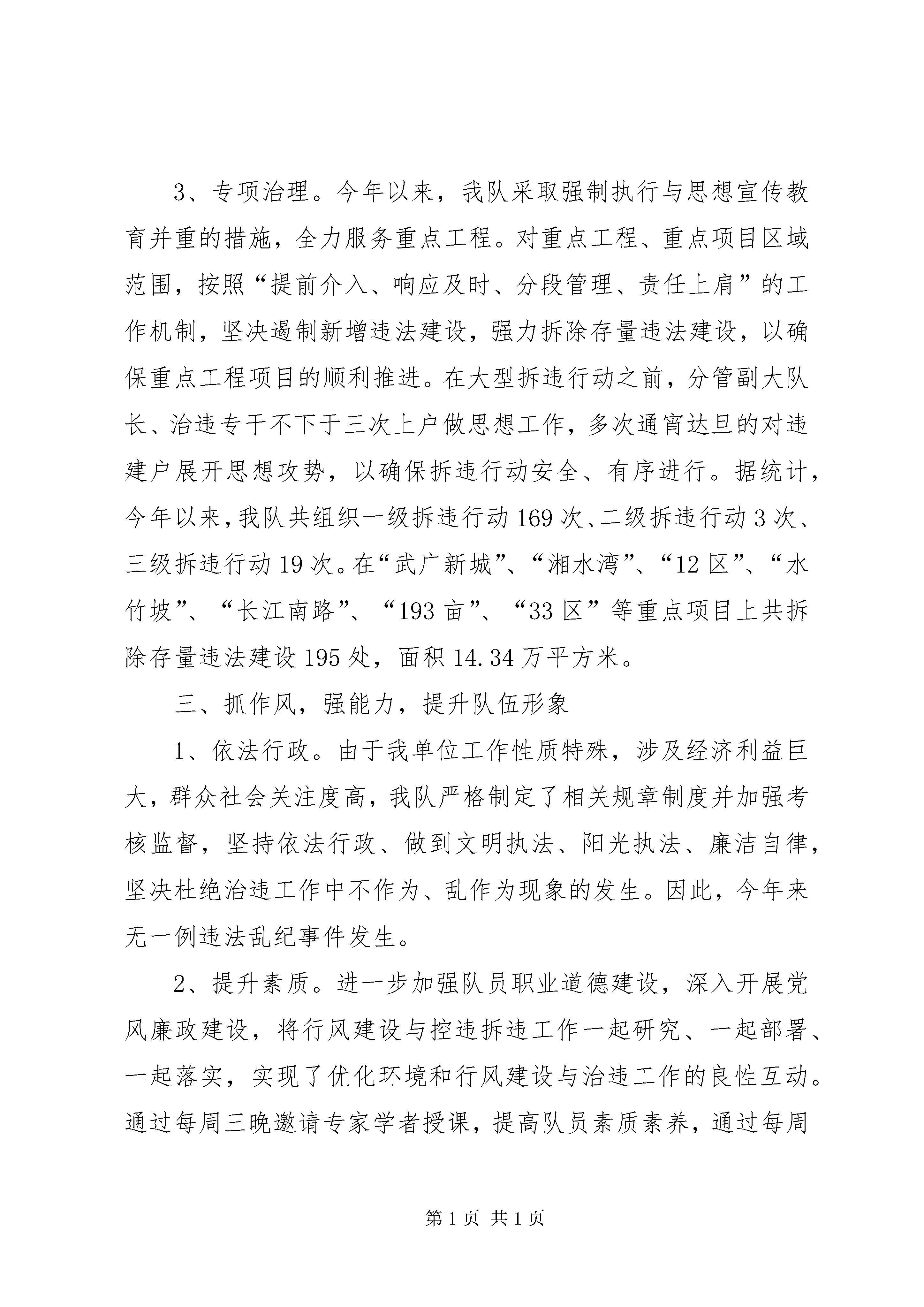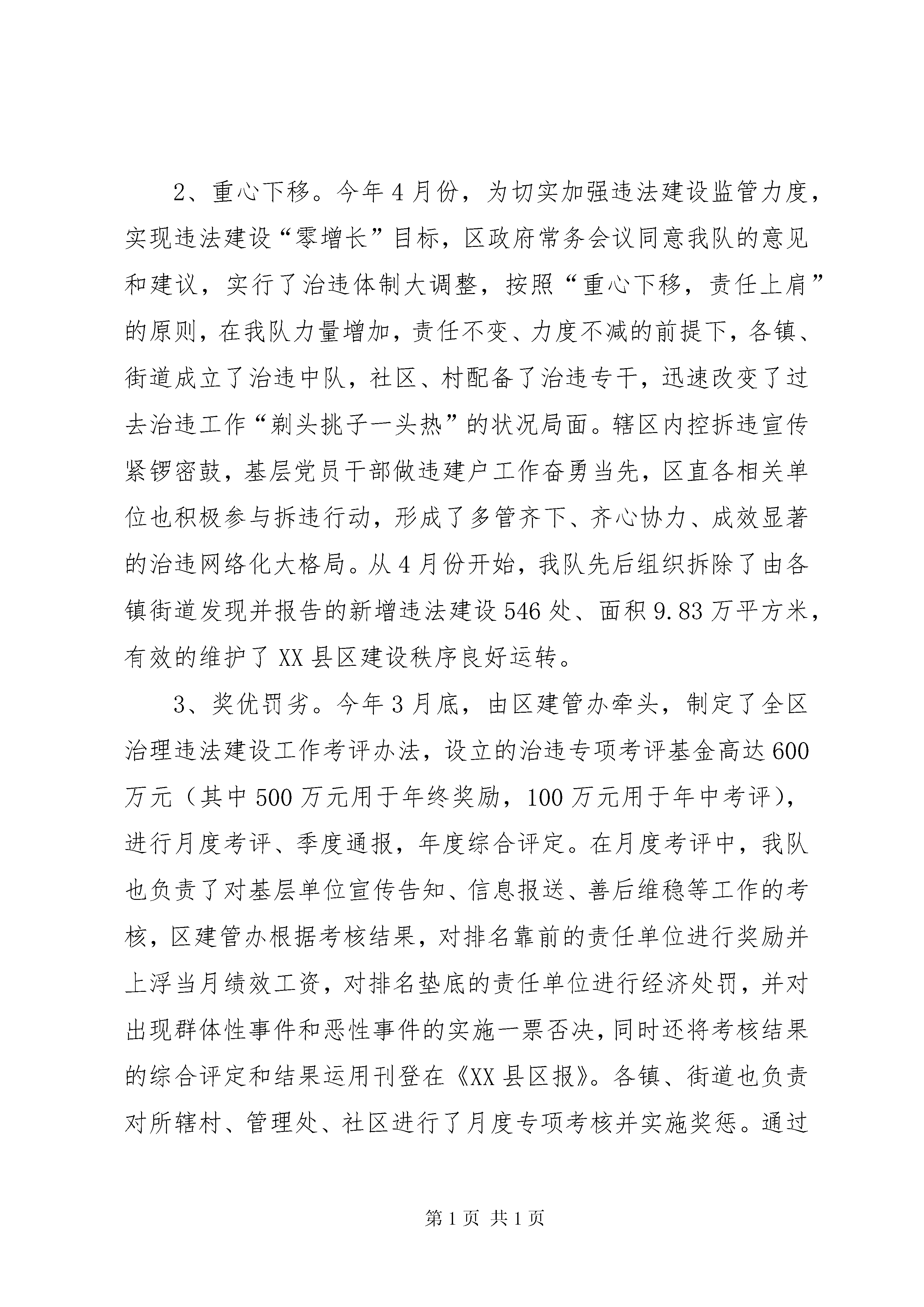 区治违大队工作报告20xx年,我队紧紧围绕区委、区政府“三争”总体目标,始终以服务重大项目建设为重点,以违法建设“零增长”为目标,以加强队伍建设为保障,努力探索新治违工作机制,较好地完成了各项工作任务,为XX县区开发建设发展作出了积极贡献。今年我队共拆除违法建设950处,面积28.61万平方米,完成了区政府的年计划143%;在城市四区月度拆违综合考评排名中,连续三个月夺得第一名,完成了市政府的年计划298%。我队还多次积极参与区重点工程的征地拆迁、平地清表、司法强拆,区城市管理、综治维稳等重点工作及城市三区拆违行动。一、依政令,强监管,深入开展治违工作1、政令通畅。我区重点工程多,任务重,情况复杂,治违工作显得尤为重要。区委、区政府高度重视,多次召开了区委常委会、政府常务会议研究部署治违工作,不断加大对治违工作人、财、物的投入力度,20xx年将治违工作作为推动全区中心工作的三驾马车之一来抓,与城乡同治、征地拆迁并重。并成立了以区长顾峰同志为组长的区治理违法建设工作领导小组。由区到镇(街道)到村(管理处、社区),建立了各级领导责任制,落实了常态管理责任制。我队通过积极组织、协调、调度全区各相关单位开展控违拆违工作,加强对基层治违队伍业务指导、专项考核等工作,确保了治违各项目标任务的顺利分解和高效执行。2、重心下移。今年4月份,为切实加强违法建设监管力度,实现违法建设“零增长”目标,区政府常务会议同意我队的意见和建议,实行了治违体制大调整,按照“重心下移,责任上肩”的原则,在我队力量增加,责任不变、力度不减的前提下,各镇、街道成立了治违中队,社区、村配备了治违专干,迅速改变了过去治违工作“剃头挑子一头热”的状况局面。辖区内控拆违宣传紧锣密鼓,基层党员干部做违建户工作奋勇当先,区直各相关单位也积极参与拆违行动,形成了多管齐下、齐心协力、成效显著的治违网络化大格局。从4月份开始,我队先后组织拆除了由各镇街道发现并报告的新增违法建设546处、面积9.83万平方米,有效的维护了XX县区建设秩序良好运转。3、奖优罚劣。今年3月底,由区建管办牵头,制定了全区治理违法建设工作考评办法,设立的治违专项考评基金高达600万元(其中500万元用于年终奖励,100万元用于年中考评),进行月度考评、季度通报,年度综合评定。在月度考评中,我队也负责了对基层单位宣传告知、信息报送、善后维稳等工作的考核,区建管办根据考核结果,对排名靠前的责任单位进行奖励并上浮当月绩效工资,对排名垫底的责任单位进行经济处罚,并对出现群体性事件和恶性事件的实施一票否决,同时还将考核结果的综合评定和结果运用刊登在《XX县区报》。各镇、街道也负责对所辖村、管理处、社区进行了月度专项考核并实施奖惩。通过充分发挥考核督查的“鞭子作用”,实施效果明显,有力推动了治违工作纵深推进。二、夯基础,更理念,构建和谐执法环境1、注重宣传。积极发挥媒体单位、镇(街道)、村(社区)及广大基层党员干部的宣传作用。通过不断创新各种宣传形式,注重正面宣传和反面鞭策相结合,增强干群控拆违法律意识和责任意识,营造“人人参与,齐抓共管”的良好氛围。今年以来,我队在《株洲日报》、《XX县区报》等新闻媒体多次重点报道大规模违法建设强拆行动,曝光违法建设典型,经常会同各镇街道张贴标语横幅、发放宣传单,出动宣传车等,同时还进一步畅通社情民意渠道,通过举报电话、举报信箱、举报网络等方式,搭建与群众沟通对话的平台,努力化解拆违过程中的各类矛盾,确保社会大局稳定。2、科学控违。我队始终保持了自建队五年以来“5+2”、“白+黑”、“雨+晴”的固态工作模式,同时通过改进工作方法,着重于预防为主,关口前移,推出了错时工作制、巡查回访工作制,24小时快速接处平台,通过勤巡巧控,对违法建设争取早发现、早制止、早拆除。在违建户投入尚少,抵触心理尚轻时,通过耐心细致的思想教育工作以及积极的换位思考帮助违建户解决实际困难等措施,打消违建户的侥幸心理,使其充分认识到违法事实和当前打击违法建设的形势,从而构建和谐执法环境。3、专项治理。今年以来,我队采取强制执行与思想宣传教育并重的措施,全力服务重点工程。对重点工程、重点项目区域范围,按照“提前介入、响应及时、分段管理、责任上肩”的工作机制,坚决遏制新增违法建设,强力拆除存量违法建设,以确保重点工程项目的顺利推进。在大型拆违行动之前,分管副大队长、治违专干不下于三次上户做思想工作,多次通宵达旦的对违建户展开思想攻势,以确保拆违行动安全、有序进行。据统计,今年以来,我队共组织一级拆违行动169次、二级拆违行动3次、三级拆违行动19次。在“武广新城”、“湘水湾”、“12区”、“水竹坡”、“长江南路”、“193亩”、“33区”等重点项目上共拆除存量违法建设195处,面积14.34