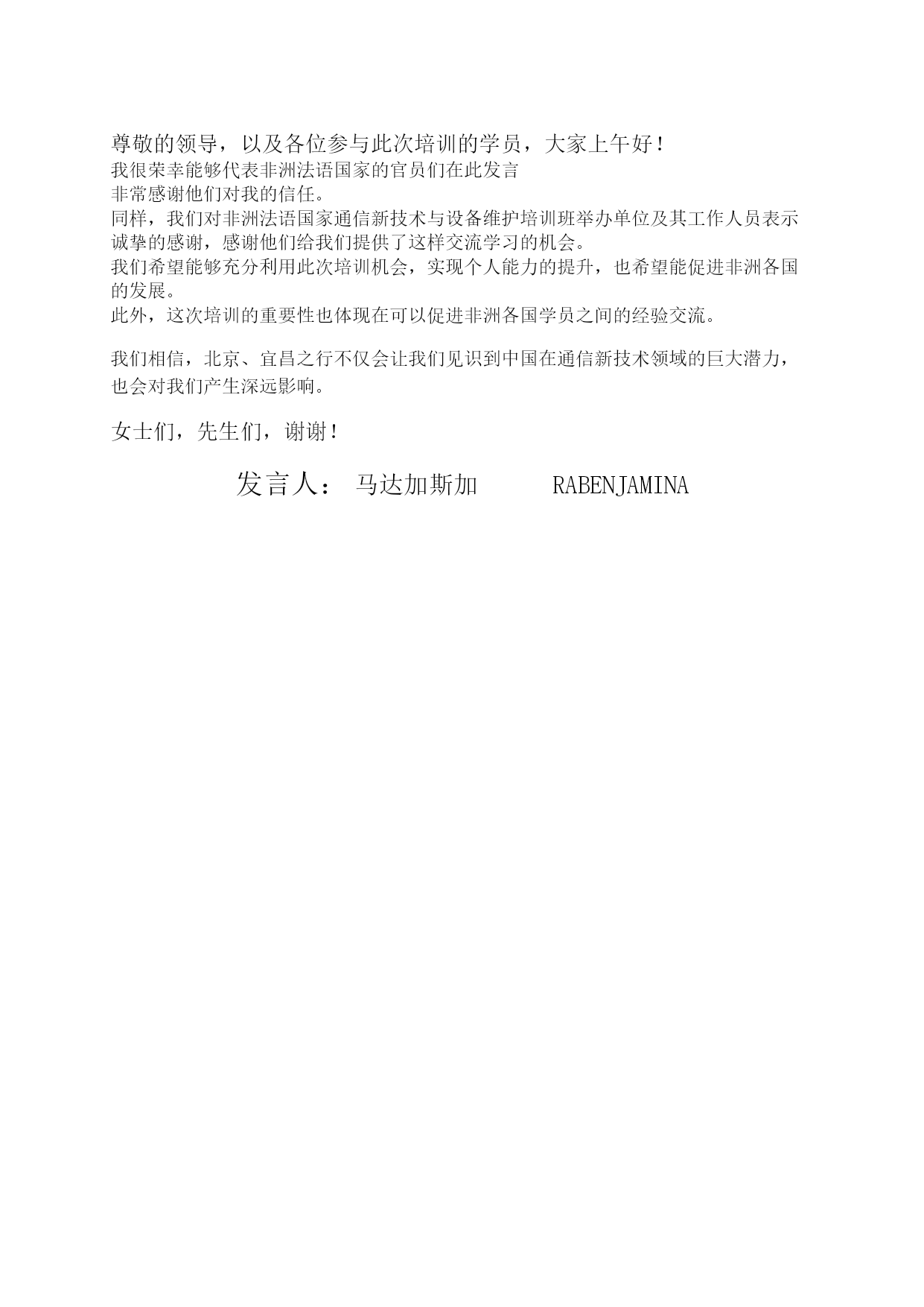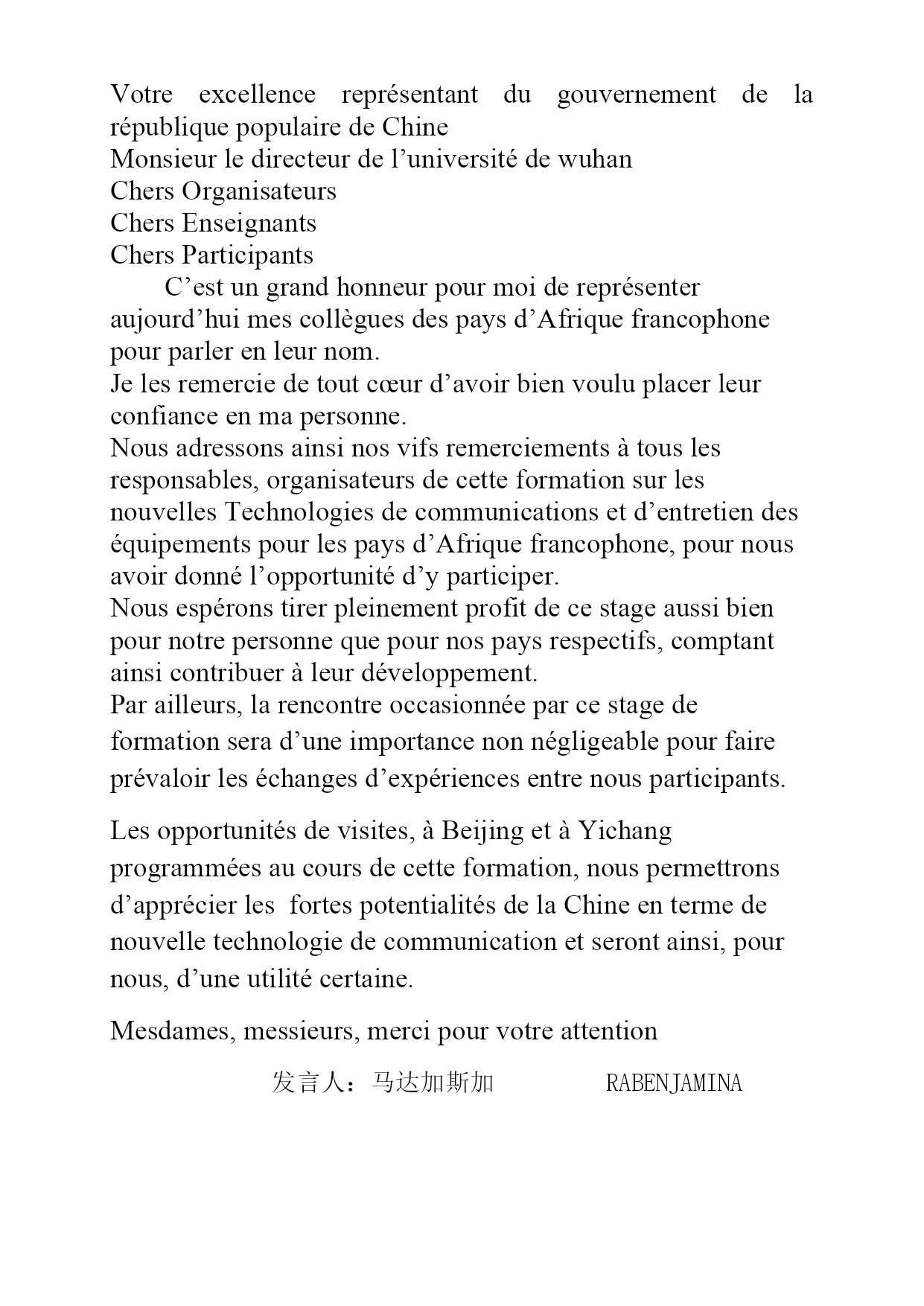 VotreexcellencereprésentantdugouvernementdelarépubliquepopulairedeChine Monsieurledirecteurdel’universitédewuhanChersOrganisateurs ChersEnseignants ChersParticipants C’estungrandhonneurpourmoidereprésenteraujourd’huimescollèguesdespaysd’Afriquefrancophonepourparlerenleurnom. Jelesremerciedetoutcœurd’avoirbienvouluplacerleurconfianceenmapersonne. Nousadressonsainsinosvifsremerciementsàtouslesresponsables,organisateursdecetteformationsurlesnouvellesTechnologiesdecommunicationsetd’entretiendeséquipementspourlespaysd’Afriquefrancophone,pournousavoirdonnél’opportunitéd’yparticiper. Nousespéronstirerpleinementprofitdecestageaussibienpournotrepersonnequepournospaysrespectifs,comptantainsicontribueràleurdéveloppement. Parailleurs,larencontreoccasionnéeparcestagedeformationserad’uneimportancenonnégligeablepourfaireprévaloirleséchangesd’expériencesentrenousparticipants. Lesopportunitésdevisites,àBeijingetàYichangprogramméesaucoursdecetteformation,nouspermettronsd’apprécierlesfortespotentialitésdelaChineentermedenouvelletechnologiedecommunicationetserontainsi,pournous,d’uneutilitécertaine. Mesdames,messieurs,mercipourvotreattention 发言人:马达加斯加RABENJAMINA 尊敬的领导,以及各位参与此次培训的学员,大家上午好!我很荣幸能够代表非洲法语国家的官员们在此发言 非常感谢他们对我的信任。 同样,我们对非洲法语国家通信新技术与设备维护培训班举办单位及其工作人员表示诚挚的感谢,感谢他们给我们提供了这样交流学习的机会。 我们希望能够充分利用此次培训机会,实现个人能力的提升,也希望能促进非洲各国的发展。 此外,这次培训的重要性也体现在可以促进非洲各国学员之间的经验交流。 我们相信,北京、宜昌之行不仅会让我们见识到中国在通信新技术领域的巨大潜力,也会对我们产生深远影响。 女士们,先生们,谢谢! 发言人:马达加斯加RABENJAMINA