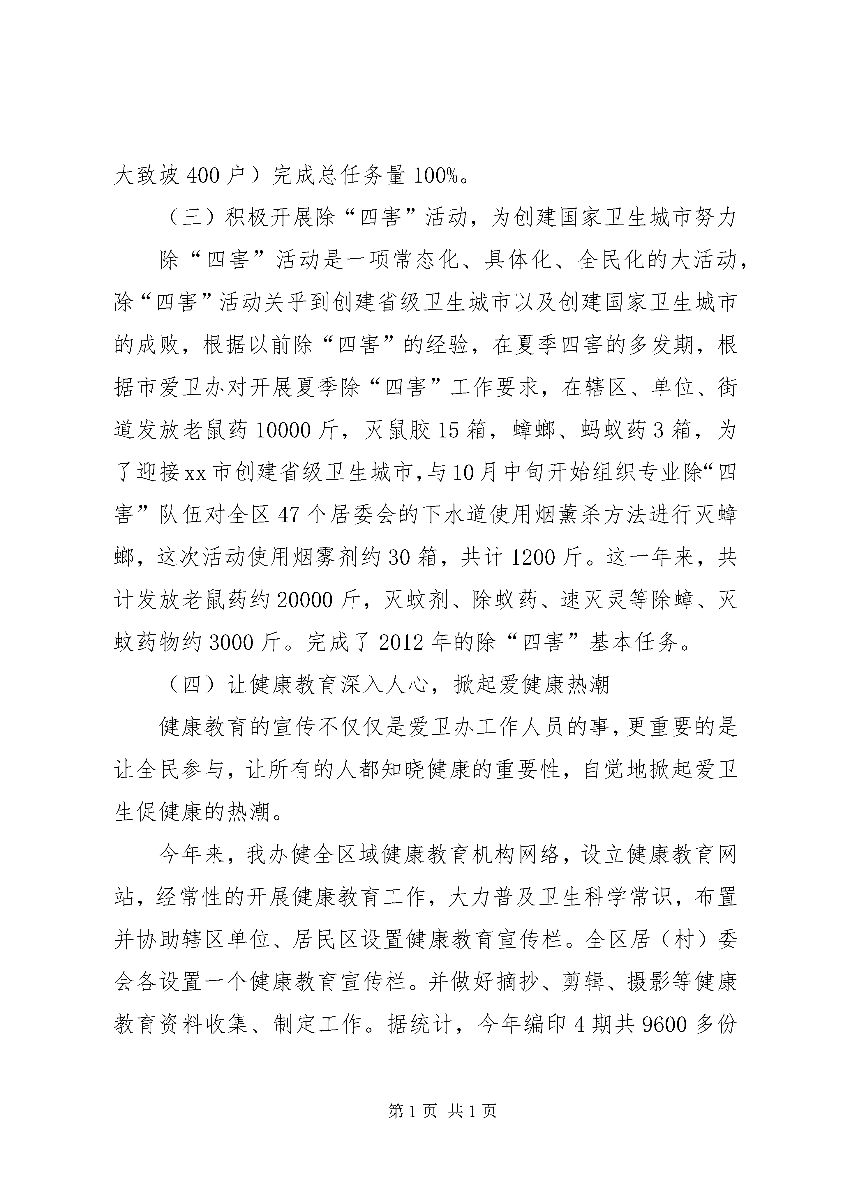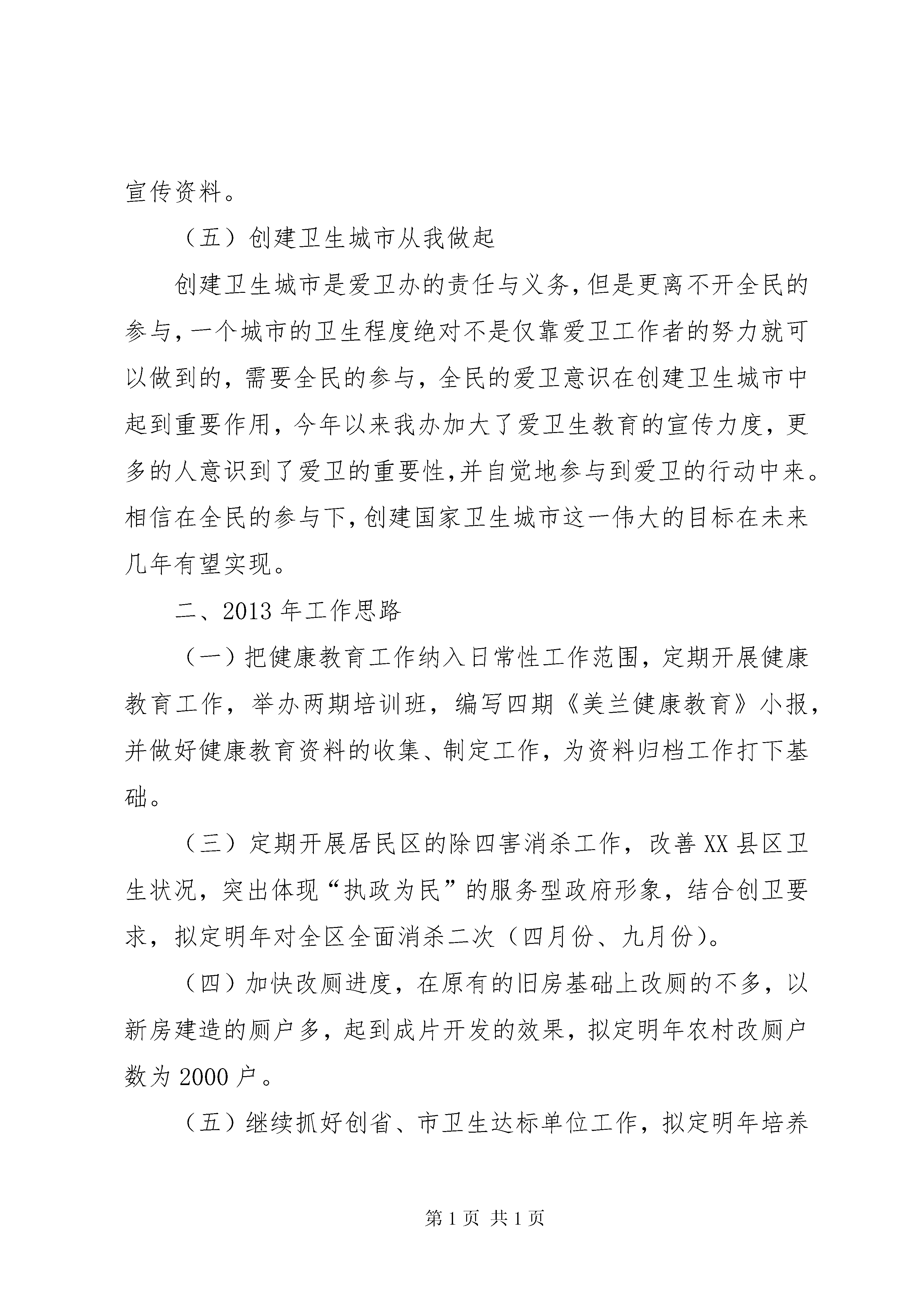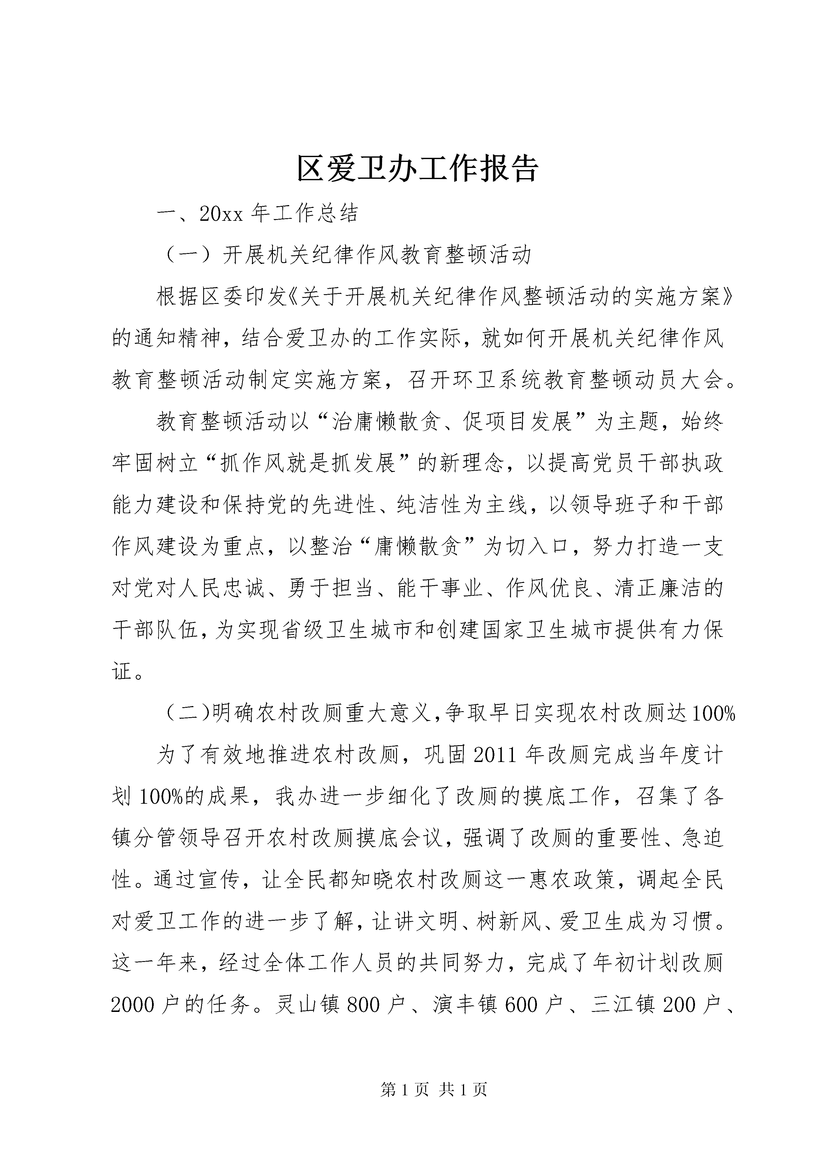区爱卫办工作报告一、20xx年工作总结(一)开展机关纪律作风教育整顿活动根据区委印发《关于开展机关纪律作风整顿活动的实施方案》的通知精神,结合爱卫办的工作实际,就如何开展机关纪律作风教育整顿活动制定实施方案,召开环卫系统教育整顿动员大会。教育整顿活动以“治庸懒散贪、促项目发展”为主题,始终牢固树立“抓作风就是抓发展”的新理念,以提高党员干部执政能力建设和保持党的先进性、纯洁性为主线,以领导班子和干部作风建设为重点,以整治“庸懒散贪”为切入口,努力打造一支对党对人民忠诚、勇于担当、能干事业、作风优良、清正廉洁的干部队伍,为实现省级卫生城市和创建国家卫生城市提供有力保证。(二)明确农村改厕重大意义,争取早日实现农村改厕达100%为了有效地推进农村改厕,巩固2011年改厕完成当年度计划100%的成果,我办进一步细化了改厕的摸底工作,召集了各镇分管领导召开农村改厕摸底会议,强调了改厕的重要性、急迫性。通过宣传,让全民都知晓农村改厕这一惠农政策,调起全民对爱卫工作的进一步了解,让讲文明、树新风、爱卫生成为习惯。这一年来,经过全体工作人员的共同努力,完成了年初计划改厕2000户的任务。灵山镇800户、演丰镇600户、三江镇200户、大致坡400户)完成总任务量100%。(三)积极开展除“四害”活动,为创建国家卫生城市努力除“四害”活动是一项常态化、具体化、全民化的大活动,除“四害”活动关乎到创建省级卫生城市以及创建国家卫生城市的成败,根据以前除“四害”的经验,在夏季四害的多发期,根据市爱卫办对开展夏季除“四害”工作要求,在辖区、单位、街道发放老鼠药10000斤,灭鼠胶15箱,蟑螂、蚂蚁药3箱,为了迎接xx市创建省级卫生城市,与10月中旬开始组织专业除“四害”队伍对全区47个居委会的下水道使用烟薰杀方法进行灭蟑螂,这次活动使用烟雾剂约30箱,共计1200斤。这一年来,共计发放老鼠药约20000斤,灭蚊剂、除蚁药、速灭灵等除蟑、灭蚊药物约3000斤。完成了2012年的除“四害”基本任务。(四)让健康教育深入人心,掀起爱健康热潮健康教育的宣传不仅仅是爱卫办工作人员的事,更重要的是让全民参与,让所有的人都知晓健康的重要性,自觉地掀起爱卫生促健康的热潮。今年来,我办健全区域健康教育机构网络,设立健康教育网站,经常性的开展健康教育工作,大力普及卫生科学常识,布置并协助辖区单位、居民区设置健康教育宣传栏。全区居(村)委会各设置一个健康教育宣传栏。并做好摘抄、剪辑、摄影等健康教育资料收集、制定工作。据统计,今年编印4期共9600多份宣传资料。(五)创建卫生城市从我做起创建卫生城市是爱卫办的责任与义务,但是更离不开全民的参与,一个城市的卫生程度绝对不是仅靠爱卫工作者的努力就可以做到的,需要全民的参与,全民的爱卫意识在创建卫生城市中起到重要作用,今年以来我办加大了爱卫生教育的宣传力度,更多的人意识到了爱卫的重要性,并自觉地参与到爱卫的行动中来。相信在全民的参与下,创建国家卫生城市这一伟大的目标在未来几年有望实现。二、2013年工作思路(一)把健康教育工作纳入日常性工作范围,定期开展健康教育工作,举办两期培训班,编写四期《美兰健康教育》小报,并做好健康教育资料的收集、制定工作,为资料归档工作打下基础。(三)定期开展居民区的除四害消杀工作,改善XX县区卫生状况,突出体现“执政为民”的服务型政府形象,结合创卫要求,拟定明年对全区全面消杀二次(四月份、九月份)。(四)加快改厕进度,在原有的旧房基础上改厕的不多,以新房建造的厕户多,起到成片开发的效果,拟定明年农村改厕户数为2000户。(五)继续抓好创省、市卫生达标单位工作,拟定明年培养2个省级达标单位、3个市级达标单位、3个省级卫生村。