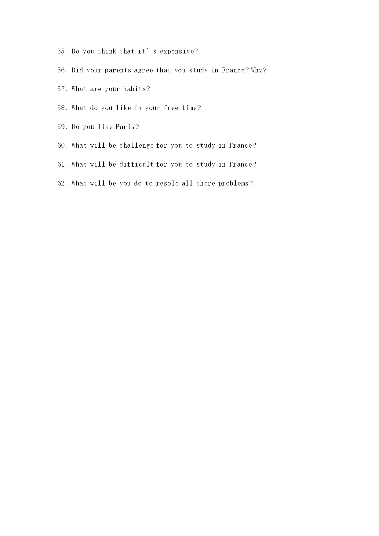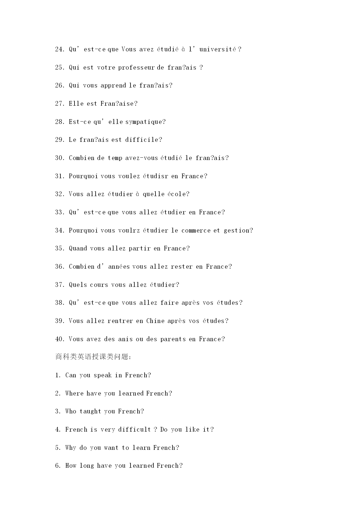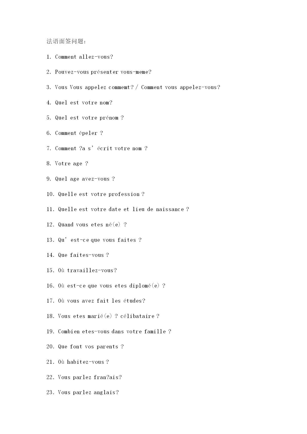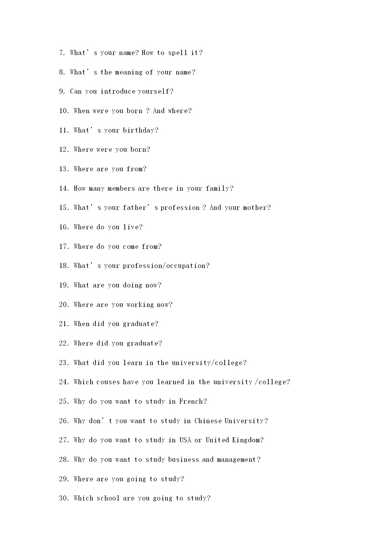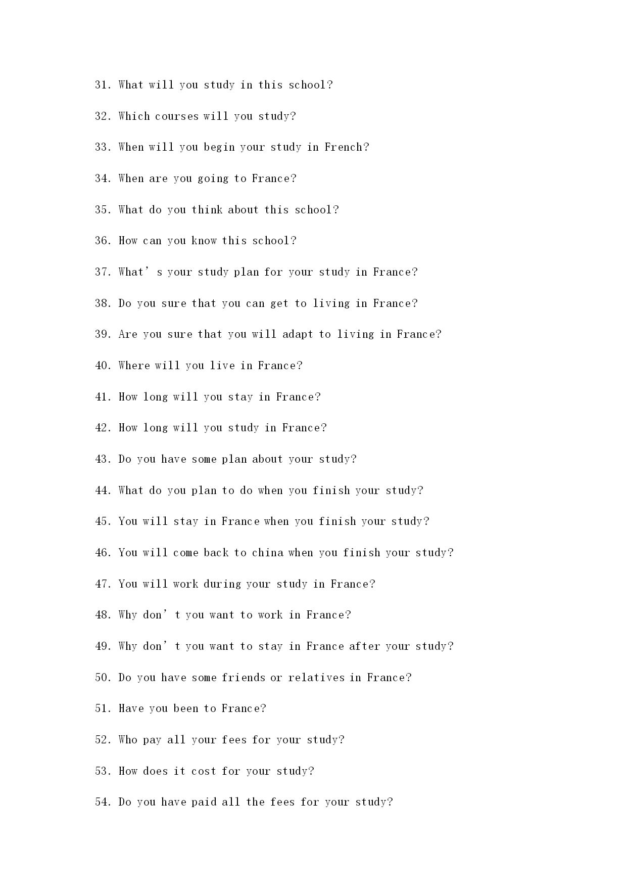 法语面签问题: 1.Commentallez-vous? 2.Pouvez-vousprésentervous-meme? 3.VousVousappelezcommemt?/Commentvousappelez-vous? 4.Quelestvotrenom? 5.Quelestvotreprénom? 6.Commentépeler? 7.Comment?as’écritvotrenom? 8.Votreage? 9.Quelageavez-vous? 10.Quelleestvotreprofession? 11.Quelleestvotredateetlieudenaissance? 12.Quandvousetesné(e)? 13.Qu’est-cequevousfaites? 14.Quefaites-vous? 15.Oùtravaillez-vous? 16.Oùest-cequevousetesdiplomé(e)? 17.Oùvousavezfaitlesétudes? 18.Vousetesmarié(e)?célibataire? 19.Combienetes-vousdansvotrefamille? 20.Quefontvosparents? 21.Oùhabitez-vous? 22.Vousparlezfran?ais? 23.Vousparlezanglais? 24.Qu’est-cequeVousavezétudiéàl’université? 25.Quiestvotreprofesseurdefran?ais? 26.Quivousapprendlefran?ais? 27.ElleestFran?aise? 28.Est-cequ’ellesympatique? 29.Lefran?aisestdifficile? 30.Combiendetempavez-vousétudiélefran?ais? 31.PourquoivousvoulezétudisrenFrance? 32.Vousallezétudieràquelleécole? 33.Qu’est-cequevousallezétudierenFrance? 34.Pourquoivousvoulrzétudierlecommerceetgestion? 35.QuandvousallezpartirenFrance? 36.Combiend’annéesvousallezresterenFrance? 37.Quelscoursvousallezétudier? 38.Qu’est-cequevousallezfaireaprèsvosétudes? 39.VousallezrentrerenChineaprèsvosétudes? 40.VousavezdesanisoudesparentsenFrance? 商科类英语授课类问题: 1.CanyouspeakinFrench? 2.WherehaveyoulearnedFrench? 3.WhotaughtyouFrench? 4.Frenchisverydifficult?Doyoulikeit? 5.WhydoyouwanttolearnFrench? 6.HowlonghaveyoulearnedFrench? 7.What’syourname?Howtospellit? 8.What’sthemeaningofyourname? 9.Canyouintroduceyourself? 10.Whenwereyouborn?Andwhere? 11.What’syourbirthday? 12.Wherewereyouborn? 13.Whereareyoufrom? 14.Howmanymembersarethereinyourfamily? 15.What’syourfather’sprofession?Andyourmother? 16.Wheredoyoulive? 17.Wheredoyoucomefrom? 18.What’syourprofession/occupation? 19.Whatareyoudoingnow? 20.Whereareyouworkingnow? 21.Whendidyougraduate? 22.Wheredidyougraduate? 23.Whatdidyoulearnintheuniversity/college? 24.Whichcouseshaveyoulearnedintheuniversity/college? 25.WhydoyouwanttostudyinFrench? 26.Whydon’tyouwa