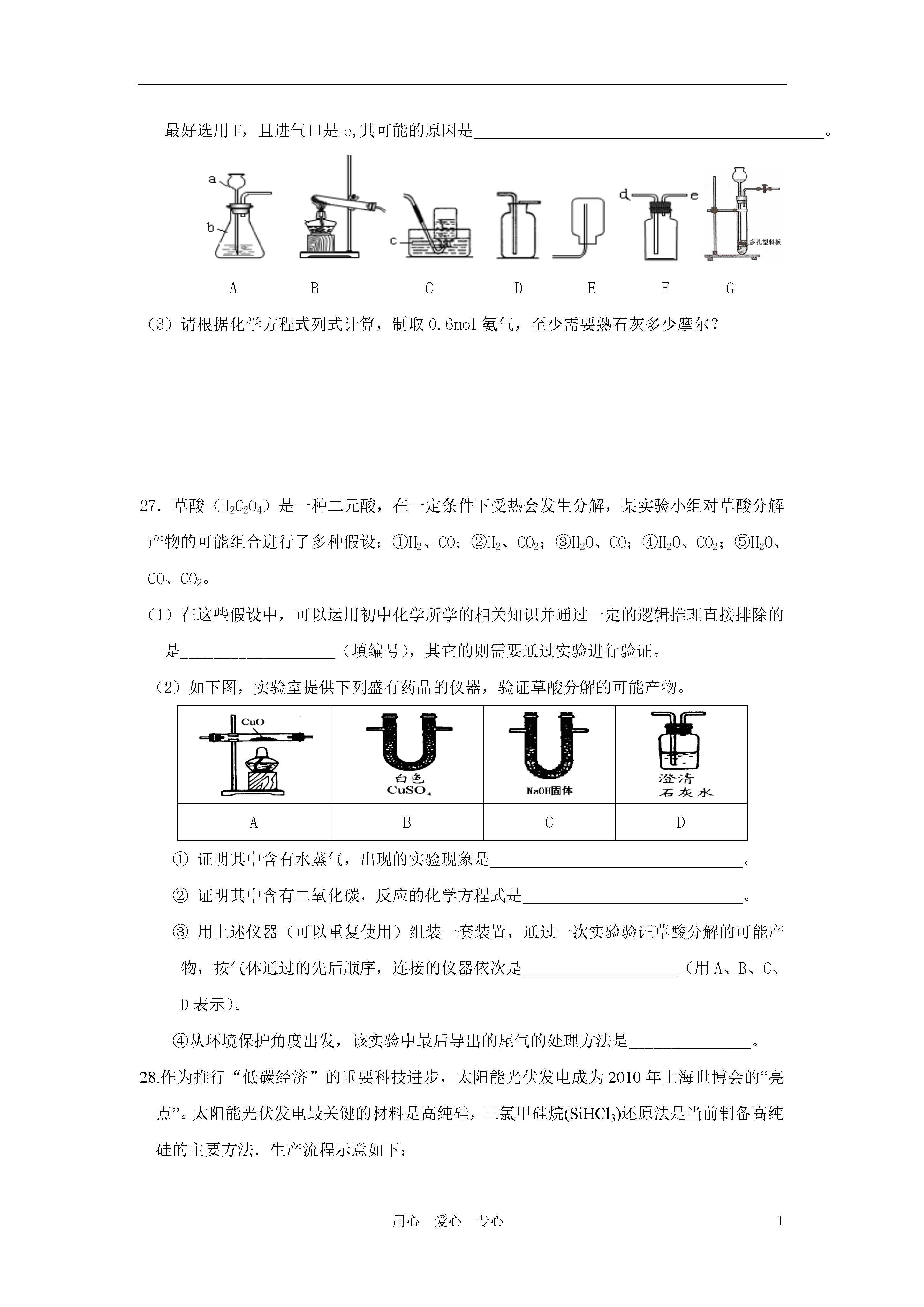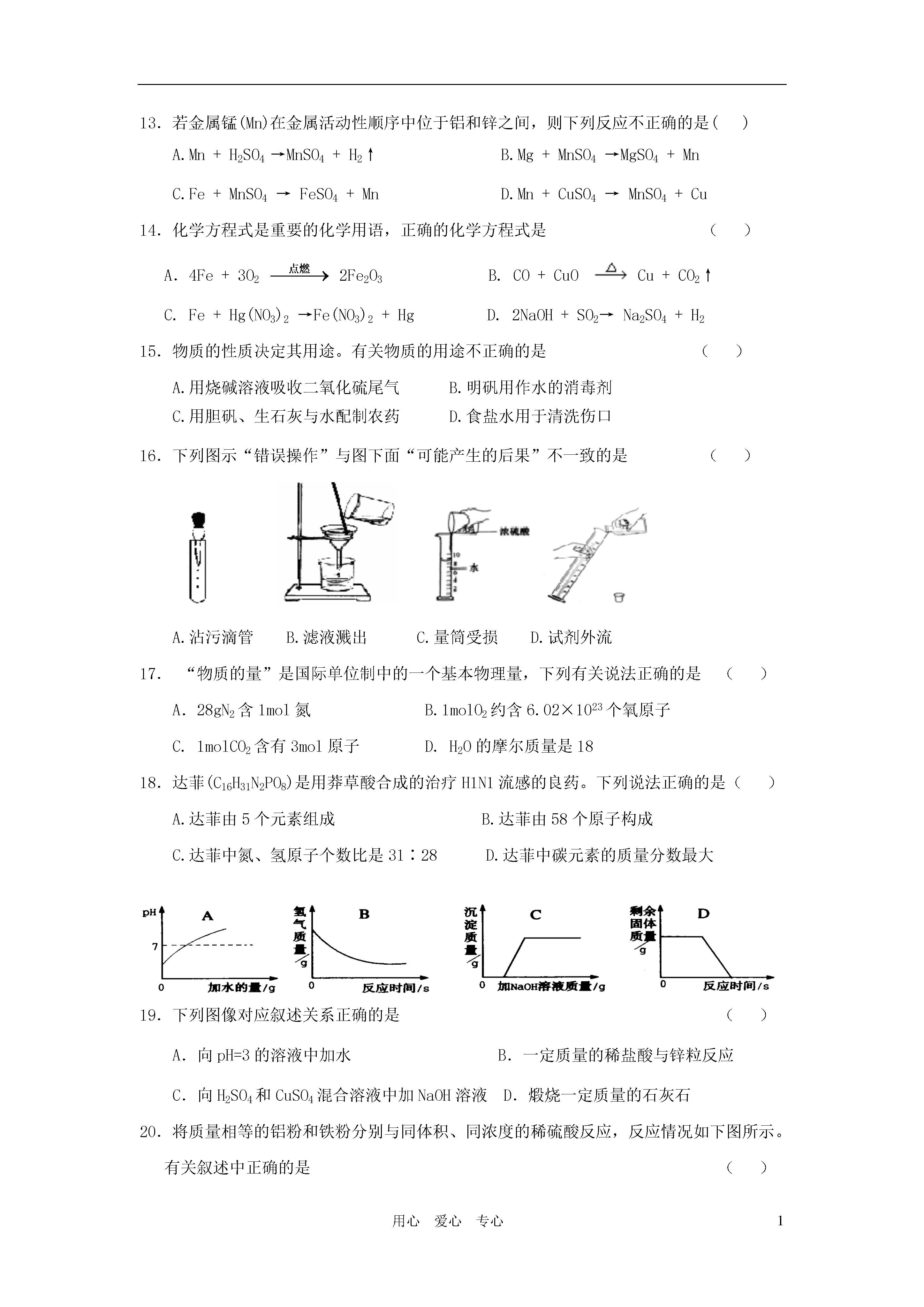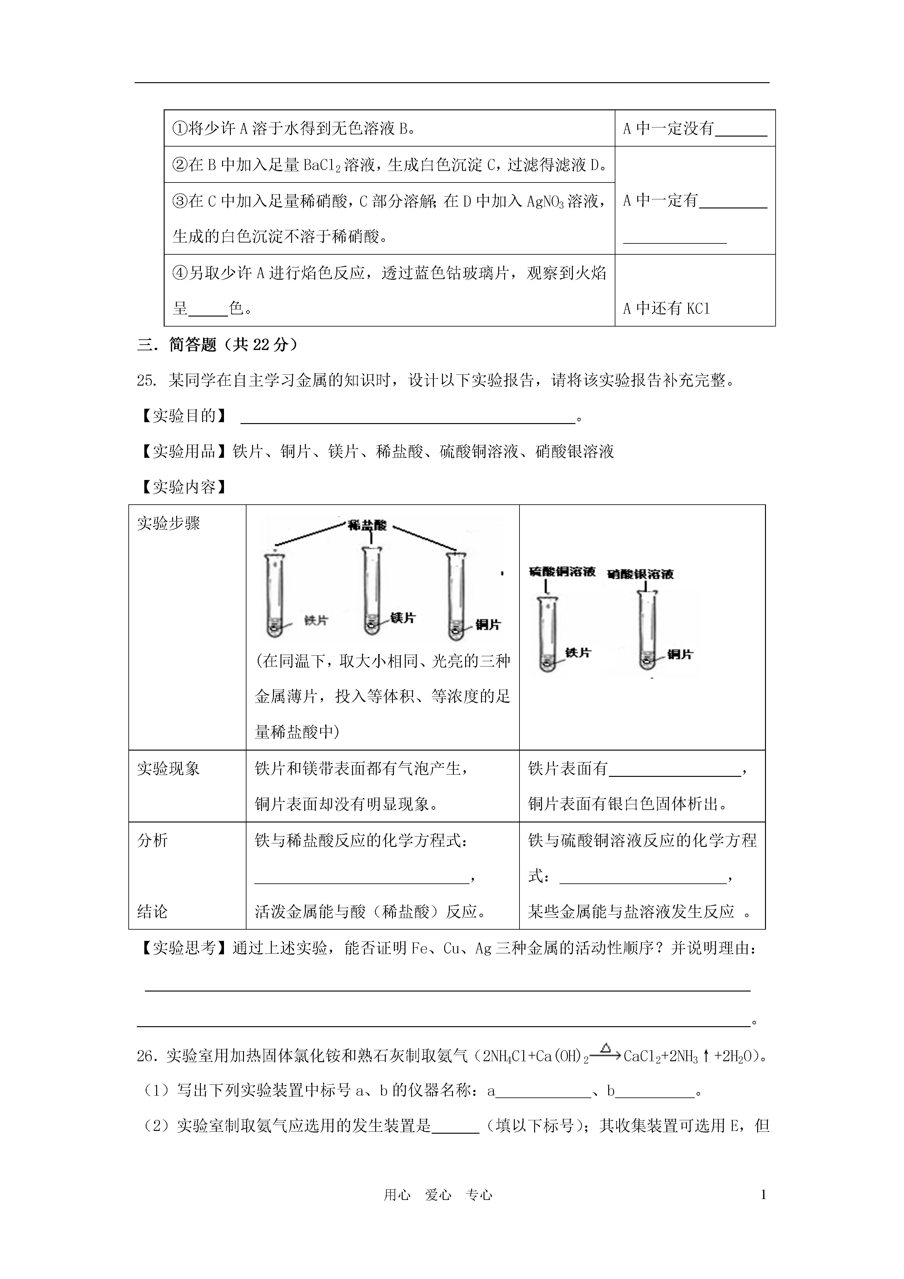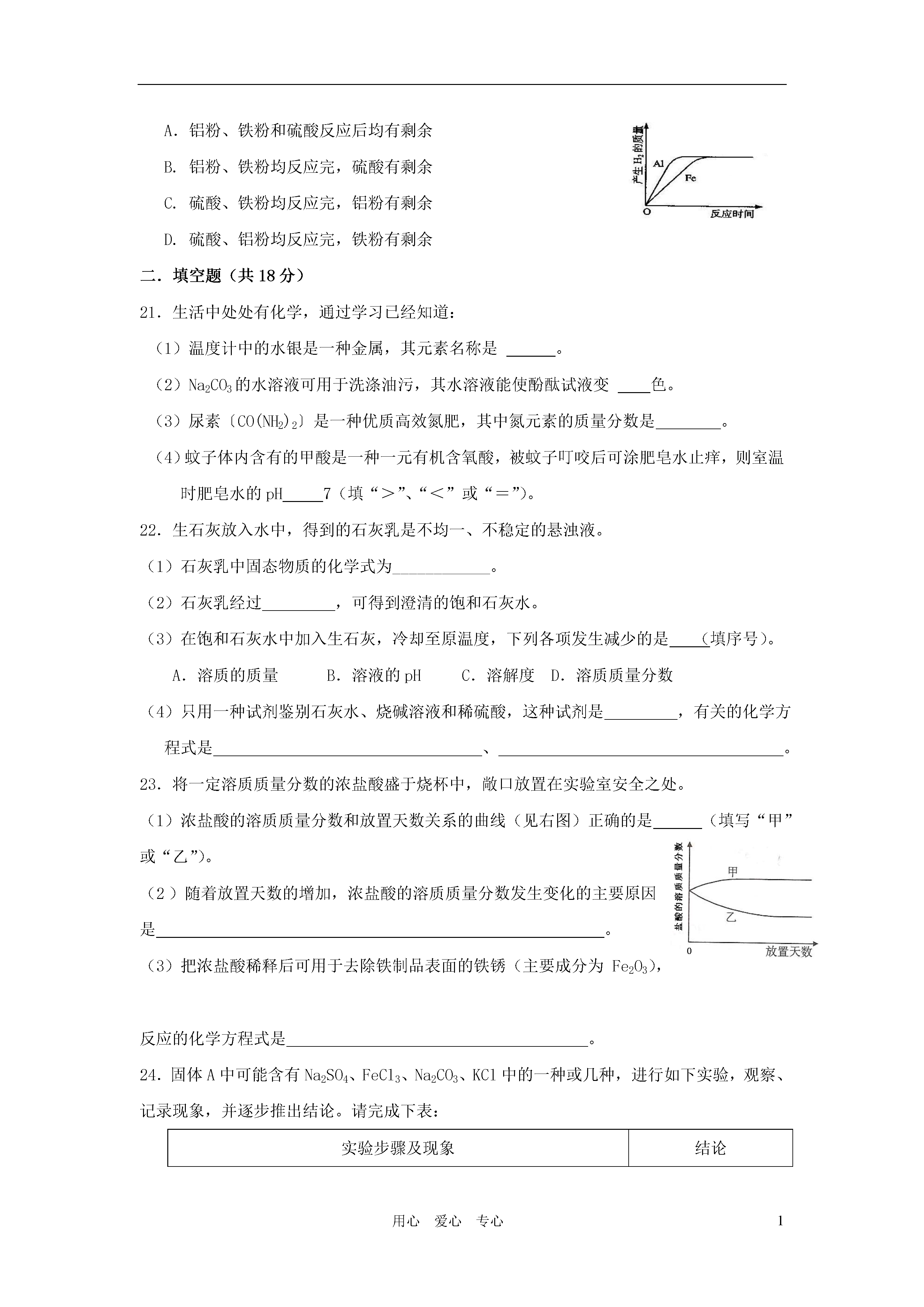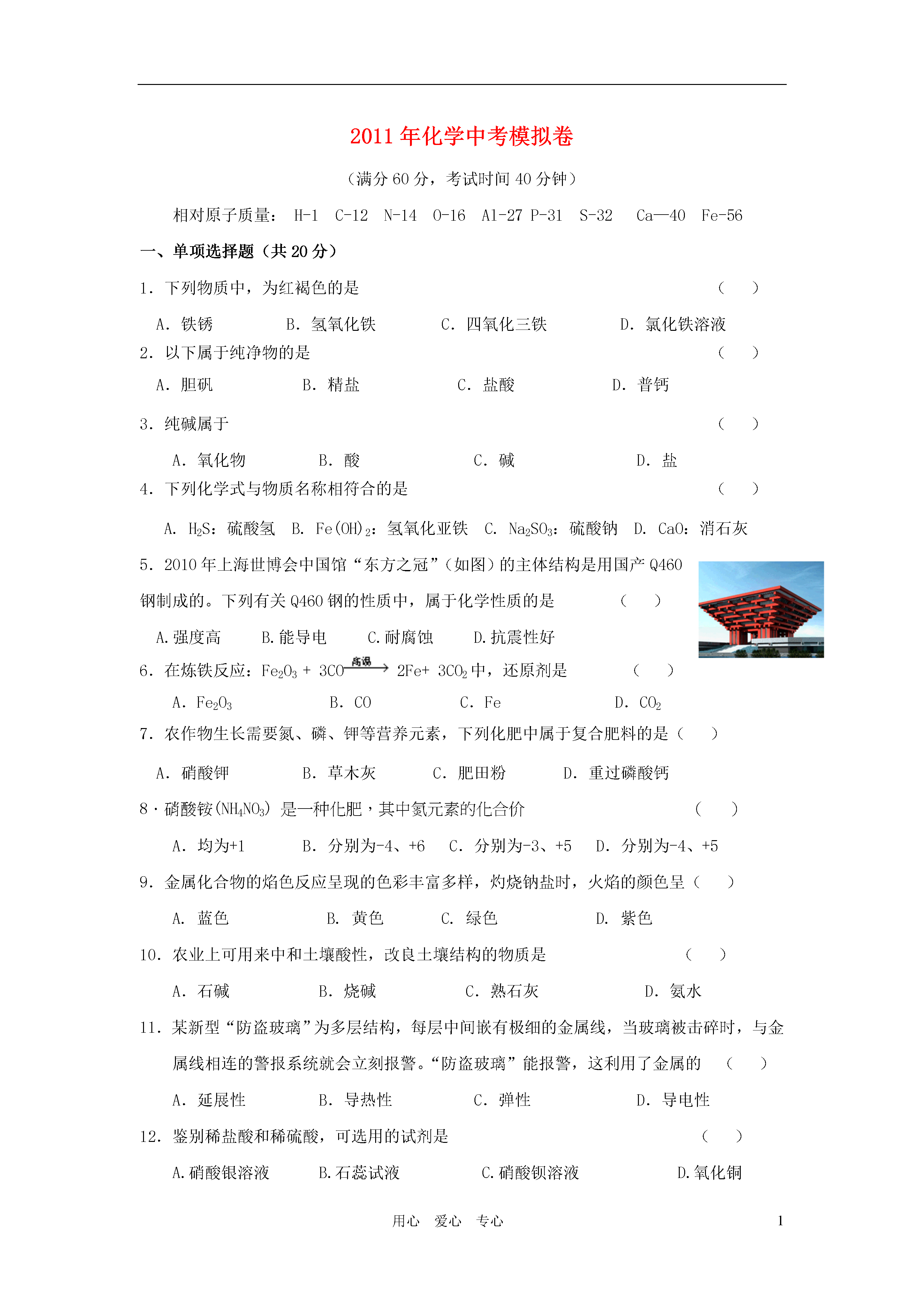 1用心爱心专心2011年化学中考模拟卷(满分60分,考试时间40分钟)相对原子质量:H-1C-12N-14O-16Al-27P-31S-32Ca—40Fe-56一、单项选择题(共20分)1.下列物质中,为红褐色的是()A.铁锈B.氢氧化铁C.四氧化三铁D.氯化铁溶液2.以下属于纯净物的是()A.胆矾B.精盐C.盐酸D.普钙3.纯碱属于()A.氧化物B.酸C.碱D.盐4.下列化学式与物质名称相符合的是()A.H2S:硫酸氢B.Fe(OH)2:氢氧化亚铁C.Na2SO3:硫酸钠D.CaO:消石灰5.2010年上海世博会中国馆“东方之冠”(如图)的主体结构是用国产Q460钢制成的。下列有关Q460钢的性质中,属于化学性质的是()A.强度高B.能导电C.耐腐蚀D.抗震性好6.在炼铁反应:Fe2O3+3CO2Fe+3CO2中,还原剂是()A.Fe2O3B.COC.FeD.CO27.农作物生长需要氮、磷、钾等营养元素,下列化肥中属于复合肥料的是()A.硝酸钾B.草木灰C.肥田粉D.重过磷酸钙8.硝酸铵(NH4NO3)是一种化肥,其中氮元素的化合价()A.均为+1B.分别为-4、+6C.分别为-3、+5D.分别为-4、+59.金属化合物的焰色反应呈现的色彩丰富多样,灼烧钠盐时,火焰的颜色呈()A.蓝色B.黄色C.绿色D.紫色10.农业上可用来中和土壤酸性,改良土壤结构的物质是()A.石碱B.烧碱C.熟石灰D.氨水11.某新型“防盗玻璃”为多层结构,每层中间嵌有极细的金属线,当玻璃被击碎时,与金属线相连的警报系统就会立刻报警。“防盗玻璃”能报警,这利用了金属的()A.延展性B.导热性C.弹性D.导电性12.鉴别稀盐酸和稀硫酸,可选用的试剂是()A.硝酸银溶液B.石蕊试液C.硝酸钡溶液D.氧化铜13.若金属锰(Mn)在金属活动性顺序中位于铝和锌之间,则下列反应不正确的是()A.Mn+H2SO4→MnSO4+H2↑B.Mg+MnSO4→MgSO4+MnC.Fe+MnSO4→FeSO4+MnD.Mn+CuSO4→MnSO4+Cu14.化学方程式是重要的化学用语,正确的化学方程式是()A.4Fe+3O22Fe2O3B.CO+CuOCu+CO2↑C.Fe+Hg(NO3)2→Fe(NO3)2+HgD.2NaOH+SO2→Na2SO4+H215.物质的性质决定其用途。有关物质的用途不正确的是()A.用烧碱溶液吸收二氧化硫尾气B.明矾用作水的消毒剂C.用胆矾、生石灰与水配制农药D.食盐水用于清洗伤口16.下列图示“错误操作”与图下面“可能产生的后果”不一致的是()A.沾污滴管B.滤液溅出C.量筒受损D.试剂外流17.“物质的量”是国际单位制中的一个基本物理量,下列有关说法正确的是()A.28gN2含1mol氮B.1molO2约含6.02×1023个氧原子C.1molCO2含有3mol原子D.H2O的摩尔质量是1818.达菲(C16H31N2PO8)是用莽草酸合成的治疗H1N1流感的良药。下列说法正确的是()A.达菲由5个元素组成B.达菲由58个原子构成C.达菲中氮、氢原子个数比是31∶28D.达菲中碳元素的质量分数最大19.下列图像对应叙述关系正确的是()A.向pH=3的溶液中加水B.一定质量的稀盐酸与锌粒反应C.向H2SO4和CuSO4混合溶液中加NaOH溶液D.煅烧一定质量的石灰石20.将质量相等的铝粉和铁粉分别与同体积、同浓度的稀硫酸反应,反应情况如下图所示。有关叙述中正确的是()A.铝粉、铁粉和硫酸反应后均有剩余B.铝粉、铁粉均反应完,硫酸有剩余C.硫酸、铁粉均反应完,铝粉有剩余D.硫酸、铝粉均反应完,铁粉有剩余二.填空题(共18分)21.生活中处处有化学,通过学习已经知道:(1)温度计中的水银是一种金属,其元素名称是。(2)Na2CO3的水溶液可用于洗涤油污,其水溶液能使酚酞试液变色。(3)尿素〔CO(NH2)2〕是一种优质高效氮肥,其中氮元素的质量分数是。(4)蚊子体内含有的甲酸是一种一元有机含氧酸,被蚊子叮咬后可涂肥皂水止痒,则室温时肥皂水的pH7(填“>”、“<”或“=”)。22.生石灰放入水中,得到的石灰乳是不均一、不稳定的悬浊液。(1)石灰乳中固态物质的化学式为____________。(2)石灰乳经过,可得到澄清的饱和石灰水。(3)在饱和石灰水中加入生石灰,冷却至原温度,下列各项发生减少的是(填序号)。A.溶质的质量B.溶液的pHC.溶解度D.溶质质量分数(4)只用一种试剂鉴别石灰水、烧碱溶液和稀硫酸,这种试剂是,有关的化学方程式是、。23.将一定溶质质量分数的浓盐酸盛于烧杯中,敞口放置在实