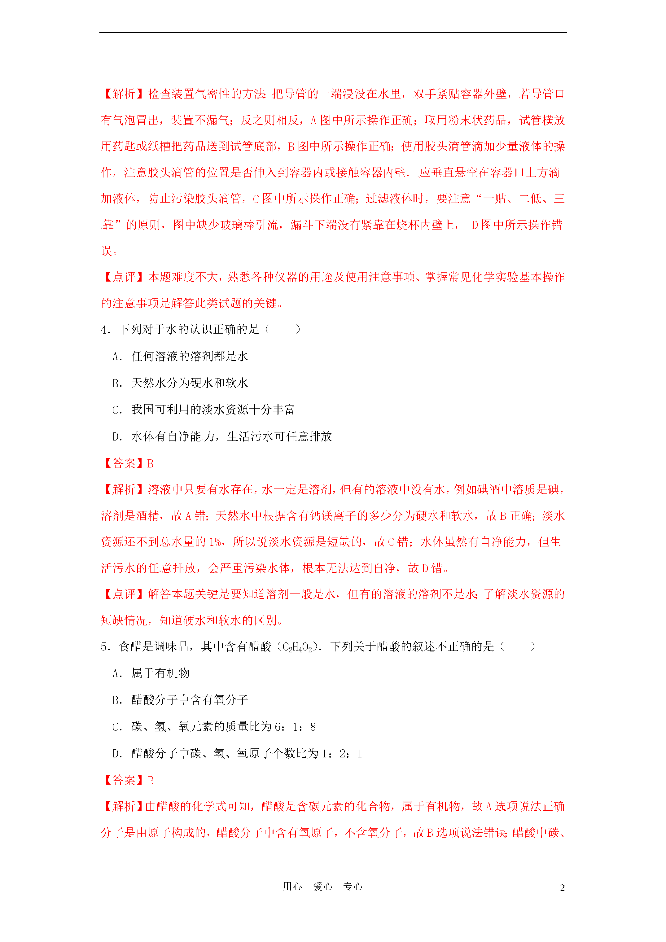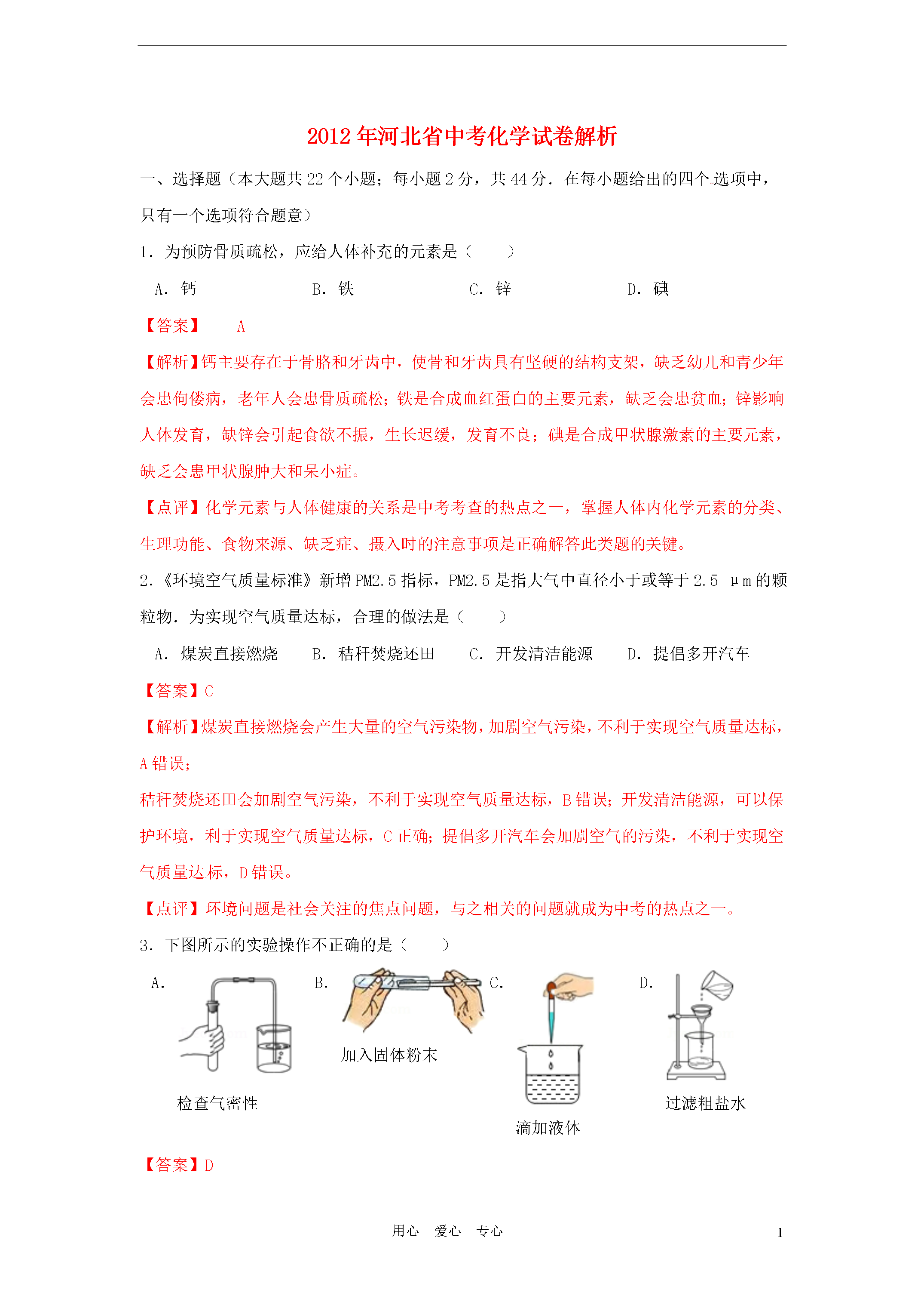 12用心爱心专心2012年河北省中考化学试卷解析一、选择题(本大题共22个小题;每小题2分,共44分.在每小题给出的四个选项中,只有一个选项符合题意)1.为预防骨质疏松,应给人体补充的元素是()A.钙B.铁C.锌D.碘【答案】A【解析】钙主要存在于骨胳和牙齿中,使骨和牙齿具有坚硬的结构支架,缺乏幼儿和青少年会患佝偻病,老年人会患骨质疏松;铁是合成血红蛋白的主要元素,缺乏会患贫血;锌影响人体发育,缺锌会引起食欲不振,生长迟缓,发育不良;碘是合成甲状腺激素的主要元素,缺乏会患甲状腺肿大和呆小症。【点评】化学元素与人体健康的关系是中考考查的热点之一,掌握人体内化学元素的分类、生理功能、食物来源、缺乏症、摄入时的注意事项是正确解答此类题的关键。2.《环境空气质量标准》新增PM2.5指标,PM2.5是指大气中直径小于或等于2.5μm的颗粒物.为实现空气质量达标,合理的做法是()A.煤炭直接燃烧B.秸秆焚烧还田C.开发清洁能源D.提倡多开汽车【答案】C【解析】煤炭直接燃烧会产生大量的空气污染物,加剧空气污染,不利于实现空气质量达标,A错误;秸秆焚烧还田会加剧空气污染,不利于实现空气质量达标,B错误;开发清洁能源,可以保护环境,利于实现空气质量达标,C正确;提倡多开汽车会加剧空气的污染,不利于实现空气质量达标,D错误。【点评】环境问题是社会关注的焦点问题,与之相关的问题就成为中考的热点之一。3.下图所示的实验操作不正确的是()A.检查气密性B.加入固体粉末C.滴加液体D.过滤粗盐水【答案】D【解析】检查装置气密性的方法:把导管的一端浸没在水里,双手紧贴容器外壁,若导管口有气泡冒出,装置不漏气;反之则相反,A图中所示操作正确;取用粉末状药品,试管横放用药匙或纸槽把药品送到试管底部,B图中所示操作正确;使用胶头滴管滴加少量液体的操作,注意胶头滴管的位置是否伸入到容器内或接触容器内壁.应垂直悬空在容器口上方滴加液体,防止污染胶头滴管,C图中所示操作正确;过滤液体时,要注意“一贴、二低、三靠”的原则,图中缺少玻璃棒引流,漏斗下端没有紧靠在烧杯内壁上,D图中所示操作错误。【点评】本题难度不大,熟悉各种仪器的用途及使用注意事项、掌握常见化学实验基本操作的注意事项是解答此类试题的关键。4.下列对于水的认识正确的是()A.任何溶液的溶剂都是水B.天然水分为硬水和软水C.我国可利用的淡水资源十分丰富D.水体有自净能力,生活污水可任意排放【答案】B【解析】溶液中只要有水存在,水一定是溶剂,但有的溶液中没有水,例如碘酒中溶质是碘,溶剂是酒精,故A错;天然水中根据含有钙镁离子的多少分为硬水和软水,故B正确;淡水资源还不到总水量的1%,所以说淡水资源是短缺的,故C错;水体虽然有自净能力,但生活污水的任意排放,会严重污染水体,根本无法达到自净,故D错。【点评】解答本题关键是要知道溶剂一般是水,但有的溶液的溶剂不是水;了解淡水资源的短缺情况,知道硬水和软水的区别。5.食醋是调味品,其中含有醋酸(C2H4O2).下列关于醋酸的叙述不正确的是()A.属于有机物B.醋酸分子中含有氧分子C.碳、氢、氧元素的质量比为6:1:8D.醋酸分子中碳、氢、氧原子个数比为1:2:1【答案】B【解析】由醋酸的化学式可知,醋酸是含碳元素的化合物,属于有机物,故A选项说法正确分子是由原子构成的,醋酸分子中含有氧原子,不含氧分子,故B选项说法错误;醋酸中碳、氢、氧元素的质量比为(12×2):(1×4):(16×2)=6:1:8,故C选项说法正确;由醋酸的化学式可知,一个醋酸分子是由2个碳原子、4个氢原子和2个氧原子构成的,则醋酸分子中碳、氢、氧原子个数比为1:2:1,故D选项说法正确。【点评】本题难度不大,考查同学们结合新信息、灵活运用有机物的概念、化学式的含义与有关计算进行分析问题、解决问题的能力。6.下列结论正确的是()A.化学反应中一定有能量的变化B.饱和溶液降低温度一定会析出晶体C.组成元素相同的物质化学性质一定相同D.质子数相同的两种粒子其核外电子数一定相等【答案】A【解析】物质发生化学变化时一定伴随着热量的变化,即有放热现象或吸热现象发生,故A正确;对于溶解度随温度的降低而增大的物质来说,其饱和溶液降温就不会析出晶体,故B错误;组成元素相同的物质化学性质不一定相同,例如一氧化碳和二氧化碳都是由碳元素和氧元素组成的,但是它们的化学性质差异较大,故C错误;质子数相同的两种粒子其核外电子数不一定相等,例如铵根离子和钠原子,它们的质子数相等都是11,但是铵根离子只有10个电子,而钠原子11个电子,故D说法错误。【点评】要想解答好这类题目,首先,要理解和熟记物质发生化学变化时的能量变化,原子和离子的相互转化,以及与之相关的知识然后,根据所给的问题情景或图表信息等,结合所学的相关知识和技能,并细心