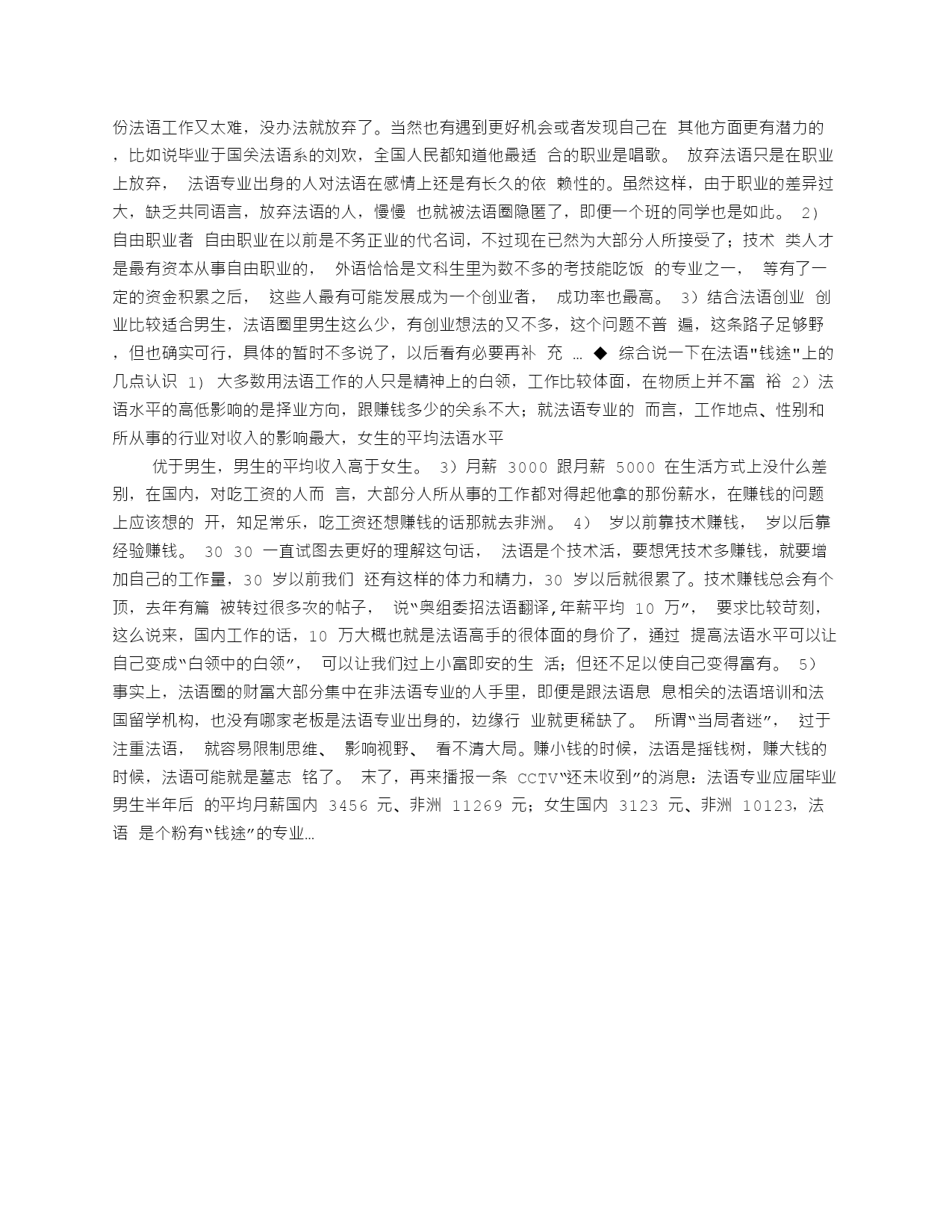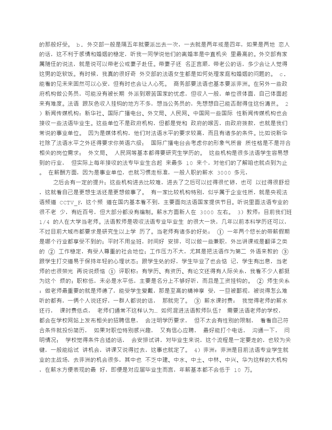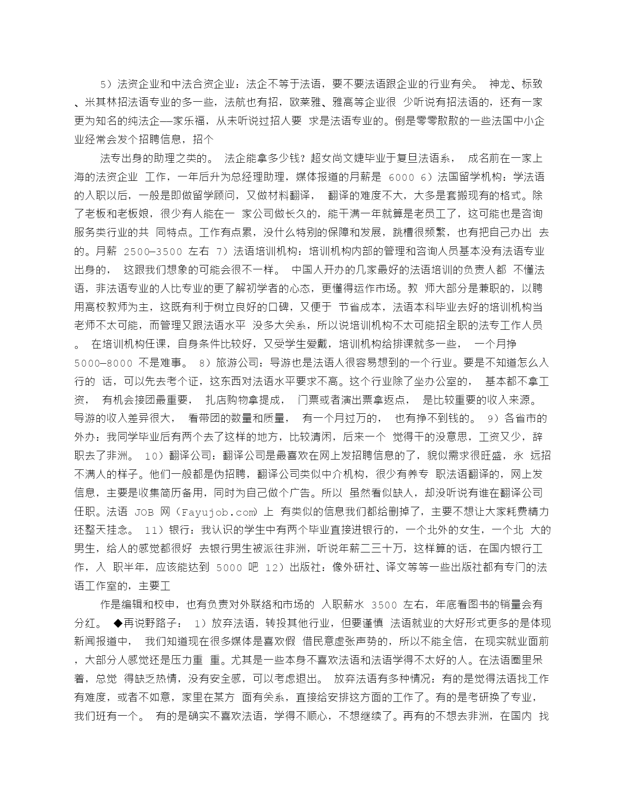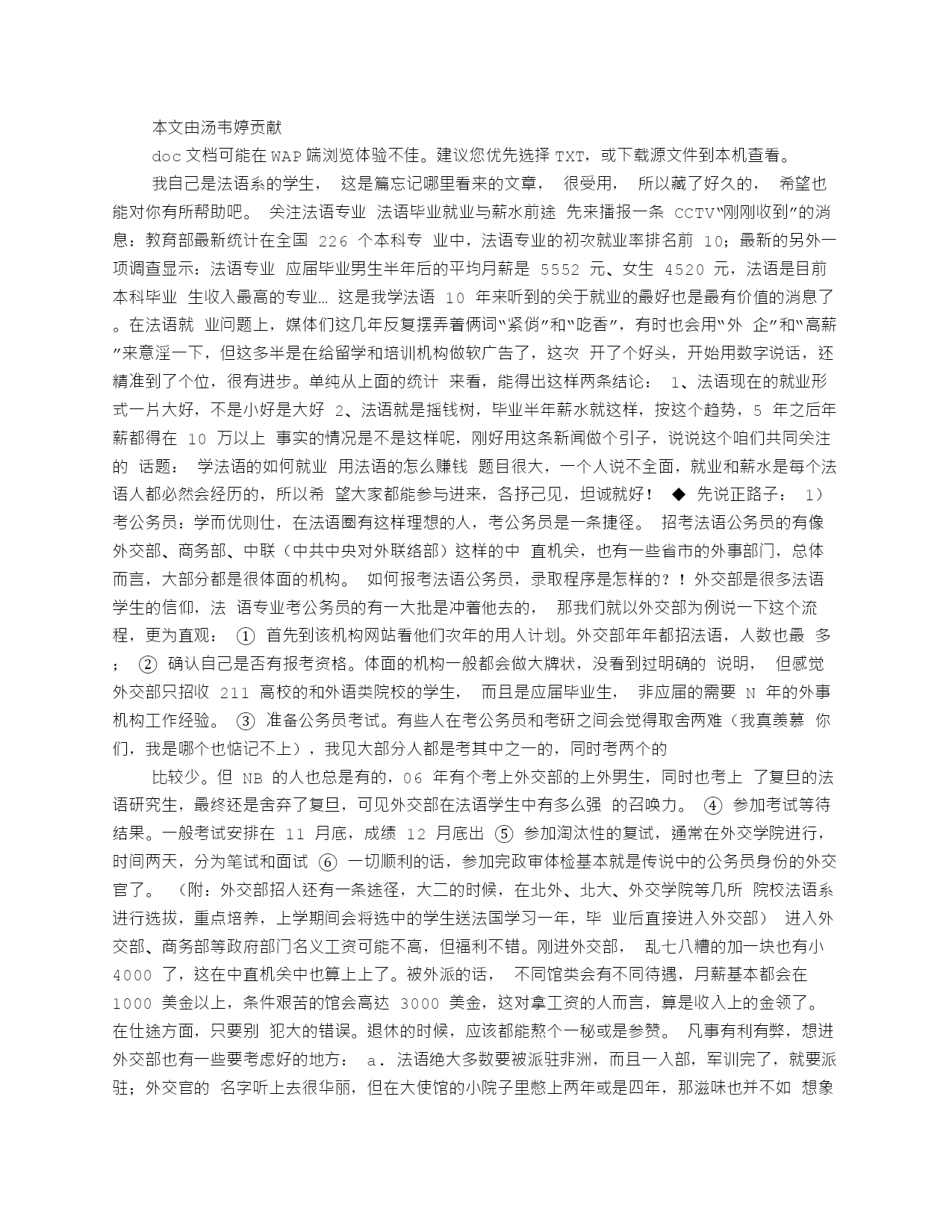 本文由汤韦婷贡献 doc文档可能在WAP端浏览体验不佳。建议您优先选择TXT,或下载源文件到本机查看。 我自己是法语系的学生,这是篇忘记哪里看来的文章,很受用,所以藏了好久的,希望也能对你有所帮助吧。关注法语专业法语毕业就业与薪水前途先来播报一条CCTV“刚刚收到”的消息:教育部最新统计在全国226个本科专业中,法语专业的初次就业率排名前10;最新的另外一项调查显示:法语专业应届毕业男生半年后的平均月薪是5552元、女生4520元,法语是目前本科毕业生收入最高的专业…这是我学法语10年来听到的关于就业的最好也是最有价值的消息了。在法语就业问题上,媒体们这几年反复摆弄着俩词“紧俏”和“吃香”,有时也会用“外企”和“高薪”来意淫一下,但这多半是在给留学和培训机构做软广告了,这次开了个好头,开始用数字说话,还精准到了个位,很有进步。单纯从上面的统计来看,能得出这样两条结论:1、法语现在的就业形式一片大好,不是小好是大好2、法语就是摇钱树,毕业半年薪水就这样,按这个趋势,5年之后年薪都得在10万以上事实的情况是不是这样呢,刚好用这条新闻做个引子,说说这个咱们共同关注的话题:学法语的如何就业用法语的怎么赚钱题目很大,一个人说不全面,就业和薪水是每个法语人都必然会经历的,所以希望大家都能参与进来,各抒己见,坦诚就好!◆先说正路子:1)考公务员:学而优则仕,在法语圈有这样理想的人,考公务员是一条捷径。招考法语公务员的有像外交部、商务部、中联(中共中央对外联络部)这样的中直机关,也有一些省市的外事部门,总体而言,大部分都是很体面的机构。如何报考法语公务员,录取程序是怎样的?!外交部是很多法语学生的信仰,法语专业考公务员的有一大批是冲着他去的,那我们就以外交部为例说一下这个流程,更为直观:①首先到该机构网站看他们次年的用人计划。外交部年年都招法语,人数也最多;②确认自己是否有报考资格。体面的机构一般都会做大牌状,没看到过明确的说明,但感觉外交部只招收211高校的和外语类院校的学生,而且是应届毕业生,非应届的需要N年的外事机构工作经验。③准备公务员考试。有些人在考公务员和考研之间会觉得取舍两难(我真羡慕你们,我是哪个也惦记不上),我见大部分人都是考其中之一的,同时考两个的 比较少。但NB的人也总是有的,06年有个考上外交部的上外男生,同时也考上了复旦的法语研究生,最终还是舍弃了复旦,可见外交部在法语学生中有多么强的召唤力。④参加考试等待结果。一般考试安排在11月底,成绩12月底出⑤参加淘汰性的复试,通常在外交学院进行,时间两天,分为笔试和面试⑥一切顺利的话,参加完政审体检基本就是传说中的公务员身份的外交官了。(附:外交部招人还有一条途径,大二的时候,在北外、北大、外交学院等几所院校法语系进行选拔,重点培养,上学期间会将选中的学生送法国学习一年,毕业后直接进入外交部)进入外交部、商务部等政府部门名义工资可能不高,但福利不错。刚进外交部,乱七八糟的加一块也有小4000了,这在中直机关中也算上上了。被外派的话,不同馆类会有不同待遇,月薪基本都会在1000美金以上,条件艰苦的馆会高达3000美金,这对拿工资的人而言,算是收入上的金领了。在仕途方面,只要别犯大的错误。退休的时候,应该都能熬个一秘或是参赞。凡事有利有弊,想进外交部也有一些要考虑好的地方:a.法语绝大多数要被派驻非洲,而且一入部,军训完了,就要派驻;外交官的名字听上去很华丽,但在大使馆的小院子里憋上两年或是四年,那滋味也并不如想象的那般好受。b.外交部一般是隔五年就要派出去一次,一去就是两年或是四年,如果是两地恋人的话,这不利于感情和婚姻的稳定,听我一同学说他们的离婚率是中直机关里最高的。外交部有家属随任的说法,就是说可以带老公或妻子赴任。带妻子还名正言顺,带老公的话,多少会让人觉得这男的吃软饭。有时候,我真的很好奇外交部的法语女生都是如何处理家庭和婚姻的问题的。c.能看的见未来固然可以心安,但有时也会让人心死。商务部要法语也基本要派非洲。在另外一些政府机构做公务员,可能没有被长期外派到艰苦国家的忧虑,但收入一般,单位很体面,自己体面起来有难度。法语跟灰色收入挂钩的地方不多,想当公务员的,先想想自己能否耐得住这份清贫。2)新闻传媒机构:新华社、国际广播电台、外文局、人民网、中国网一些国际性新闻传媒机构也会接收一些法语毕业生。这些单位不是政府机构,但都是党和政府的喉舌,由政府拨款,也就是我们常说的事业单位。因为是媒体机构,他们对法语水平的要求较高,而且有诸多的条件。比如说新华社除了法语水平之外还得要求你英语六级;国际广播电台会考虑你的形象气质音质性格是不是符合相关的岗位需求;外文局、人民网等基本都得要研究生学历的。这些机构是很多法语学生容易想到的行业,但实际上每年接收的法专毕业生合起来最多10来