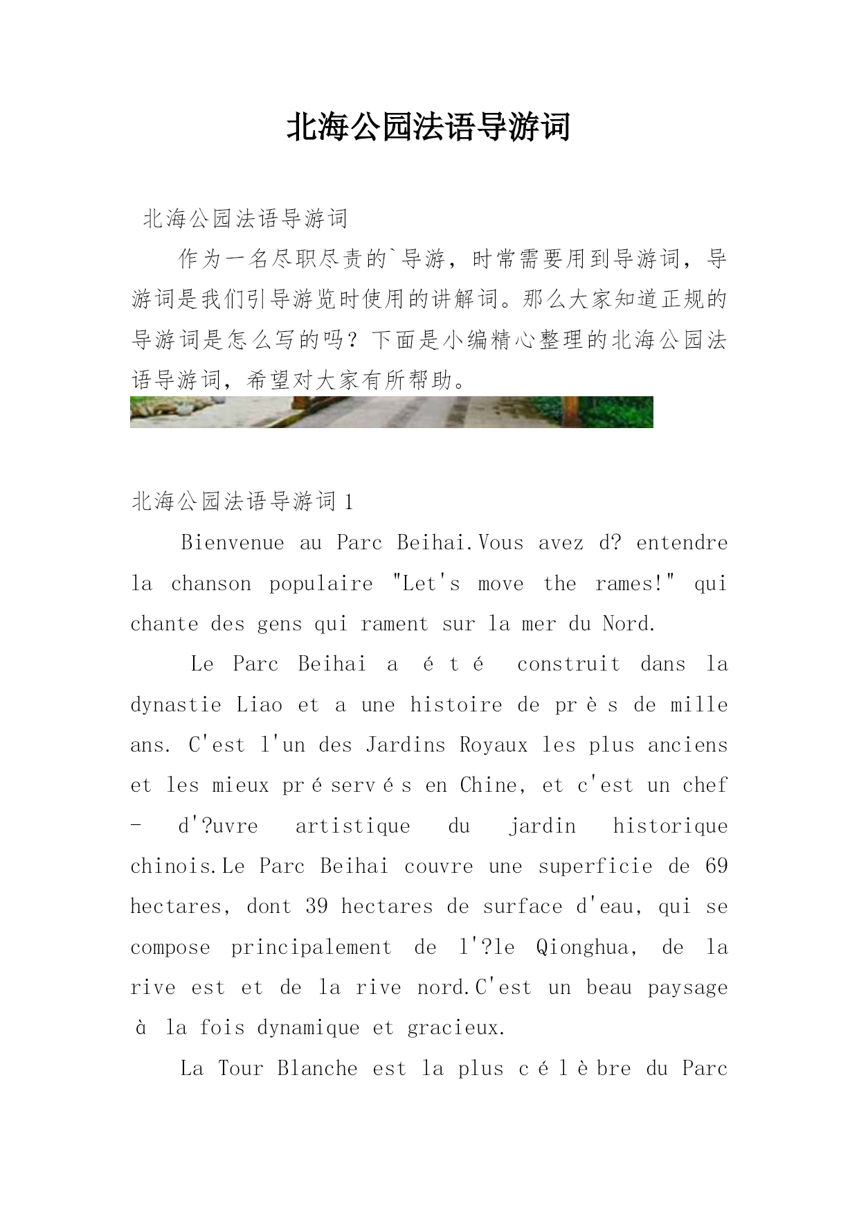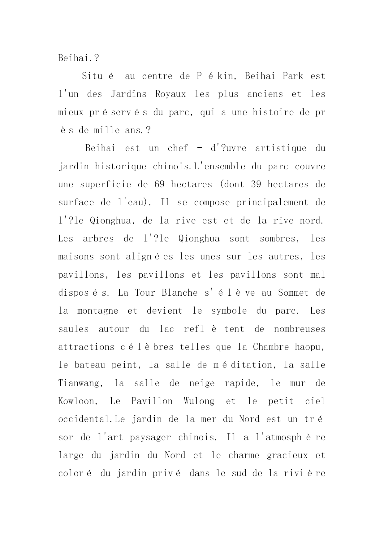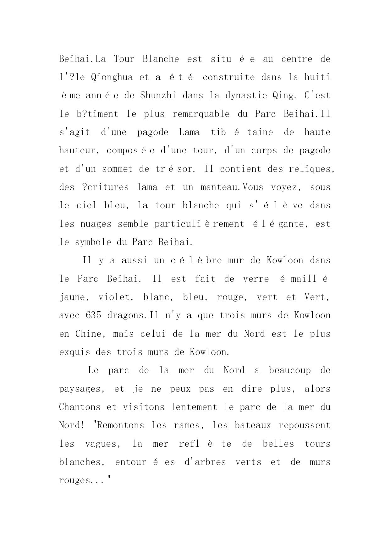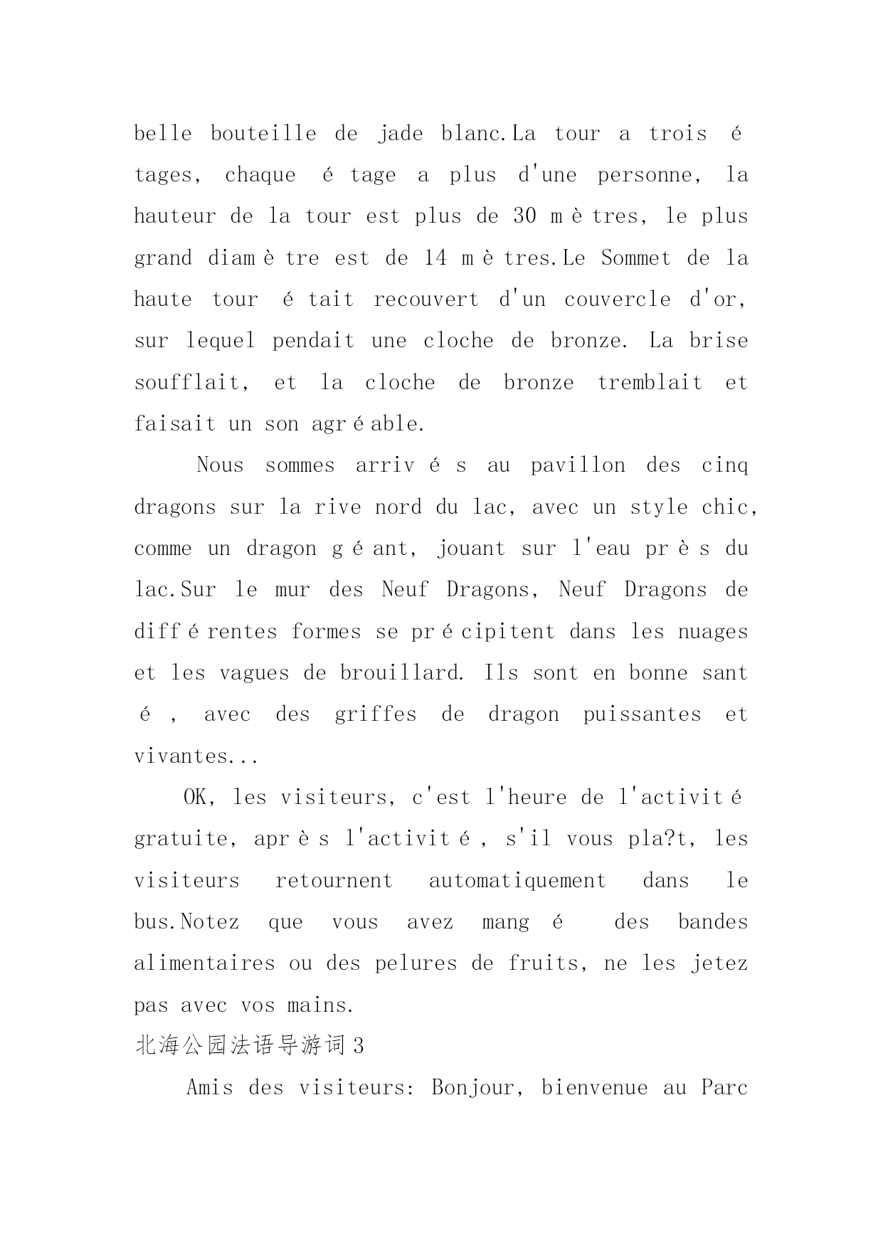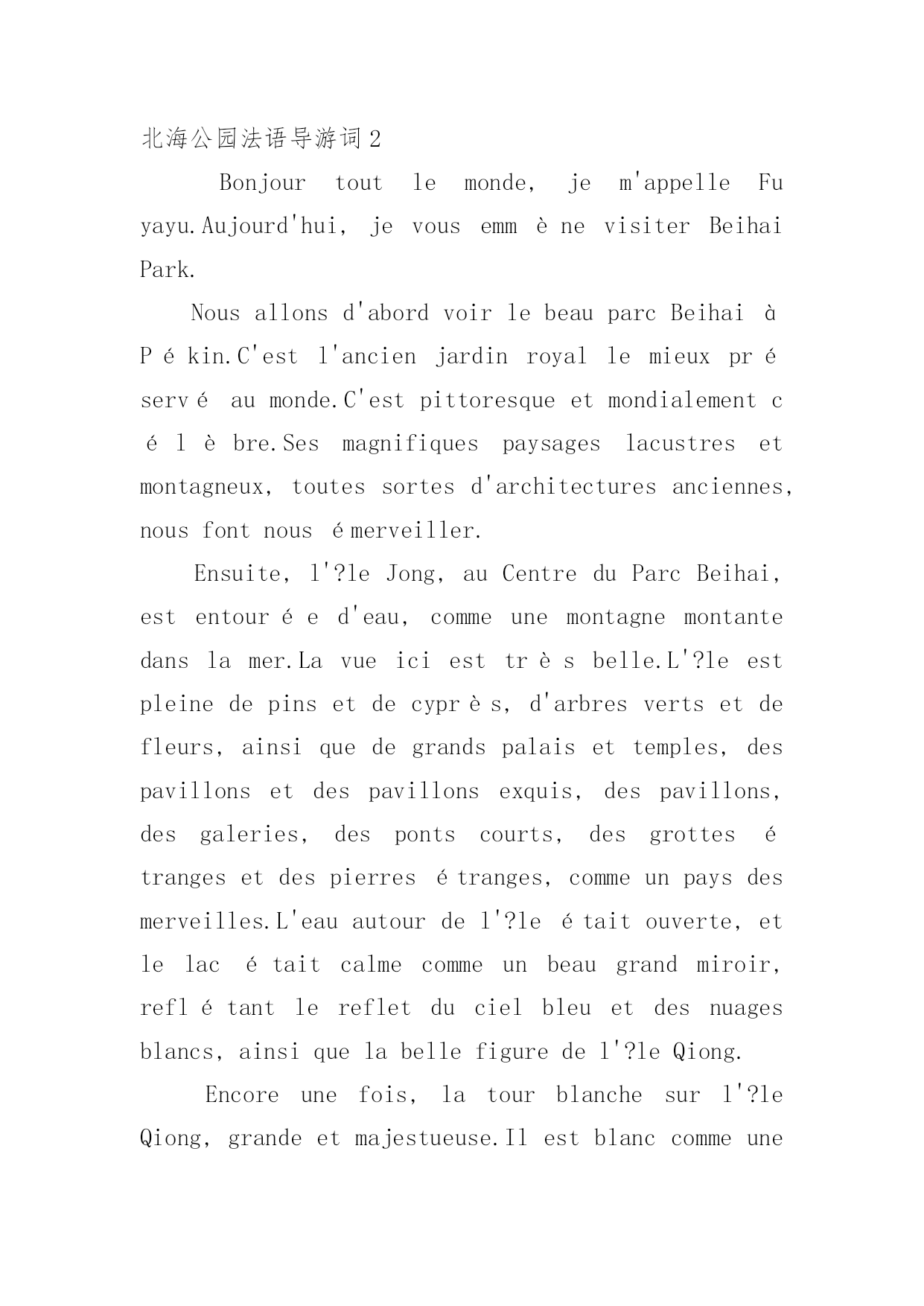 北海公园法语导游词 北海公园法语导游词作为一名尽职尽责的`导游,时常需要用到导游词,导游词是我们引导游览时使用的讲解词。那么大家知道正规的导游词是怎么写的吗?下面是小编精心整理的北海公园法语导游词,希望对大家有所帮助。北海公园法语导游词1BienvenueauParcBeihai.Vousavezd?entendrelachansonpopulaire"Let'smovetherames!"quichantedesgensquiramentsurlamerduNord.LeParcBeihaiaétéconstruitdansladynastieLiaoetaunehistoiredeprèsdemilleans.C'estl'undesJardinsRoyauxlesplusanciensetlesmieuxpréservésenChine,etc'estunchef-d'?uvreartistiquedujardinhistoriquechinois.LeParcBeihaicouvreunesuperficiede69hectares,dont39hectaresdesurfaced'eau,quisecomposeprincipalementdel'?leQionghua,delariveestetdelarivenord.C'estunbeaupaysageàlafoisdynamiqueetgracieux.LaTourBlancheestlapluscélèbreduParcBeihai.LaTourBlancheestsituéeaucentredel'?leQionghuaetaétéconstruitedanslahuitièmeannéedeShunzhidansladynastieQing.C'estleb?timentleplusremarquableduParcBeihai.Ils'agitd'unepagodeLamatibétainedehautehauteur,composéed'unetour,d'uncorpsdepagodeetd'unsommetdetrésor.Ilcontientdesreliques,des?critureslamaetunmanteau.Vousvoyez,souslecielbleu,latourblanchequis'élèvedanslesnuagessembleparticulièrementélégante,estlesymboleduParcBeihai.IlyaaussiuncélèbremurdeKowloondansleParcBeihai.Ilestfaitdeverreémailléjaune,violet,blanc,bleu,rouge,vertetVert,avec635dragons.Iln'yaquetroismursdeKowloonenChine,maisceluidelamerduNordestleplusexquisdestroismursdeKowloon.LeparcdelamerduNordabeaucoupdepaysages,etjenepeuxpasendireplus,alorsChantonsetvisitonslentementleparcdelamerduNord!"Remontonslesrames,lesbateauxrepoussentlesvagues,lamerreflètedebellestoursblanches,entouréesd'arbresvertsetdemursrouges..."北海公园法语导游词2Bonjourtoutlemonde,jem'appelleFuyayu.Aujourd'hui,jevousemmènevisiterBeihaiPark.Nousallonsd'abordvoirlebeauparcBeihaiàPékin.C'estl'ancienjardinroyallemieuxpréservéaumonde.C'estpittoresqueetmondialementcélèbre.Sesmagnifiquespaysageslacustresetmontagneux,toutessortesd'architecturesanciennes,nousfontnousémerveiller.Ensuite,l'?leJong,auCentreduParcBeihai,estentouréed'eau,commeunemontagnemontantedanslamer.Lavueiciesttrèsbelle.L'?leestpleinedepinset