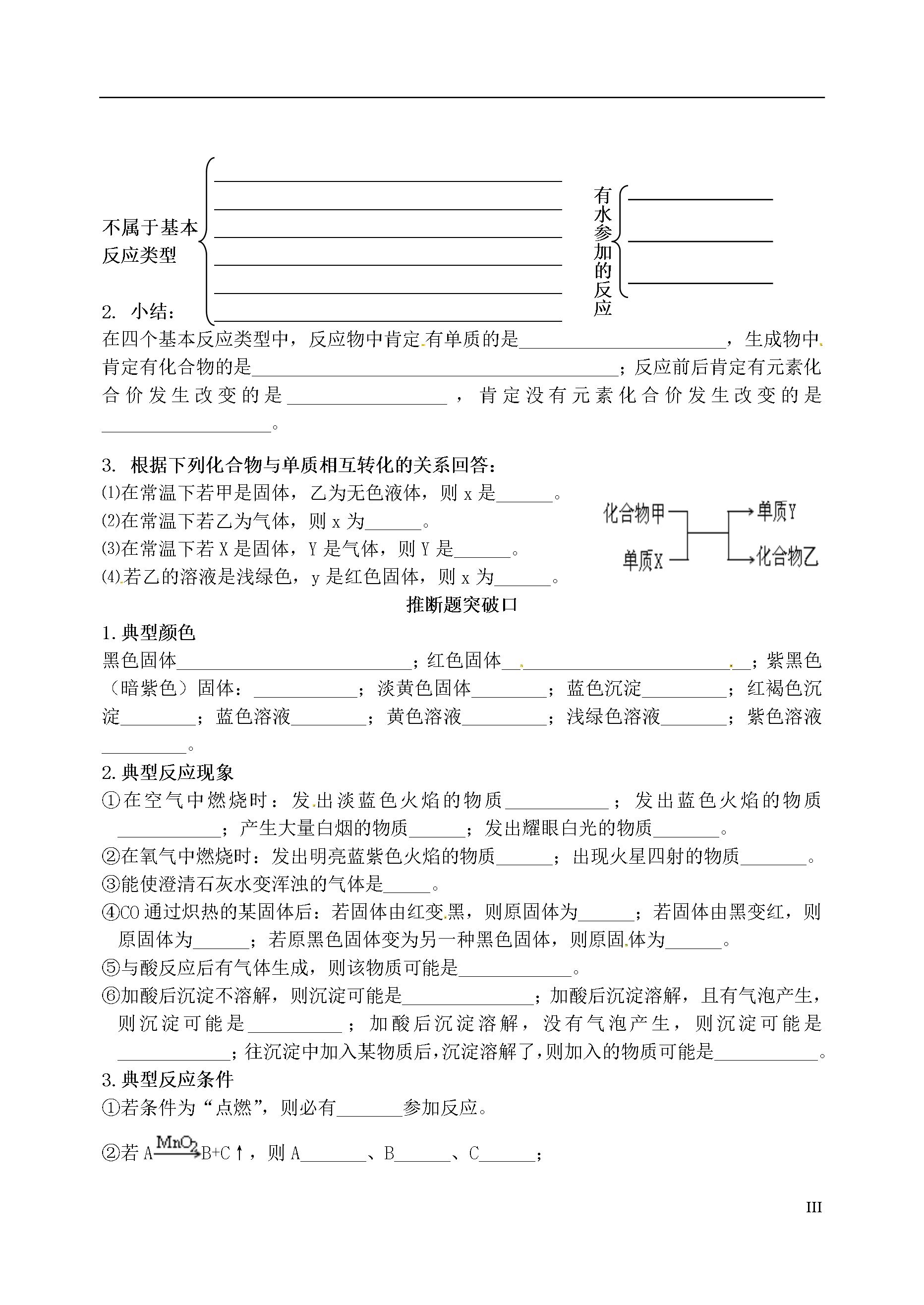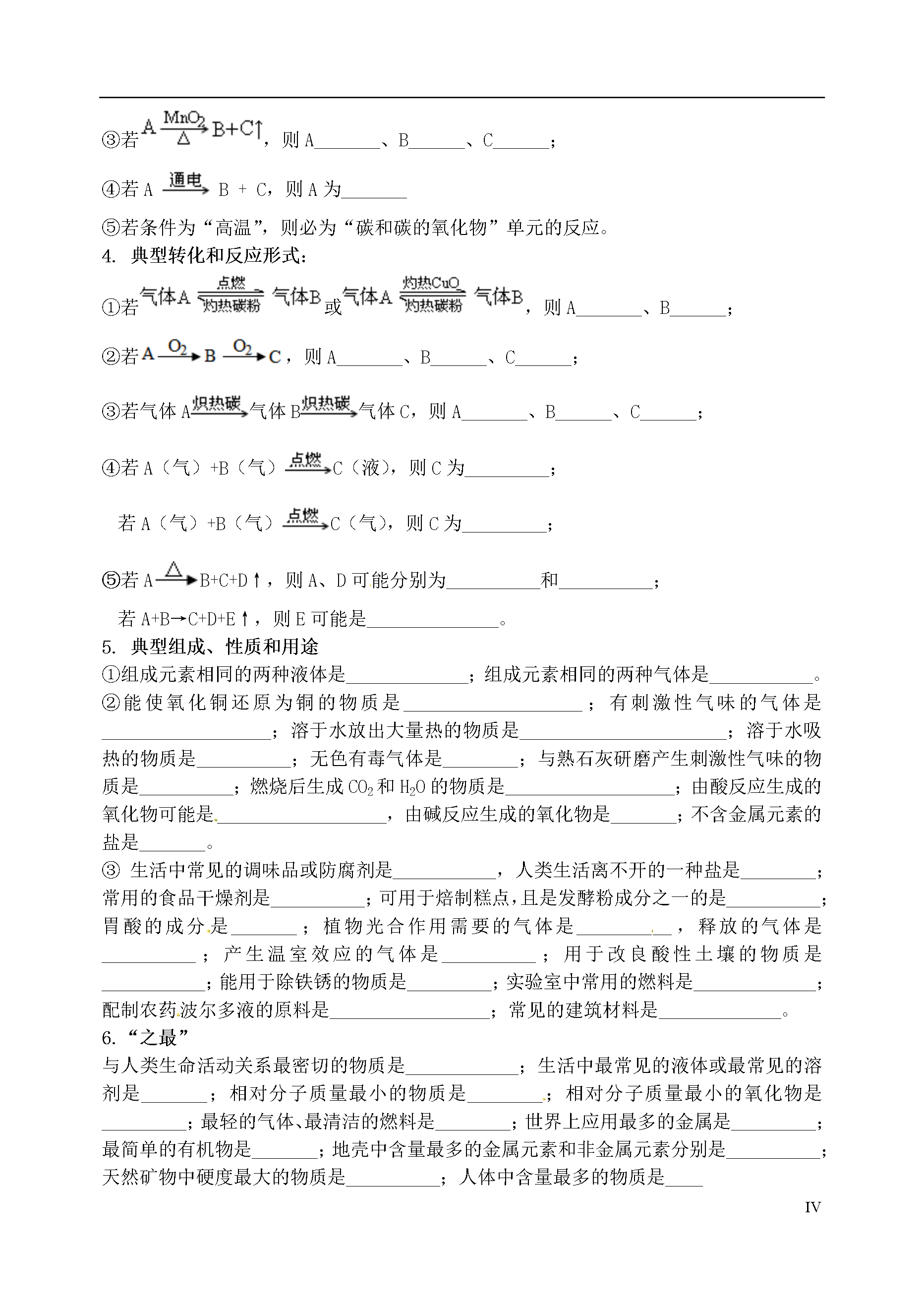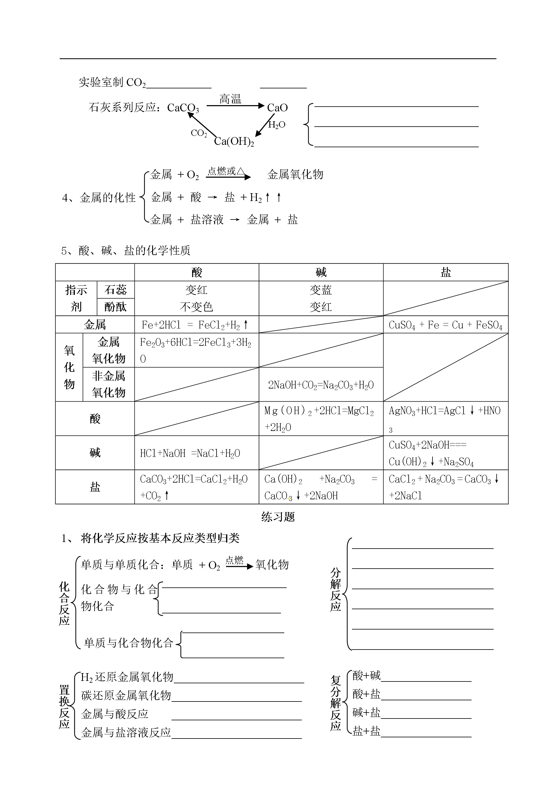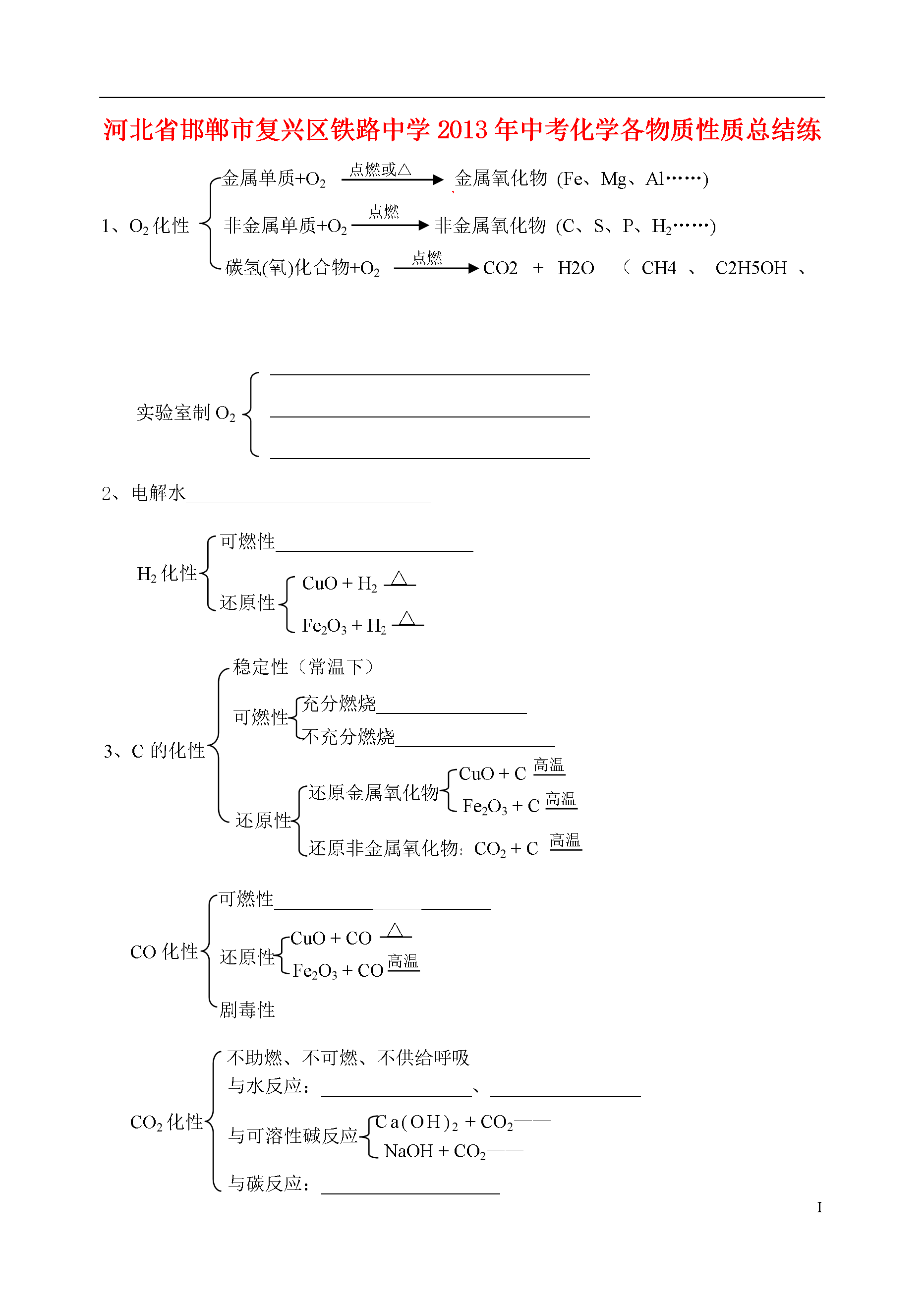 IV1、O2化性金属单质+O2金属氧化物(Fe、Mg、Al……)点燃或△非金属单质+O2非金属氧化物(C、S、P、H2……)点燃碳氢(氧)化合物+O2CO2+H2O(CH4、C2H5OH、C6H12O6)点燃河北省邯郸市复兴区铁路中学2013年中考化学各物质性质总结练习______________________________________________________________________________________________________实验室制O22、电解水__________________________可燃性_____________________CuO+H2H2化性还原性Fe2O3+H2△△3、C的化性稳定性(常温下)可燃性充分燃烧________________不充分燃烧_________________还原性还原金属氧化物Fe2O3+CCuO+C高温高温还原非金属氧化物:CO2+C高温可燃性_______________________剧毒性还原性CuO+COFe2O3+CO高温△CO化性不助燃、不可燃、不供给呼吸与水反应:________________、________________与碳反应:___________________CO2化性与可溶性碱反应Ca(OH)2+CO2——NaOH+CO2——实验室制CO2_____________________________________________________________________________________________________________________石灰系列反应:CaCO3CaO高温H2OCO2Ca(OH)2金属+O2金属氧化物点燃或△金属+酸→盐+H2↑↑金属+盐溶液→金属+盐4、金属的化性5、酸、碱、盐的化学性质酸碱盐指示剂石蕊变红不变色变蓝变红酚酞金属Fe+2HCl=FeCl2+H2↑CuSO4+Fe=Cu+FeSO4氧化物金属氧化物Fe2O3+6HCl=2FeCl3+3H2O非金属氧化物2NaOH+CO2=Na2CO3+H2O酸Mg(OH)2+2HCl=MgCl2+2H2OAgNO3+HCl=AgCl↓+HNO3碱HCl+NaOH=NaCl+H2OCuSO4+2NaOH===Cu(OH)2↓+Na2SO4盐CaCO3+2HCl=CaCl2+H2O+CO2↑Ca(OH)2+Na2CO3=CaCO3↓+2NaOHCaCl2+Na2CO3=CaCO3↓+2NaCl练习题分解反应______________________________________________________________________________________________________________________________________________________将化学反应按基本反应类型归类化合物与化合物化合___________________________________________化合反应点燃氧化物单质与单质化合:单质+O2单质与化合物化合____________________________________复分解反应酸+碱________________酸+盐________________碱+盐________________盐+盐________________H2还原金属氧化物_______________________碳还原金属氧化物_______________________金属与酸反应_______________________金属与盐溶液反应_______________________置换反应有水参加的反应______________________________________________________________________________________________________________________________________________________________________________________________________________________________不属于基本反应类型2.小结:在四个基本反应类型中,反应物中肯定有单质的是______________________,生成物中肯定有化合物的是_______________________________________;反应前后肯定有元素化合价发生改变的是_________________,肯定没有元素化合价发生改变的是__________________。3.根据下列化合物与单质相互转化的关系