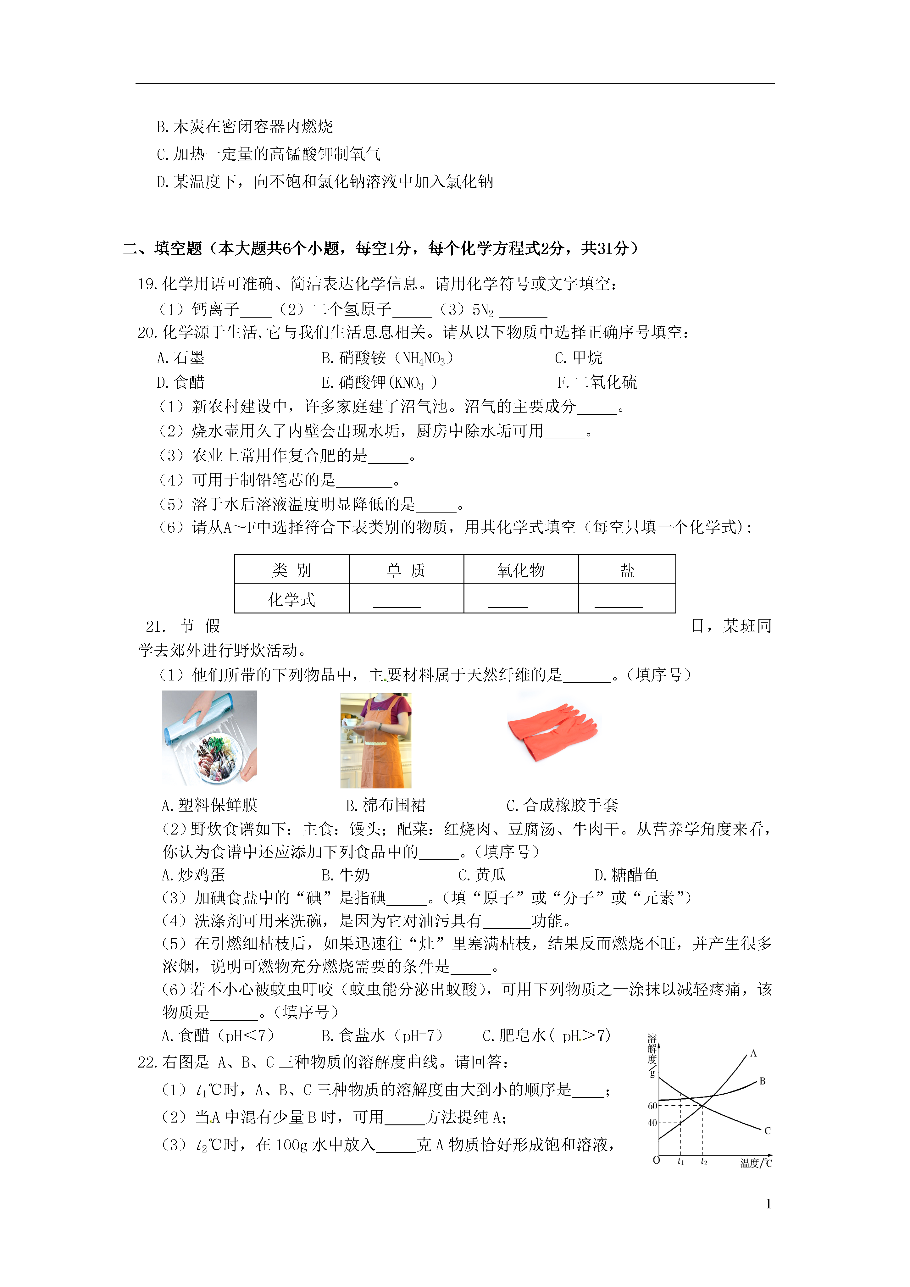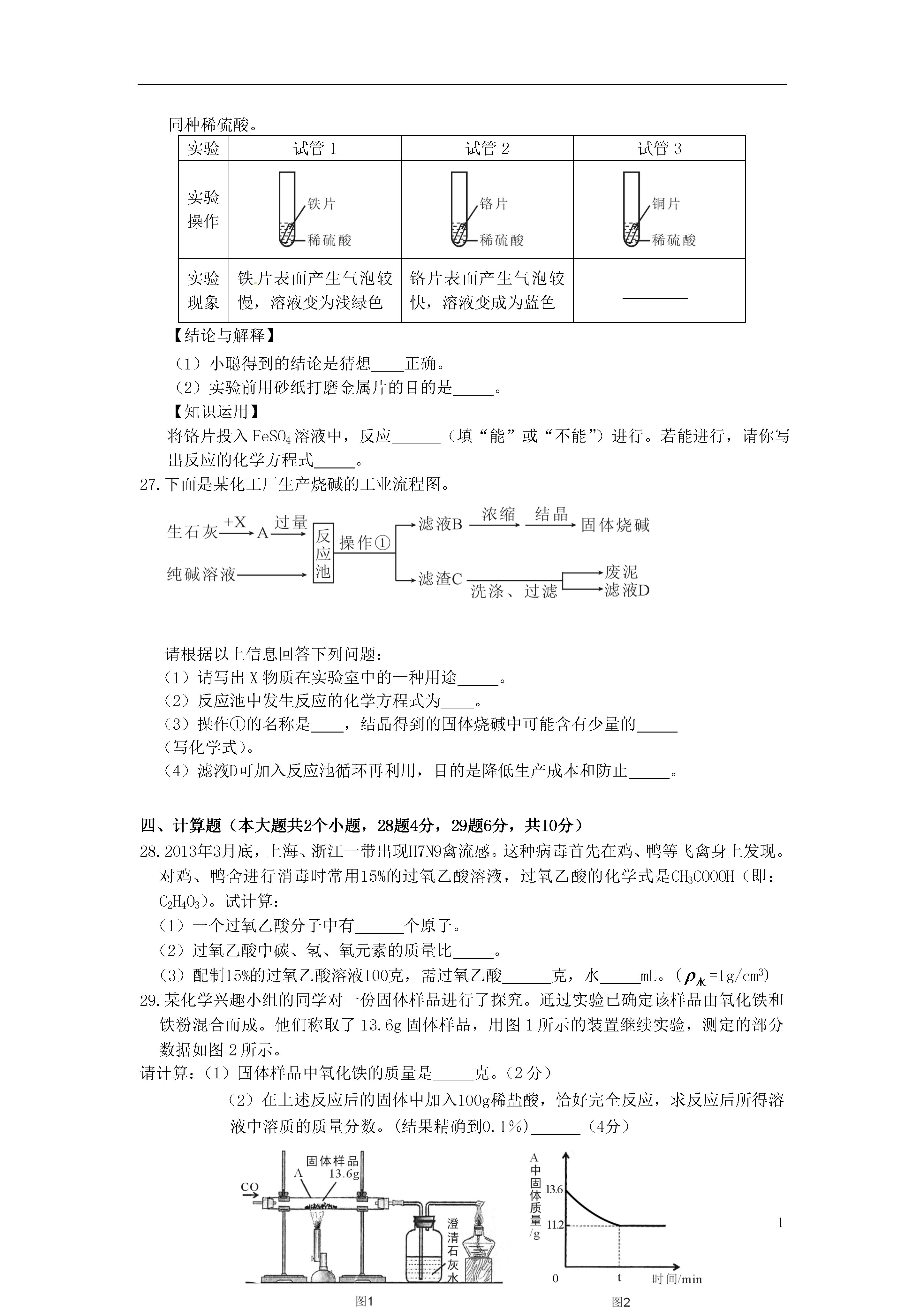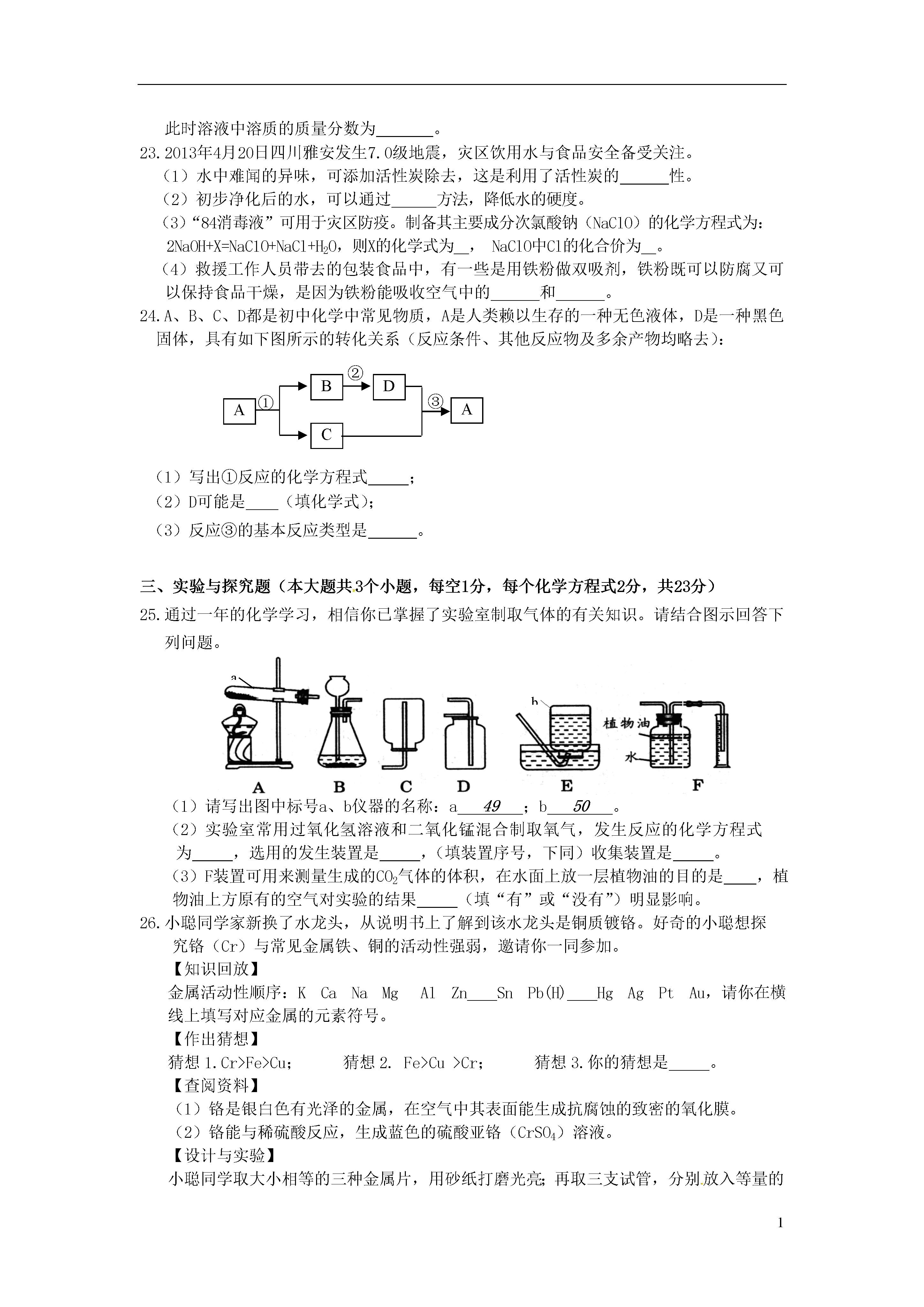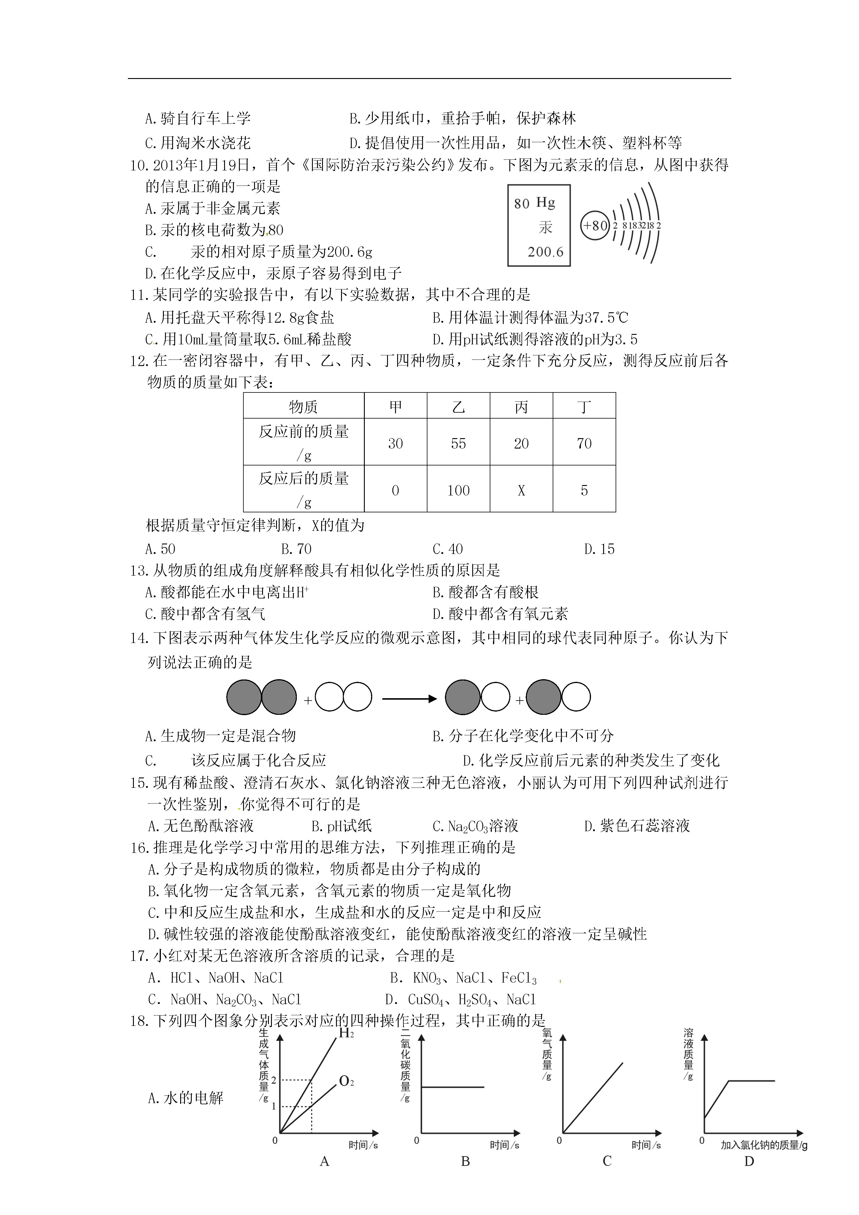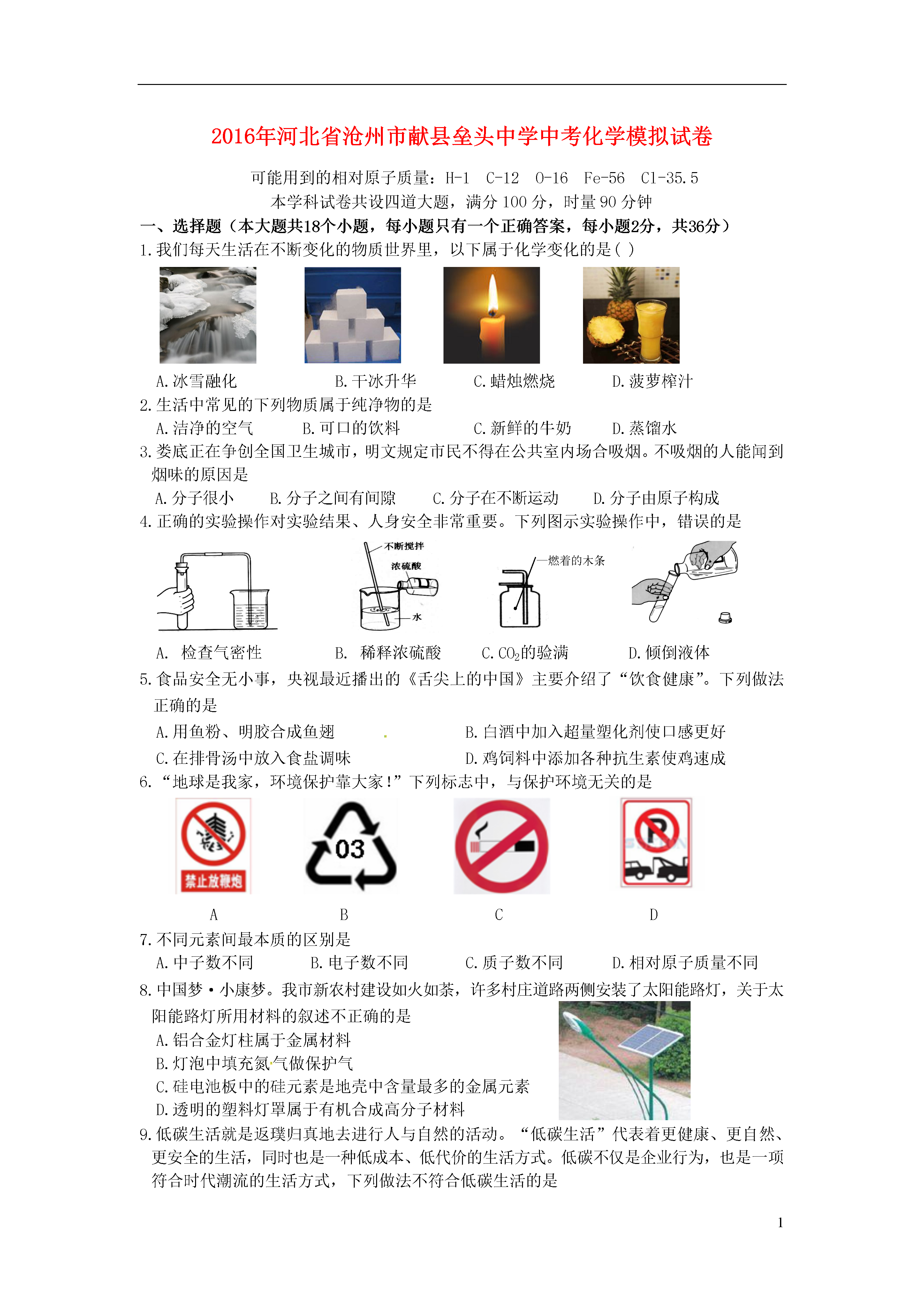 12016年河北省沧州市献县垒头中学中考化学模拟试卷可能用到的相对原子质量:H-1C-12O-16Fe-56Cl-35.5本学科试卷共设四道大题,满分100分,时量90分钟一、选择题(本大题共18个小题,每小题只有一个正确答案,每小题2分,共36分)1.我们每天生活在不断变化的物质世界里,以下属于化学变化的是()A.冰雪融化B.干冰升华C.蜡烛燃烧D.菠萝榨汁2.生活中常见的下列物质属于纯净物的是A.洁净的空气B.可口的饮料C.新鲜的牛奶D.蒸馏水3.娄底正在争创全国卫生城市,明文规定市民不得在公共室内场合吸烟。不吸烟的人能闻到烟味的原因是A.分子很小B.分子之间有间隙C.分子在不断运动D.分子由原子构成4.正确的实验操作对实验结果、人身安全非常重要。下列图示实验操作中,错误的是—燃着的木条A.检查气密性B.稀释浓硫酸C.CO2的验满D.倾倒液体5.食品安全无小事,央视最近播出的《舌尖上的中国》主要介绍了“饮食健康”。下列做法正确的是A.用鱼粉、明胶合成鱼翅B.白酒中加入超量塑化剂使口感更好C.在排骨汤中放入食盐调味D.鸡饲料中添加各种抗生素使鸡速成6.“地球是我家,环境保护靠大家!”下列标志中,与保护环境无关的是ABCD7.不同元素间最本质的区别是A.中子数不同B.电子数不同C.质子数不同D.相对原子质量不同8.中国梦·小康梦。我市新农村建设如火如荼,许多村庄道路两侧安装了太阳能路灯,关于太阳能路灯所用材料的叙述不正确的是A.铝合金灯柱属于金属材料B.灯泡中填充氮气做保护气C.硅电池板中的硅元素是地壳中含量最多的金属元素D.透明的塑料灯罩属于有机合成高分子材料9.低碳生活就是返璞归真地去进行人与自然的活动。“低碳生活”代表着更健康、更自然、更安全的生活,同时也是一种低成本、低代价的生活方式。低碳不仅是企业行为,也是一项符合时代潮流的生活方式,下列做法不符合低碳生活的是A.骑自行车上学B.少用纸巾,重拾手帕,保护森林C.用淘米水浇花D.提倡使用一次性用品,如一次性木筷、塑料杯等10.2013年1月19日,首个《国际防治汞污染公约》发布。下图为元素汞的信息,从图中获得的信息正确的一项是A.汞属于非金属元素B.汞的核电荷数为80C.汞的相对原子质量为200.6gD.在化学反应中,汞原子容易得到电子11.某同学的实验报告中,有以下实验数据,其中不合理的是A.用托盘天平称得12.8g食盐B.用体温计测得体温为37.5℃C.用10mL量筒量取5.6mL稀盐酸D.用pH试纸测得溶液的pH为3.512.在一密闭容器中,有甲、乙、丙、丁四种物质,一定条件下充分反应,测得反应前后各物质的质量如下表:物质甲乙丙丁反应前的质量/g30552070反应后的质量/g0100X5根据质量守恒定律判断,X的值为A.50B.70C.40D.1513.从物质的组成角度解释酸具有相似化学性质的原因是A.酸都能在水中电离出H+B.酸都含有酸根C.酸中都含有氢气D.酸中都含有氧元素14.下图表示两种气体发生化学反应的微观示意图,其中相同的球代表同种原子。你认为下列说法正确的是++A.生成物一定是混合物B.分子在化学变化中不可分C.该反应属于化合反应D.化学反应前后元素的种类发生了变化15.现有稀盐酸、澄清石灰水、氯化钠溶液三种无色溶液,小丽认为可用下列四种试剂进行一次性鉴别,你觉得不可行的是A.无色酚酞溶液B.pH试纸C.Na2CO3溶液D.紫色石蕊溶液16.推理是化学学习中常用的思维方法,下列推理正确的是A.分子是构成物质的微粒,物质都是由分子构成的B.氧化物一定含氧元素,含氧元素的物质一定是氧化物C.中和反应生成盐和水,生成盐和水的反应一定是中和反应D.碱性较强的溶液能使酚酞溶液变红,能使酚酞溶液变红的溶液一定呈碱性17.小红对某无色溶液所含溶质的记录,合理的是A.HCl、NaOH、NaClB.KNO3、NaCl、FeCl3C.NaOH、Na2CO3、NaClD.CuSO4、H2SO4、NaCl18.下列四个图象分别表示对应的四种操作过程,其中正确的是A.水的电解B.木炭在密闭容器内燃烧C.加热一定量的高锰酸钾制氧气D.某温度下,向不饱和氯化钠溶液中加入氯化钠二、填空题(本大题共6个小题,每空1分,每个化学方程式2分,共31分)19.化学用语可准确、简洁表达化学信息。请用化学符号或文字填空:(1)钙离子(2)二个氢原子(3)5N220.化学源于生活,它与我们生活息息相关。请从以下物质中选择正确序号填空:A.石墨B.硝酸铵(NH4NO3)C.甲烷D.食醋E.硝酸钾(KNO3)F.二氧