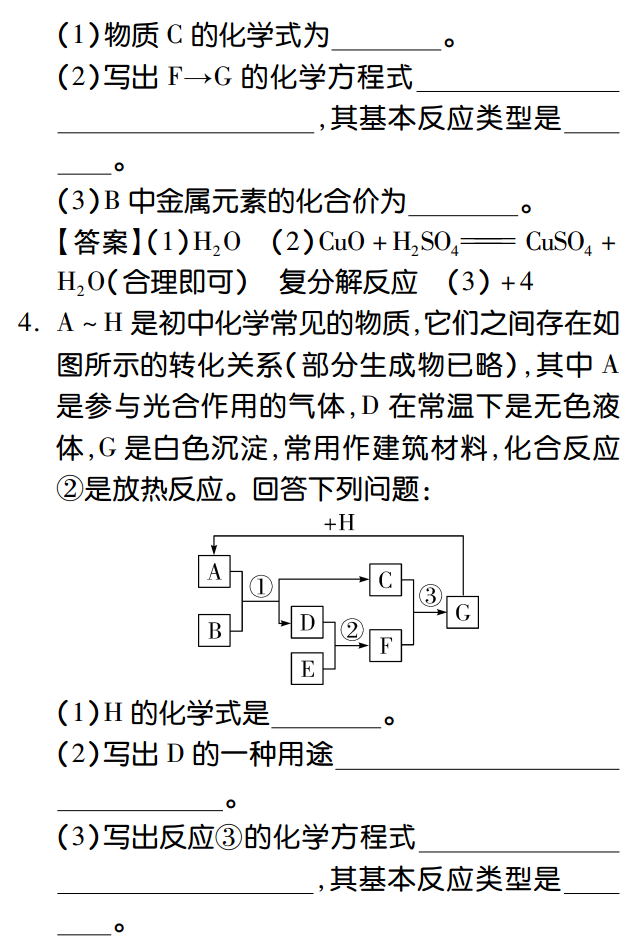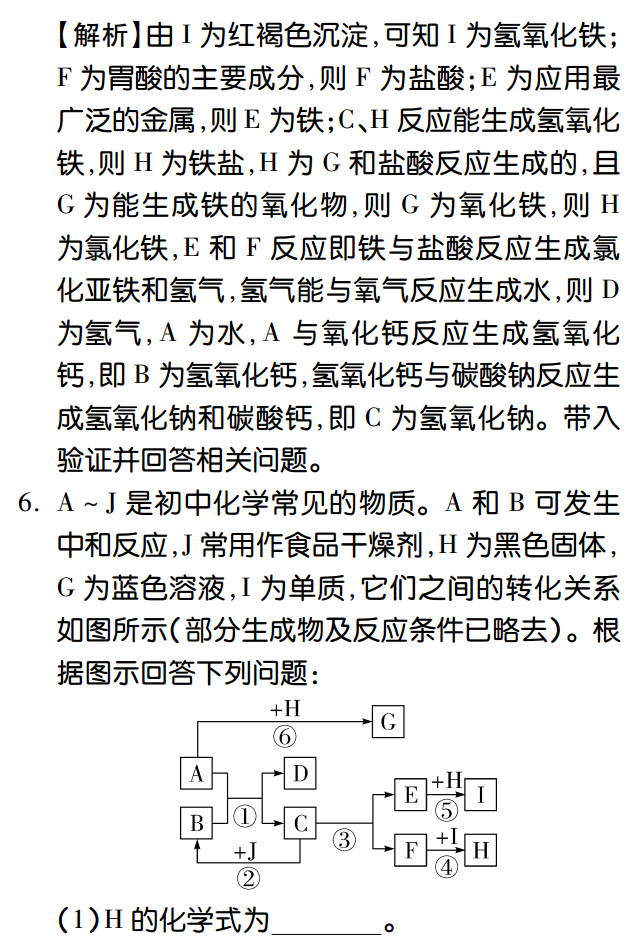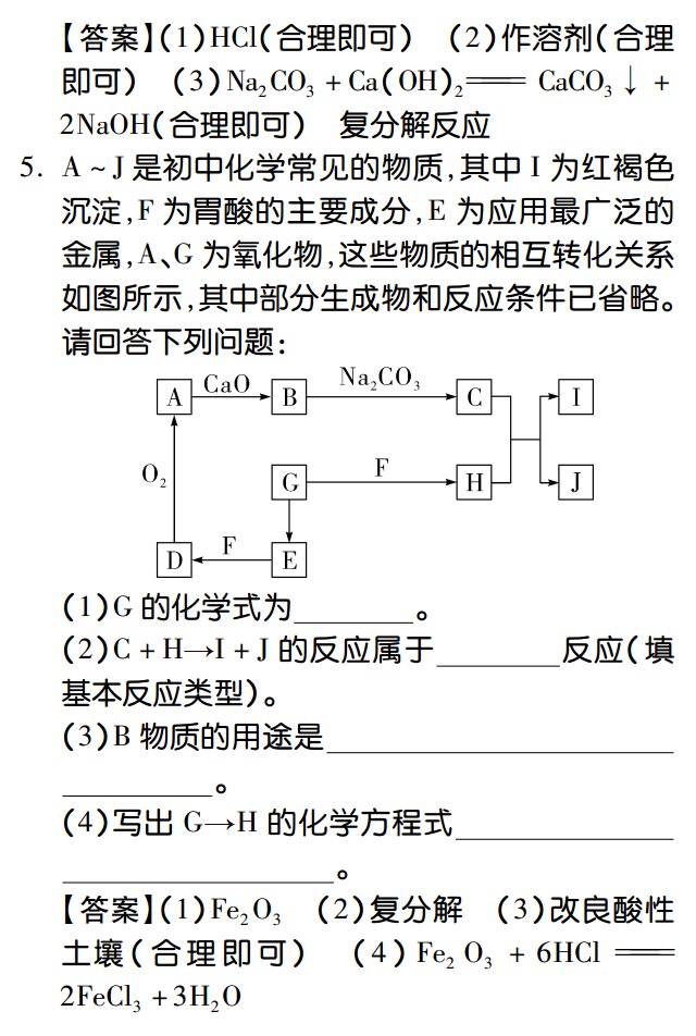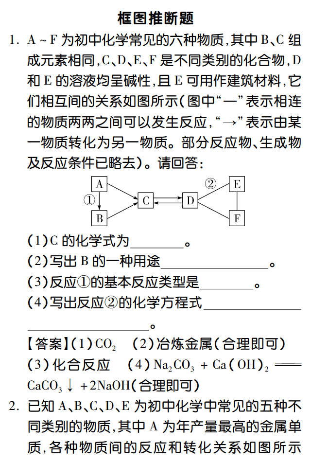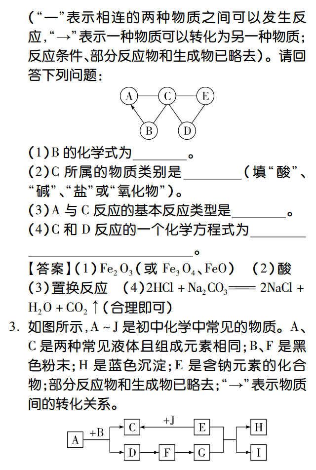 框图推断题1.A~F为初中化学常见的六种物质,其中B、C组成元素相同,C、D、E、F是不同类别的化合物,D和E的溶液均呈碱性,且E可用作建筑材料,它们相互间的关系如图所示(图中“—”表示相连的物质两两之间可以发生反应,“→”表示由某一物质转化为另一物质。部分反应物、生成物及反应条件已略去)。请回答:(1)C的化学式为。(2)写出B的一种用途。(3)反应①的基本反应类型是。(4)写出反应②的化学方程式。【答案】(1)CO2(2)冶炼金属(合理即可)(3)化合反应(4)Na2CO3+Ca(OH)2CaCO3↓+2NaOH(合理即可)2.已知A、B、C、D、E为初中化学中常见的五种不同类别的物质,其中A为年产量最高的金属单质,各种物质间的反应和转化关系如图所示书(“—”表示相连的两种物质之间可以发生反应,“→”表示一种物质可以转化为另一种物质;反应条件、部分反应物和生成物已略去)。请回答下列问题:(1)B的化学式为。(2)C所属的物质类别是(填“酸”、“碱”、“盐”或“氧化物”)。(3)A与C反应的基本反应类型是。(4)C和D反应的一个化学方程式为。【答案】(1)Fe2O3(或Fe3O4、FeO)(2)酸(3)置换反应(4)2HCl+Na2CO32NaCl+H2O+CO2↑(合理即可)3.如图所示,A~J是初中化学中常见的物质。A、C是两种常见液体且组成元素相同;B、F是黑色粉末;H是蓝色沉淀;E是含钠元素的化合物;部分反应物和生成物已略去;“→”表示物质间的转化关系。(1)物质C的化学式为。(2)写出F→G的化学方程式,其基本反应类型是。(3)B中金属元素的化合价为。【答案】(1)H2O(2)CuO+H2SO4CuSO4+H2O(合理即可)复分解反应(3)+44.A~H是初中化学常见的物质,它们之间存在如图所示的转化关系(部分生成物已略),其中A是参与光合作用的气体,D在常温下是无色液体,G是白色沉淀,常用作建筑材料,化合反应②是放热反应。回答下列问题:(1)H的化学式是。(2)写出D的一种用途。(3)写出反应③的化学方程式,其基本反应类型是。【答案】(1)HCl(合理即可)(2)作溶剂(合理即可)(3)Na2CO3+Ca(OH)2CaCO3↓+2NaOH(合理即可)复分解反应5.A~J是初中化学常见的物质,其中I为红褐色沉淀,F为胃酸的主要成分,E为应用最广泛的金属,A、G为氧化物,这些物质的相互转化关系如图所示,其中部分生成物和反应条件已省略。请回答下列问题:(1)G的化学式为。(2)C+H→I+J的反应属于反应(填基本反应类型)。(3)B物质的用途是。(4)写出G→H的化学方程式。【答案】(1)Fe2O3(2)复分解(3)改良酸性土壤(合理即可)(4)Fe2O3+6HCl2FeCl3+3H2O【解析】由I为红褐色沉淀,可知I为氢氧化铁;F为胃酸的主要成分,则F为盐酸;E为应用最广泛的金属,则E为铁;C、H反应能生成氢氧化铁,则H为铁盐,H为G和盐酸反应生成的,且G为能生成铁的氧化物,则G为氧化铁,则H为氯化铁,E和F反应即铁与盐酸反应生成氯化亚铁和氢气,氢气能与氧气反应生成水,则D为氢气,A为水,A与氧化钙反应生成氢氧化钙,即B为氢氧化钙,氢氧化钙与碳酸钠反应生成氢氧化钠和碳酸钙,即C为氢氧化钠。带入验证并回答相关问题。6.A~J是初中化学常见的物质。A和B可发生中和反应,J常用作食品干燥剂,H为黑色固体,G为蓝色溶液,I为单质,它们之间的转化关系如图所示(部分生成物及反应条件已略去)。根据图示回答下列问题:(1)H的化学式为。(2)写出I的一种用途。(3)在上述六个反应中属于化合反应的是(填序号)。(4)反应⑥的化学方程式为。【答案】(1)CuO(2)作导线(合理即可)(3)②④(4)2HCl+CuOCuCl2+H2O(合理即可)7.已知:A~F为初中化学常见的六种物质,其中A、B、C中含有同一种元素,D、E、F中含有同一种元素,且F的相对分子质量比E大,B的溶液为蓝色。(图中“—”表示相连物质间能发生反应,“→”表示由某一物质转化为另一物质,部分反应物、生成物和反应条件已略去。)请回答下列问题:(1)写出反应①的化学方程式。(2)写出物质C的化学式。(3)若D为黑色固体,请写出物质F的一种用途。(4)若D为一种常见溶液,写出反应②的基本反应类型。【答案】(1)Fe+CuSO4Cu+FeSO4(合理即可