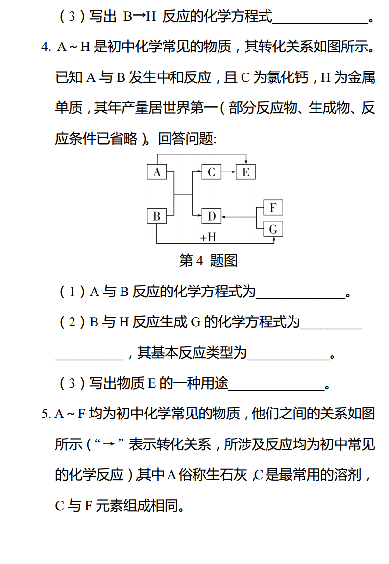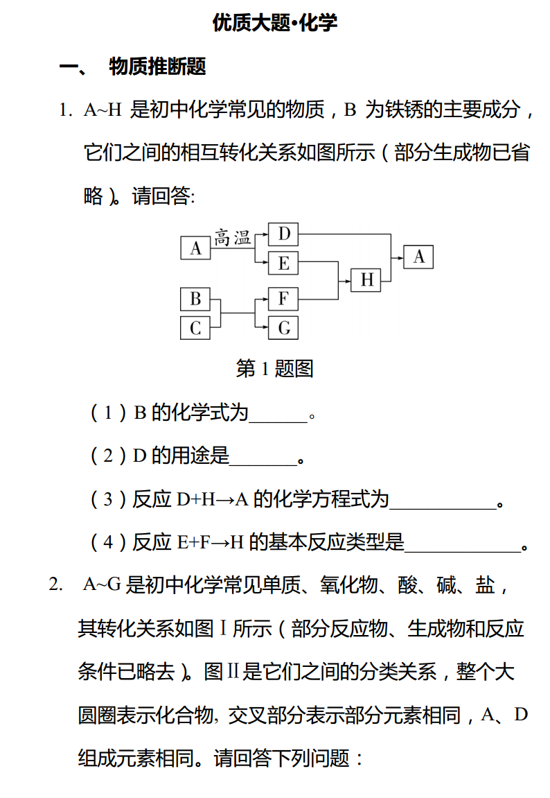 优质大题·化学一、物质推断题1.A~H是初中化学常见的物质,B为铁锈的主要成分,它们之间的相互转化关系如图所示(部分生成物已省略)。请回答:第1题图(1)B的化学式为______。(2)D的用途是_______。(3)反应D+H→A的化学方程式为___________。(4)反应E+F→H的基本反应类型是____________。2.A~G是初中化学常见单质、氧化物、酸、碱、盐,其转化关系如图Ⅰ所示(部分反应物、生成物和反应条件已略去)。图Ⅱ是它们之间的分类关系,整个大圆圈表示化合物,交叉部分表示部分元素相同,A、D组成元素相同。请回答下列问题:第2题图(1)E的化学式为__________。(2)反应③的基本反应类型是____________。(3)物质A的一种用途是_____________。(4)写出反应②的化学方程式:。3.如图A~H均是初中化学常见物质,已知A、B都是黑色固体,D、F为红色固体,它们之间的转化关系如图所示(图中反应条件及部分反应物、生成物已省略)。第3题图(1)写出下列物质的化学式:A____;B______。(2)E与F的反应常用于工业炼铁,该反应的化学方程式为________________。(3)写出B→H反应的化学方程式______________。4.A~H是初中化学常见的物质,其转化关系如图所示。已知A与B发生中和反应,且C为氯化钙,H为金属单质,其年产量居世界第一(部分反应物、生成物、反应条件已省略)。回答问题:第4题图(1)A与B反应的化学方程式为_____________。(2)B与H反应生成G的化学方程式为___________________,其基本反应类型为____________。(3)写出物质E的一种用途______________。5.A~F均为初中化学常见的物质,他们之间的关系如图所示(“→”表示转化关系,所涉及反应均为初中常见的化学反应),其中A俗称生石灰,C是最常用的溶剂,C与F元素组成相同。第5题图(1)C的化学式是_______。(2)E的一种用途是___________。(3)F→C反应的基本类型是________________。(4)D→C反应的化学方程式为_________________。二、实验探究题6.小娜对食品包装袋内食品保鲜剂的成分产生了兴趣,于是她和兴趣小组的同学对食品保鲜剂进行了如下探究。【查阅资料】①食品保鲜剂的作用是吸收空气中的氧气和水蒸气,防止食品发生变质。②常见的能吸收氧气或水蒸气的物质有生石灰、固体氢氧化钠、浓硫酸、铁粉。请回答下列问题:(1)小娜打开一份未使用过的保鲜剂,发现里面为黑色粉末,得出该食品保鲜剂的成分为_________。(2)那么已经使用过的保鲜剂成分会有变化吗?小娜取已经使用过的保鲜剂样品于试管中,加入过量______,观察到样品全部溶解,并有气泡产生,得出该食品保鲜剂成分没有变化,小娜的结论是否正确?并说明理由_______,______________________________。(3)小组同学另取样品,又进行了如下实验,观察到澄清石灰水变浑浊。综合(2)可知使用过的保鲜剂的成分为_________(填化学式)。第6题图(4)根据实验我们可总结出,确定样品成分时,一定要考虑______________。(5)图中所示装置存在缺陷,请你补充完善___________________________。7.央视频道《是真的吗?》栏目中有一段视频:将“锡纸”剪成一段两头宽中间窄的纸条,然后两头分别连接电池的正负极,观察到“锡纸”立即燃烧。据此,小晟同学取某种“锡纸”进行了以下探究:(1)“锡纸”燃烧的原因:“锡纸”两端接入电池两极后造成短路致使“锡纸”燃烧,从燃烧的条件分析:开始“锡纸”不燃烧但短路后能燃烧的原因是_______(填“与氧气接触”或“温度达到其着火点”)。(2)探究“锡纸”中金属的成分:“锡纸”中的金属是锡吗?【查阅资料】①“锡纸”由锡箔或铝箔和纸黏合而成;②锌粉是一种深灰色固体;③锡(Sn)与酸或盐溶液反应生成+2价的锡盐。【提出猜想】猜想Ⅰ:“锡纸”中的金属是锡;猜想Ⅱ:“锡纸”中的金属是铝。【进行实验】设计方案并进行实验。实验操作实验现象实验分析与结论取打磨后的“锡纸”表面根据实验现象,结合“锡纸”片放有深灰色固