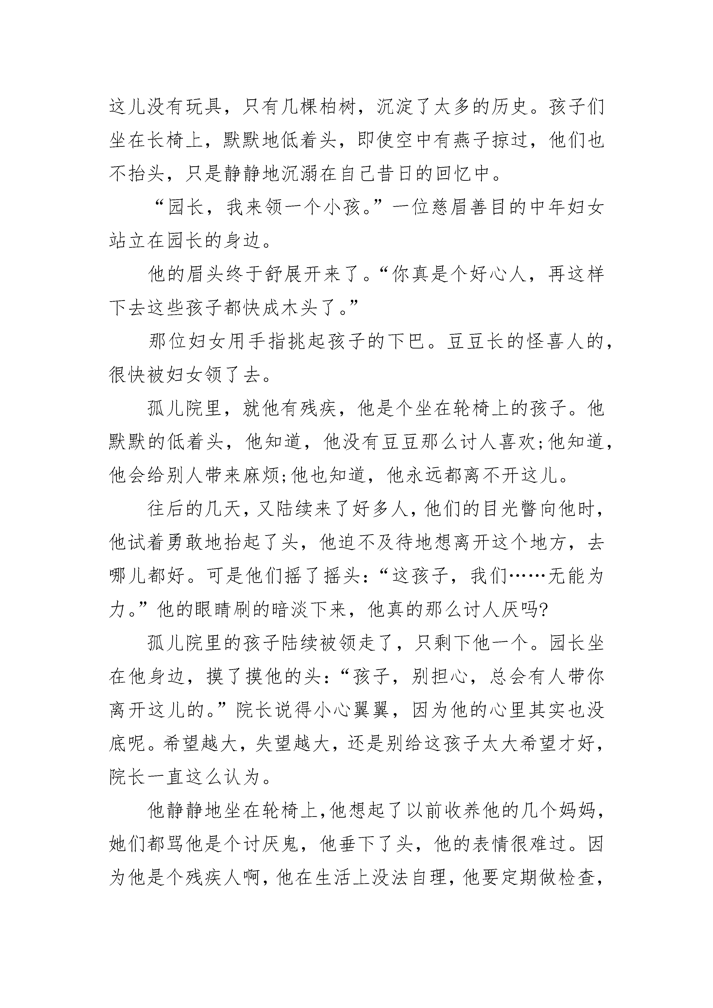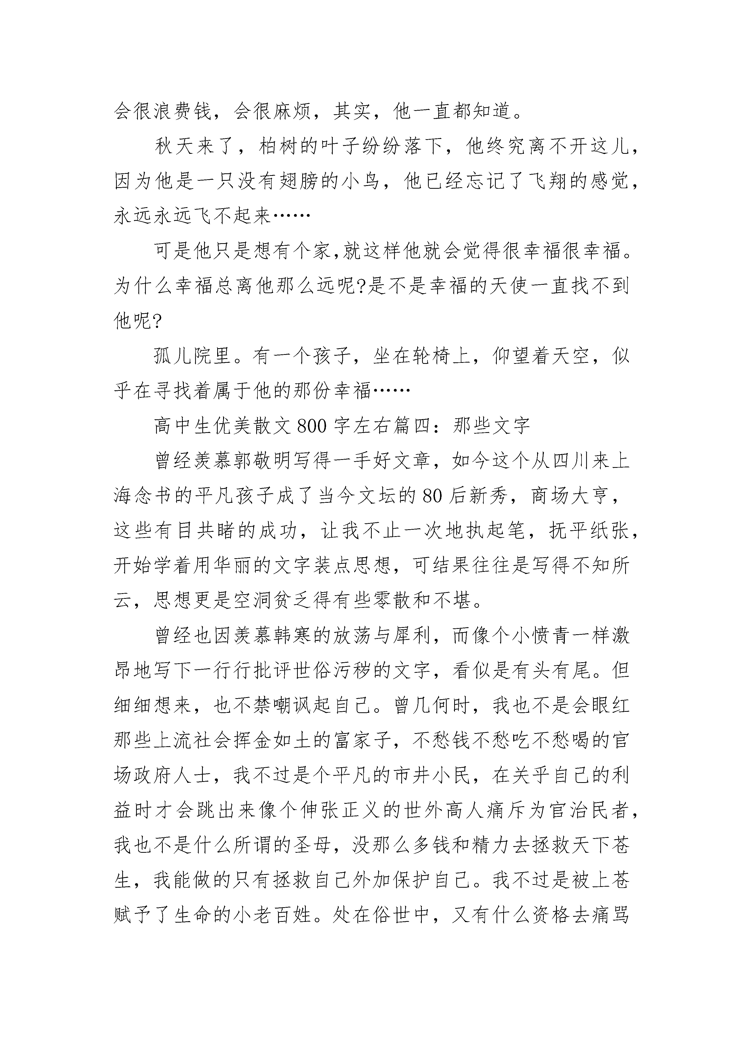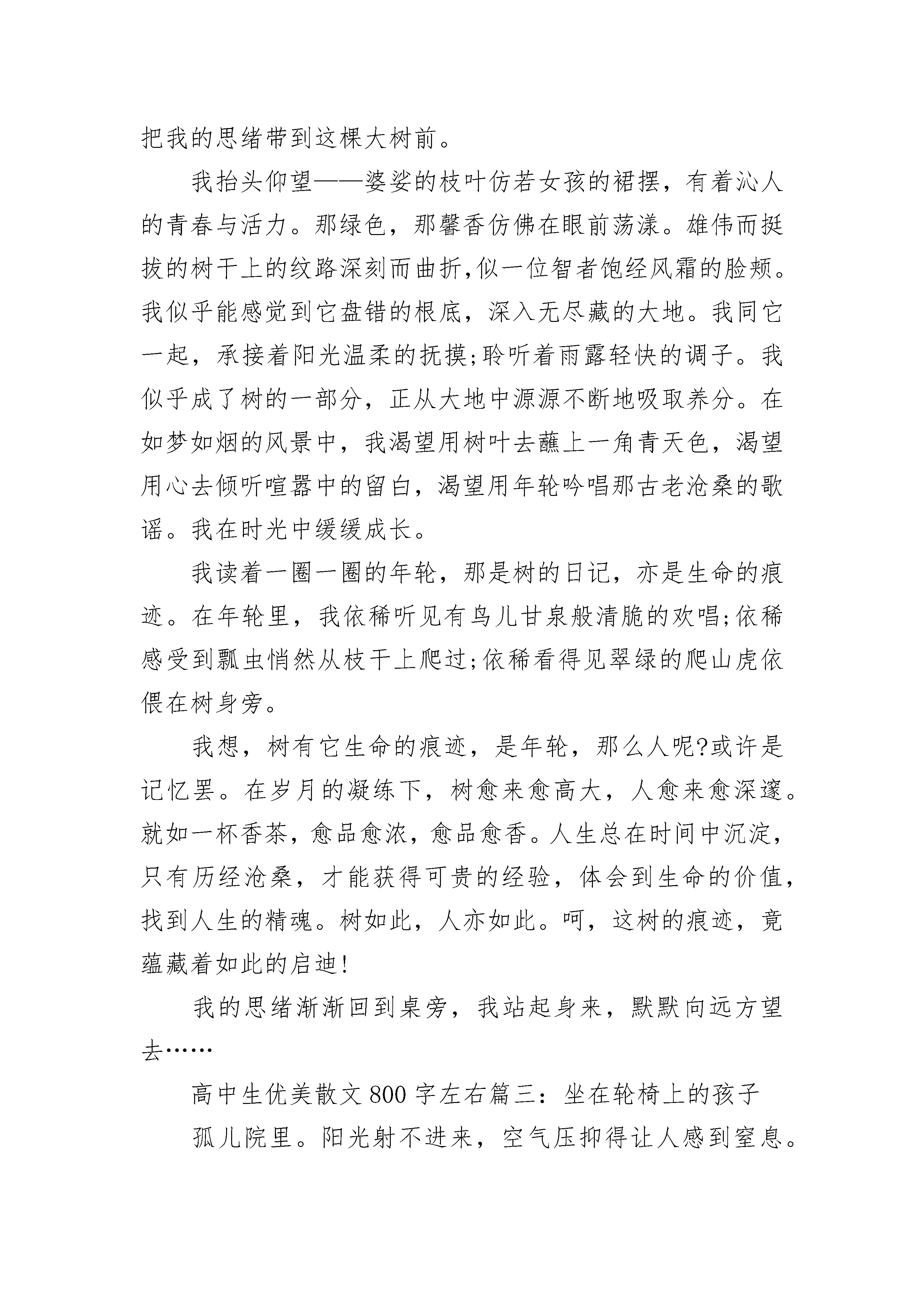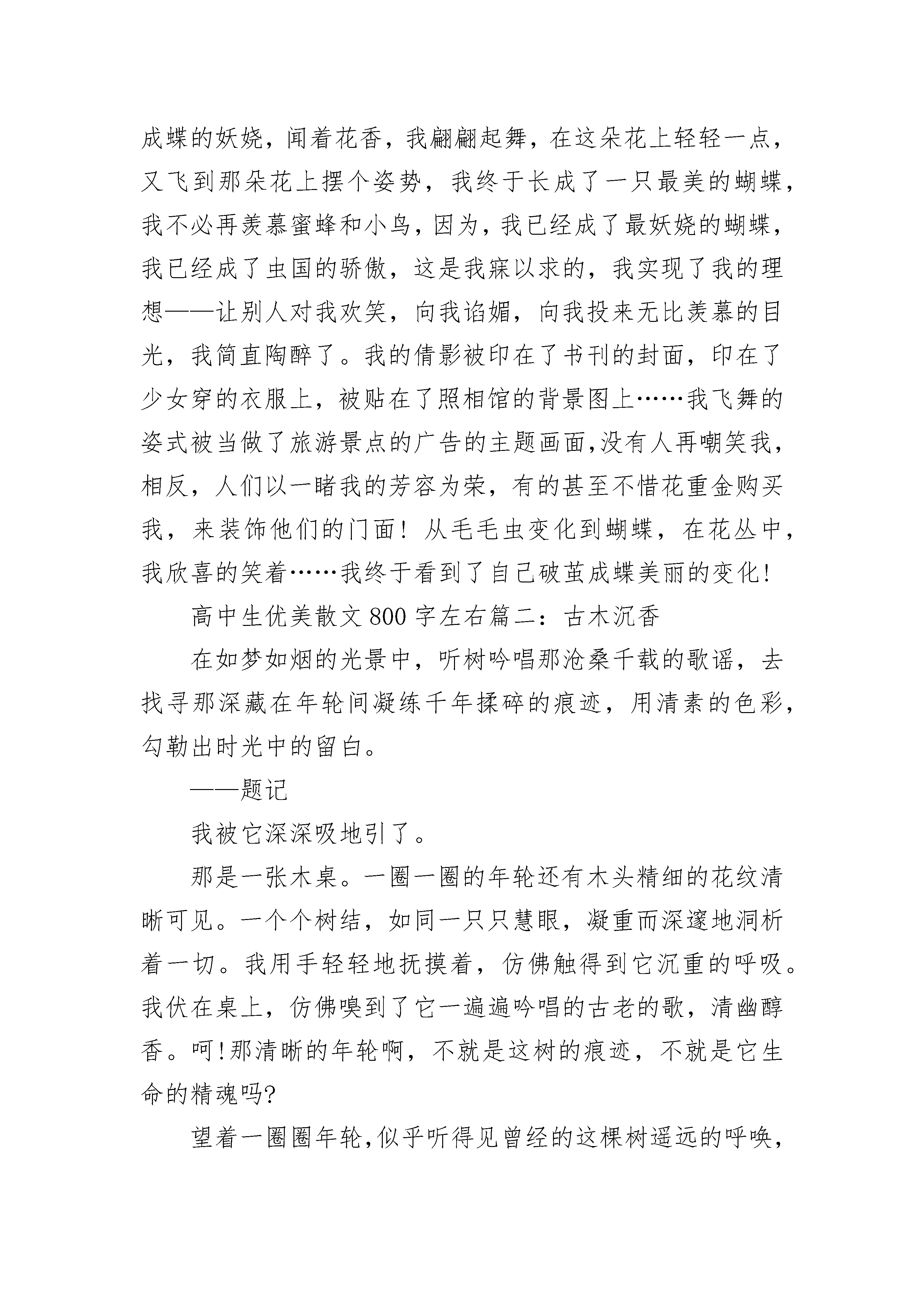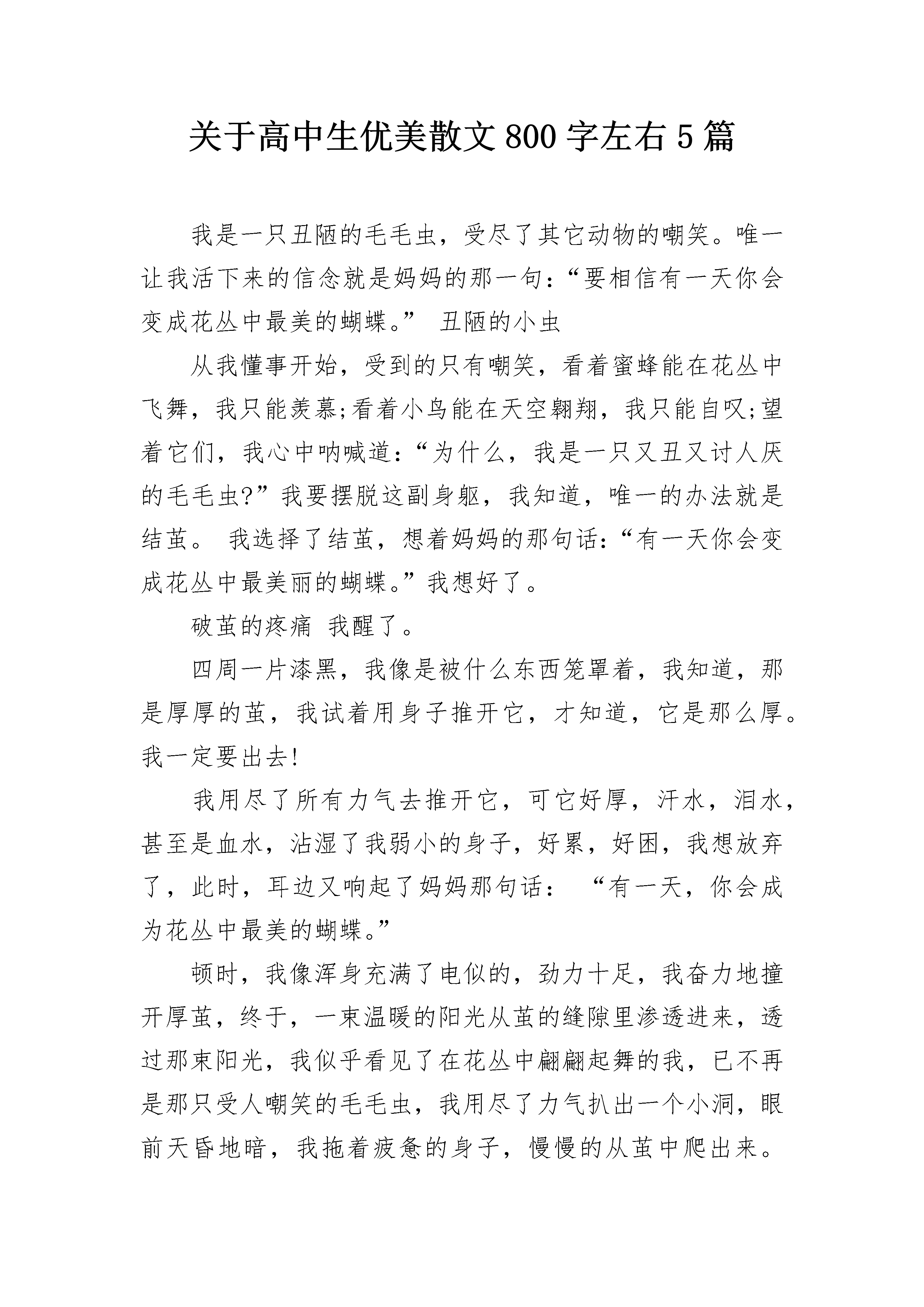 关于高中生优美散文800字左右5篇我是一只丑陋的毛毛虫,受尽了其它动物的嘲笑。唯一让我活下来的信念就是妈妈的那一句:“要相信有一天你会变成花丛中最美的蝴蝶。”丑陋的小虫从我懂事开始,受到的只有嘲笑,看着蜜蜂能在花丛中飞舞,我只能羡慕;看着小鸟能在天空翱翔,我只能自叹;望着它们,我心中呐喊道:“为什么,我是一只又丑又讨人厌的毛毛虫?”我要摆脱这副身躯,我知道,唯一的办法就是结茧。我选择了结茧,想着妈妈的那句话:“有一天你会变成花丛中最美丽的蝴蝶。”我想好了。破茧的疼痛我醒了。四周一片漆黑,我像是被什么东西笼罩着,我知道,那是厚厚的茧,我试着用身子推开它,才知道,它是那么厚。我一定要出去!我用尽了所有力气去推开它,可它好厚,汗水,泪水,甚至是血水,沾湿了我弱小的身子,好累,好困,我想放弃了,此时,耳边又响起了妈妈那句话:“有一天,你会成为花丛中最美的蝴蝶。”顿时,我像浑身充满了电似的,劲力十足,我奋力地撞开厚茧,终于,一束温暖的阳光从茧的缝隙里渗透进来,透过那束阳光,我似乎看见了在花丛中翩翩起舞的我,已不再是那只受人嘲笑的毛毛虫,我用尽了力气扒出一个小洞,眼前天昏地暗,我拖着疲惫的身子,慢慢的从茧中爬出来。成蝶的妖娆,闻着花香,我翩翩起舞,在这朵花上轻轻一点,又飞到那朵花上摆个姿势,我终于长成了一只最美的蝴蝶,我不必再羡慕蜜蜂和小鸟,因为,我已经成了最妖娆的蝴蝶,我已经成了虫国的骄傲,这是我寐以求的,我实现了我的理想——让别人对我欢笑,向我谄媚,向我投来无比羡慕的目光,我简直陶醉了。我的倩影被印在了书刊的封面,印在了少女穿的衣服上,被贴在了照相馆的背景图上……我飞舞的姿式被当做了旅游景点的广告的主题画面,没有人再嘲笑我,相反,人们以一睹我的芳容为荣,有的甚至不惜花重金购买我,来装饰他们的门面!从毛毛虫变化到蝴蝶,在花丛中,我欣喜的笑着……我终于看到了自己破茧成蝶美丽的变化!高中生优美散文800字左右篇二:古木沉香在如梦如烟的光景中,听树吟唱那沧桑千载的歌谣,去找寻那深藏在年轮间凝练千年揉碎的痕迹,用清素的色彩,勾勒出时光中的留白。——题记我被它深深吸地引了。那是一张木桌。一圈一圈的年轮还有木头精细的花纹清晰可见。一个个树结,如同一只只慧眼,凝重而深邃地洞析着一切。我用手轻轻地抚摸着,仿佛触得到它沉重的呼吸。我伏在桌上,仿佛嗅到了它一遍遍吟唱的古老的歌,清幽醇香。呵!那清晰的年轮啊,不就是这树的痕迹,不就是它生命的精魂吗?望着一圈圈年轮,似乎听得见曾经的这棵树遥远的呼唤,把我的思绪带到这棵大树前。我抬头仰望——婆娑的枝叶仿若女孩的裙摆,有着沁人的青春与活力。那绿色,那馨香仿佛在眼前荡漾。雄伟而挺拔的树干上的纹路深刻而曲折,似一位智者饱经风霜的脸颊。我似乎能感觉到它盘错的根底,深入无尽藏的大地。我同它一起,承接着阳光温柔的抚摸;聆听着雨露轻快的调子。我似乎成了树的一部分,正从大地中源源不断地吸取养分。在如梦如烟的风景中,我渴望用树叶去蘸上一角青天色,渴望用心去倾听喧嚣中的留白,渴望用年轮吟唱那古老沧桑的歌谣。我在时光中缓缓成长。我读着一圈一圈的年轮,那是树的日记,亦是生命的痕迹。在年轮里,我依稀听见有鸟儿甘泉般清脆的欢唱;依稀感受到瓢虫悄然从枝干上爬过;依稀看得见翠绿的爬山虎依偎在树身旁。我想,树有它生命的痕迹,是年轮,那么人呢?或许是记忆罢。在岁月的凝练下,树愈来愈高大,人愈来愈深邃。就如一杯香茶,愈品愈浓,愈品愈香。人生总在时间中沉淀,只有历经沧桑,才能获得可贵的经验,体会到生命的价值,找到人生的精魂。树如此,人亦如此。呵,这树的痕迹,竟蕴藏着如此的启迪!我的思绪渐渐回到桌旁,我站起身来,默默向远方望去……高中生优美散文800字左右篇三:坐在轮椅上的孩子孤儿院里。阳光射不进来,空气压抑得让人感到窒息。这儿没有玩具,只有几棵柏树,沉淀了太多的历史。孩子们坐在长椅上,默默地低着头,即使空中有燕子掠过,他们也不抬头,只是静静地沉溺在自己昔日的回忆中。“园长,我来领一个小孩。”一位慈眉善目的中年妇女站立在园长的身边。他的眉头终于舒展开来了。“你真是个好心人,再这样下去这些孩子都快成木头了。”那位妇女用手指挑起孩子的下巴。豆豆长的怪喜人的,很快被妇女领了去。孤儿院里,就他有残疾,他是个坐在轮椅上的孩子。他默默的低着头,他知道,他没有豆豆那么讨人喜欢;他知道,他会给别人带来麻烦;他也知道,他永远都离不开这儿。往后的几天,又陆续来了好多人,他们的目光瞥向他时,他试着勇敢地抬起了头,他迫不及待地想离开这个地方,去哪儿都好。可是他们摇了摇头:“这孩子,我们……无能为力。”他的眼睛刷的暗淡下来,他真的那么讨人厌吗?孤儿院里的孩子陆续被领走了,只剩下他一个。园长坐在他身边,摸了摸他的头:“孩子,别担心,总会有人带你离开这儿的。”院长说得小心翼翼,因