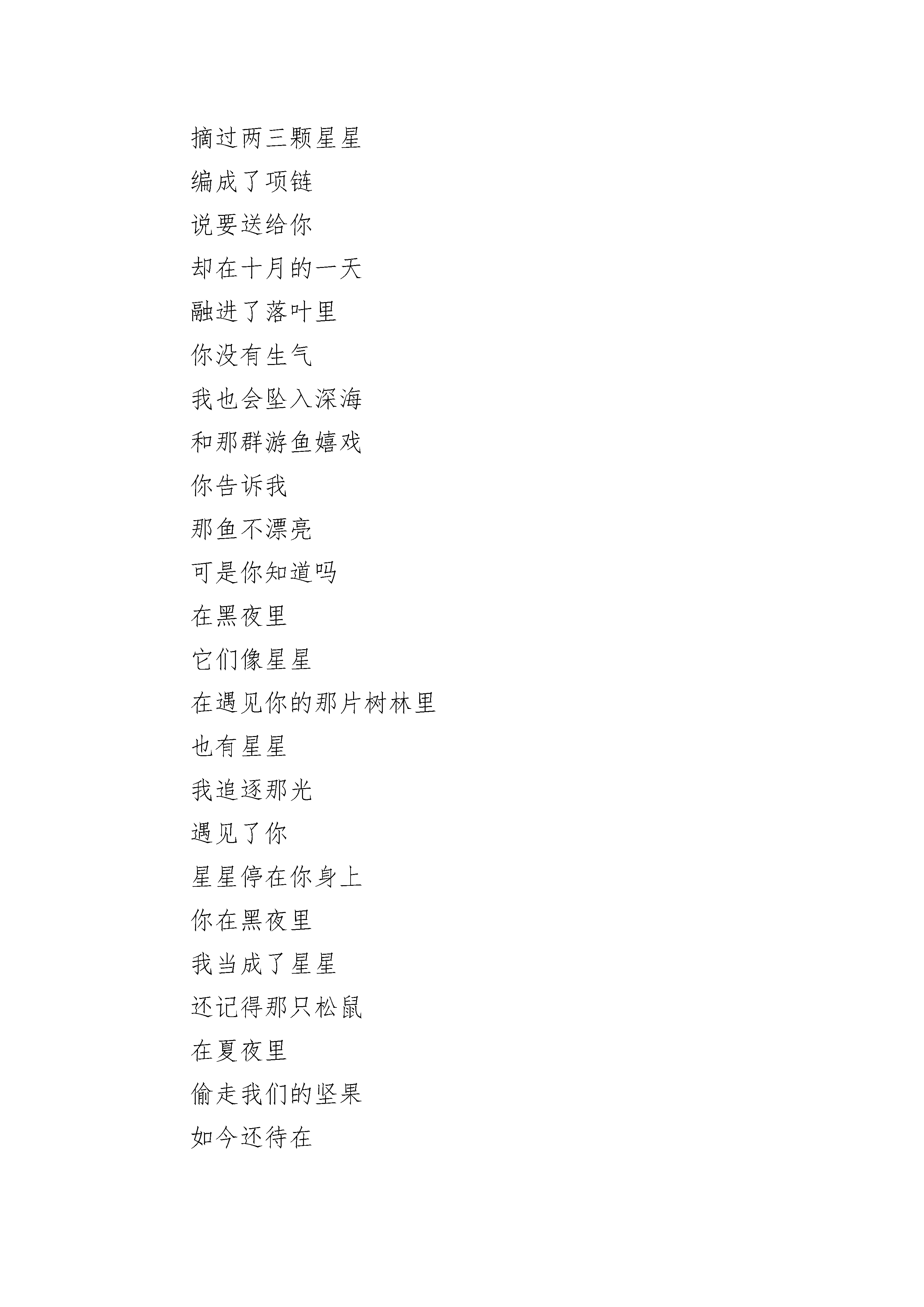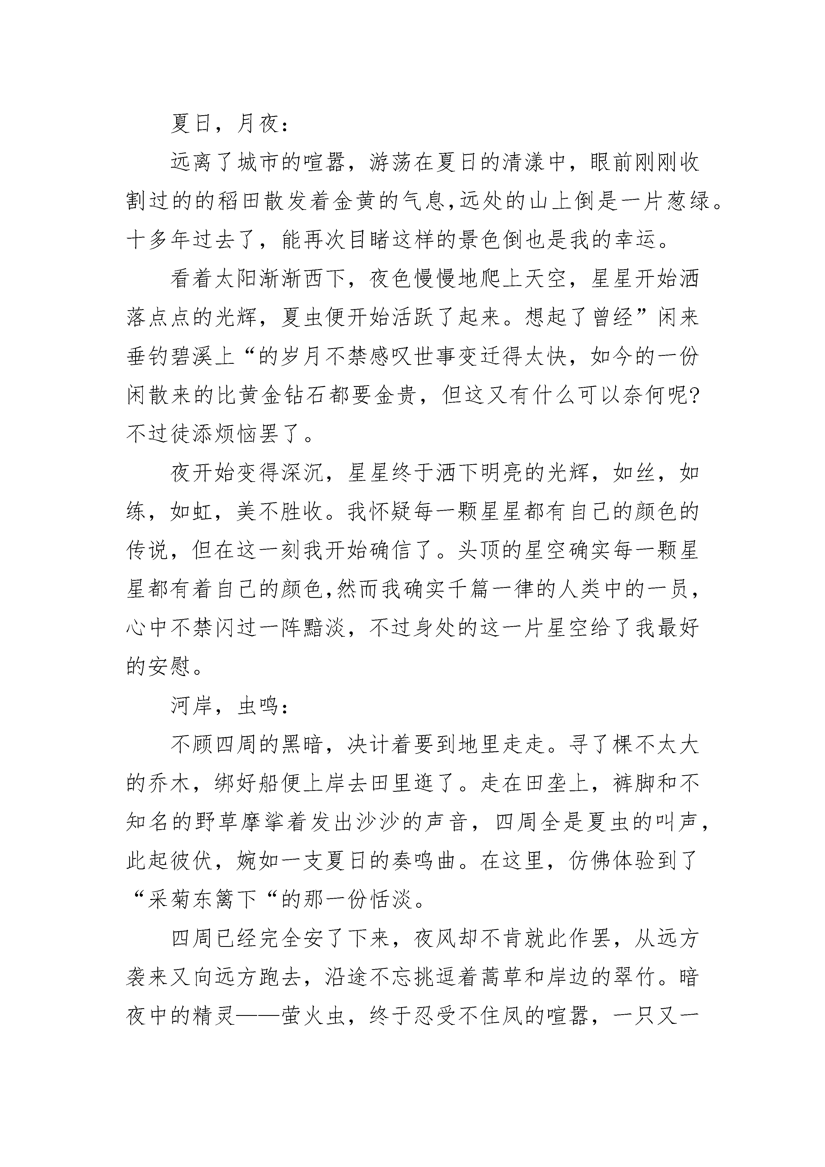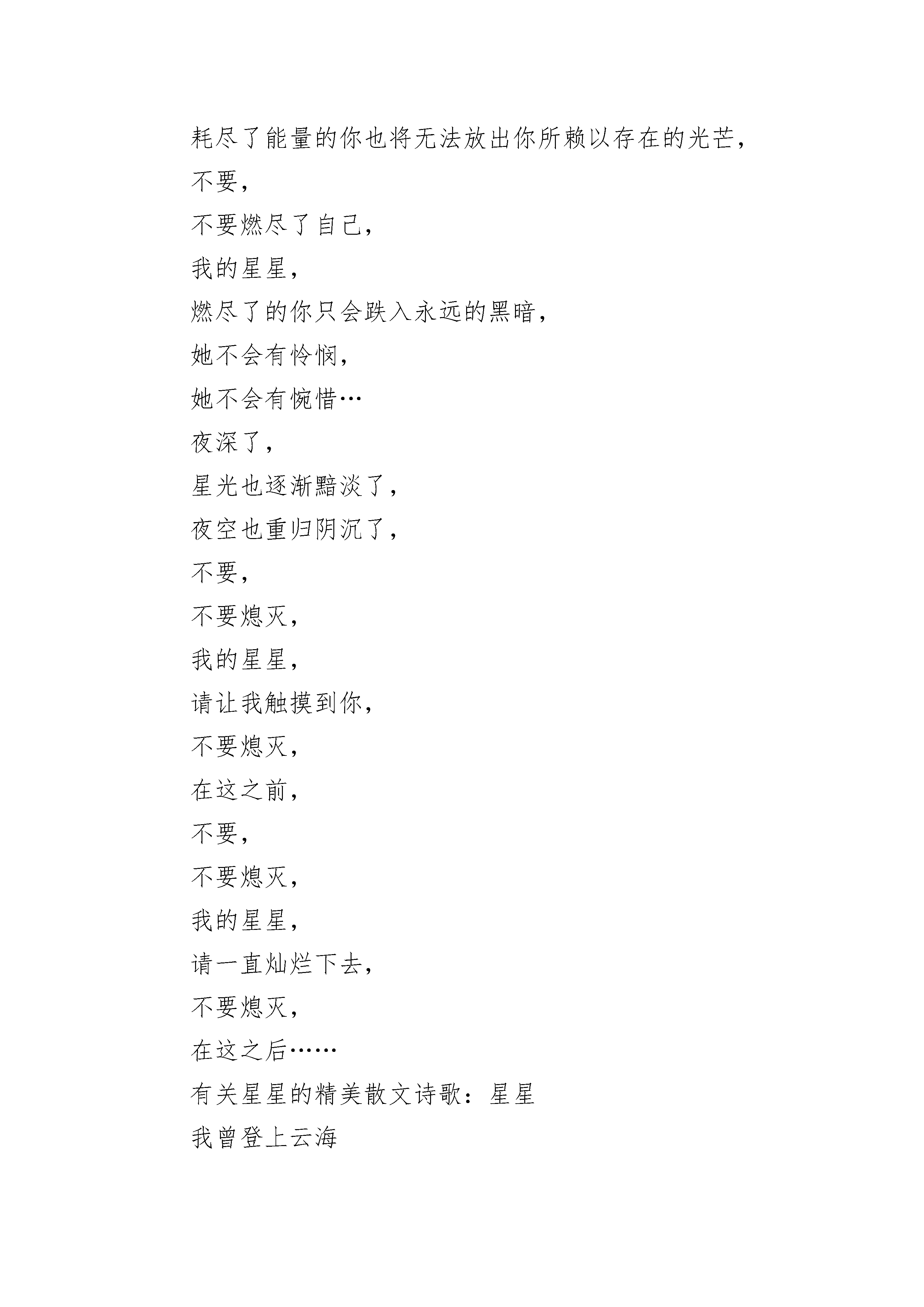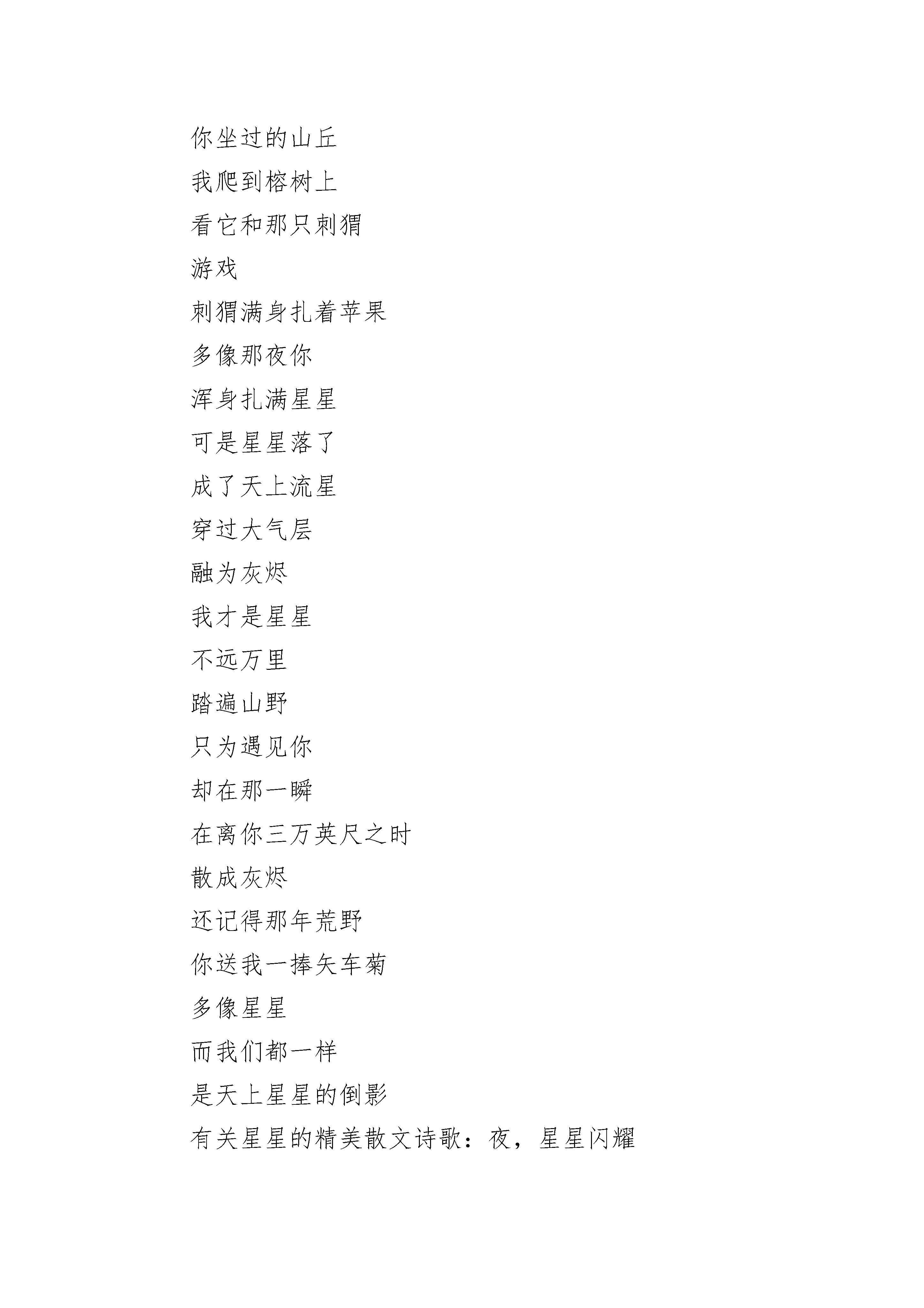 关于有关星星的精美散文诗歌5篇仰望天空的人,总以为星星就是宝石,晶莹剔透没瑕疵,飞上星星的人知道,那里有灰尘石渣,和地球上一样复杂。有关星星的精美散文诗歌:星星多少次的凌晨的窗口,我仰望着那璀璨的浩瀚,那繁星尽情的相映相辉,星光是如此的迷人,毫无疑问我迷上了它,毫无疑问我想拥有它,却忘记仅仅触摸到它也并非易事,阴沉的夜空因星光而明媚,压抑的生命可因谁而怒放?星星依然在无私的慷慨的奉献它的光芒,全然不顾它的付出是否会有回报,完全不计是否会有人珍惜,不要,不要燃尽了自己,我的星星,耗尽了能量的你也将无法放出你所赖以存在的光芒,不要,不要燃尽了自己,我的星星,燃尽了的你只会跌入永远的黑暗,她不会有怜悯,她不会有惋惜…夜深了,星光也逐渐黯淡了,夜空也重归阴沉了,不要,不要熄灭,我的星星,请让我触摸到你,不要熄灭,在这之前,不要,不要熄灭,我的星星,请一直灿烂下去,不要熄灭,在这之后……有关星星的精美散文诗歌:星星我曾登上云海摘过两三颗星星编成了项链说要送给你却在十月的一天融进了落叶里你没有生气我也会坠入深海和那群游鱼嬉戏你告诉我那鱼不漂亮可是你知道吗在黑夜里它们像星星在遇见你的那片树林里也有星星我追逐那光遇见了你星星停在你身上你在黑夜里我当成了星星还记得那只松鼠在夏夜里偷走我们的坚果如今还待在你坐过的山丘我爬到榕树上看它和那只刺猬游戏刺猬满身扎着苹果多像那夜你浑身扎满星星可是星星落了成了天上流星穿过大气层融为灰烬我才是星星不远万里踏遍山野只为遇见你却在那一瞬在离你三万英尺之时散成灰烬还记得那年荒野你送我一捧矢车菊多像星星而我们都一样是天上星星的倒影有关星星的精美散文诗歌:夜,星星闪耀夏日,月夜:远离了城市的喧嚣,游荡在夏日的清漾中,眼前刚刚收割过的的稻田散发着金黄的气息,远处的山上倒是一片葱绿。十多年过去了,能再次目睹这样的景色倒也是我的幸运。看着太阳渐渐西下,夜色慢慢地爬上天空,星星开始洒落点点的光辉,夏虫便开始活跃了起来。想起了曾经”闲来垂钓碧溪上“的岁月不禁感叹世事变迁得太快,如今的一份闲散来的比黄金钻石都要金贵,但这又有什么可以奈何呢?不过徒添烦恼罢了。夜开始变得深沉,星星终于洒下明亮的光辉,如丝,如练,如虹,美不胜收。我怀疑每一颗星星都有自己的颜色的传说,但在这一刻我开始确信了。头顶的星空确实每一颗星星都有着自己的颜色,然而我确实千篇一律的人类中的一员,心中不禁闪过一阵黯淡,不过身处的这一片星空给了我最好的安慰。河岸,虫鸣:不顾四周的黑暗,决计着要到地里走走。寻了棵不太大的乔木,绑好船便上岸去田里逛了。走在田垄上,裤脚和不知名的野草摩挲着发出沙沙的声音,四周全是夏虫的叫声,此起彼伏,婉如一支夏日的奏鸣曲。在这里,仿佛体验到了“采菊东篱下“的那一份恬淡。四周已经完全安了下来,夜风却不肯就此作罢,从远方袭来又向远方跑去,沿途不忘挑逗着蒿草和岸边的翠竹。暗夜中的精灵——萤火虫,终于忍受不住凤的喧嚣,一只又一只地提着灯笼跑了出来。渐渐地,不管是河岸、田野还是山上,到处都是这暗夜中的精灵。迎着夜的星光和四下的虫鸣他们击退了夜的垄断。想起了自己曾经将萤火虫囚禁在瓶子里“囊萤映雪”的岁月不禁觉得当时的童真也是一种残忍。如今闲着绿光的精灵还能在我的眼前起舞便觉得是一种欣慰。归途,暗思走着走着,不觉间就到了船边,该是时候回去了吧,但我的心里是那样的不舍,也许这将是我最后的机会再见到这一片星空了。但是,我已经满足了。但我又是那样的不安,我渴求上帝不要让我的孩子问我什么是萤火虫,什么是真正的星空,因为若干年后我将如何作答。在夜的静默里,和着渔夫的歌声,我做了一个梦,一个我从未离开家园的梦。有关星星的精美散文诗歌:我和星星有个约定阳光透过树木洒下点点星光的时候,我才恍悟,原来我把它们遗忘了。突然间感受到那些喜爱的星光在我脸上跳动,心里说不出的感动,难道这就是上天的礼物,让我在白天也可以感受和星星私语的快乐!好怀念那些被我丢弃的星星,或许很多个夜晚它们都在等我讲述我的秘密,只是不知从哪天起,我忘了我们的约定。它们一定等得很失落,如同我等不到它们时忧伤的脸上写满了期盼。我是多么的坏,竟自私地将那些一直陪伴我的朋友远远的晾在天际欣赏自己的无奈!我的心里满是愧疚,这一刻想起了太多一个人伤心,却有满天星星安慰的画面。我也不知道为什么会那么喜欢星星,但肯定不是因为它们让单调的夜空从此美丽,可能是一种感觉吧,每次看到那些星星对我微笑,一股暖流就莫名地流进心田,融化了冻结已久的无奈。星星是一种信念,远离世俗的尘埃,在遥远的另一个国度享受自我信仰的愉快。我的信念简简单单,没有在物欲横流里挣扎的场面,只是像星星一样坚守安静等待的执著,即使天荒地老也不会改变。人总是容易沉醉在一种痴迷里,忽视了那些近在咫尺的幸福,等到痴迷瞬间破碎成狼狈的时候,才感到孤独无比,才后悔没