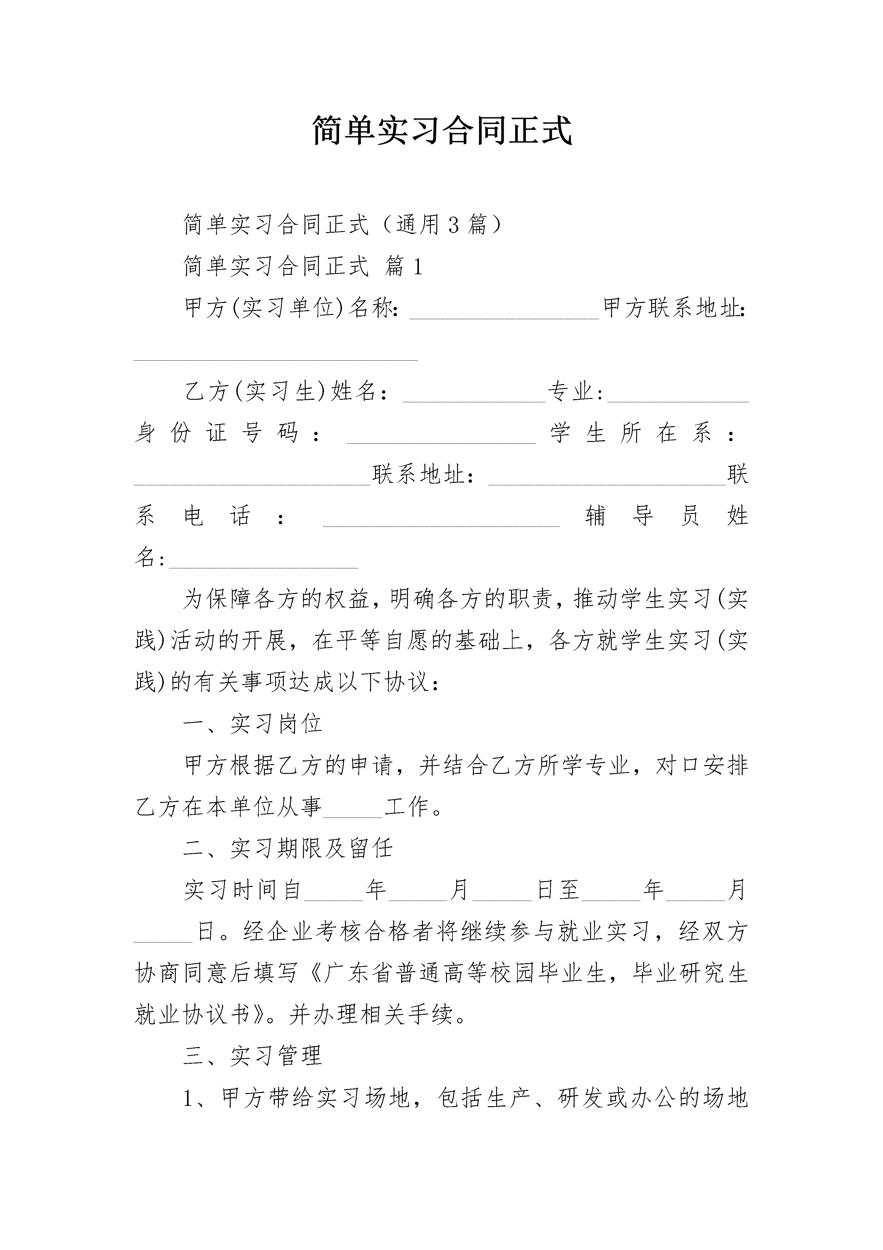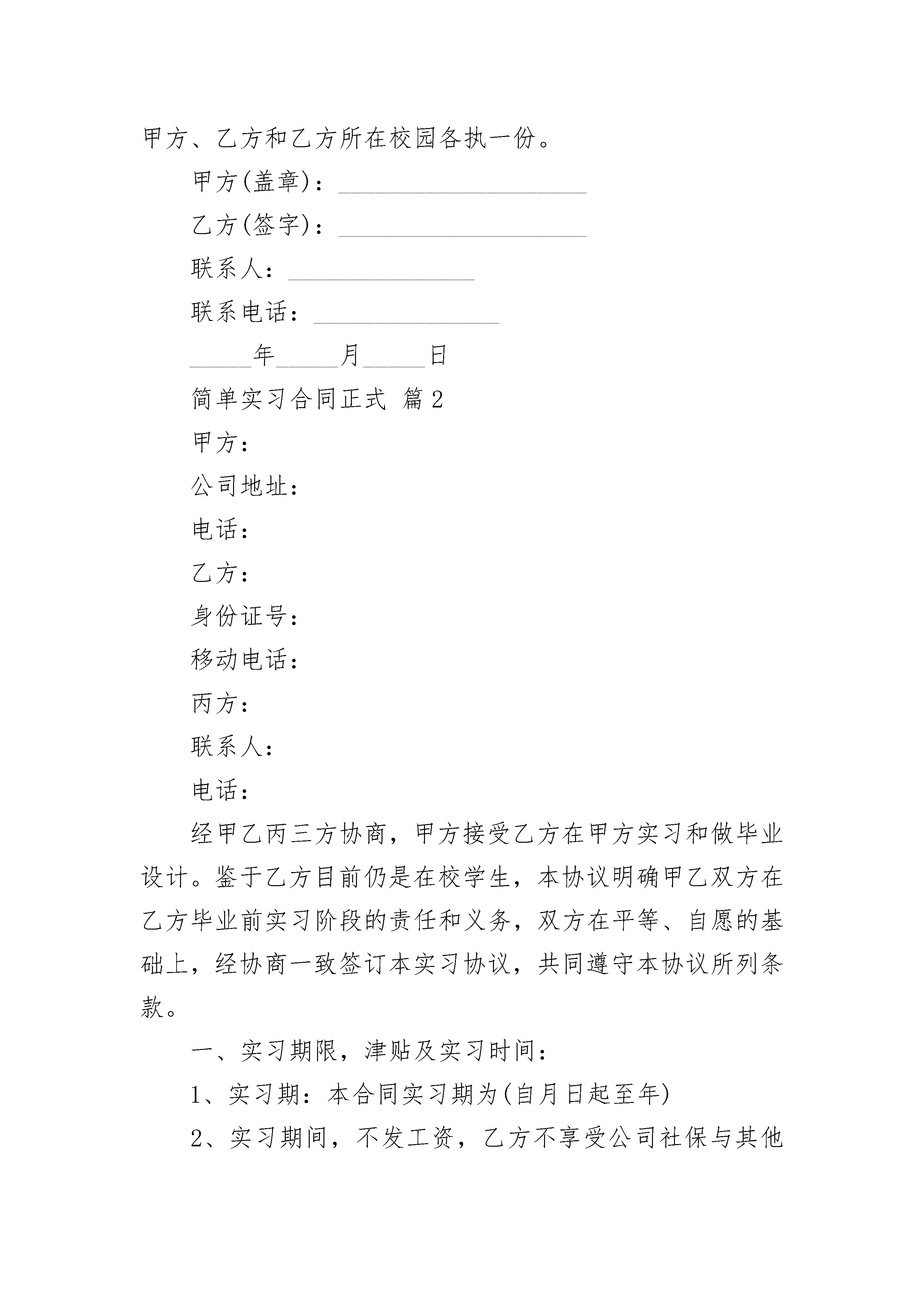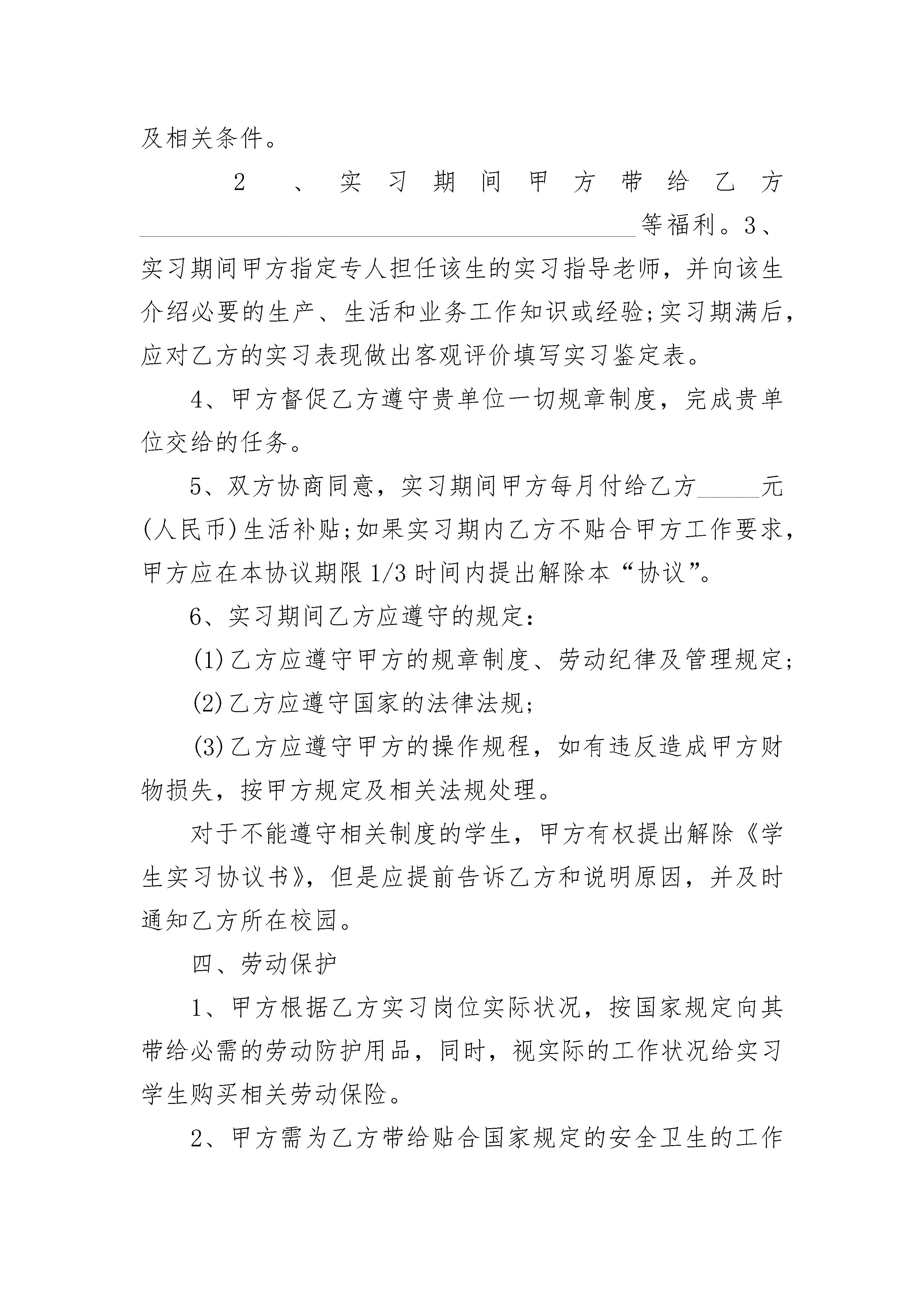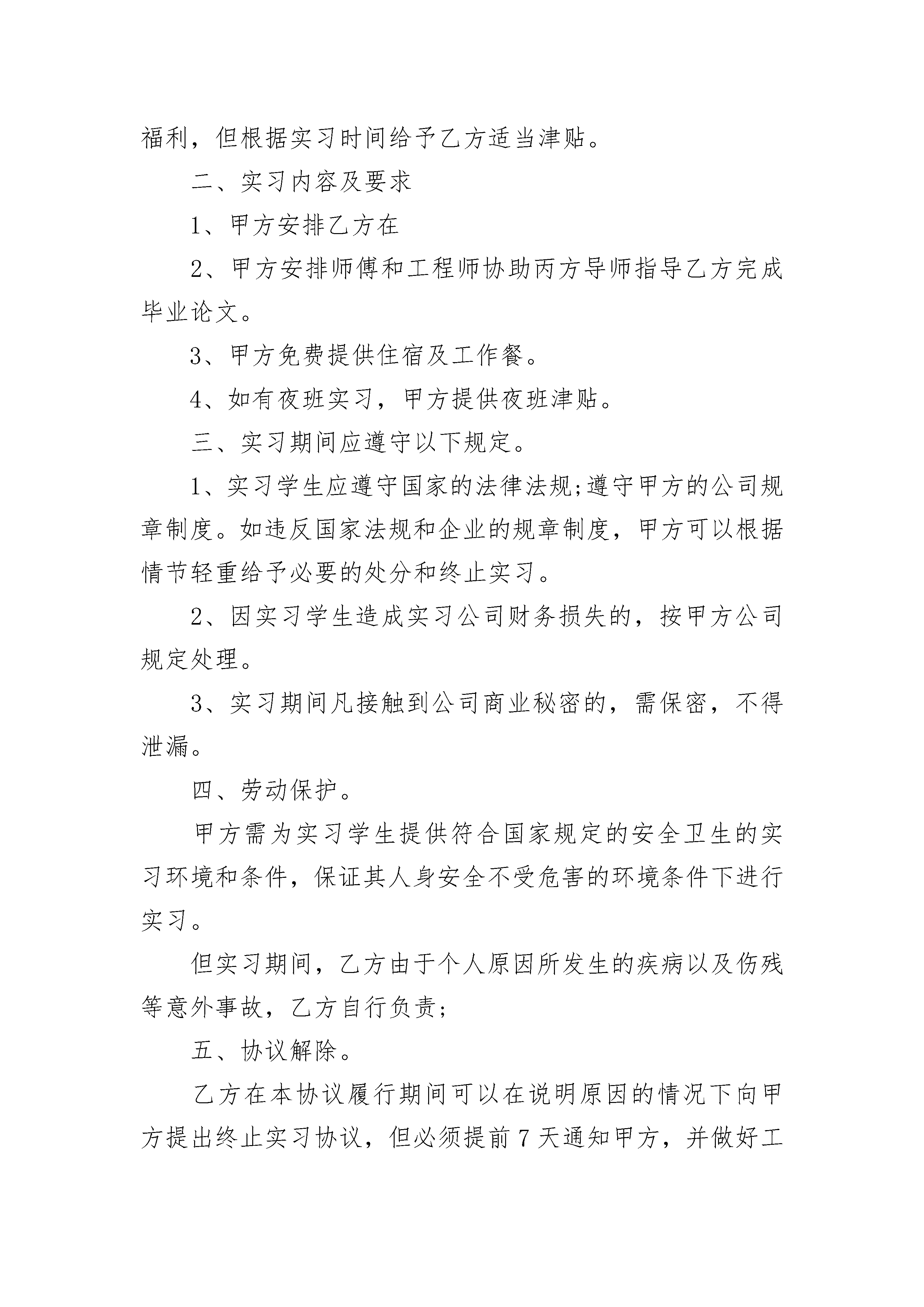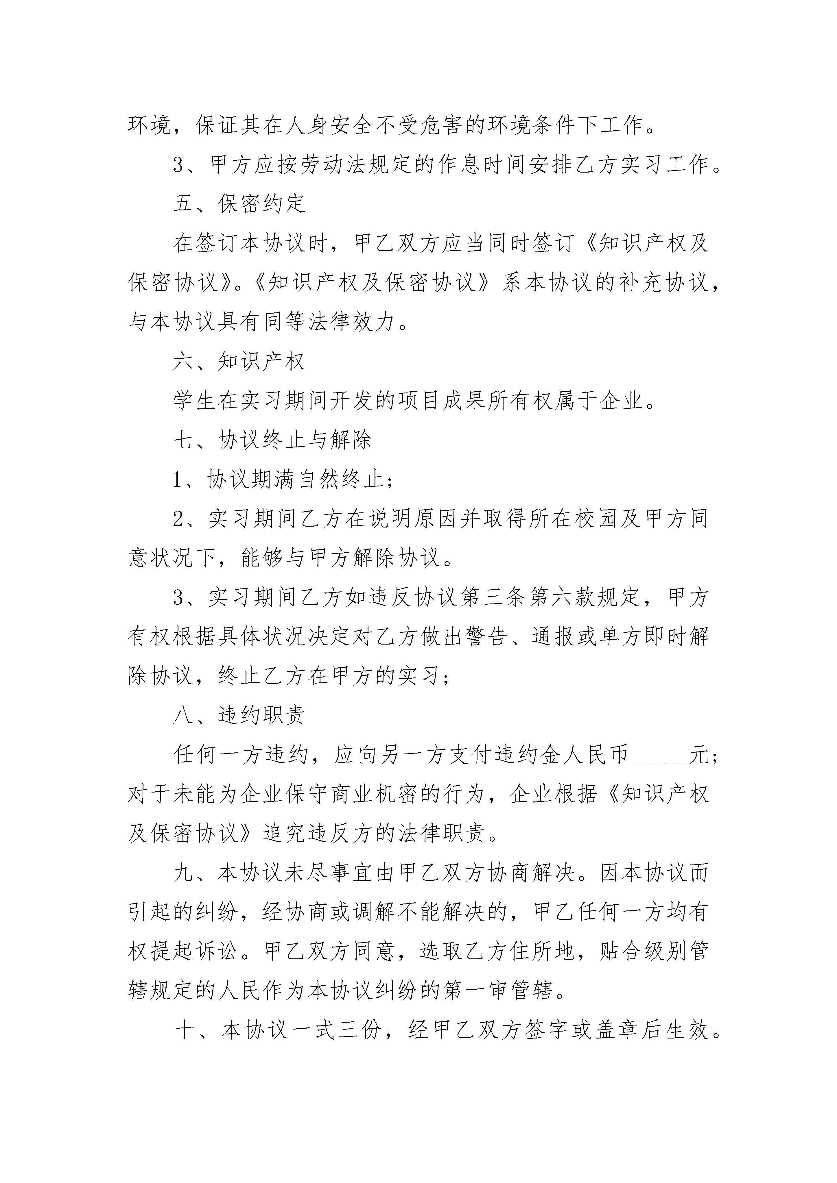 简单实习合同正式简单实习合同正式(通用3篇)简单实习合同正式篇1甲方(实习单位)名称:________________甲方联系地址:________________________乙方(实习生)姓名:____________专业:____________身份证号码:________________学生所在系:____________________联系地址:____________________联系电话:____________________辅导员姓名:________________为保障各方的权益,明确各方的职责,推动学生实习(实践)活动的开展,在平等自愿的基础上,各方就学生实习(实践)的有关事项达成以下协议:一、实习岗位甲方根据乙方的申请,并结合乙方所学专业,对口安排乙方在本单位从事_____工作。二、实习期限及留任实习时间自_____年_____月_____日至_____年_____月_____日。经企业考核合格者将继续参与就业实习,经双方协商同意后填写《广东省普通高等校园毕业生,毕业研究生就业协议书》。并办理相关手续。三、实习管理1、甲方带给实习场地,包括生产、研发或办公的场地及相关条件。2、实习期间甲方带给乙方________________________________________等福利。3、实习期间甲方指定专人担任该生的实习指导老师,并向该生介绍必要的生产、生活和业务工作知识或经验;实习期满后,应对乙方的实习表现做出客观评价填写实习鉴定表。4、甲方督促乙方遵守贵单位一切规章制度,完成贵单位交给的任务。5、双方协商同意,实习期间甲方每月付给乙方_____元(人民币)生活补贴;如果实习期内乙方不贴合甲方工作要求,甲方应在本协议期限1/3时间内提出解除本“协议”。6、实习期间乙方应遵守的规定:(1)乙方应遵守甲方的规章制度、劳动纪律及管理规定;(2)乙方应遵守国家的法律法规;(3)乙方应遵守甲方的操作规程,如有违反造成甲方财物损失,按甲方规定及相关法规处理。对于不能遵守相关制度的学生,甲方有权提出解除《学生实习协议书》,但是应提前告诉乙方和说明原因,并及时通知乙方所在校园。四、劳动保护1、甲方根据乙方实习岗位实际状况,按国家规定向其带给必需的劳动防护用品,同时,视实际的工作状况给实习学生购买相关劳动保险。2、甲方需为乙方带给贴合国家规定的安全卫生的工作环境,保证其在人身安全不受危害的环境条件下工作。3、甲方应按劳动法规定的作息时间安排乙方实习工作。五、保密约定在签订本协议时,甲乙双方应当同时签订《知识产权及保密协议》。《知识产权及保密协议》系本协议的补充协议,与本协议具有同等法律效力。六、知识产权学生在实习期间开发的项目成果所有权属于企业。七、协议终止与解除1、协议期满自然终止;2、实习期间乙方在说明原因并取得所在校园及甲方同意状况下,能够与甲方解除协议。3、实习期间乙方如违反协议第三条第六款规定,甲方有权根据具体状况决定对乙方做出警告、通报或单方即时解除协议,终止乙方在甲方的实习;八、违约职责任何一方违约,应向另一方支付违约金人民币_____元;对于未能为企业保守商业机密的行为,企业根据《知识产权及保密协议》追究违反方的法律职责。九、本协议未尽事宜由甲乙双方协商解决。因本协议而引起的纠纷,经协商或调解不能解决的,甲乙任何一方均有权提起诉讼。甲乙双方同意,选取乙方住所地,贴合级别管辖规定的人民作为本协议纠纷的第一审管辖。十、本协议一式三份,经甲乙双方签字或盖章后生效。甲方、乙方和乙方所在校园各执一份。甲方(盖章):____________________乙方(签字):____________________联系人:_______________联系电话:____________________年_____月_____日简单实习合同正式篇2甲方:公司地址:电话:乙方:身份证号:移动电话:丙方:联系人:电话:经甲乙丙三方协商,甲方接受乙方在甲方实习和做毕业设计。鉴于乙方目前仍是在校学生,本协议明确甲乙双方在乙方毕业前实习阶段的责任和义务,双方在平等、自愿的基础上,经协商一致签订本实习协议,共同遵守本协议所列条款。一、实习期限,津贴及实习时间:1、实习期:本合同实习期为(自月日起至年)2、实习期间,不发工资,乙方不享受公司社保与其他福利,但根据实习时间给予乙方适当津贴。二、实习内容及要求1、甲方安排乙方在2、甲方安排师傅和工程师协助丙方导师指导乙方完成毕业论文。3、甲方免费提供住宿及工作餐。4、如有夜班实习,甲方提供夜班津贴。三、实习期间应遵守以下规定。1、实习学生应遵守国家的法律法规;遵守甲方的公司规章制度。如违反国家法规和企业的规章制度,甲方可以根据情节轻重给予必要的处分和终止实习。2、因实习学生造成实习