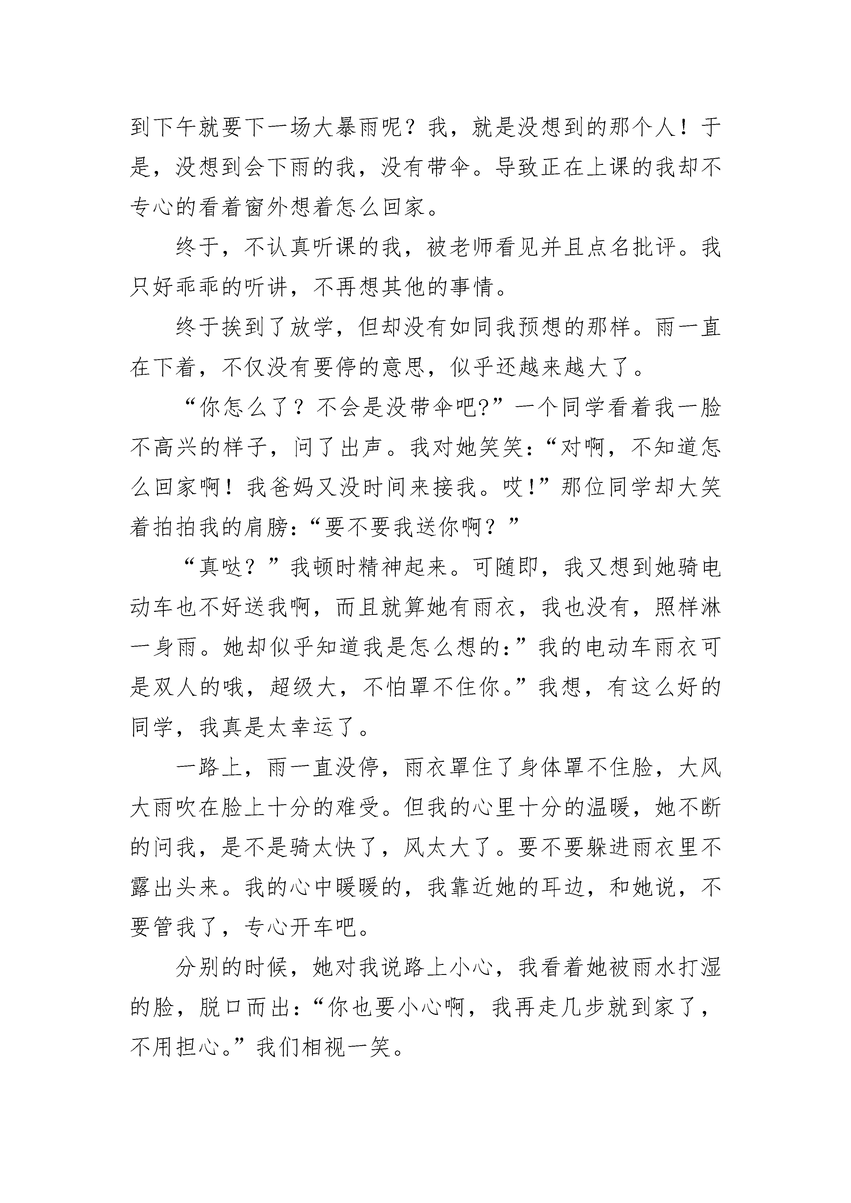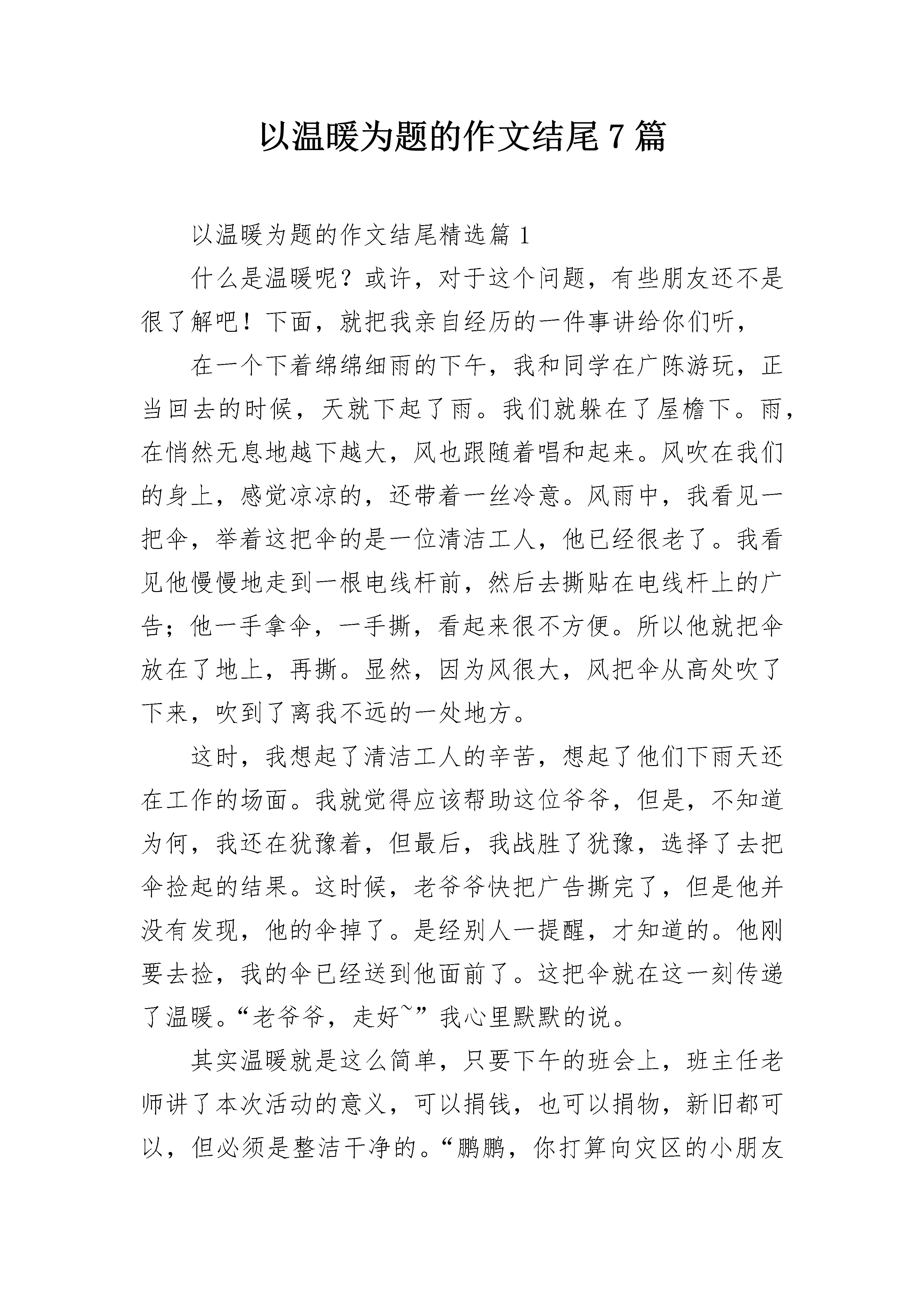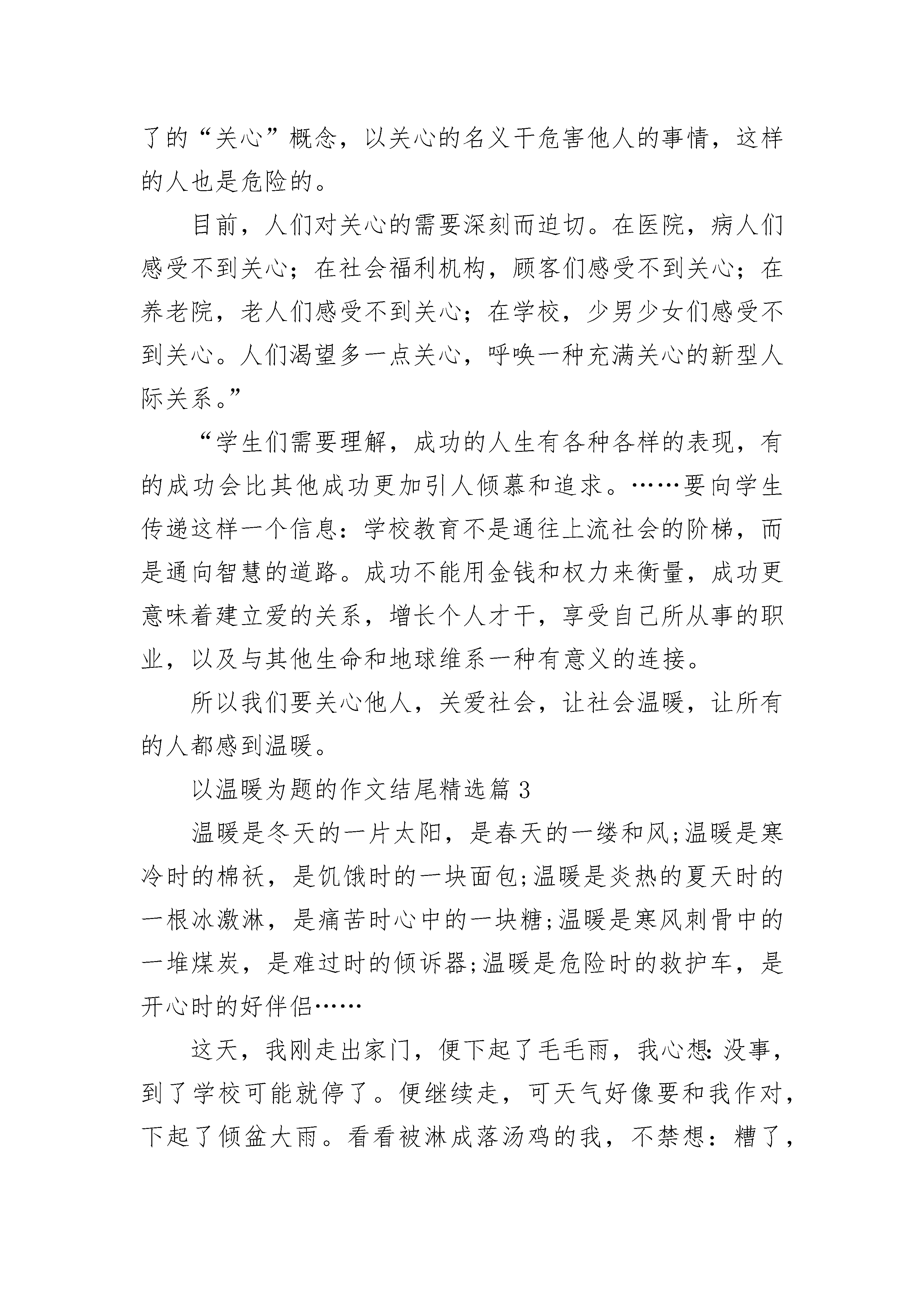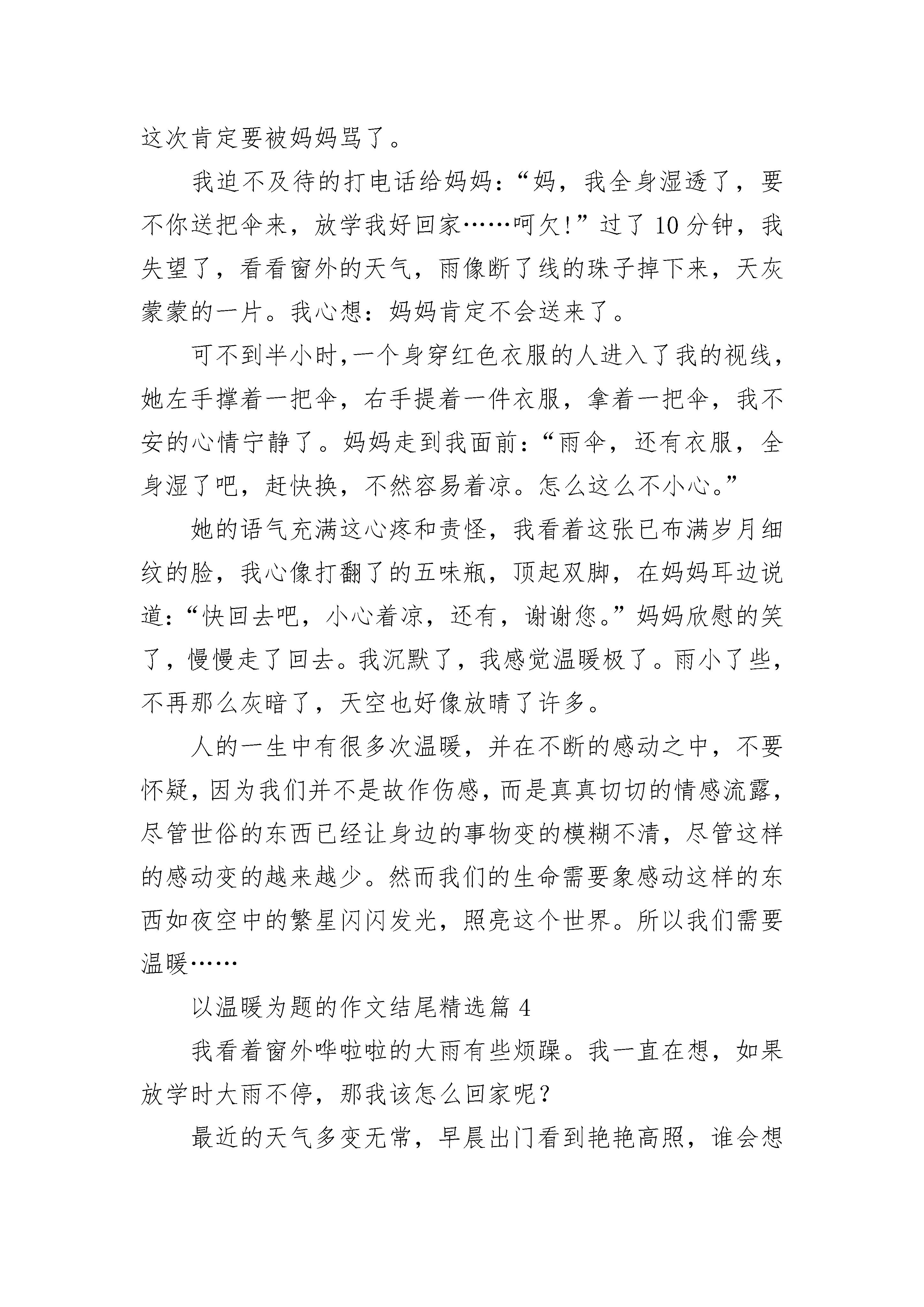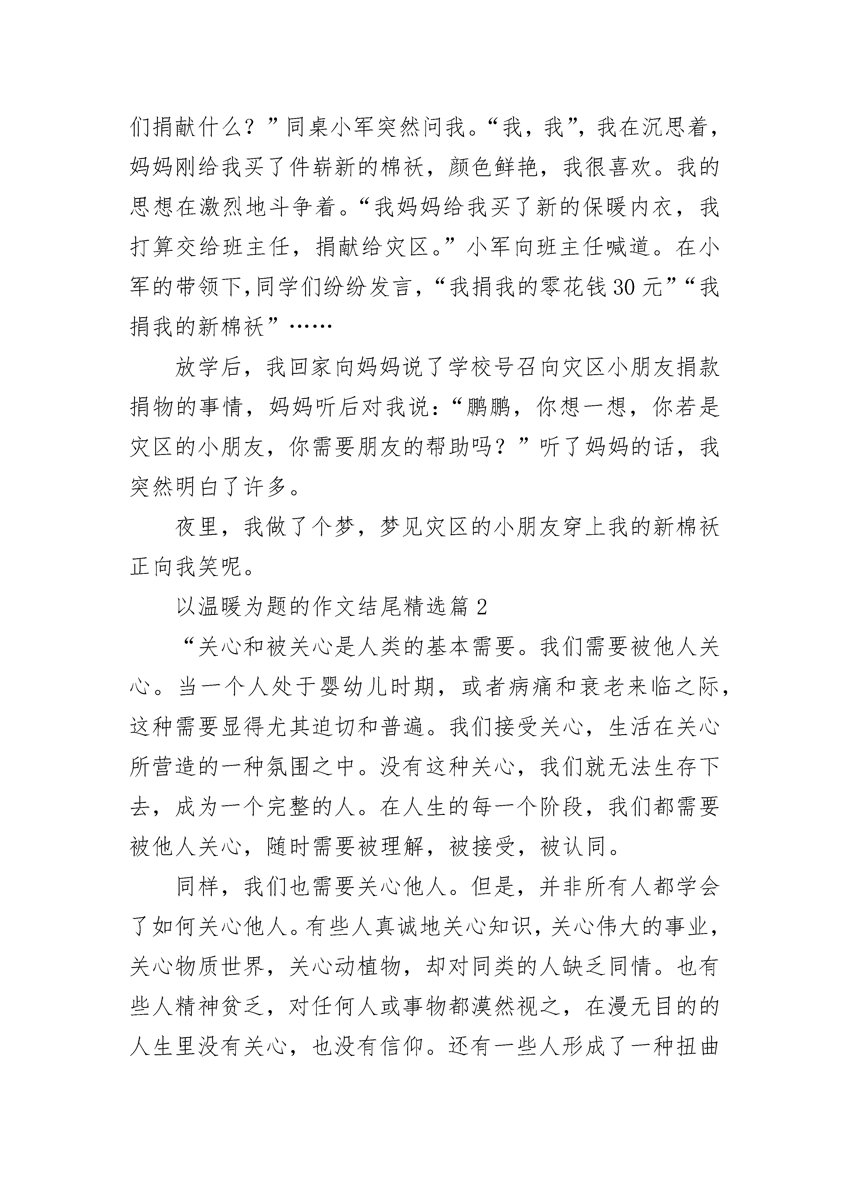 以温暖为题的作文结尾7篇以温暖为题的作文结尾精选篇1什么是温暖呢?或许,对于这个问题,有些朋友还不是很了解吧!下面,就把我亲自经历的一件事讲给你们听,在一个下着绵绵细雨的下午,我和同学在广陈游玩,正当回去的时候,天就下起了雨。我们就躲在了屋檐下。雨,在悄然无息地越下越大,风也跟随着唱和起来。风吹在我们的身上,感觉凉凉的,还带着一丝冷意。风雨中,我看见一把伞,举着这把伞的是一位清洁工人,他已经很老了。我看见他慢慢地走到一根电线杆前,然后去撕贴在电线杆上的广告;他一手拿伞,一手撕,看起来很不方便。所以他就把伞放在了地上,再撕。显然,因为风很大,风把伞从高处吹了下来,吹到了离我不远的一处地方。这时,我想起了清洁工人的辛苦,想起了他们下雨天还在工作的场面。我就觉得应该帮助这位爷爷,但是,不知道为何,我还在犹豫着,但最后,我战胜了犹豫,选择了去把伞捡起的结果。这时候,老爷爷快把广告撕完了,但是他并没有发现,他的伞掉了。是经别人一提醒,才知道的。他刚要去捡,我的伞已经送到他面前了。这把伞就在这一刻传递了温暖。“老爷爷,走好~”我心里默默的说。其实温暖就是这么简单,只要下午的班会上,班主任老师讲了本次活动的意义,可以捐钱,也可以捐物,新旧都可以,但必须是整洁干净的。“鹏鹏,你打算向灾区的小朋友们捐献什么?”同桌小军突然问我。“我,我”,我在沉思着,妈妈刚给我买了件崭新的棉袄,颜色鲜艳,我很喜欢。我的思想在激烈地斗争着。“我妈妈给我买了新的保暖内衣,我打算交给班主任,捐献给灾区。”小军向班主任喊道。在小军的带领下,同学们纷纷发言,“我捐我的零花钱30元”“我捐我的新棉袄”……放学后,我回家向妈妈说了学校号召向灾区小朋友捐款捐物的事情,妈妈听后对我说:“鹏鹏,你想一想,你若是灾区的小朋友,你需要朋友的帮助吗?”听了妈妈的话,我突然明白了许多。夜里,我做了个梦,梦见灾区的小朋友穿上我的新棉袄正向我笑呢。以温暖为题的作文结尾精选篇2“关心和被关心是人类的基本需要。我们需要被他人关心。当一个人处于婴幼儿时期,或者病痛和衰老来临之际,这种需要显得尤其迫切和普遍。我们接受关心,生活在关心所营造的一种氛围之中。没有这种关心,我们就无法生存下去,成为一个完整的人。在人生的每一个阶段,我们都需要被他人关心,随时需要被理解,被接受,被认同。同样,我们也需要关心他人。但是,并非所有人都学会了如何关心他人。有些人真诚地关心知识,关心伟大的事业,关心物质世界,关心动植物,却对同类的人缺乏同情。也有些人精神贫乏,对任何人或事物都漠然视之,在漫无目的的人生里没有关心,也没有信仰。还有一些人形成了一种扭曲了的“关心”概念,以关心的名义干危害他人的事情,这样的人也是危险的。目前,人们对关心的需要深刻而迫切。在医院,病人们感受不到关心;在社会福利机构,顾客们感受不到关心;在养老院,老人们感受不到关心;在学校,少男少女们感受不到关心。人们渴望多一点关心,呼唤一种充满关心的新型人际关系。”“学生们需要理解,成功的人生有各种各样的表现,有的成功会比其他成功更加引人倾慕和追求。……要向学生传递这样一个信息:学校教育不是通往上流社会的阶梯,而是通向智慧的道路。成功不能用金钱和权力来衡量,成功更意味着建立爱的关系,增长个人才干,享受自己所从事的职业,以及与其他生命和地球维系一种有意义的连接。所以我们要关心他人,关爱社会,让社会温暖,让所有的人都感到温暖。以温暖为题的作文结尾精选篇3温暖是冬天的一片太阳,是春天的一缕和风;温暖是寒冷时的棉袄,是饥饿时的一块面包;温暖是炎热的夏天时的一根冰激淋,是痛苦时心中的一块糖;温暖是寒风刺骨中的一堆煤炭,是难过时的倾诉器;温暖是危险时的救护车,是开心时的好伴侣……这天,我刚走出家门,便下起了毛毛雨,我心想:没事,到了学校可能就停了。便继续走,可天气好像要和我作对,下起了倾盆大雨。看看被淋成落汤鸡的我,不禁想:糟了,这次肯定要被妈妈骂了。我迫不及待的打电话给妈妈:“妈,我全身湿透了,要不你送把伞来,放学我好回家……呵欠!”过了10分钟,我失望了,看看窗外的天气,雨像断了线的珠子掉下来,天灰蒙蒙的一片。我心想:妈妈肯定不会送来了。可不到半小时,一个身穿红色衣服的人进入了我的视线,她左手撑着一把伞,右手提着一件衣服,拿着一把伞,我不安的心情宁静了。妈妈走到我面前:“雨伞,还有衣服,全身湿了吧,赶快换,不然容易着凉。怎么这么不小心。”她的语气充满这心疼和责怪,我看着这张已布满岁月细纹的脸,我心像打翻了的五味瓶,顶起双脚,在妈妈耳边说道:“快回去吧,小心着凉,还有,谢谢您。”妈妈欣慰的笑了,慢慢走了回去。我沉默了,我感觉温暖极了。雨小了些,不再那么灰暗了,天空也好像放晴了许多。人的一生中有很多次温暖,并在不断的感动之中,不要怀疑,因为我们并不是故作伤感,而是真