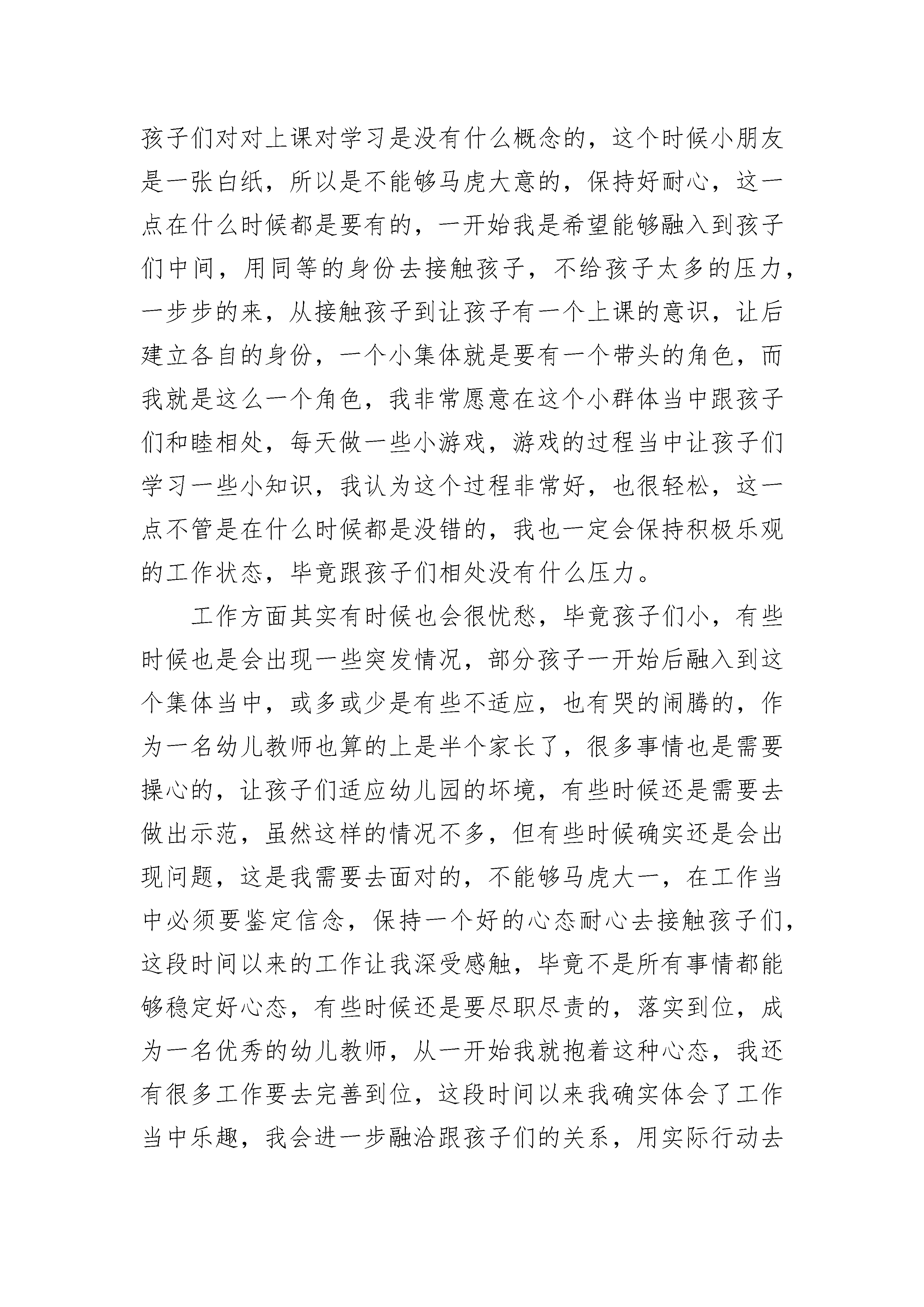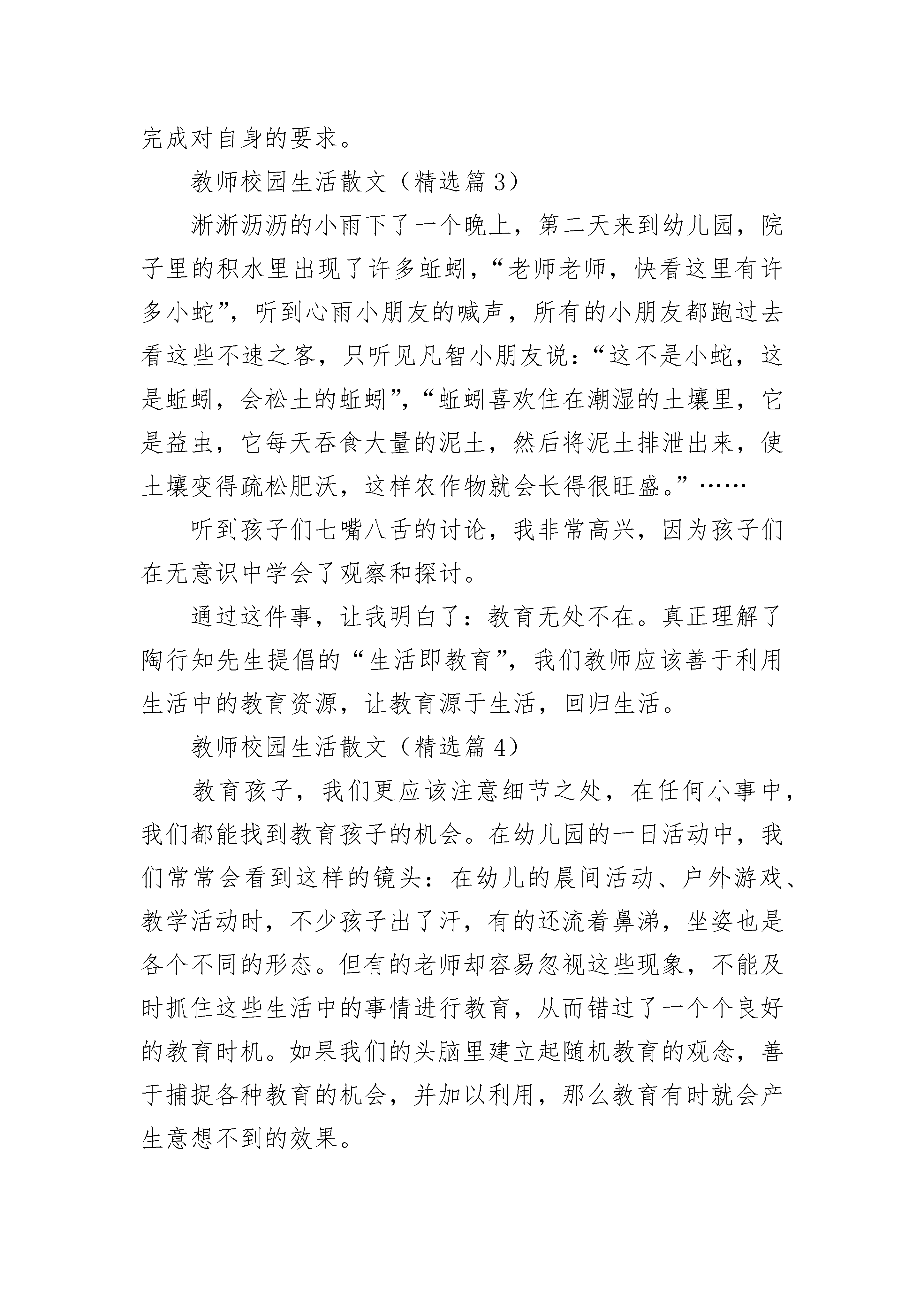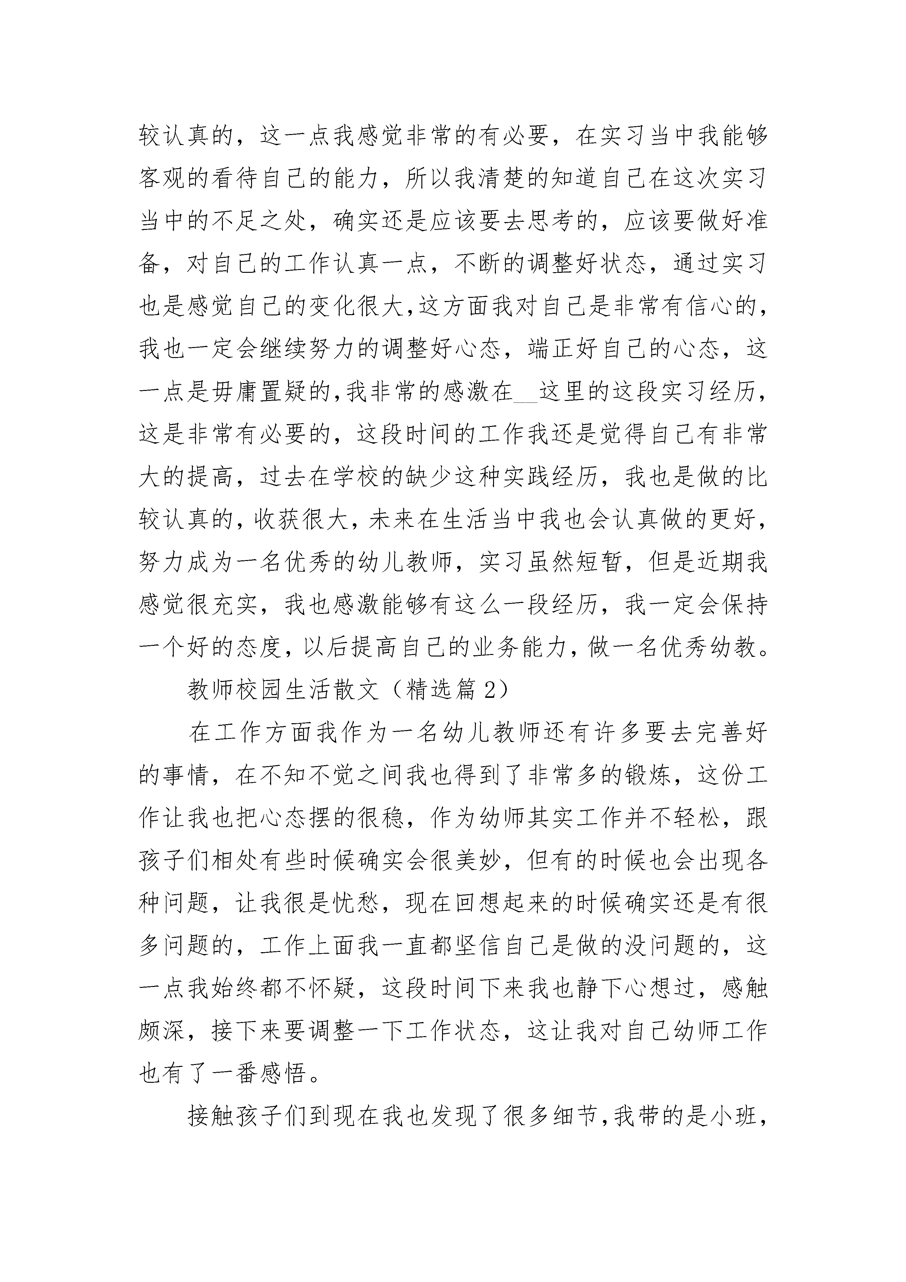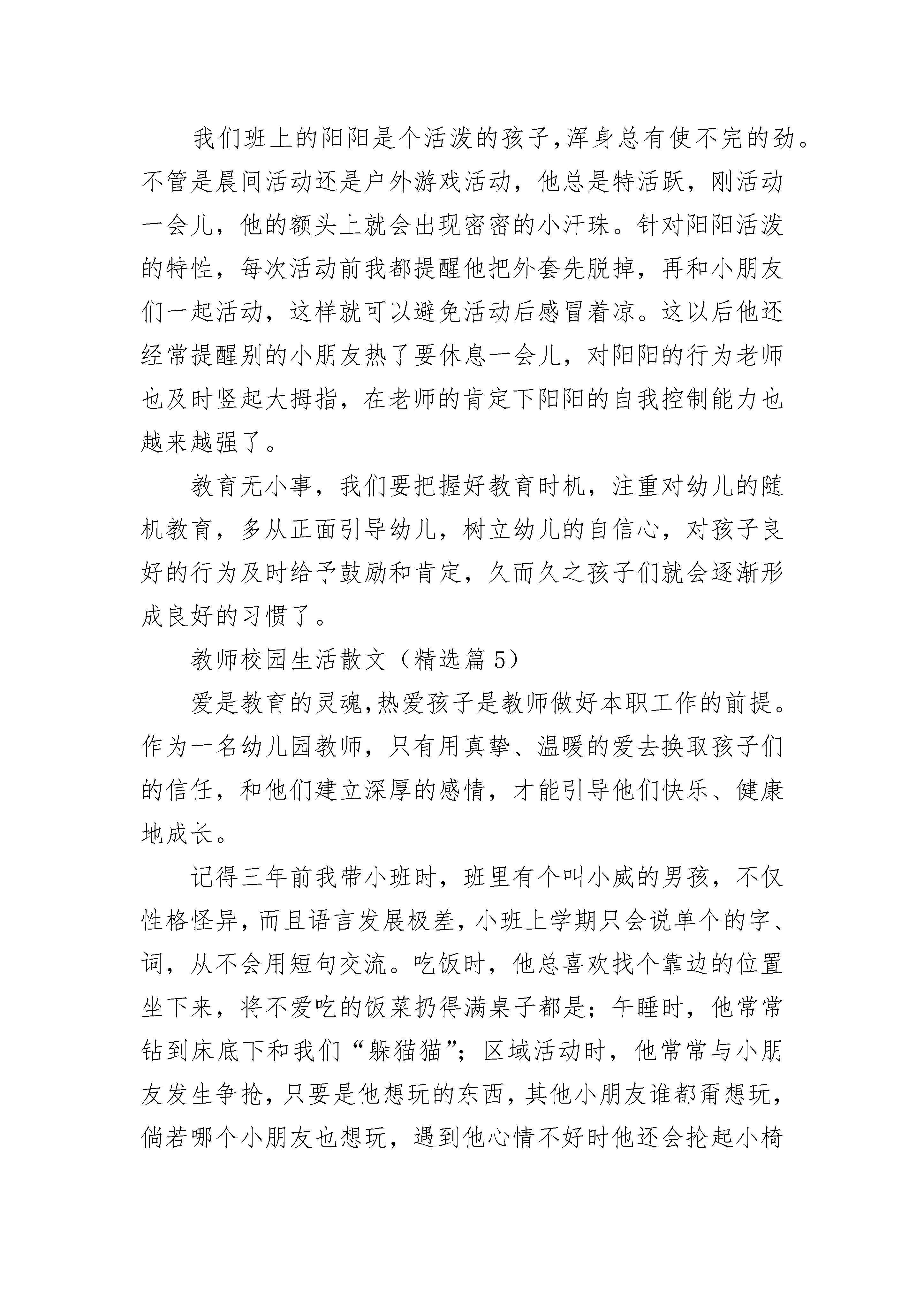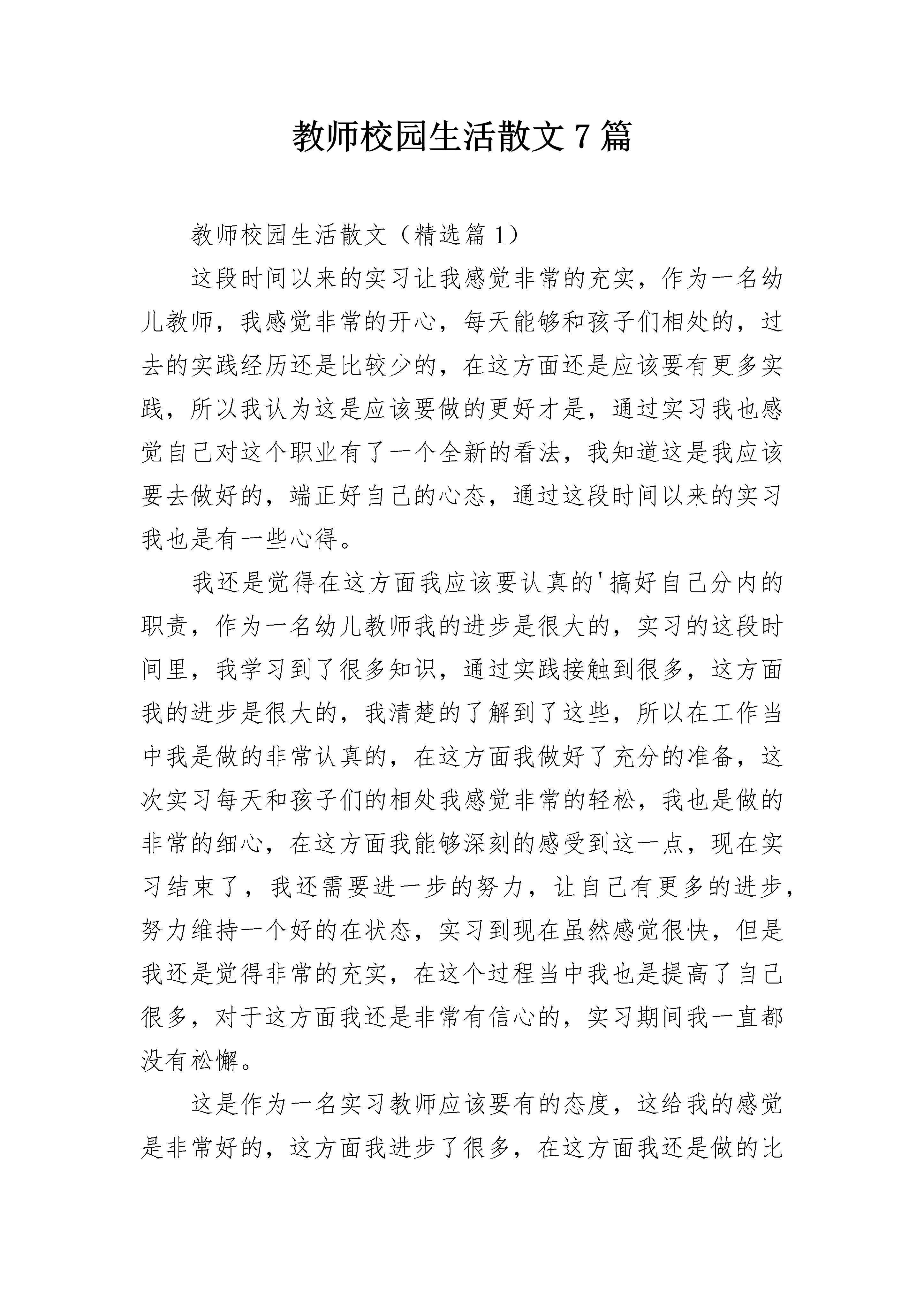 教师校园生活散文7篇教师校园生活散文(精选篇1)这段时间以来的实习让我感觉非常的充实,作为一名幼儿教师,我感觉非常的开心,每天能够和孩子们相处的,过去的实践经历还是比较少的,在这方面还是应该要有更多实践,所以我认为这是应该要做的更好才是,通过实习我也感觉自己对这个职业有了一个全新的看法,我知道这是我应该要去做好的,端正好自己的心态,通过这段时间以来的实习我也是有一些心得。我还是觉得在这方面我应该要认真的'搞好自己分内的职责,作为一名幼儿教师我的进步是很大的,实习的这段时间里,我学习到了很多知识,通过实践接触到很多,这方面我的进步是很大的,我清楚的了解到了这些,所以在工作当中我是做的非常认真的,在这方面我做好了充分的准备,这次实习每天和孩子们的相处我感觉非常的轻松,我也是做的非常的细心,在这方面我能够深刻的感受到这一点,现在实习结束了,我还需要进一步的努力,让自己有更多的进步,努力维持一个好的在状态,实习到现在虽然感觉很快,但是我还是觉得非常的充实,在这个过程当中我也是提高了自己很多,对于这方面我还是非常有信心的,实习期间我一直都没有松懈。这是作为一名实习教师应该要有的态度,这给我的感觉是非常好的,这方面我进步了很多,在这方面我还是做的比较认真的,这一点我感觉非常的有必要,在实习当中我能够客观的看待自己的能力,所以我清楚的知道自己在这次实习当中的不足之处,确实还是应该要去思考的,应该要做好准备,对自己的工作认真一点,不断的调整好状态,通过实习也是感觉自己的变化很大,这方面我对自己是非常有信心的,我也一定会继续努力的调整好心态,端正好自己的心态,这一点是毋庸置疑的,我非常的感激在__这里的这段实习经历,这是非常有必要的,这段时间的工作我还是觉得自己有非常大的提高,过去在学校的缺少这种实践经历,我也是做的比较认真的,收获很大,未来在生活当中我也会认真做的更好,努力成为一名优秀的幼儿教师,实习虽然短暂,但是近期我感觉很充实,我也感激能够有这么一段经历,我一定会保持一个好的态度,以后提高自己的业务能力,做一名优秀幼教。教师校园生活散文(精选篇2)在工作方面我作为一名幼儿教师还有许多要去完善好的事情,在不知不觉之间我也得到了非常多的锻炼,这份工作让我也把心态摆的很稳,作为幼师其实工作并不轻松,跟孩子们相处有些时候确实会很美妙,但有的时候也会出现各种问题,让我很是忧愁,现在回想起来的时候确实还是有很多问题的,工作上面我一直都坚信自己是做的没问题的,这一点我始终都不怀疑,这段时间下来我也静下心想过,感触颇深,接下来要调整一下工作状态,这让我对自己幼师工作也有了一番感悟。接触孩子们到现在我也发现了很多细节,我带的是小班,孩子们对对上课对学习是没有什么概念的,这个时候小朋友是一张白纸,所以是不能够马虎大意的,保持好耐心,这一点在什么时候都是要有的,一开始我是希望能够融入到孩子们中间,用同等的身份去接触孩子,不给孩子太多的压力,一步步的来,从接触孩子到让孩子有一个上课的意识,让后建立各自的身份,一个小集体就是要有一个带头的角色,而我就是这么一个角色,我非常愿意在这个小群体当中跟孩子们和睦相处,每天做一些小游戏,游戏的过程当中让孩子们学习一些小知识,我认为这个过程非常好,也很轻松,这一点不管是在什么时候都是没错的,我也一定会保持积极乐观的工作状态,毕竟跟孩子们相处没有什么压力。工作方面其实有时候也会很忧愁,毕竟孩子们小,有些时候也是会出现一些突发情况,部分孩子一开始后融入到这个集体当中,或多或少是有些不适应,也有哭的闹腾的,作为一名幼儿教师也算的上是半个家长了,很多事情也是需要操心的,让孩子们适应幼儿园的坏境,有些时候还是需要去做出示范,虽然这样的情况不多,但有些时候确实还是会出现问题,这是我需要去面对的,不能够马虎大一,在工作当中必须要鉴定信念,保持一个好的心态耐心去接触孩子们,这段时间以来的工作让我深受感触,毕竟不是所有事情都能够稳定好心态,有些时候还是要尽职尽责的,落实到位,成为一名优秀的幼儿教师,从一开始我就抱着这种心态,我还有很多工作要去完善到位,这段时间以来我确实体会了工作当中乐趣,我会进一步融洽跟孩子们的关系,用实际行动去完成对自身的要求。教师校园生活散文(精选篇3)淅淅沥沥的小雨下了一个晚上,第二天来到幼儿园,院子里的积水里出现了许多蚯蚓,“老师老师,快看这里有许多小蛇”,听到心雨小朋友的喊声,所有的小朋友都跑过去看这些不速之客,只听见凡智小朋友说:“这不是小蛇,这是蚯蚓,会松土的蚯蚓”,“蚯蚓喜欢住在潮湿的土壤里,它是益虫,它每天吞食大量的泥土,然后将泥土排泄出来,使土壤变得疏松肥沃,这样农作物就会长得很旺盛。”……听到孩子们七嘴八舌的讨论,我非常高兴,因为孩子们在无意识中学会了观察和探讨。通过这件事,让我明白了:教育无处不在。
