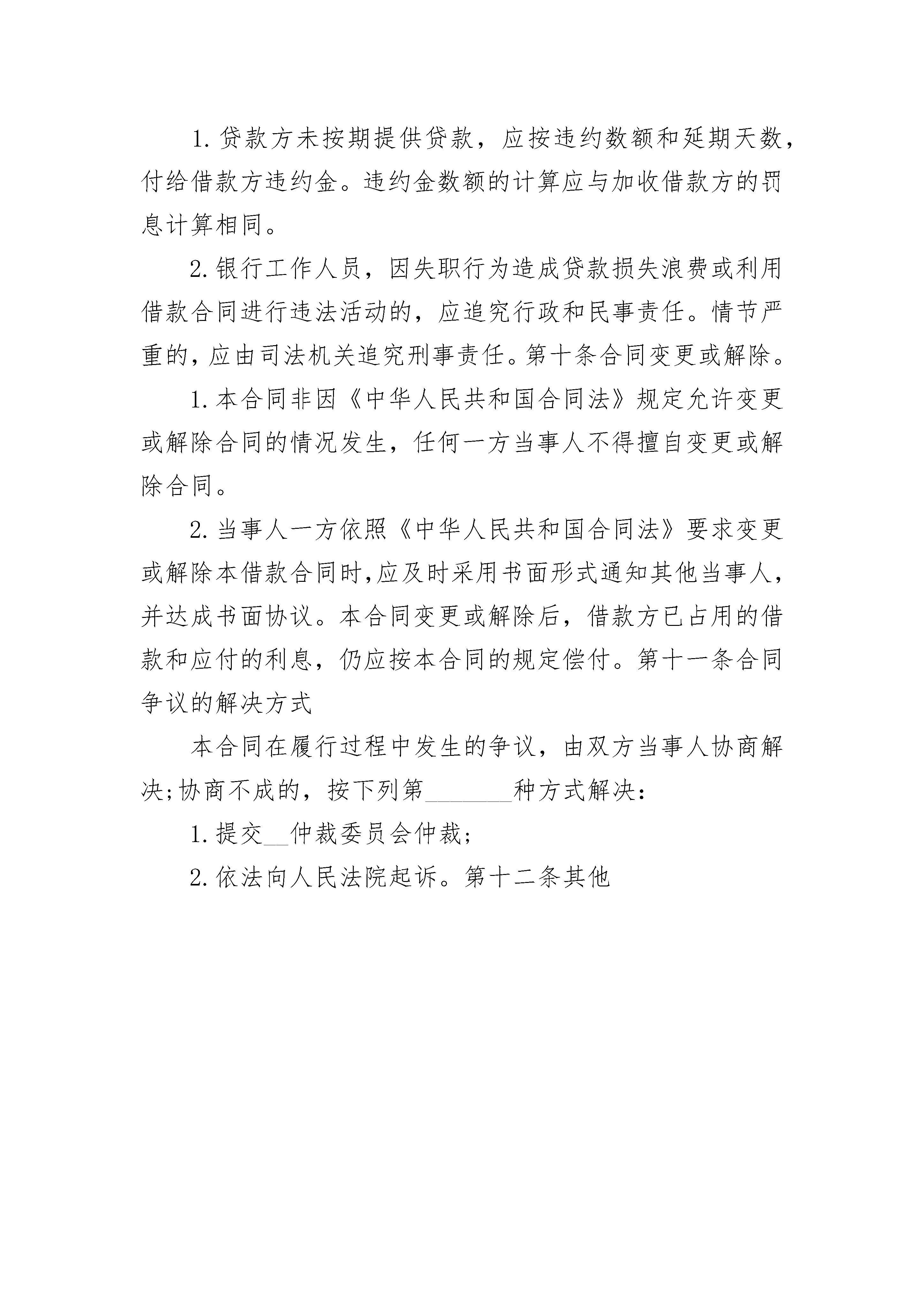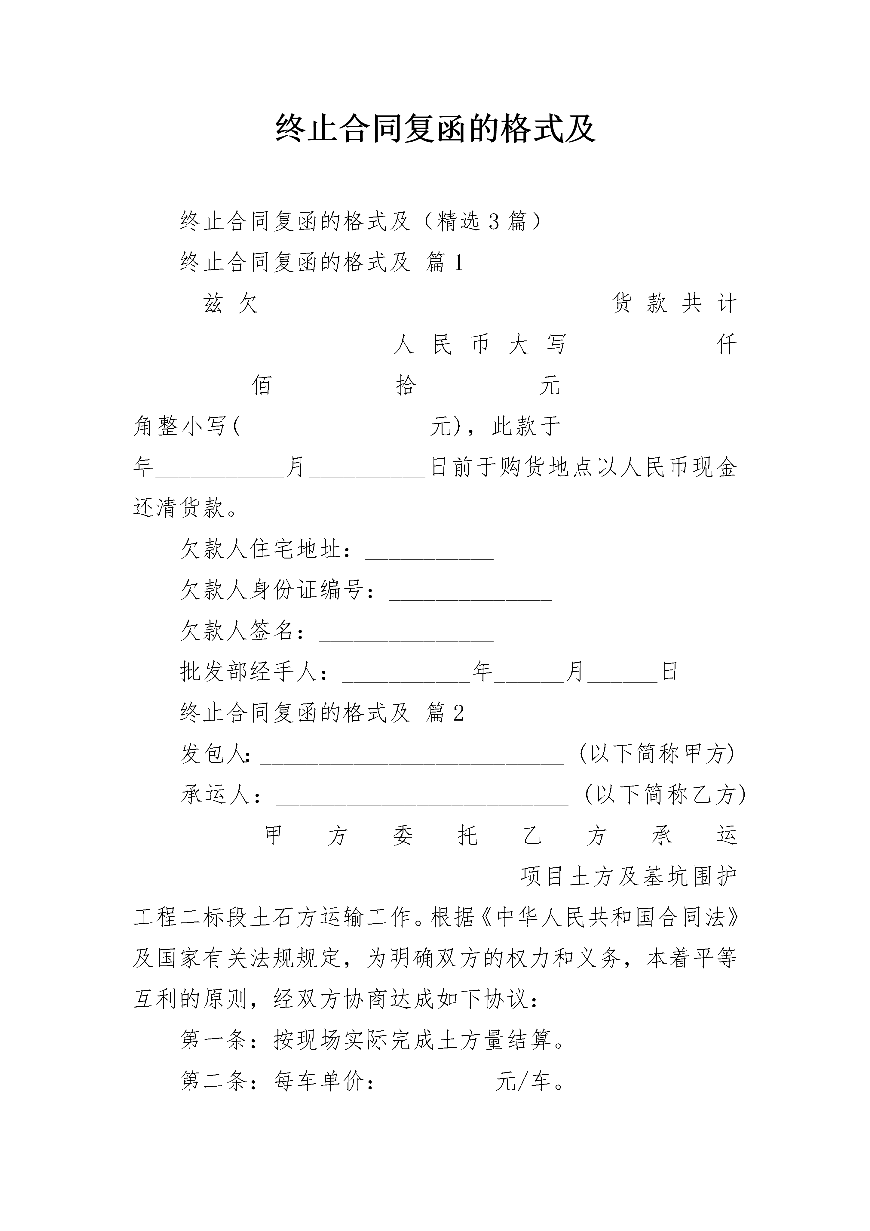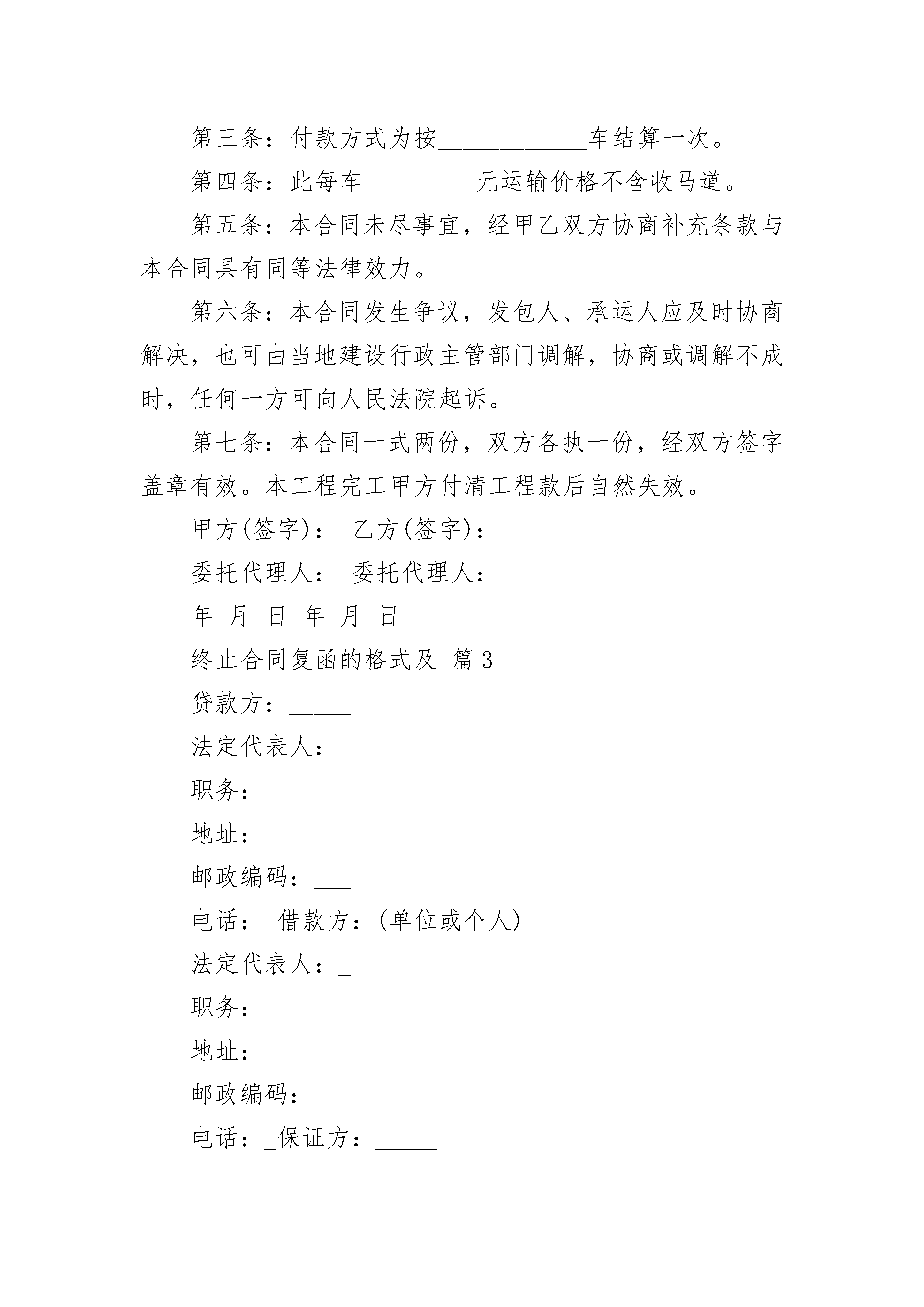 终止合同复函的格式及终止合同复函的格式及(精选3篇)终止合同复函的格式及篇1兹欠____________________________货款共计_____________________人民币大写__________仟__________佰__________拾__________元_______________角整小写(________________元),此款于_______________年___________月__________日前于购货地点以人民币现金还清货款。欠款人住宅地址:___________欠款人身份证编号:______________欠款人签名:_______________批发部经手人:___________年______月______日终止合同复函的格式及篇2发包人:__________________________(以下简称甲方)承运人:_________________________(以下简称乙方)甲方委托乙方承运_________________________________项目土方及基坑围护工程二标段土石方运输工作。根据《中华人民共和国合同法》及国家有关法规规定,为明确双方的权力和义务,本着平等互利的原则,经双方协商达成如下协议:第一条:按现场实际完成土方量结算。第二条:每车单价:_________元/车。第三条:付款方式为按____________车结算一次。第四条:此每车_________元运输价格不含收马道。第五条:本合同未尽事宜,经甲乙双方协商补充条款与本合同具有同等法律效力。第六条:本合同发生争议,发包人、承运人应及时协商解决,也可由当地建设行政主管部门调解,协商或调解不成时,任何一方可向人民法院起诉。第七条:本合同一式两份,双方各执一份,经双方签字盖章有效。本工程完工甲方付清工程款后自然失效。甲方(签字):乙方(签字):委托代理人:委托代理人:年月日年月日终止合同复函的格式及篇3贷款方:_____法定代表人:_职务:_地址:_邮政编码:___电话:_借款方:(单位或个人)法定代表人:_职务:_地址:_邮政编码:___电话:_保证方:_____法定代表人:_职务:_地址:_邮政编码:___电话:_借款方为进行____生产(或经营活动),向贷款方申请借款,并由_作为保证人,贷款方业已审查批准,经三方协商,特订立本合同,以期共同遵守。第一条贷款种类_____。第二条借款用途_____。第三条借款金额:___。第四条借款利率为月息千分之____,利随本清,如遇国家调整利率,按新规定计算。第五条借款和还款期限1.借款时间共_______年零_____个月。自_日起,至___止。2.借款分期如下:贷款期限贷款时间贷款金额第一期年月底前元第二期年月底前元第三期年月底前元3.还款分期如下:2.还款方式:_第七条保证条款1.借款方用作抵押,到期不能归还贷款方的贷款,贷款方有权处理抵押物。借款方到期如数归还贷款的,抵押权消灭。2.借款方必须按照借款合同规定的用途使用借款,不得挪作他用,不得用借款进行违法活动。3.借款方必须按合同规定的期限还本付息。4.借款方有义务接受贷款方检查、监督贷款的使用情况,了解借款方的计划执行、经营管理、财务活动、物资库存等情况。借款方应提供有关的计划、统计、财务会计报表及资料。5.有保证人担保时,保证人履行连带责任后,有向借款方追偿的权利,借款方有义务对保证人进行偿还。第八条约定条款借款方由于经营管理不善而关闭、破产,确实无法履行合同的,在处理财产时,除了按国家规定用于人员工资和必要的维护费用外,应优先偿还贷款。由于上级主管部门决定关、停、并、转或撤销工程建设等措施,或者由于不可抗力的意外事故致使借款方无法履行合同时,经向贷款方申请,可以变更或解除合同,并免除承担违约责任。第九条违约责任一、借款方的违约责任1.借款方不按合同规定的用途使用借款,贷款方有权收回部分或全部贷款,对违约使用的部分,按银行规定的利率加收罚息。情节严重的,在一定时期内,银行可以停止发放新贷款。2.借款方如逾期不还借款,贷款方有权追回借款,并按银行规定加收罚息。借款方提前还款的,应按规定收利息。3.借款方使用借款造成损失浪费或利用借款合同进行违法活动的,贷款方应追回贷款本息,有关单位对直接责任人应追究行政和民事责任。情节严重的,由司法机关追究刑事责任。二、贷款方的违约责任1.贷款方未按期提供贷款,应按违约数额和延期天数,付给借款方违约金。违约金数额的计算应与加收借款方的罚息计算相同。2.银行工作人员,因失职行为造成贷款损失浪费或利用借款合同进行违法活动的,应追究行政和民事责任。情节严重的,应由司法机关追究刑事责任。第十条合同变更或解除。1.本合同非因《中华人民共和国合同法》规定允许变更或解除