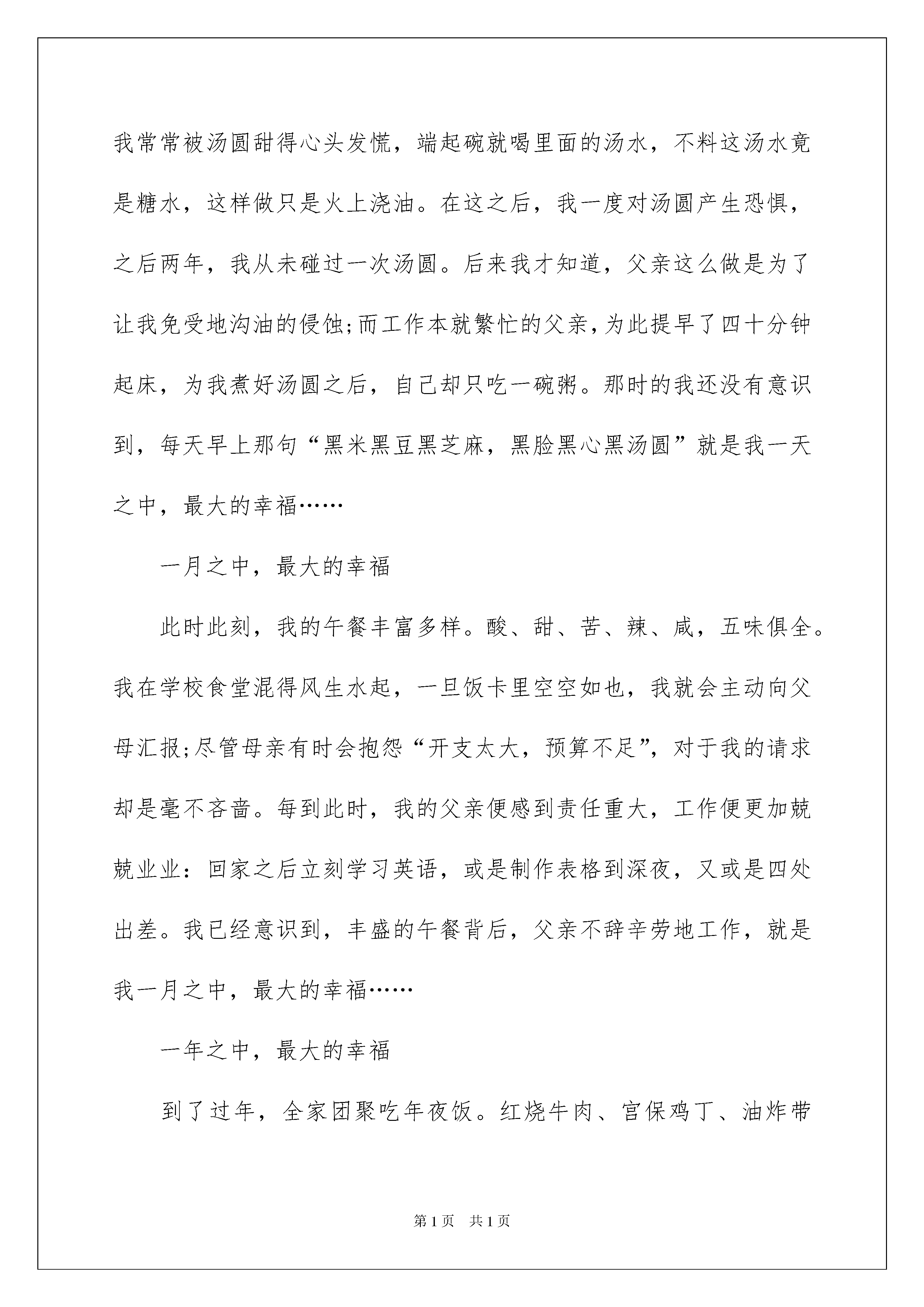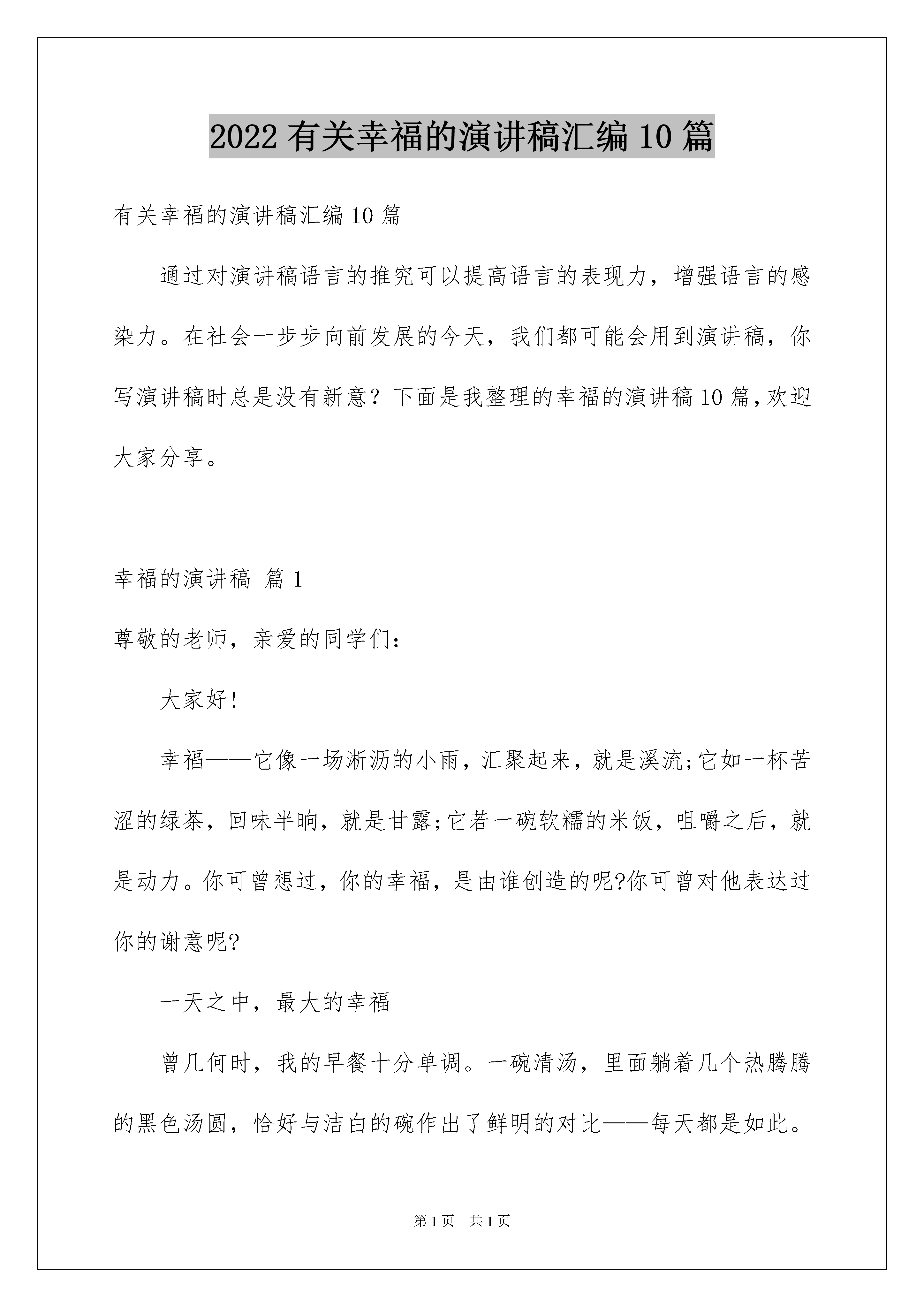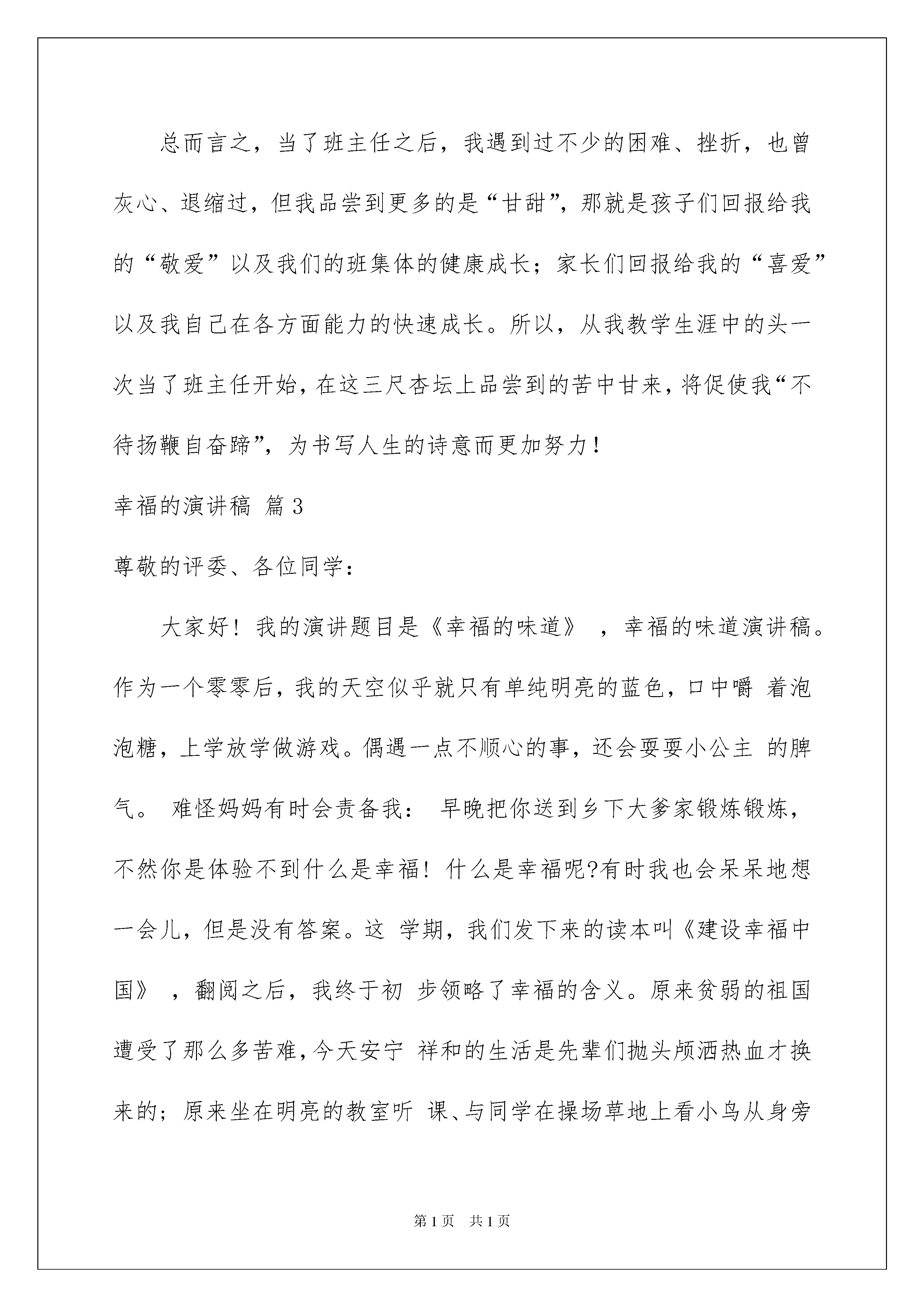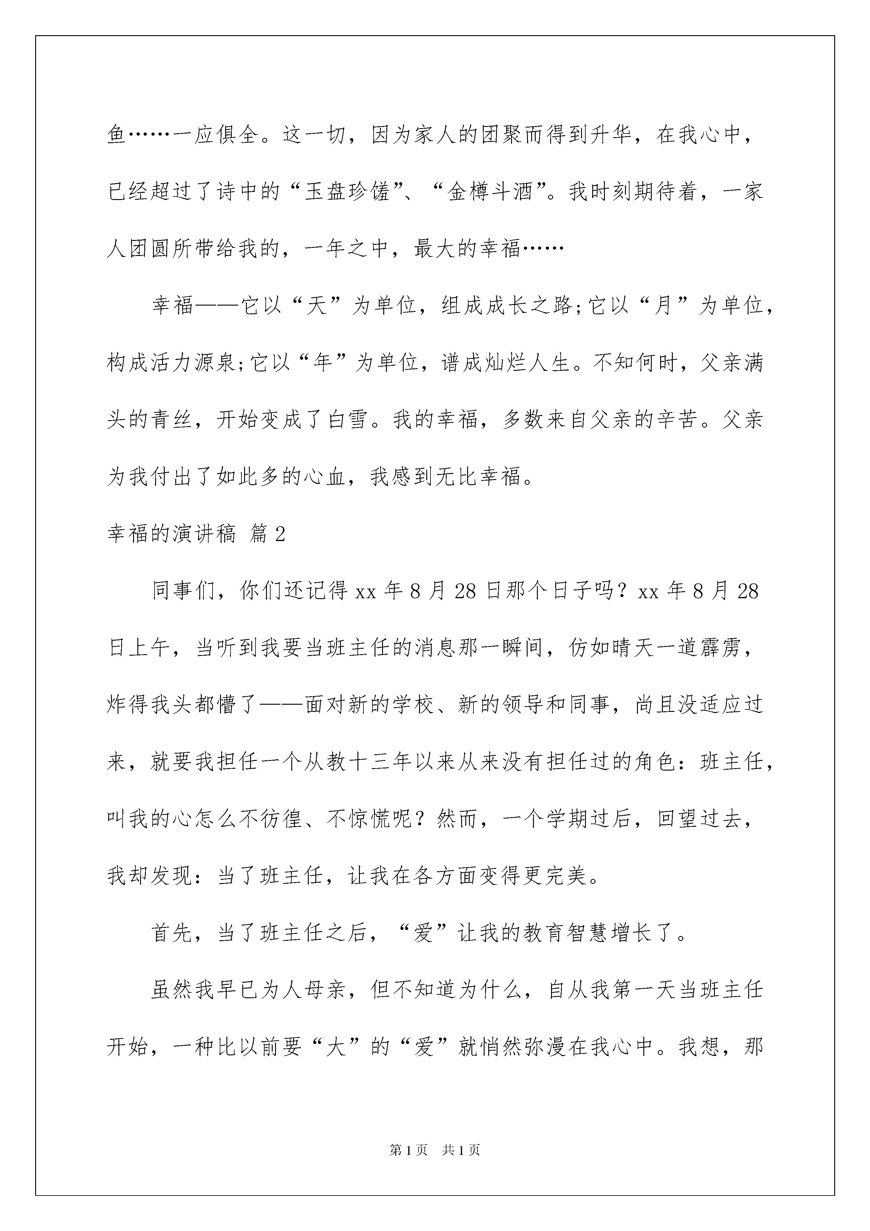 2022有关幸福的演讲稿汇编10篇有关幸福的演讲稿汇编10篇通过对演讲稿语言的推究可以提高语言的表现力,增强语言的感染力。在社会一步步向前发展的今天,我们都可能会用到演讲稿,你写演讲稿时总是没有新意?下面是我整理的幸福的演讲稿10篇,欢迎大家分享。幸福的演讲稿篇1尊敬的老师,亲爱的同学们:大家好!幸福——它像一场淅沥的小雨,汇聚起来,就是溪流;它如一杯苦涩的绿茶,回味半晌,就是甘露;它若一碗软糯的米饭,咀嚼之后,就是动力。你可曾想过,你的幸福,是由谁创造的呢?你可曾对他表达过你的谢意呢?一天之中,最大的幸福曾几何时,我的早餐十分单调。一碗清汤,里面躺着几个热腾腾的黑色汤圆,恰好与洁白的碗作出了鲜明的对比——每天都是如此。我常常被汤圆甜得心头发慌,端起碗就喝里面的汤水,不料这汤水竟是糖水,这样做只是火上浇油。在这之后,我一度对汤圆产生恐惧,之后两年,我从未碰过一次汤圆。后来我才知道,父亲这么做是为了让我免受地沟油的侵蚀;而工作本就繁忙的父亲,为此提早了四十分钟起床,为我煮好汤圆之后,自己却只吃一碗粥。那时的我还没有意识到,每天早上那句“黑米黑豆黑芝麻,黑脸黑心黑汤圆”就是我一天之中,最大的幸福……一月之中,最大的幸福此时此刻,我的午餐丰富多样。酸、甜、苦、辣、咸,五味俱全。我在学校食堂混得风生水起,一旦饭卡里空空如也,我就会主动向父母汇报;尽管母亲有时会抱怨“开支太大,预算不足”,对于我的请求却是毫不吝啬。每到此时,我的父亲便感到责任重大,工作便更加兢兢业业:回家之后立刻学习英语,或是制作表格到深夜,又或是四处出差。我已经意识到,丰盛的午餐背后,父亲不辞辛劳地工作,就是我一月之中,最大的幸福……一年之中,最大的幸福到了过年,全家团聚吃年夜饭。红烧牛肉、宫保鸡丁、油炸带鱼……一应俱全。这一切,因为家人的团聚而得到升华,在我心中,已经超过了诗中的“玉盘珍馐”、“金樽斗酒”。我时刻期待着,一家人团圆所带给我的,一年之中,最大的幸福……幸福——它以“天”为单位,组成成长之路;它以“月”为单位,构成活力源泉;它以“年”为单位,谱成灿烂人生。不知何时,父亲满头的青丝,开始变成了白雪。我的幸福,多数来自父亲的辛苦。父亲为我付出了如此多的心血,我感到无比幸福。幸福的演讲稿篇2同事们,你们还记得xx年8月28日那个日子吗?xx年8月28日上午,当听到我要当班主任的消息那一瞬间,仿如晴天一道霹雳,炸得我头都懵了——面对新的学校、新的领导和同事,尚且没适应过来,就要我担任一个从教十三年以来从来没有担任过的角色:班主任,叫我的心怎么不彷徨、不惊慌呢?然而,一个学期过后,回望过去,我却发现:当了班主任,让我在各方面变得更完美。首先,当了班主任之后,“爱”让我的教育智慧增长了。虽然我早已为人母亲,但不知道为什么,自从我第一天当班主任开始,一种比以前要“大”的“爱”就悄然弥漫在我心中。我想,那是源于班里48个孩子对我的信任和依赖。面对经常在学习、纪律、卫生、行为规范、文明礼貌等方面犯了错误的孩子,我没有像以前那样,只会批评和发火。我会首先耐心地了解他们犯错的原因,然后耐心地讲道理,再耐心地指引他们以后该怎么作。“爱”与“耐心”是一种教育智慧。苏霍姆林斯基说过的一句话:“教育智慧的高低很大程度上在于能否控制自己的情感。”其次,当了班主任之后,让我的责任心加强了。“责任就是对自己要求去做的事情有一种爱”这是歌德所说的一句话。也是让我的责任心加强的直接原因。第三,当了班主任之后,让我与人沟通的能力提高了。刚开学那时,因为学费的问题,一个脾气很冲的家长就在电话里对我吼:“你说收费跟以前的学校一样,为什么现在又多收了?!”其实是因为他的证件不齐全,我们只是严格按照规章制度办事而已。但他说话的口气就像是我多收了他的学费一样。我当时也气了,几乎跟他吵了起来。刚好级组长经过,接过电话,三言两语就把他的怒气平息了。这件事让我吸取了很大的教训,同样是讲话,会讲与不会讲,效果简直有天壤之别啊。总而言之,当了班主任之后,我遇到过不少的困难、挫折,也曾灰心、退缩过,但我品尝到更多的是“甘甜”,那就是孩子们回报给我的“敬爱”以及我们的班集体的健康成长;家长们回报给我的“喜爱”以及我自己在各方面能力的快速成长。所以,从我教学生涯中的头一次当了班主任开始,在这三尺杏坛上品尝到的苦中甘来,将促使我“不待扬鞭自奋蹄”,为书写人生的诗意而更加努力!幸福的演讲稿篇3尊敬的评委、各位同学:大家好!我的演讲题目是《幸福的味道》,幸福的味道演讲稿。作为一个零零后,我的天空似乎就只有单纯明亮的蓝色,口中嚼着泡泡糖,上学放学做游戏。偶遇一点不顺心的事,