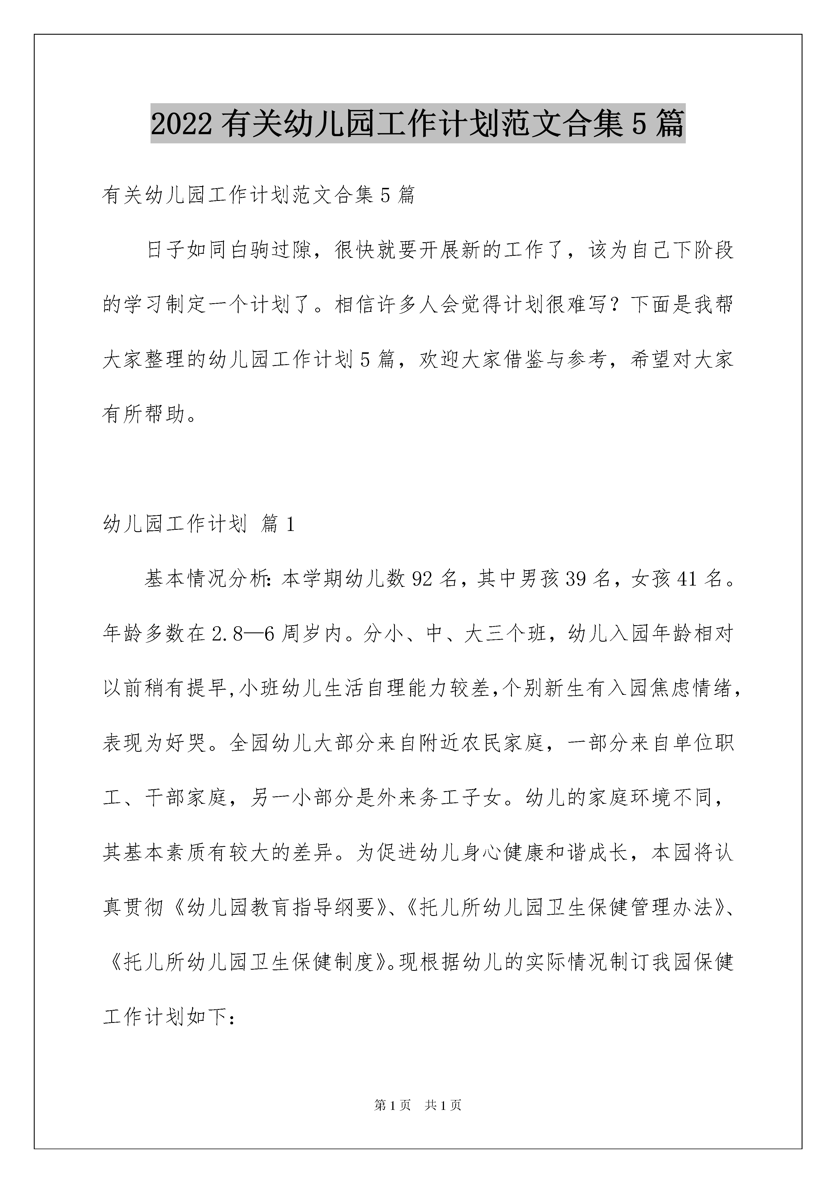 2022有关幼儿园工作计划范文合集5篇有关幼儿园工作计划范文合集5篇日子如同白驹过隙,很快就要开展新的工作了,该为自己下阶段的学习制定一个计划了。相信许多人会觉得计划很难写?下面是我帮大家整理的幼儿园工作计划5篇,欢迎大家借鉴与参考,希望对大家有所帮助。幼儿园工作计划篇1基本情况分析:本学期幼儿数92名,其中男孩39名,女孩41名。年龄多数在2.8—6周岁内。分小、中、大三个班,幼儿入园年龄相对以前稍有提早,小班幼儿生活自理能力较差,个别新生有入园焦虑情绪,表现为好哭。全园幼儿大部分来自附近农民家庭,一部分来自单位职工、干部家庭,另一小部分是外来务工子女。幼儿的家庭环境不同,其基本素质有较大的差异。为促进幼儿身心健康和谐成长,本园将认真贯彻《幼儿园教肓指导纲要》、《托儿所幼儿园卫生保健管理办法》、《托儿所幼儿园卫生保健制度》。现根据幼儿的实际情况制订我园保健工作计划如下:一、建立合理的生活、学习制度根据幼儿不同年龄及季节特点,科学制订出一日生活、学习计划,注意动静结合,保证充足的户外活动时间。二、严格执行科学饮食、卫生保健制度1、制订幼儿园的食谱时(早点、午点),遵循营养充足的原则、科学的平衡膳食的原则、考虑幼儿身心特点的原则、伙食收支平衡的原则。确保制订的食谱既经济,又新鲜,营养价值高,为幼儿提供大量的丰富食物。2、确保幼儿的早点、午点伙食有专人负责,民主管理,定期召开家长会,研究伙食问题。保证幼儿的进食量、营养量。3、严格执行《食品卫生法》,做到一人一巾一杯,食具一餐一消毒。4、培养幼儿不偏食、不吃零食的良好习惯。三、坚持体格锻炼制度1、保证幼儿每天做一次体操和活动性游戏。每天坚持两小时以上户外活动时间,加强冬季锻炼。2、确保运动项目和运动量适合各年龄段的特点,对个别体弱的幼儿给予特殊照顾。四、执行健康检查及卫生消毒制度1、园里工作人员每年体验一次,健康检查合格方可上岗。2、幼儿每年体验一次,要认真做好记录,进行健康分析、评价、疾病统计。建立健康卡,加强以体弱、多病幼儿的管理,使其逐步达到正常标准。3、坚持晨检及全日健康观察制度,认真做好一摸、二看、三问、四查。发现问题及时处理。4、加强常见病、传染病的预防工作,发现传染病及时隔离并通知家长做好治疗工作,配备好卫生保健箱的常用药及卫生保健用品。5、建立健全室内室外环境清扫制度,每天一小扫,每周一大扫。玩、教具要保持清洁,定期消毒、清洗。6、要经常保持室内空气流通、阳光充足,冬天要定时开窗通风换气。五、加强安全管理制度1、各项活动要以孩子为中心,教师要密切注视幼儿的各项活动。2、要注意场地、玩具、用具使用安全,避免触电、砸伤、摔伤、烫伤等事故的发生。3、建立健全幼儿接送制度,不得丢失幼儿。六、密切家长联系制度采用多种方式,同家长加强联系,争取家长配合。定期召开家长会,经常向家长宣传幼儿卫生保健知识,幼儿如无故缺勤,要及时和家长联系,共同做好幼儿的培养工作。幼儿园工作计划篇2随着教育事业的改革发展,教科研的重要性也越来越被教育界所重视。幼儿园教研工作是幼儿园工作的一项常规性活动,与幼儿园保教工作同步相融,在幼儿园工作中占有十分重要的地位,是不可拙劣的重要组成部分。它是实现促进教育理论同教育实践转化的中介,是加强日常保教工作管理的有效措施,是提高教师队伍素质的重要途径,是提高保教质量的经常性手段。一、指导思想:本期我园艺术组的教研活动以素质教育为中心,以《幼儿园指导纲要》精神为指导,以《重庆市教委深入贯彻〈幼儿园教育指导纲要(试行)〉的意见》要求为主要工作目标。在教研活动中遵循“求真务实”的工作原则,坚持“以幼儿园教育质量为本,以教师和幼儿发展为本”的思想,从我园实际情况出发,充分发挥教研工作职能,开展多向互动研究,扎实有效地深入贯彻《纲要》。坚持把提高保教质量放在第一位,全面贯彻澄江小学教研工作的思路,通过各种活动的开展,积极地促进幼教事业向前发展。二、主要工作思路:本学期艺术组的教研工作要从以下几个方面来开展:1、强化自身建设,努力提高教研整体水平。本着精干高效,结合实际的原则,制定完整的教研计划,确定每一次教研活动的内容和具体的安排,让各位教师有时间和精力来参加,切实提高教师们的教研水平。与园领导共同商量,努力安排好各位参研的教职工的工作,让参加活动的教职工全心投入到教研活动中,解决他们的后顾之忧。不错的2、抓好学习,努力提高教师的专业素质。幼儿园教育“质量就是生命”,教研组根据相应的学习制度,形成一种学习氛围。教研组作为教师学习的阵地,提高保教水平的重要手段之一,在艺术组的教研活动中,主持人都引导参研教师学习幼儿教育