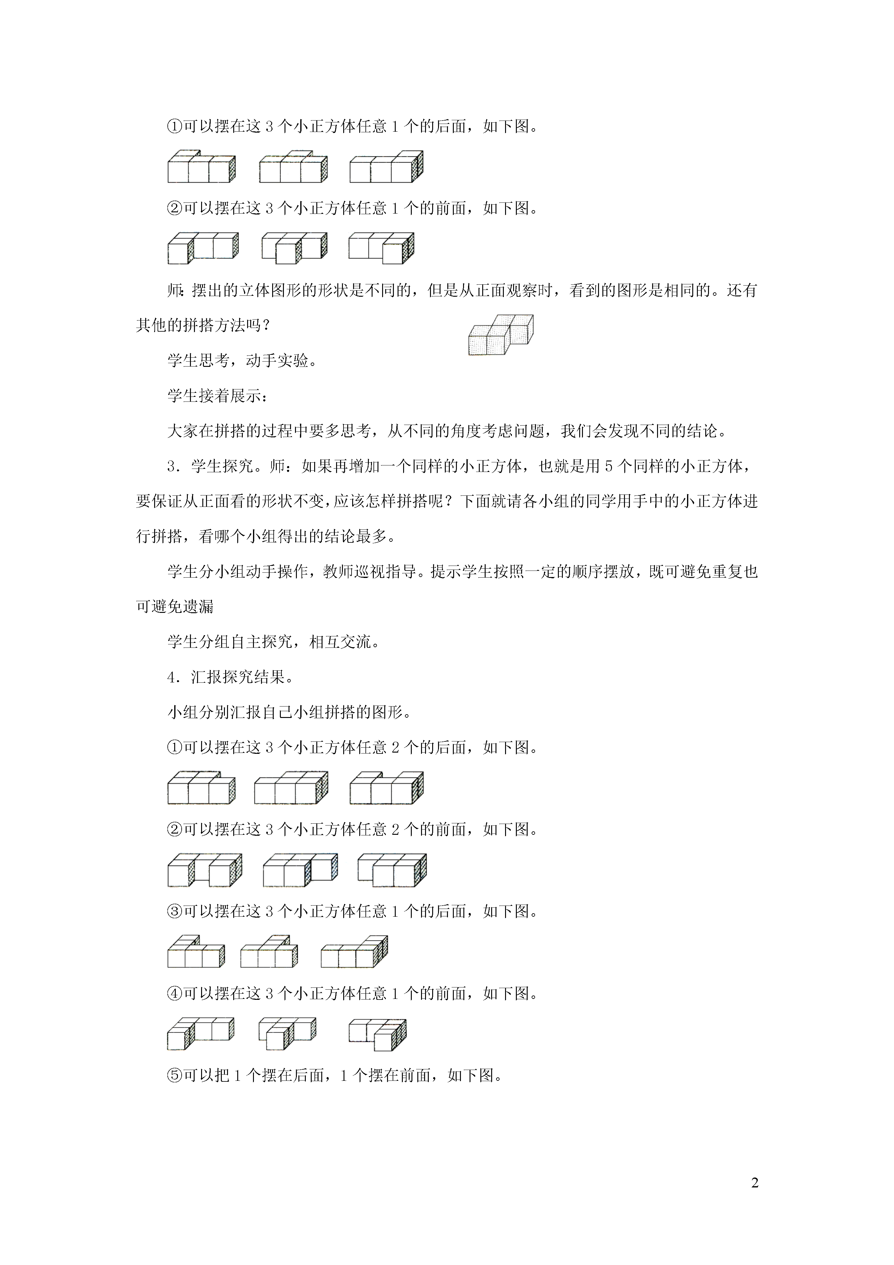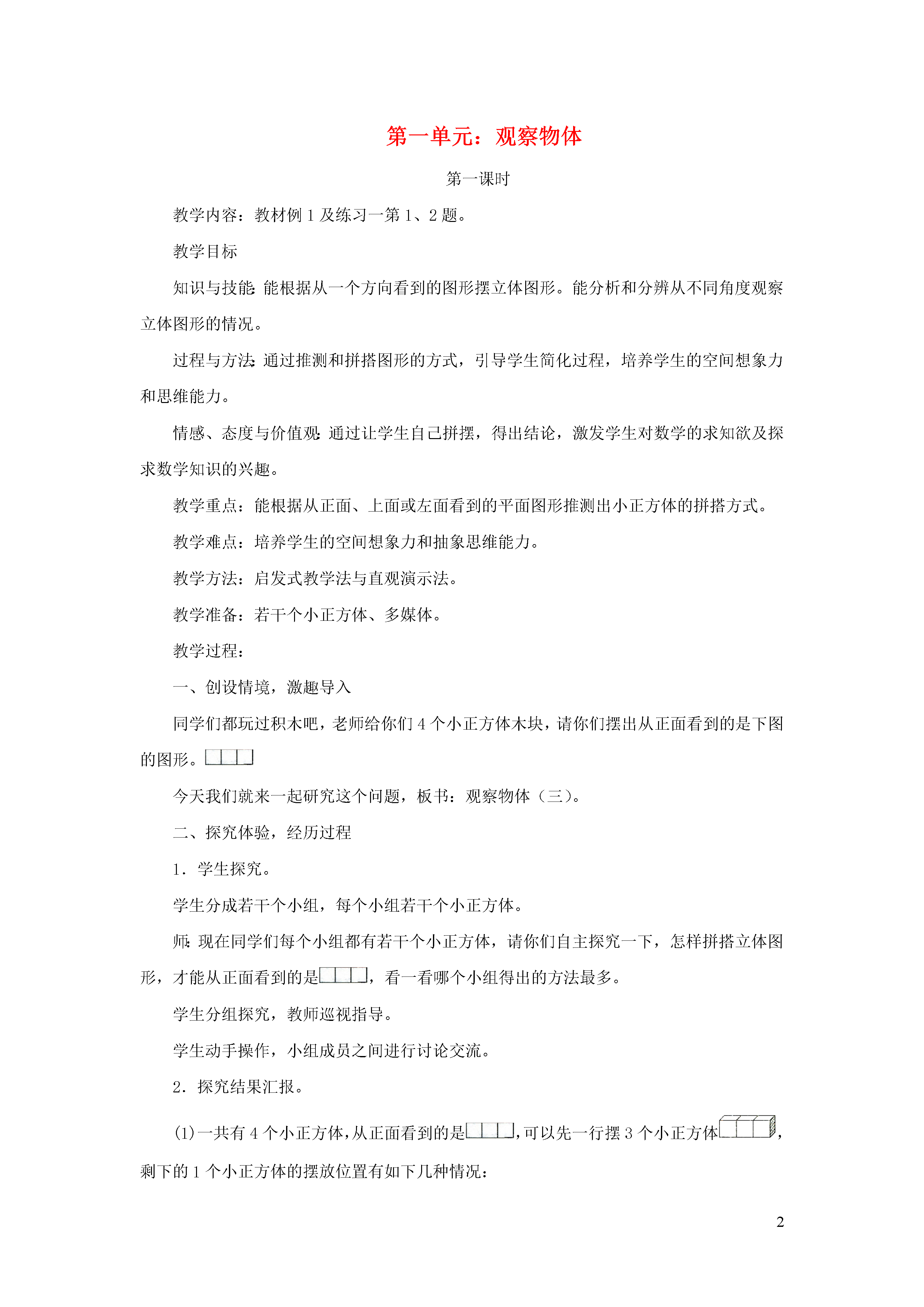 2第一单元:观察物体第一课时教学内容:教材例1及练习一第1、2题。教学目标知识与技能:能根据从一个方向看到的图形摆立体图形。能分析和分辨从不同角度观察立体图形的情况。过程与方法:通过推测和拼搭图形的方式,引导学生简化过程,培养学生的空间想象力和思维能力。情感、态度与价值观:通过让学生自己拼摆,得出结论,激发学生对数学的求知欲及探求数学知识的兴趣。教学重点:能根据从正面、上面或左面看到的平面图形推测出小正方体的拼搭方式。教学难点:培养学生的空间想象力和抽象思维能力。教学方法:启发式教学法与直观演示法。教学准备:若干个小正方体、多媒体。教学过程:一、创设情境,激趣导入同学们都玩过积木吧,老师给你们4个小正方体木块,请你们摆出从正面看到的是下图的图形。今天我们就来一起研究这个问题,板书:观察物体(三)。二、探究体验,经历过程1.学生探究。学生分成若干个小组,每个小组若干个小正方体。师:现在同学们每个小组都有若干个小正方体,请你们自主探究一下,怎样拼搭立体图形,才能从正面看到的是,看一看哪个小组得出的方法最多。学生分组探究,教师巡视指导。学生动手操作,小组成员之间进行讨论交流。2.探究结果汇报。(1)一共有4个小正方体,从正面看到的是,可以先一行摆3个小正方体,剩下的1个小正方体的摆放位置有如下几种情况:①可以摆在这3个小正方体任意1个的后面,如下图。②可以摆在这3个小正方体任意1个的前面,如下图。师:摆出的立体图形的形状是不同的,但是从正面观察时,看到的图形是相同的。还有其他的拼搭方法吗?学生思考,动手实验。学生接着展示:大家在拼搭的过程中要多思考,从不同的角度考虑问题,我们会发现不同的结论。3.学生探究。师:如果再增加一个同样的小正方体,也就是用5个同样的小正方体,要保证从正面看的形状不变,应该怎样拼搭呢?下面就请各小组的同学用手中的小正方体进行拼搭,看哪个小组得出的结论最多。学生分小组动手操作,教师巡视指导。提示学生按照一定的顺序摆放,既可避免重复也可避免遗漏学生分组自主探究,相互交流。4.汇报探究结果。小组分别汇报自己小组拼搭的图形。①可以摆在这3个小正方体任意2个的后面,如下图。②可以摆在这3个小正方体任意2个的前面,如下图。③可以摆在这3个小正方体任意1个的后面,如下图。④可以摆在这3个小正方体任意1个的前面,如下图。⑤可以把1个摆在后面,1个摆在前面,如下图。教师分别对各个小组所拼搭的图形点评,给学生以肯定和鼓励。三、课堂小结,梳理提升这节课我们研究了,根据从一个角度观察物体得到的平面图形进行拼搭立体图形,你有什么收获呢?学生谈收获,教是根据学生谈话归纳整理成板书。板书设计:观察物体(三)1.由几个大小相同的小正方体摆成的立体图形,从同一个方向观察,看到的图形可能是相同的,也可能是不同的。2.根据从一个方向看到的图形摆立体图形,有多种摆法。作业:教材练习一第1、2题。