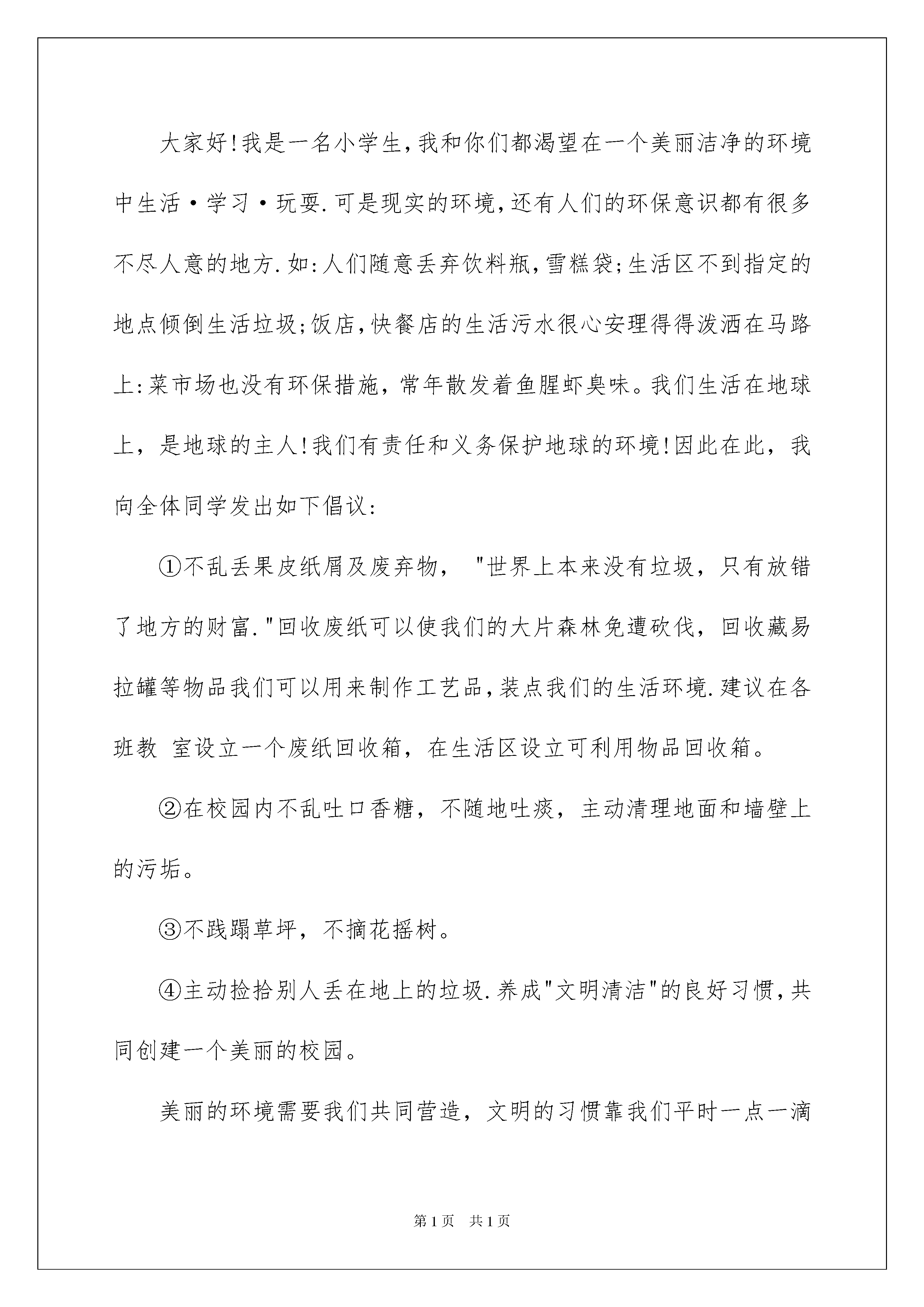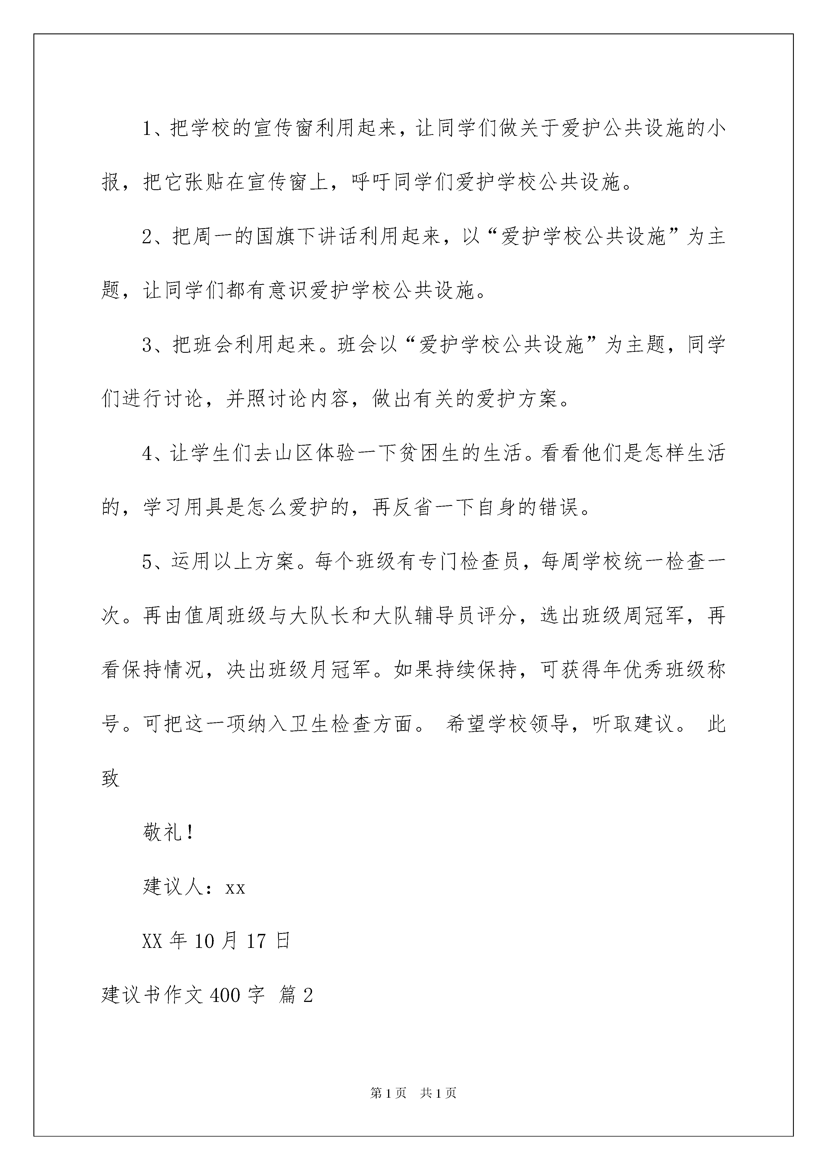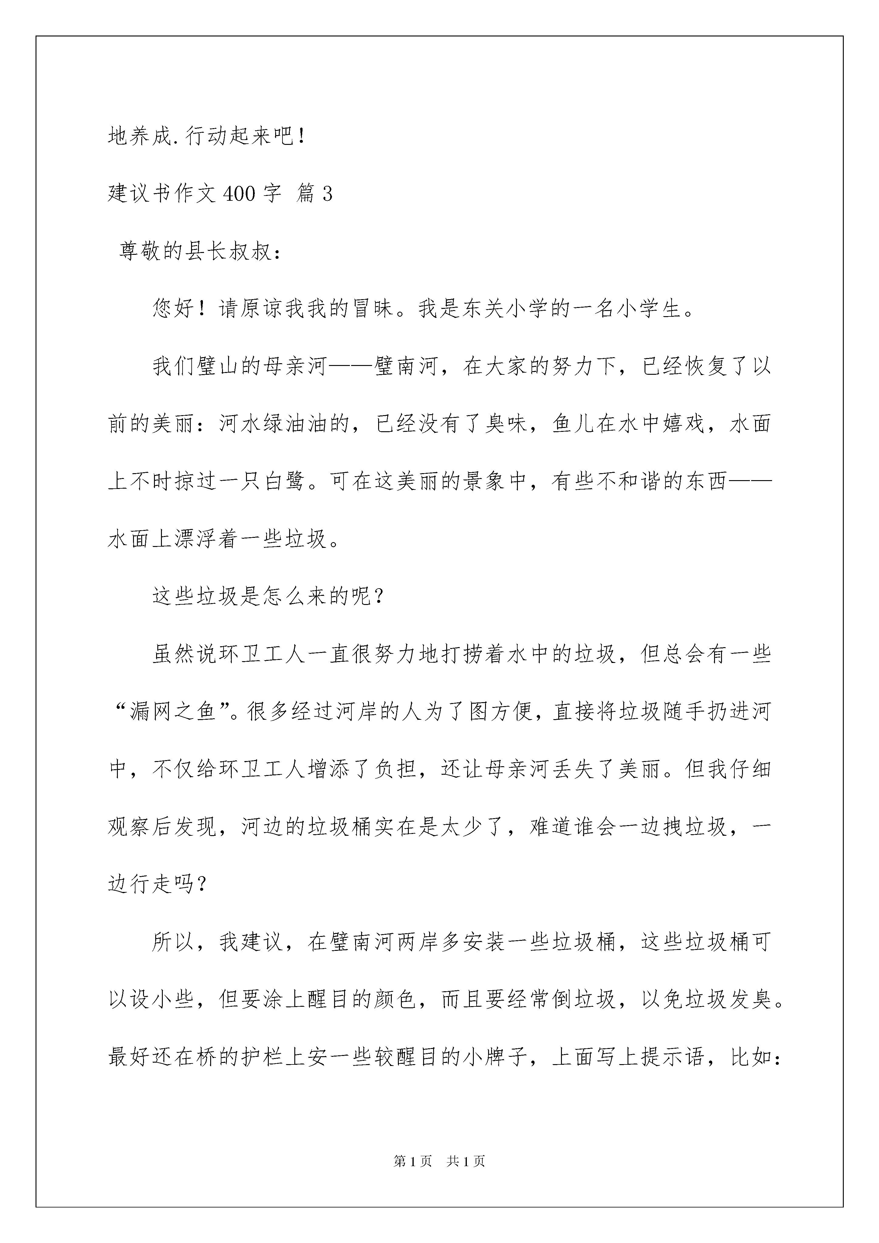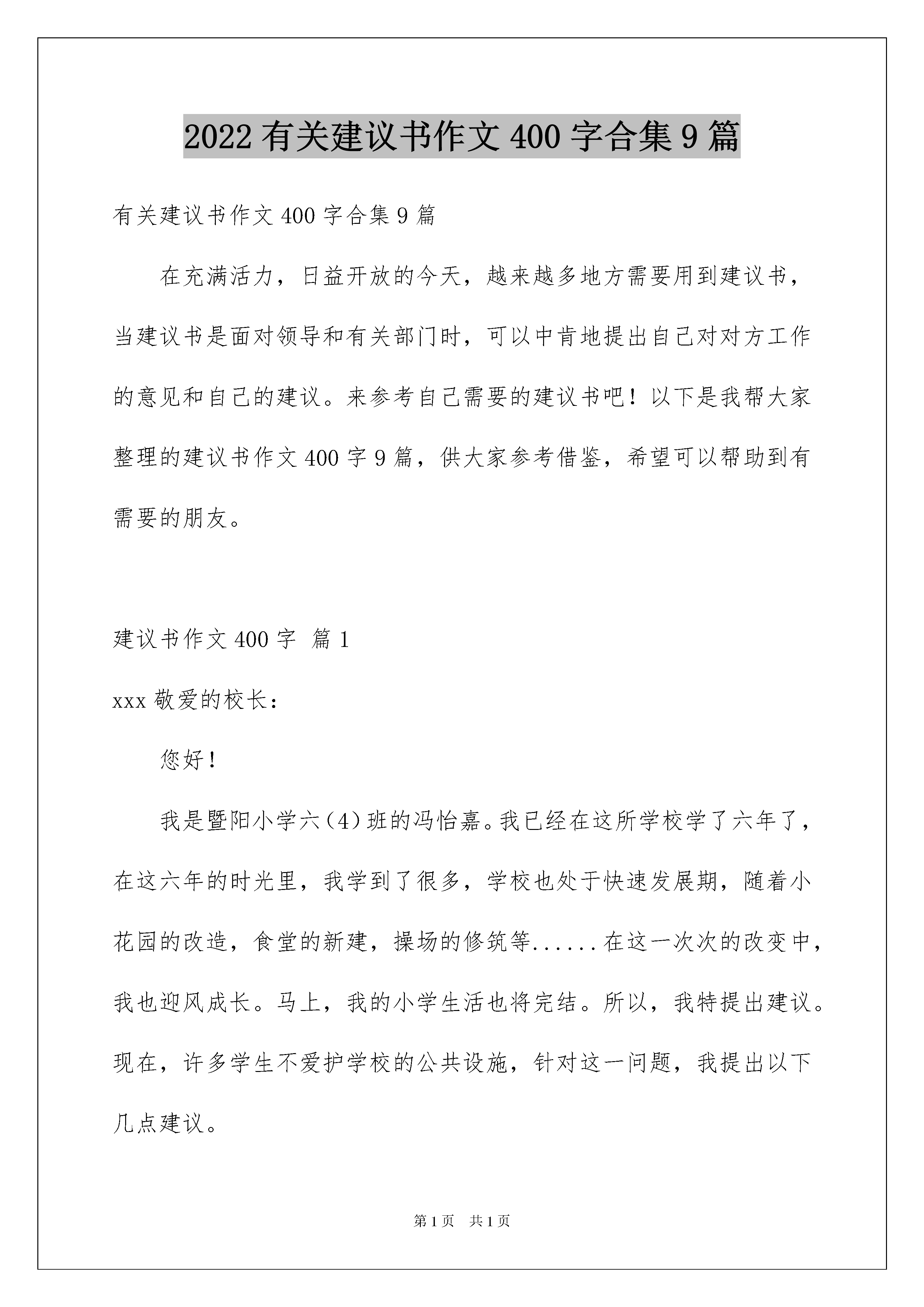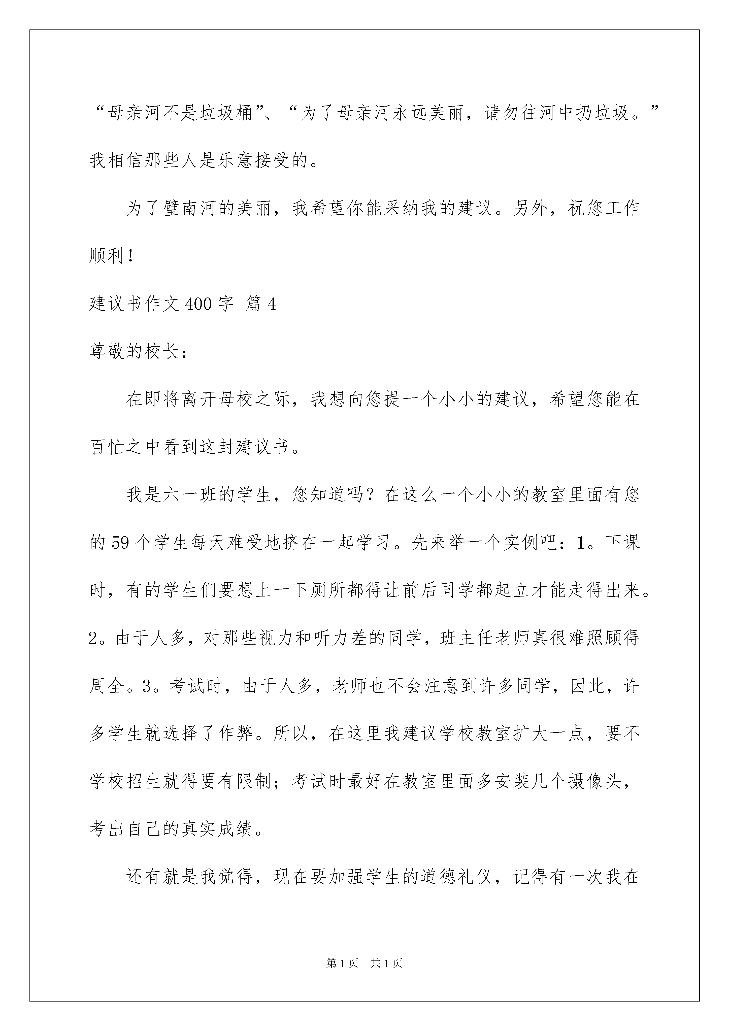 2022有关建议书作文400字合集9篇有关建议书作文400字合集9篇在充满活力,日益开放的今天,越来越多地方需要用到建议书,当建议书是面对领导和有关部门时,可以中肯地提出自己对对方工作的意见和自己的建议。来参考自己需要的建议书吧!以下是我帮大家整理的建议书作文400字9篇,供大家参考借鉴,希望可以帮助到有需要的朋友。建议书作文400字篇1xxx敬爱的校长:您好!我是暨阳小学六(4)班的冯怡嘉。我已经在这所学校学了六年了,在这六年的时光里,我学到了很多,学校也处于快速发展期,随着小花园的改造,食堂的新建,操场的修筑等......在这一次次的改变中,我也迎风成长。马上,我的小学生活也将完结。所以,我特提出建议。现在,许多学生不爱护学校的公共设施,针对这一问题,我提出以下几点建议。1、把学校的宣传窗利用起来,让同学们做关于爱护公共设施的小报,把它张贴在宣传窗上,呼吁同学们爱护学校公共设施。2、把周一的国旗下讲话利用起来,以“爱护学校公共设施”为主题,让同学们都有意识爱护学校公共设施。3、把班会利用起来。班会以“爱护学校公共设施”为主题,同学们进行讨论,并照讨论内容,做出有关的爱护方案。4、让学生们去山区体验一下贫困生的生活。看看他们是怎样生活的,学习用具是怎么爱护的,再反省一下自身的错误。5、运用以上方案。每个班级有专门检查员,每周学校统一检查一次。再由值周班级与大队长和大队辅导员评分,选出班级周冠军,再看保持情况,决出班级月冠军。如果持续保持,可获得年优秀班级称号。可把这一项纳入卫生检查方面。希望学校领导,听取建议。此致敬礼!建议人:xxXX年10月17日建议书作文400字篇2大家好!我是一名小学生,我和你们都渴望在一个美丽洁净的环境中生活·学习·玩耍.可是现实的环境,还有人们的环保意识都有很多不尽人意的地方.如:人们随意丢弃饮料瓶,雪糕袋;生活区不到指定的地点倾倒生活垃圾;饭店,快餐店的生活污水很心安理得得泼洒在马路上:菜市场也没有环保措施,常年散发着鱼腥虾臭味。我们生活在地球上,是地球的主人!我们有责任和义务保护地球的环境!因此在此,我向全体同学发出如下倡议:①不乱丢果皮纸屑及废弃物,"世界上本来没有垃圾,只有放错了地方的财富."回收废纸可以使我们的大片森林免遭砍伐,回收藏易拉罐等物品我们可以用来制作工艺品,装点我们的生活环境.建议在各班教室设立一个废纸回收箱,在生活区设立可利用物品回收箱。②在校园内不乱吐口香糖,不随地吐痰,主动清理地面和墙壁上的污垢。③不践蹋草坪,不摘花摇树。④主动捡拾别人丢在地上的垃圾.养成"文明清洁"的良好习惯,共同创建一个美丽的校园。美丽的环境需要我们共同营造,文明的习惯靠我们平时一点一滴地养成.行动起来吧!建议书作文400字篇3尊敬的县长叔叔:您好!请原谅我我的冒昧。我是东关小学的一名小学生。我们璧山的母亲河——璧南河,在大家的努力下,已经恢复了以前的美丽:河水绿油油的,已经没有了臭味,鱼儿在水中嬉戏,水面上不时掠过一只白鹭。可在这美丽的景象中,有些不和谐的东西——水面上漂浮着一些垃圾。这些垃圾是怎么来的呢?虽然说环卫工人一直很努力地打捞着水中的垃圾,但总会有一些“漏网之鱼”。很多经过河岸的人为了图方便,直接将垃圾随手扔进河中,不仅给环卫工人增添了负担,还让母亲河丢失了美丽。但我仔细观察后发现,河边的垃圾桶实在是太少了,难道谁会一边拽垃圾,一边行走吗?所以,我建议,在璧南河两岸多安装一些垃圾桶,这些垃圾桶可以设小些,但要涂上醒目的颜色,而且要经常倒垃圾,以免垃圾发臭。最好还在桥的护栏上安一些较醒目的小牌子,上面写上提示语,比如:“母亲河不是垃圾桶”、“为了母亲河永远美丽,请勿往河中扔垃圾。”我相信那些人是乐意接受的。为了璧南河的美丽,我希望你能采纳我的建议。另外,祝您工作顺利!建议书作文400字篇4尊敬的校长:在即将离开母校之际,我想向您提一个小小的建议,希望您能在百忙之中看到这封建议书。我是六一班的学生,您知道吗?在这么一个小小的教室里面有您的59个学生每天难受地挤在一起学习。先来举一个实例吧:1。下课时,有的学生们要想上一下厕所都得让前后同学都起立才能走得出来。2。由于人多,对那些视力和听力差的同学,班主任老师真很难照顾得周全。3。考试时,由于人多,老师也不会注意到许多同学,因此,许多学生就选择了作弊。所以,在这里我建议学校教室扩大一点,要不学校招生就得要有限制;考试时最好在教室里面多安装几个摄像头,考出自己的真实成绩。还有就是我觉得,现在要加强学生的道德礼仪,记得有一次我在地铁上,一位学生竟然和孕妇抢位置,为了一个位置,竟还推了她一下,虽