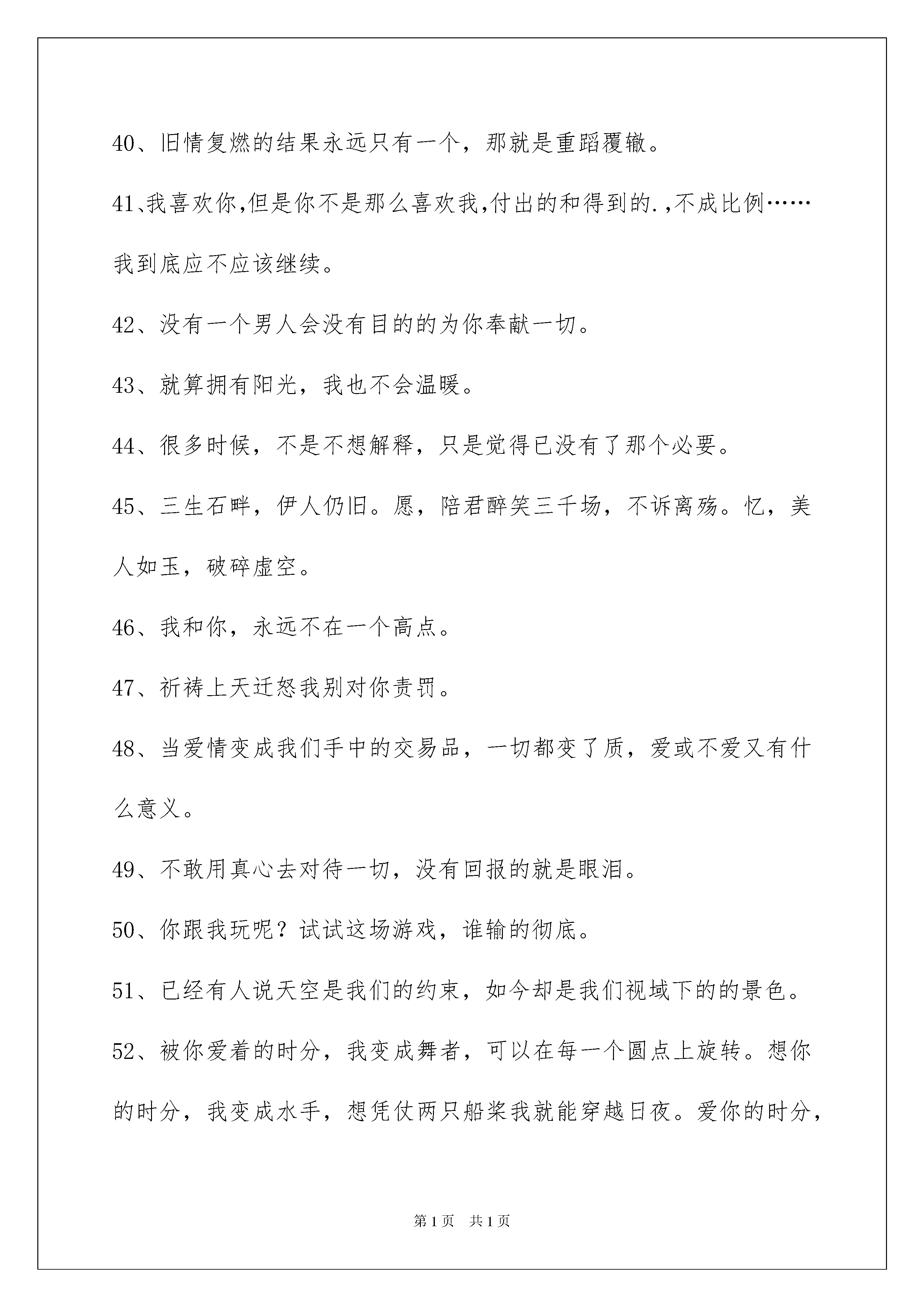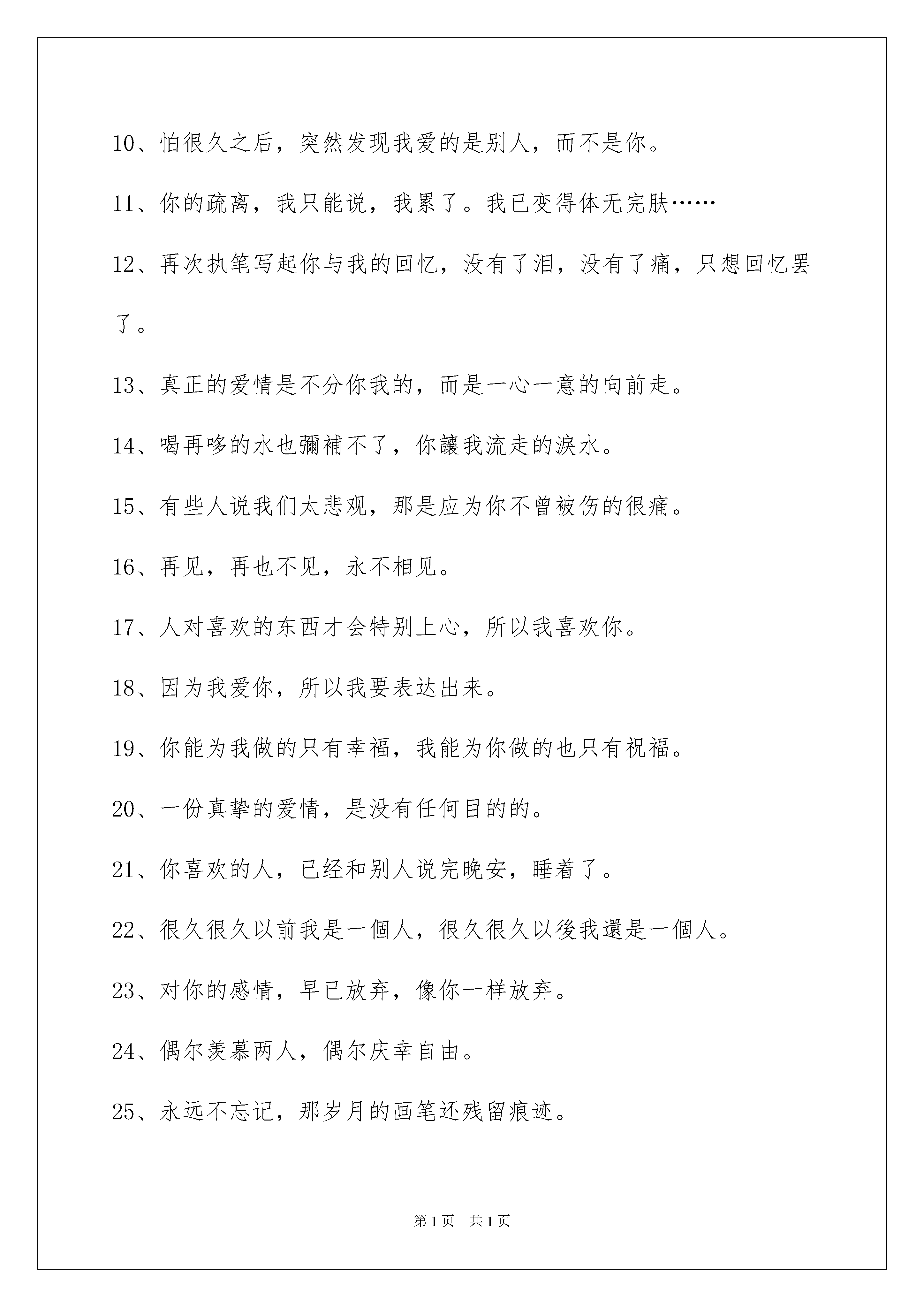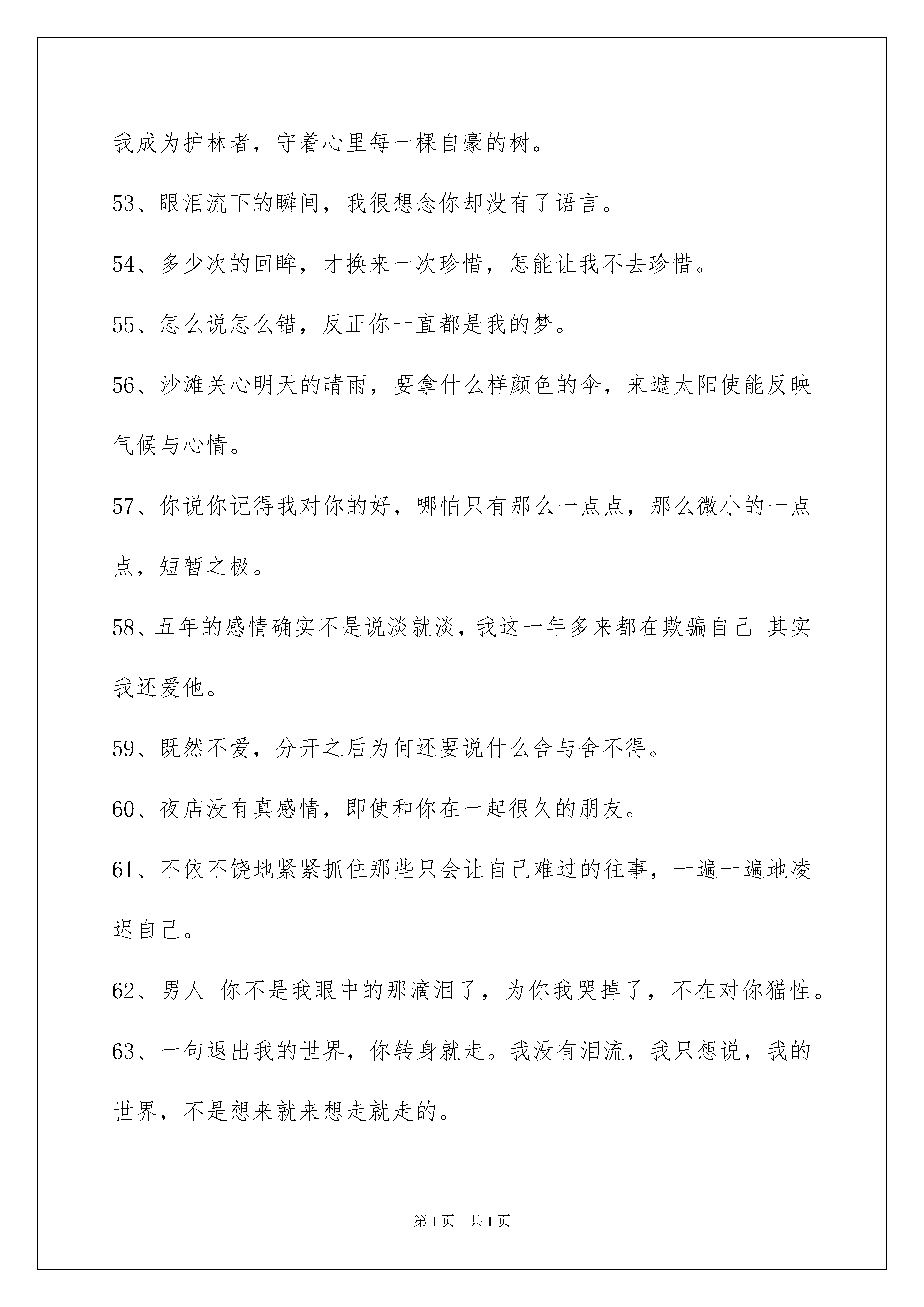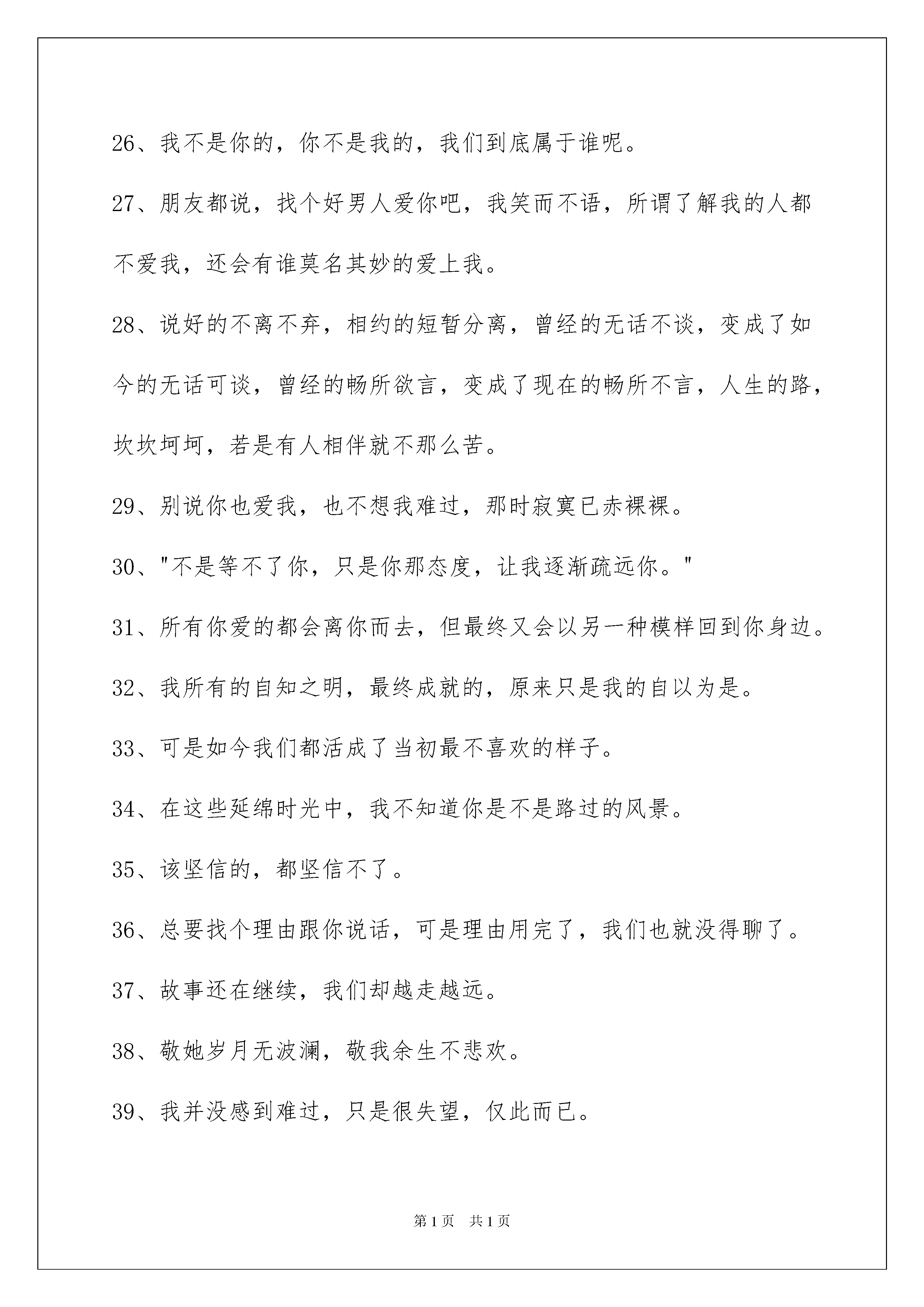 2022有关悲伤的签名集合68句有关悲伤的签名集合68句对我来说,最难忘的日子,是有你陪伴的时光。至少在属于我出场的时间里,曾拼尽全力爱过你。以下是我收集整理的悲伤的签名68句,欢迎阅读,希望大家能够喜欢。1、那些失去的秘密,它们静静的埋在记忆深处,双方却都保留着属于自己的美好。2、如果当初我勇敢些,你坚持些,我们的结局会不会不一样。3、这瞬间,只想安静的抚摸你的轮廓。4、一段不被接受的爱情,需要的不是伤心,而是时间,用来遗忘你所爱的。5、我也想好好的将爱把握,让你不再难过。6、曾经我以为,只要真心了就会得到幸福。7、虽然你已经名花有主,但是我也要移花接木。8、刻意逃避证明你还在乎。9、你熟悉了我爱的方式,在一个腻歪的时刻要分手。10、怕很久之后,突然发现我爱的是别人,而不是你。11、你的疏离,我只能说,我累了。我已变得体无完肤……12、再次执笔写起你与我的回忆,没有了泪,没有了痛,只想回忆罢了。13、真正的爱情是不分你我的,而是一心一意的向前走。14、喝再哆的水也彌補不了,你讓我流走的淚水。15、有些人说我们太悲观,那是应为你不曾被伤的很痛。16、再见,再也不见,永不相见。17、人对喜欢的东西才会特别上心,所以我喜欢你。18、因为我爱你,所以我要表达出来。19、你能为我做的只有幸福,我能为你做的也只有祝福。20、一份真挚的爱情,是没有任何目的的。21、你喜欢的人,已经和别人说完晚安,睡着了。22、很久很久以前我是一個人,很久很久以後我還是一個人。23、对你的感情,早已放弃,像你一样放弃。24、偶尔羡慕两人,偶尔庆幸自由。25、永远不忘记,那岁月的画笔还残留痕迹。26、我不是你的,你不是我的,我们到底属于谁呢。27、朋友都说,找个好男人爱你吧,我笑而不语,所谓了解我的人都不爱我,还会有谁莫名其妙的爱上我。28、说好的不离不弃,相约的短暂分离,曾经的无话不谈,变成了如今的无话可谈,曾经的畅所欲言,变成了现在的畅所不言,人生的路,坎坎坷坷,若是有人相伴就不那么苦。29、别说你也爱我,也不想我难过,那时寂寞已赤裸裸。30、"不是等不了你,只是你那态度,让我逐渐疏远你。"31、所有你爱的都会离你而去,但最终又会以另一种模样回到你身边。32、我所有的自知之明,最终成就的,原来只是我的自以为是。33、可是如今我们都活成了当初最不喜欢的样子。34、在这些延绵时光中,我不知道你是不是路过的风景。35、该坚信的,都坚信不了。36、总要找个理由跟你说话,可是理由用完了,我们也就没得聊了。37、故事还在继续,我们却越走越远。38、敬她岁月无波澜,敬我余生不悲欢。39、我并没感到难过,只是很失望,仅此而已。40、旧情复燃的结果永远只有一个,那就是重蹈覆辙。41、我喜欢你,但是你不是那么喜欢我,付出的和得到的.,不成比例……我到底应不应该继续。42、没有一个男人会没有目的的为你奉献一切。43、就算拥有阳光,我也不会温暖。44、很多时候,不是不想解释,只是觉得已没有了那个必要。45、三生石畔,伊人仍旧。愿,陪君醉笑三千场,不诉离殇。忆,美人如玉,破碎虚空。46、我和你,永远不在一个高点。47、祈祷上天迁怒我别对你责罚。48、当爱情变成我们手中的交易品,一切都变了质,爱或不爱又有什么意义。49、不敢用真心去对待一切,没有回报的就是眼泪。50、你跟我玩呢?试试这场游戏,谁输的彻底。51、已经有人说天空是我们的约束,如今却是我们视域下的的景色。52、被你爱着的时分,我变成舞者,可以在每一个圆点上旋转。想你的时分,我变成水手,想凭仗两只船桨我就能穿越日夜。爱你的时分,我成为护林者,守着心里每一棵自豪的树。53、眼泪流下的瞬间,我很想念你却没有了语言。54、多少次的回眸,才换来一次珍惜,怎能让我不去珍惜。55、怎么说怎么错,反正你一直都是我的梦。56、沙滩关心明天的晴雨,要拿什么样颜色的伞,来遮太阳使能反映气候与心情。57、你说你记得我对你的好,哪怕只有那么一点点,那么微小的一点点,短暂之极。58、五年的感情确实不是说淡就淡,我这一年多来都在欺骗自己其实我还爱他。59、既然不爱,分开之后为何还要说什么舍与舍不得。60、夜店没有真感情,即使和你在一起很久的朋友。61、不依不饶地紧紧抓住那些只会让自己难过的往事,一遍一遍地凌迟自己。62、男人你不是我眼中的那滴泪了,为你我哭掉了,不在对你猫性。63、一句退出我的世界,你转身就走。我没有泪流,我只想说,我的世界,不是想来就来想走就走的。64、如果你陪我走下去,那么我有什么借口放棄。65、我是你的谁,从没人告诉我,我还躲在哪个角落。66、临近的七夕,对我而言没有任何意