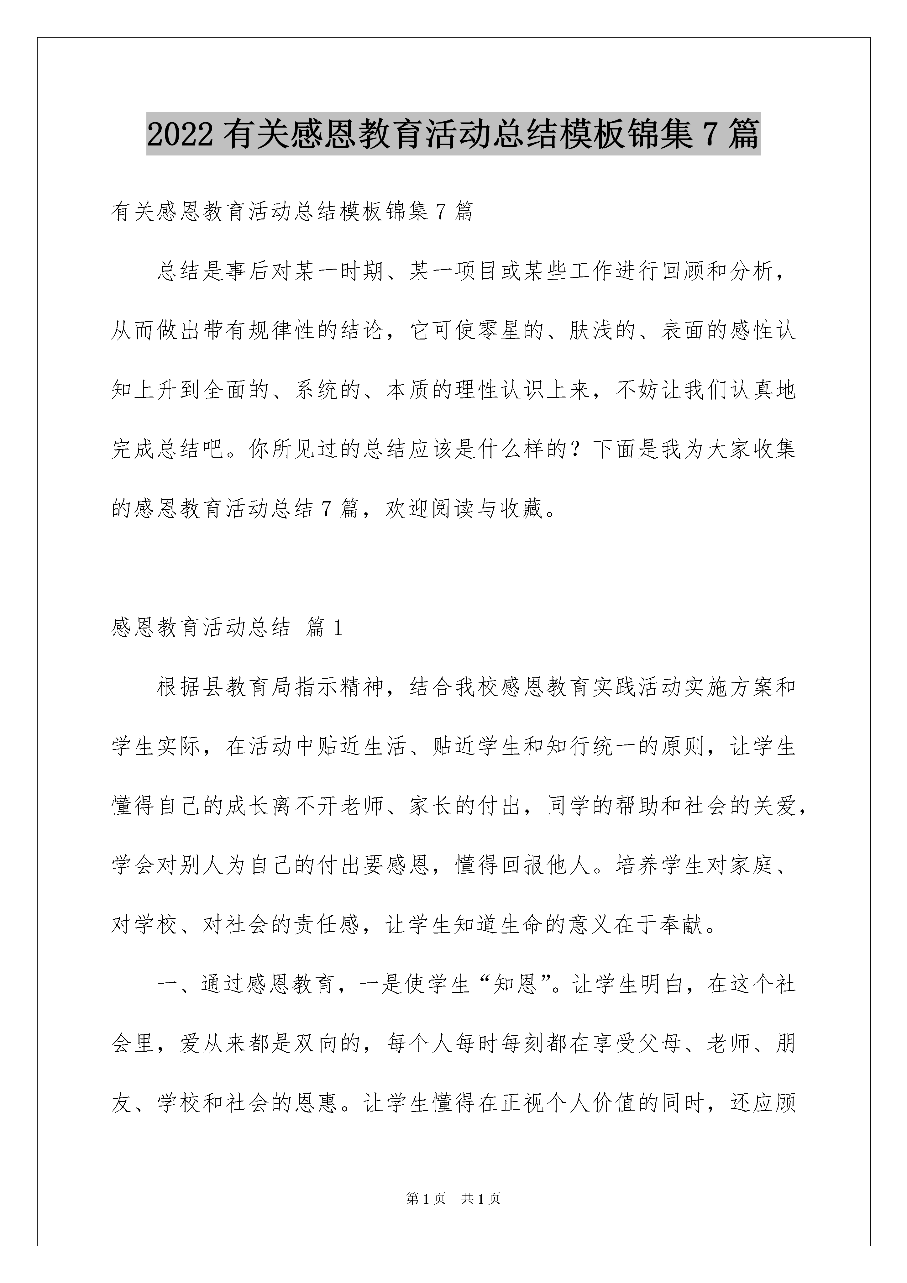 2022有关感恩教育活动总结模板锦集7篇有关感恩教育活动总结模板锦集7篇总结是事后对某一时期、某一项目或某些工作进行回顾和分析,从而做出带有规律性的结论,它可使零星的、肤浅的、表面的感性认知上升到全面的、系统的、本质的理性认识上来,不妨让我们认真地完成总结吧。你所见过的总结应该是什么样的?下面是我为大家收集的感恩教育活动总结7篇,欢迎阅读与收藏。感恩教育活动总结篇1根据县教育局指示精神,结合我校感恩教育实践活动实施方案和学生实际,在活动中贴近生活、贴近学生和知行统一的原则,让学生懂得自己的成长离不开老师、家长的付出,同学的帮助和社会的关爱,学会对别人为自己的付出要感恩,懂得回报他人。培养学生对家庭、对学校、对社会的责任感,让学生知道生命的意义在于奉献。一、通过感恩教育,一是使学生“知恩”。让学生明白,在这个社会里,爱从来都是双向的,每个人每时每刻都在享受父母、老师、朋友、学校和社会的恩惠。让学生懂得在正视个人价值的同时,还应顾及他人的利益。培养学生与人为善、乐于助人的良好品德和健全人格;二是使学生学会“感恩”。要让学生明白,胸怀感恩之心是每个人都应该具有的基本道德准则,是做人最起码的修养;三是使学生善于“施恩”。让学生拥有热情、宽容的心态和不图名利的崇高精神,真心诚意去帮助身边需要帮助的人。二、感恩的四个主题是:(1)感激父母养育恩;(2)感谢老师培育情;(3)感恩社会关爱情;(4)感激同学帮助情。三、学校非常重视这次感恩教育活动,并按着方案要求,搞了以下感恩教育活动:(一)是举办一次以“感恩”为专题的班会。(二)是算一笔感恩帐。各班要充分发挥师生的创造性,精心策划,利用主题班会,让学生在老师和同学面前讲出对父母、师长、亲友的爱。通过算时间帐、金钱帐、感情帐,引导学生算一算自己在成长过程中父母的辛勤养育之恩、老师的细心教导之情、亲友的无私帮助之谊。(三)是办一期以“感恩”为主题的手抄报。让学生联系学习、生活实际,表达对生活的热爱,对亲情的眷恋。(四)是做一次感恩作业。结合本班学生特长精心设计“感恩作业”。如:每周回家帮家长洗一次碗、帮父母做一次清洁卫生、为长辈倒一杯水等。四、通过这次活动发现,好人好事多了;拾金不昧的多了;学生跟老师、家长的关系更加密切了;在学校的表现更加突出了;在家更知道疼爱父母了;自理的能力更强了;学习更加努力了;报效祖国的心更迫切了。五、今后我校立足都要以“感恩”为主题对学生进行感谢老师,感谢父母,感谢所有帮助过自己的人的教育,并让他们把受教育后的体会,发表在小报上、黑板上或用我校校园广播进行播放。学校经常利用班队会、国旗下讲话、各种节日等主题阵地进行感恩教育。结合各种捐款活动,开展意义深远的感恩教育活动,让学生知道扶危济困历来是我们中华民族的优良传统,让学生懂得从小就要继承和发扬这些美德,特别是当别人有困难时,要勇于伸出双手去帮助,让点滴爱心汇聚成爱的洪流。最终把感恩教育活动由学校、家庭延伸到劳动人民和大自然之中去。感恩教育活动总结篇2为了让孩子们学会感恩,体验做父母的辛苦,并养成认真负责的好习惯,XX镇中心幼儿园在20xx年11月23日感恩节当天开展了以“爱”为主线的“护蛋悟恩情,感恩在心中”护蛋大行动。活动开始前各班老师通过QQ群、微信群等多种方式,向家长宣传“护蛋行动”的内容、要求,再用各种辅助材料给“蛋宝宝”做好保护措施。各班老师通过视频、图片等方式,帮助孩子们了解感恩节的由来和父母的辛苦。活动中,孩子们从早上入园到下午离园都随身带着“蛋宝宝”,并探索多种办法保护他,努力完成“护蛋”任务,让幼儿感悟亲情的可贵,体会保护和善待一个生命的不易。蛋破即为护蛋失败,有的孩子因为护蛋失败留下伤心的泪水。下午离园时,孩子们自豪地给家长展示自己保护了一天的蛋宝宝,并由衷的向家长说“爸爸妈妈辛苦了!”“感恩节快乐!”。通过本次感恩节护蛋行动,孩子们用自己保护蛋宝宝的亲身经历,感悟父母照顾儿女的不易,帮助他们在今后的生活中慢慢学会爱护生命,珍视亲情,做力所能及的事情报答父母和帮助自己周围的人。感恩教育活动总结篇3为培养学生良好的思想品德,让学生学会感恩,红瑞燕宝小学以感恩教育为切入口,开展了“感恩教育”系列活动,收到了较好成效,现总结如下:一、广泛动员宣传,明确目的和意义开学初,学校通过教师会议、学生集会、升旗仪式,向广大师生宣传感恩专题,引导教师学生明白为何感恩,如何感恩,全面加强学校思想道德建设,增强感恩意识、形成感恩之风、营造感恩氛围!二、高度重视、加强组织领导为了确保我校感恩教育系列活动有力、有序、有效地开展,学校成立了以校长白建武为组长,李会忠、张