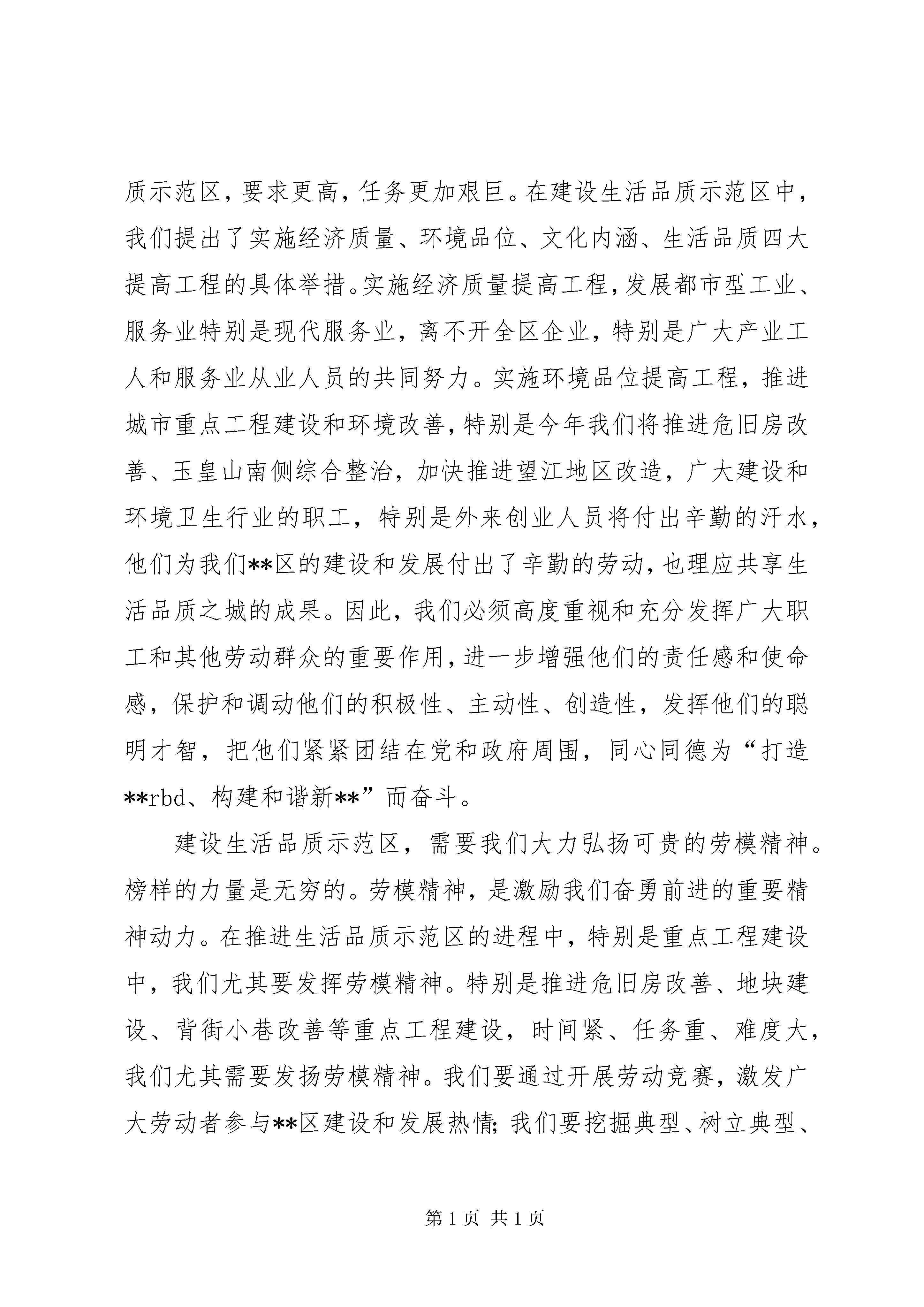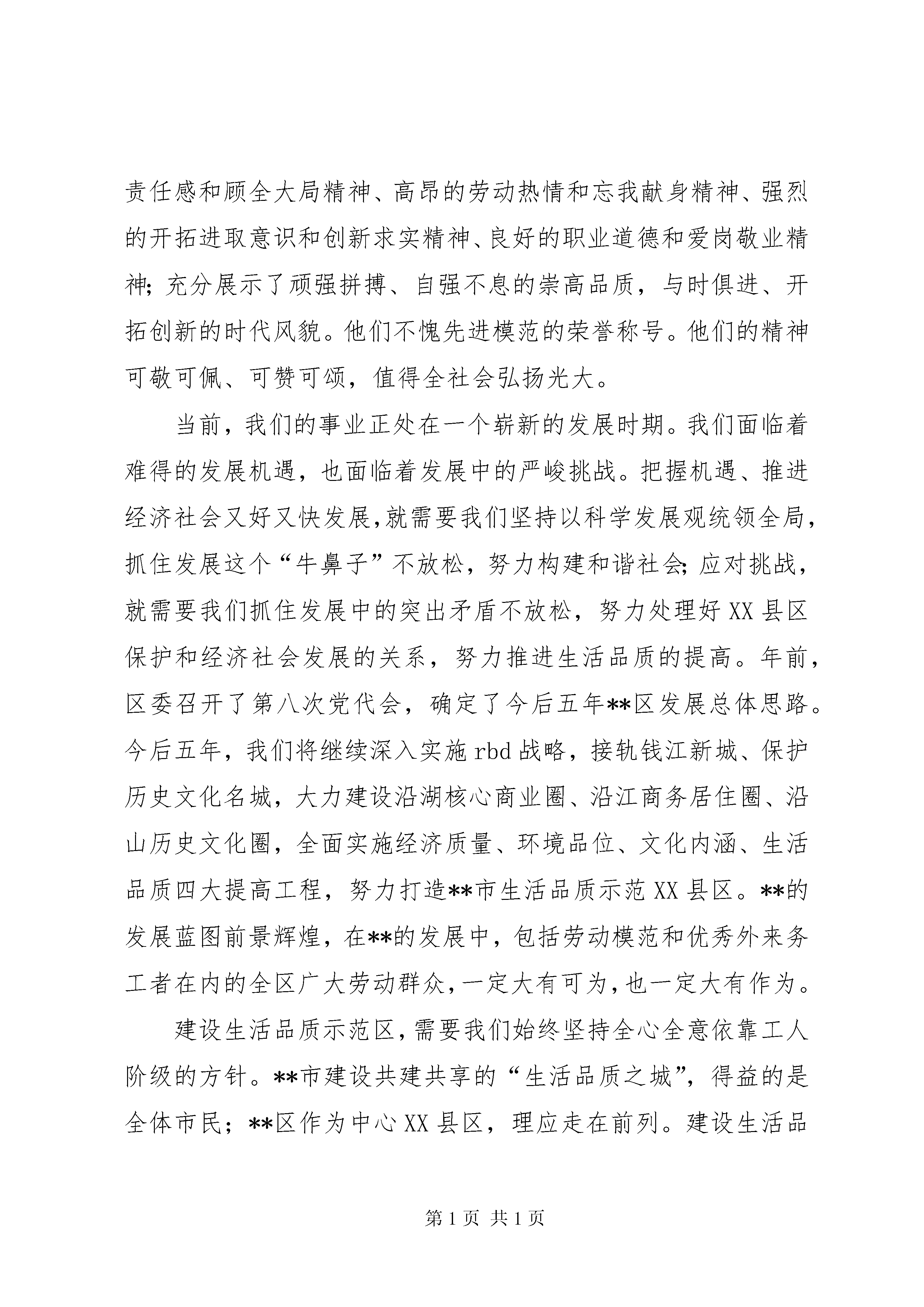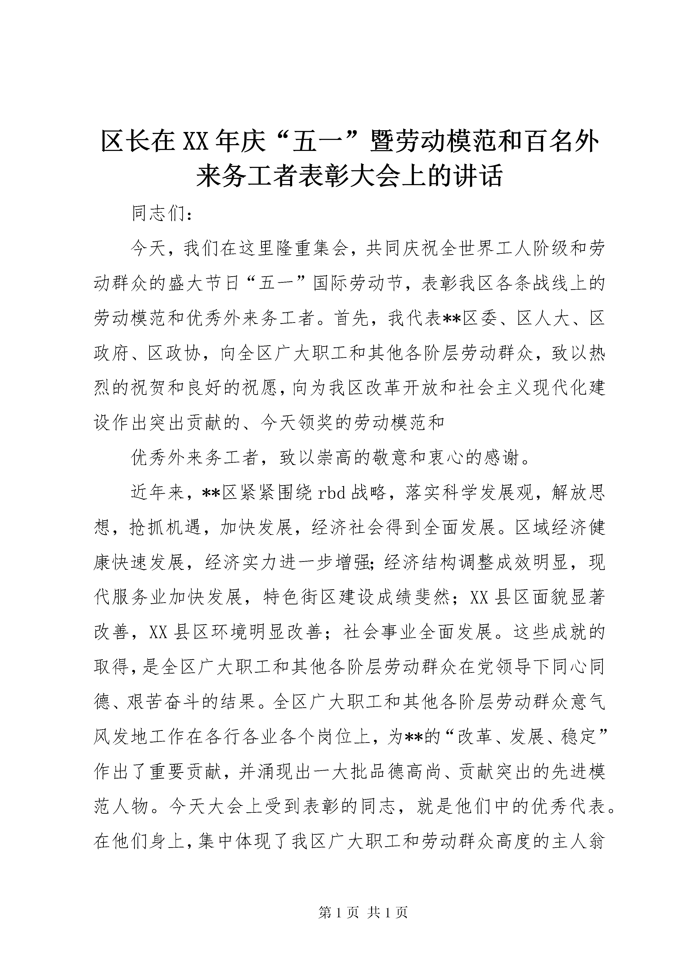 区长在XX年庆“五一”暨劳动模范和百名外来务工者表彰大会上的讲话同志们:今天,我们在这里隆重集会,共同庆祝全世界工人阶级和劳动群众的盛大节日“五一”国际劳动节,表彰我区各条战线上的劳动模范和优秀外来务工者。首先,我代表**区委、区人大、区政府、区政协,向全区广大职工和其他各阶层劳动群众,致以热烈的祝贺和良好的祝愿,向为我区改革开放和社会主义现代化建设作出突出贡献的、今天领奖的劳动模范和优秀外来务工者,致以崇高的敬意和衷心的感谢。近年来,**区紧紧围绕rbd战略,落实科学发展观,解放思想,抢抓机遇,加快发展,经济社会得到全面发展。区域经济健康快速发展,经济实力进一步增强;经济结构调整成效明显,现代服务业加快发展,特色街区建设成绩斐然;XX县区面貌显著改善,XX县区环境明显改善;社会事业全面发展。这些成就的取得,是全区广大职工和其他各阶层劳动群众在党领导下同心同德、艰苦奋斗的结果。全区广大职工和其他各阶层劳动群众意气风发地工作在各行各业各个岗位上,为**的“改革、发展、稳定”作出了重要贡献,并涌现出一大批品德高尚、贡献突出的先进模范人物。今天大会上受到表彰的同志,就是他们中的优秀代表。在他们身上,集中体现了我区广大职工和劳动群众高度的主人翁责任感和顾全大局精神、高昂的劳动热情和忘我献身精神、强烈的开拓进取意识和创新求实精神、良好的职业道德和爱岗敬业精神;充分展示了顽强拼搏、自强不息的崇高品质,与时俱进、开拓创新的时代风貌。他们不愧先进模范的荣誉称号。他们的精神可敬可佩、可赞可颂,值得全社会弘扬光大。当前,我们的事业正处在一个崭新的发展时期。我们面临着难得的发展机遇,也面临着发展中的严峻挑战。把握机遇、推进经济社会又好又快发展,就需要我们坚持以科学发展观统领全局,抓住发展这个“牛鼻子”不放松,努力构建和谐社会;应对挑战,就需要我们抓住发展中的突出矛盾不放松,努力处理好XX县区保护和经济社会发展的关系,努力推进生活品质的提高。年前,区委召开了第八次党代会,确定了今后五年**区发展总体思路。今后五年,我们将继续深入实施rbd战略,接轨钱江新城、保护历史文化名城,大力建设沿湖核心商业圈、沿江商务居住圈、沿山历史文化圈,全面实施经济质量、环境品位、文化内涵、生活品质四大提高工程,努力打造**市生活品质示范XX县区。**的发展蓝图前景辉煌,在**的发展中,包括劳动模范和优秀外来务工者在内的全区广大劳动群众,一定大有可为,也一定大有作为。建设生活品质示范区,需要我们始终坚持全心全意依靠工人阶级的方针。**市建设共建共享的“生活品质之城”,得益的是全体市民;**区作为中心XX县区,理应走在前列。建设生活品质示范区,要求更高,任务更加艰巨。在建设生活品质示范区中,我们提出了实施经济质量、环境品位、文化内涵、生活品质四大提高工程的具体举措。实施经济质量提高工程,发展都市型工业、服务业特别是现代服务业,离不开全区企业,特别是广大产业工人和服务业从业人员的共同努力。实施环境品位提高工程,推进城市重点工程建设和环境改善,特别是今年我们将推进危旧房改善、玉皇山南侧综合整治,加快推进望江地区改造,广大建设和环境卫生行业的职工,特别是外来创业人员将付出辛勤的汗水,他们为我们**区的建设和发展付出了辛勤的劳动,也理应共享生活品质之城的成果。因此,我们必须高度重视和充分发挥广大职工和其他劳动群众的重要作用,进一步增强他们的责任感和使命感,保护和调动他们的积极性、主动性、创造性,发挥他们的聪明才智,把他们紧紧团结在党和政府周围,同心同德为“打造**rbd、构建和谐新**”而奋斗。建设生活品质示范区,需要我们大力弘扬可贵的劳模精神。榜样的力量是无穷的。劳模精神,是激励我们奋勇前进的重要精神动力。在推进生活品质示范区的进程中,特别是重点工程建设中,我们尤其要发挥劳模精神。特别是推进危旧房改善、地块建设、背街小巷改善等重点工程建设,时间紧、任务重、难度大,我们尤其需要发扬劳模精神。我们要通过开展劳动竞赛,激发广大劳动者参与**区建设和发展热情;我们要挖掘典型、树立典型、宣传典型,用榜样的示范带动,推进经济社会,特别是推进全区重点工程建设的顺利实施。因此,我们要在全社会广泛宣传劳模先进的感人事迹、优秀品质、高尚精神,给他们以应有的光荣,推动全社会进一步尊重、关心、学习劳模先进,使劳模精神不断发扬光大。我们要以劳模先进为榜样,学习他们脚踏实地、埋头苦干的优良作风,坚定信心、振奋精神,立足本职、扎实工作,信心百倍地投身