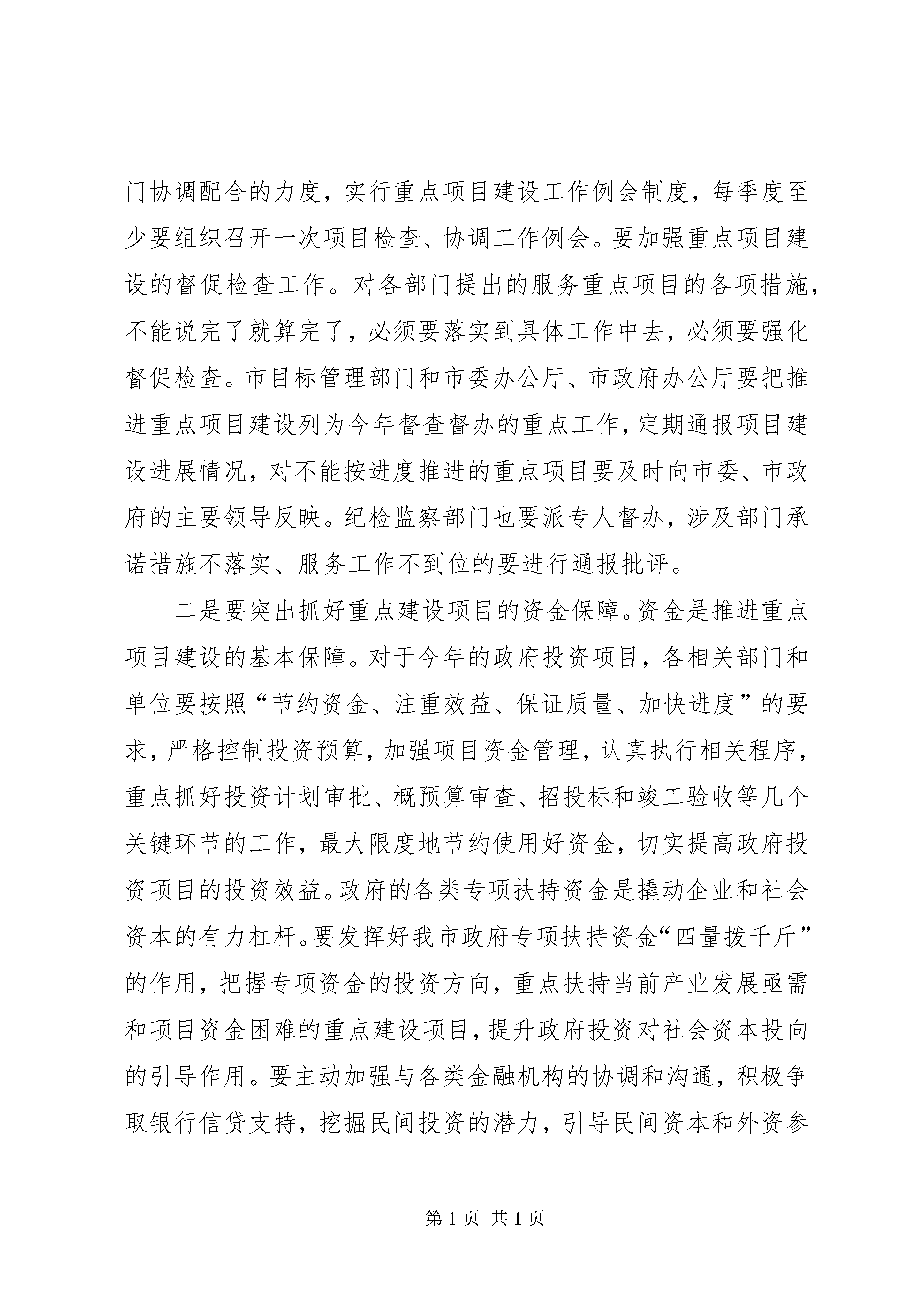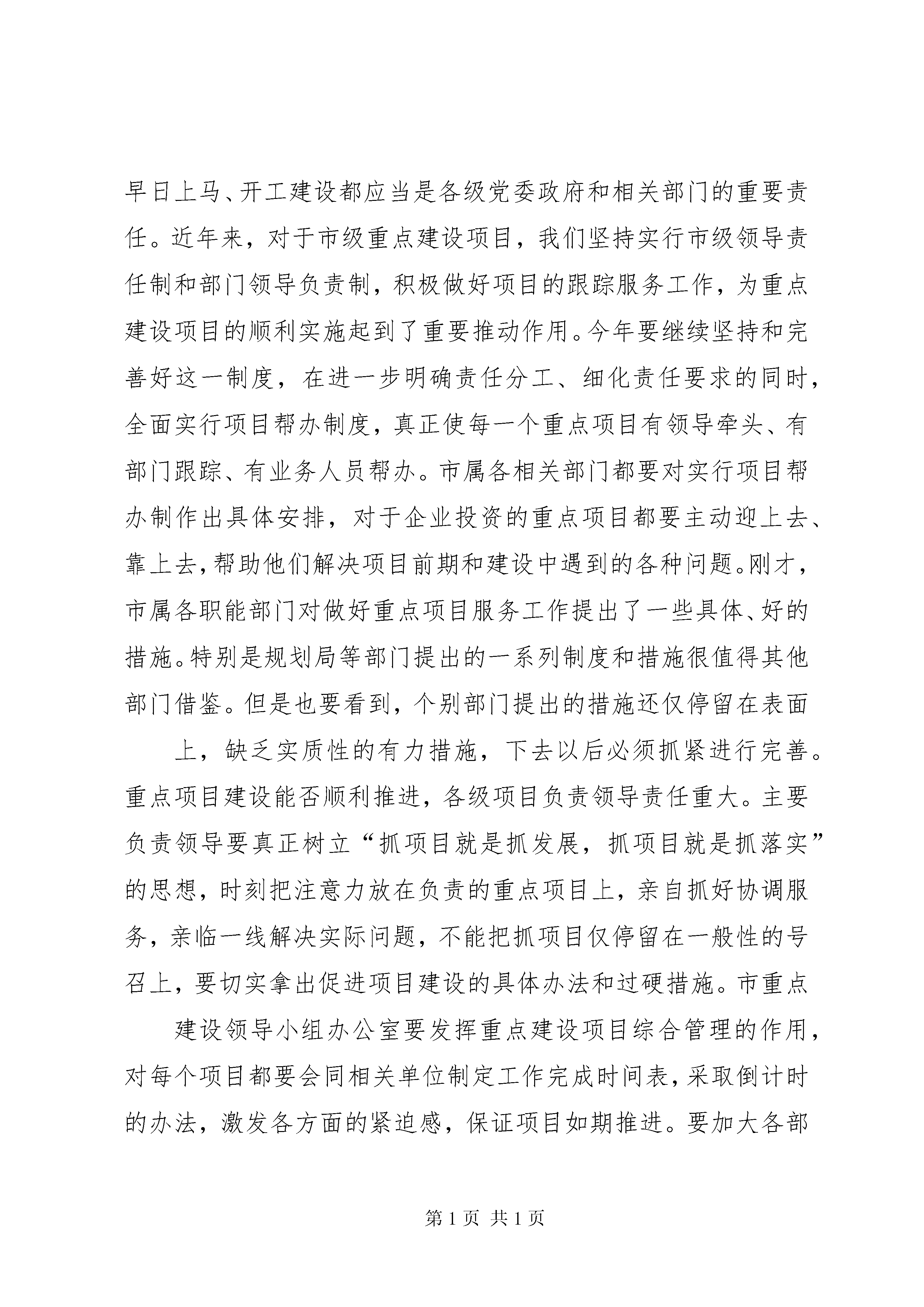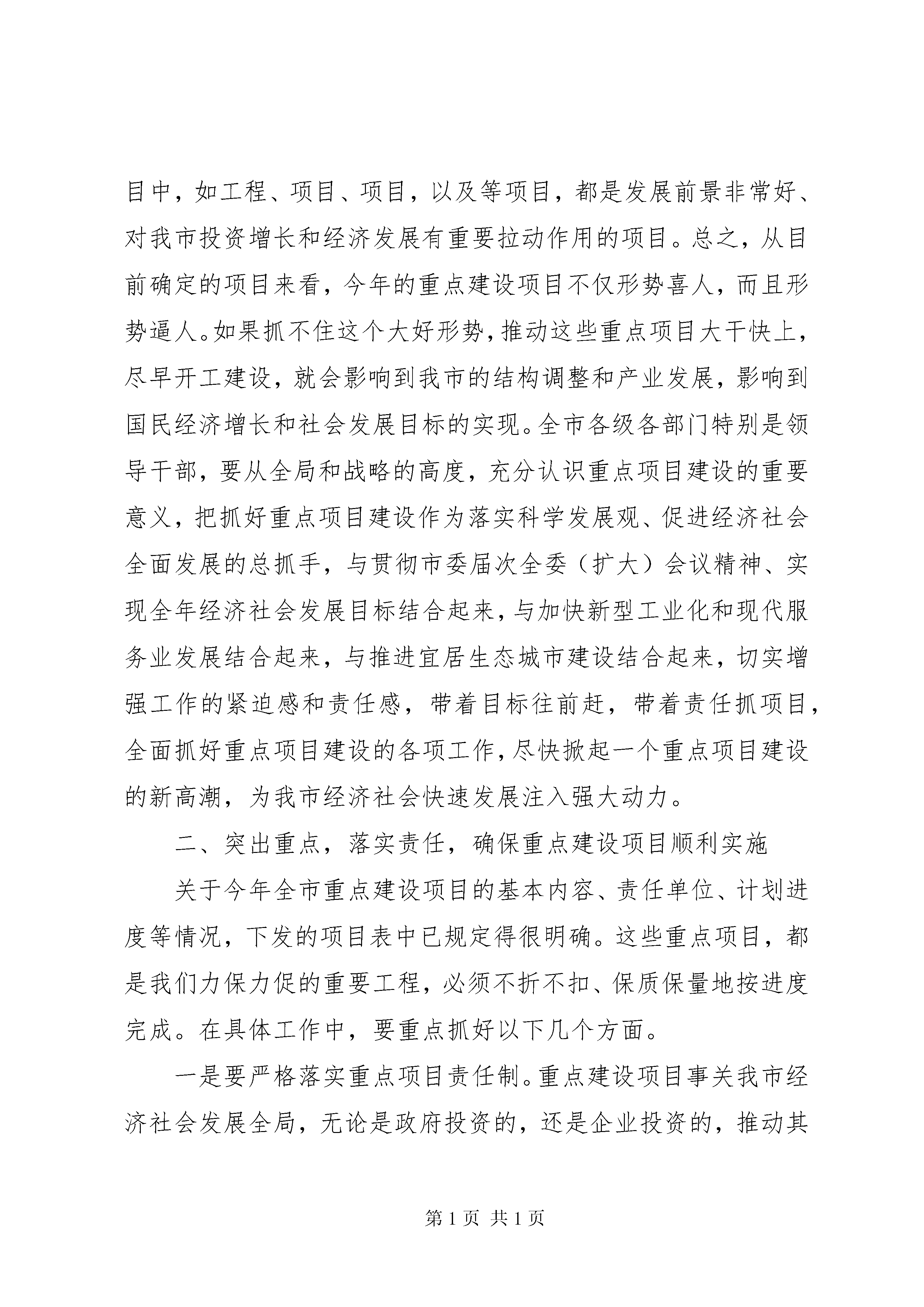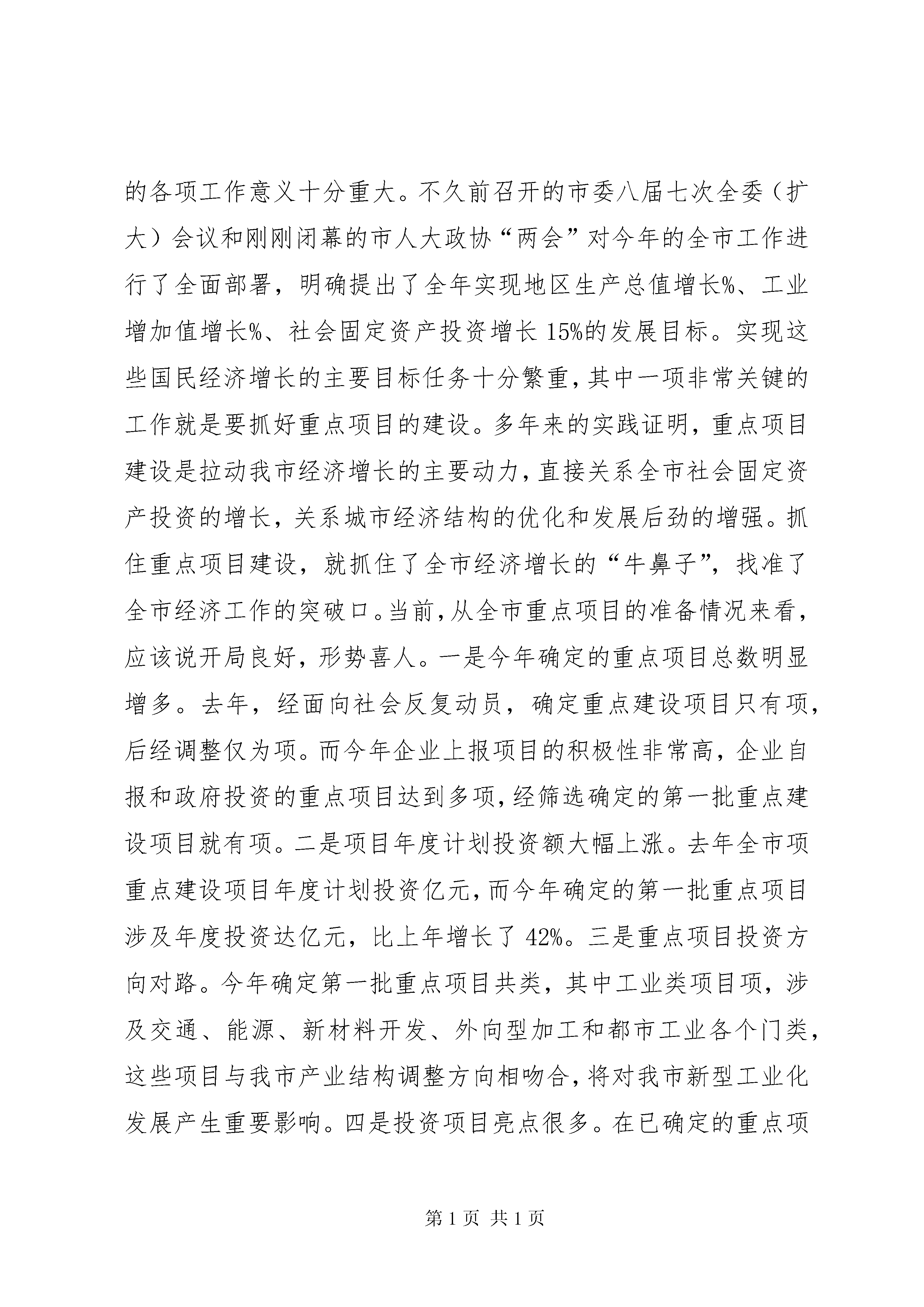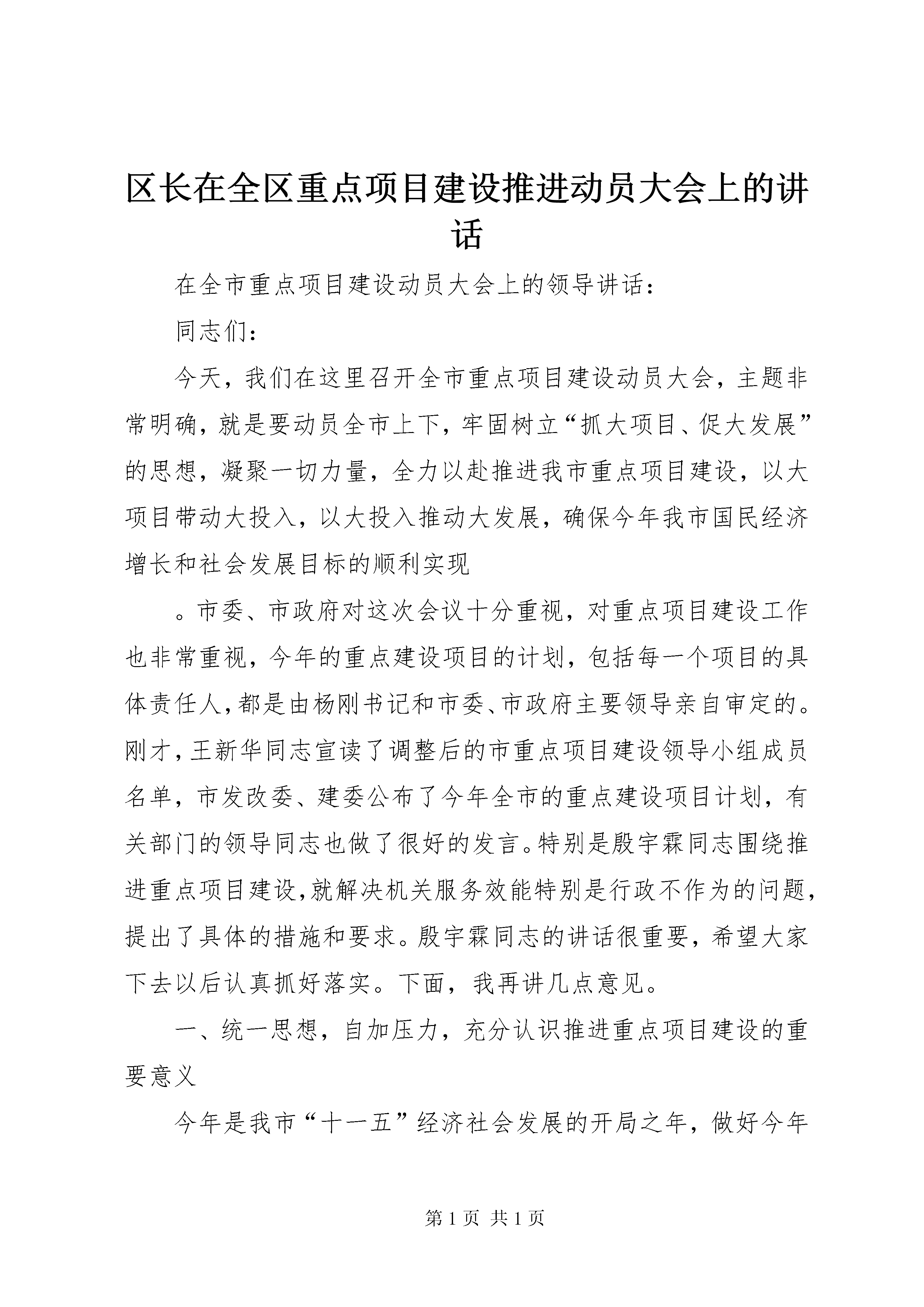 区长在全区重点项目建设推进动员大会上的讲话在全市重点项目建设动员大会上的领导讲话:同志们:今天,我们在这里召开全市重点项目建设动员大会,主题非常明确,就是要动员全市上下,牢固树立“抓大项目、促大发展”的思想,凝聚一切力量,全力以赴推进我市重点项目建设,以大项目带动大投入,以大投入推动大发展,确保今年我市国民经济增长和社会发展目标的顺利实现。市委、市政府对这次会议十分重视,对重点项目建设工作也非常重视,今年的重点建设项目的计划,包括每一个项目的具体责任人,都是由杨刚书记和市委、市政府主要领导亲自审定的。刚才,王新华同志宣读了调整后的市重点项目建设领导小组成员名单,市发改委、建委公布了今年全市的重点建设项目计划,有关部门的领导同志也做了很好的发言。特别是殷宇霖同志围绕推进重点项目建设,就解决机关服务效能特别是行政不作为的问题,提出了具体的措施和要求。殷宇霖同志的讲话很重要,希望大家下去以后认真抓好落实。下面,我再讲几点意见。一、统一思想,自加压力,充分认识推进重点项目建设的重要意义今年是我市“十一五”经济社会发展的开局之年,做好今年的各项工作意义十分重大。不久前召开的市委八届七次全委(扩大)会议和刚刚闭幕的市人大政协“两会”对今年的全市工作进行了全面部署,明确提出了全年实现地区生产总值增长%、工业增加值增长%、社会固定资产投资增长15%的发展目标。实现这些国民经济增长的主要目标任务十分繁重,其中一项非常关键的工作就是要抓好重点项目的建设。多年来的实践证明,重点项目建设是拉动我市经济增长的主要动力,直接关系全市社会固定资产投资的增长,关系城市经济结构的优化和发展后劲的增强。抓住重点项目建设,就抓住了全市经济增长的“牛鼻子”,找准了全市经济工作的突破口。当前,从全市重点项目的准备情况来看,应该说开局良好,形势喜人。一是今年确定的重点项目总数明显增多。去年,经面向社会反复动员,确定重点建设项目只有项,后经调整仅为项。而今年企业上报项目的积极性非常高,企业自报和政府投资的重点项目达到多项,经筛选确定的第一批重点建设项目就有项。二是项目年度计划投资额大幅上涨。去年全市项重点建设项目年度计划投资亿元,而今年确定的第一批重点项目涉及年度投资达亿元,比上年增长了42%。三是重点项目投资方向对路。今年确定第一批重点项目共类,其中工业类项目项,涉及交通、能源、新材料开发、外向型加工和都市工业各个门类,这些项目与我市产业结构调整方向相吻合,将对我市新型工业化发展产生重要影响。四是投资项目亮点很多。在已确定的重点项目中,如工程、项目、项目,以及等项目,都是发展前景非常好、对我市投资增长和经济发展有重要拉动作用的项目。总之,从目前确定的项目来看,今年的重点建设项目不仅形势喜人,而且形势逼人。如果抓不住这个大好形势,推动这些重点项目大干快上,尽早开工建设,就会影响到我市的结构调整和产业发展,影响到国民经济增长和社会发展目标的实现。全市各级各部门特别是领导干部,要从全局和战略的高度,充分认识重点项目建设的重要意义,把抓好重点项目建设作为落实科学发展观、促进经济社会全面发展的总抓手,与贯彻市委届次全委(扩大)会议精神、实现全年经济社会发展目标结合起来,与加快新型工业化和现代服务业发展结合起来,与推进宜居生态城市建设结合起来,切实增强工作的紧迫感和责任感,带着目标往前赶,带着责任抓项目,全面抓好重点项目建设的各项工作,尽快掀起一个重点项目建设的新高潮,为我市经济社会快速发展注入强大动力。二、突出重点,落实责任,确保重点建设项目顺利实施关于今年全市重点建设项目的基本内容、责任单位、计划进度等情况,下发的项目表中已规定得很明确。这些重点项目,都是我们力保力促的重要工程,必须不折不扣、保质保量地按进度完成。在具体工作中,要重点抓好以下几个方面。一是要严格落实重点项目责任制。重点建设项目事关我市经济社会发展全局,无论是政府投资的,还是企业投资的,推动其早日上马、开工建设都应当是各级党委政府和相关部门的重要责任。近年来,对于市级重点建设项目,我们坚持实行市级领导责任制和部门领导负责制,积极做好项目的跟踪服务工作,为重点建设项目的顺利实施起到了重要推动作用。今年要继续坚持和完善好这一制度,在进一步明确责任分工、细化责任要求的同时,全面实行项目帮办制度,真正使每一个重点项目有领导牵头、有部门跟踪、有业务人员帮办。市属各相关部门都要对实行项目帮办制作出具体安排,对于企业投资的重点项目都要主动迎上去、靠上去,帮助他们解决项目前期和建设中遇到的各种问题。刚才,市属各职能部门对做好重点项目服务工作提出了一些具体、好的措施。特别是规划局等部门提出的一系列制度和措施很值得其他部门借鉴。但是也要看到,个别部门提出的措施还仅停留在表面上,缺乏实质性的有力措施,下去以后