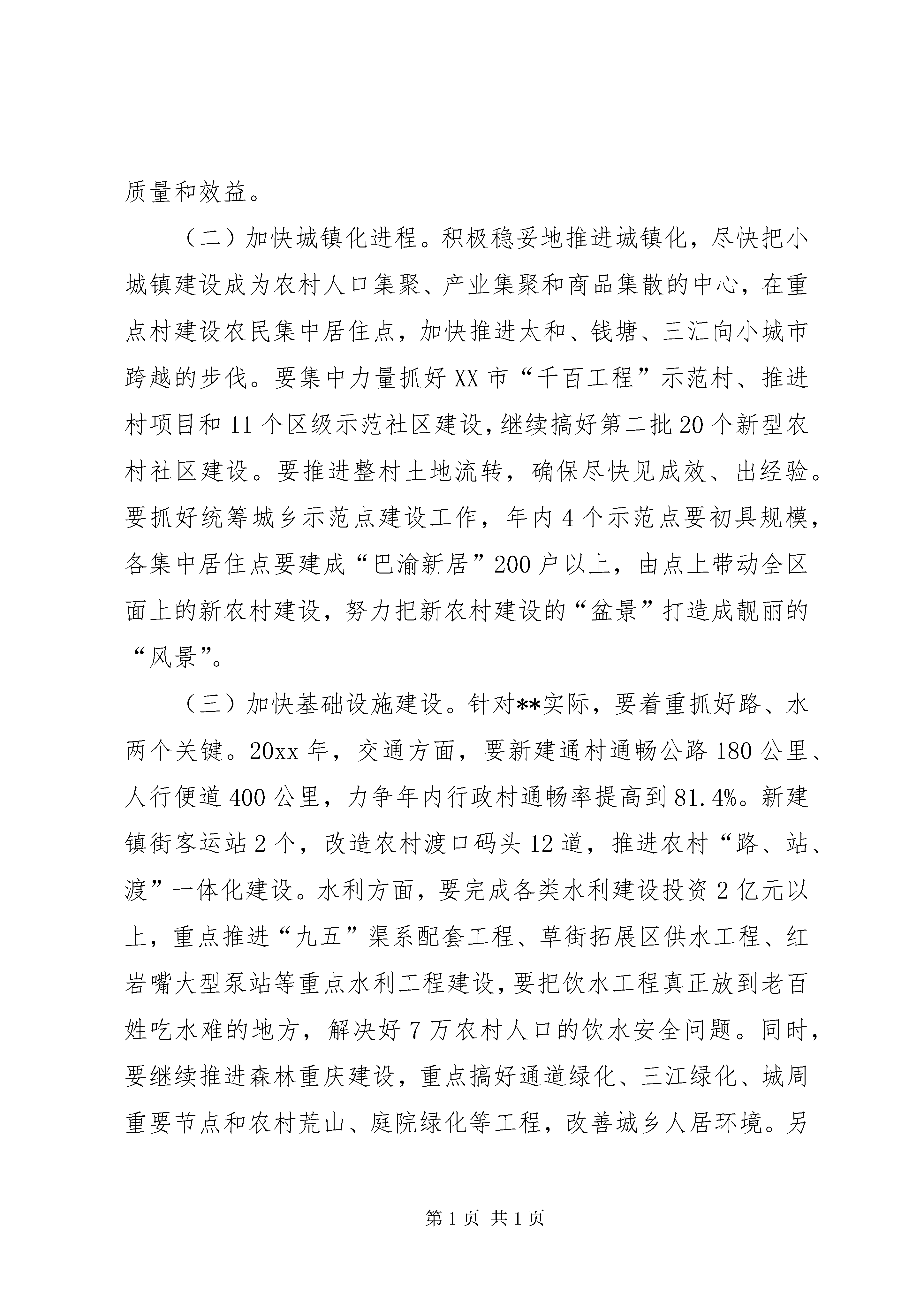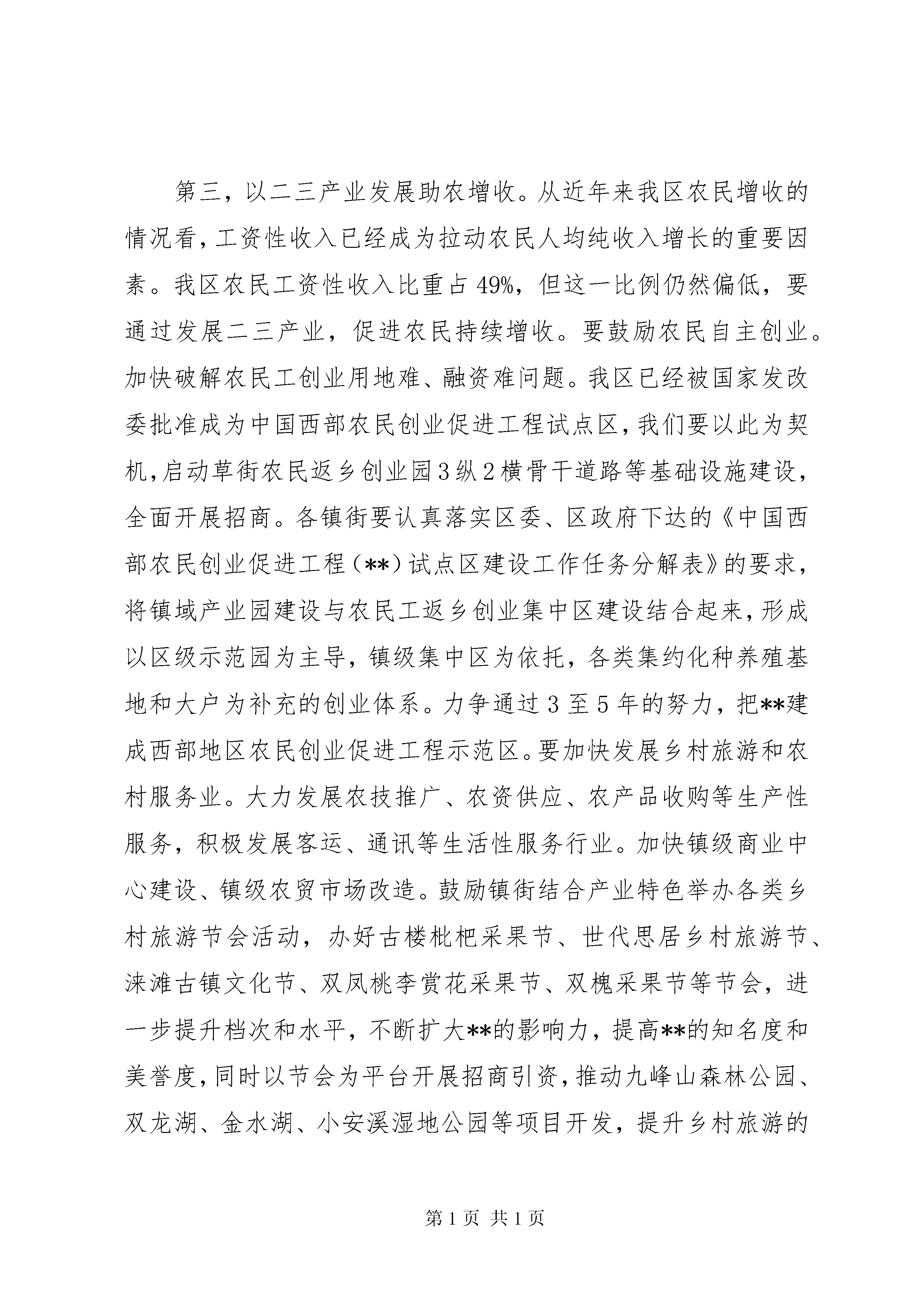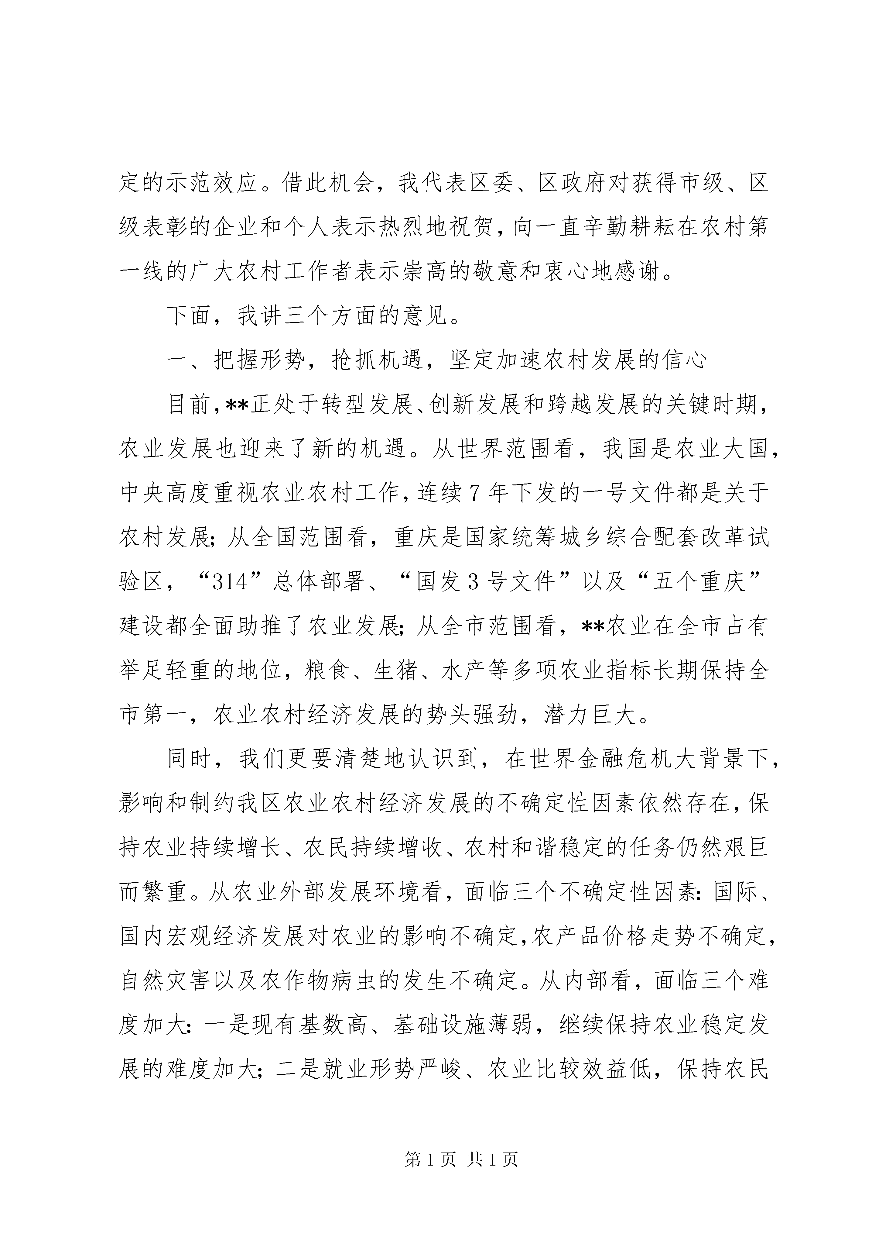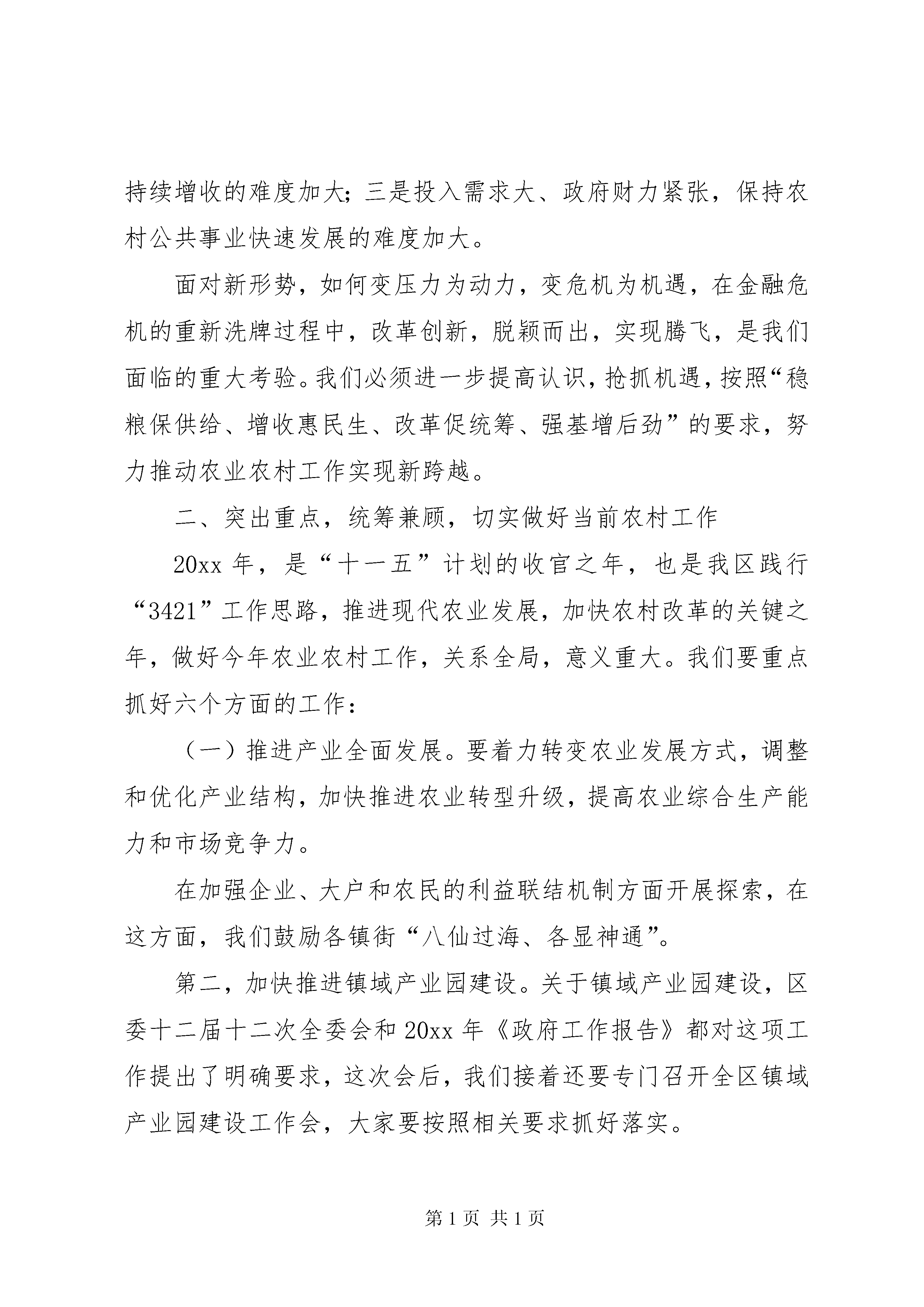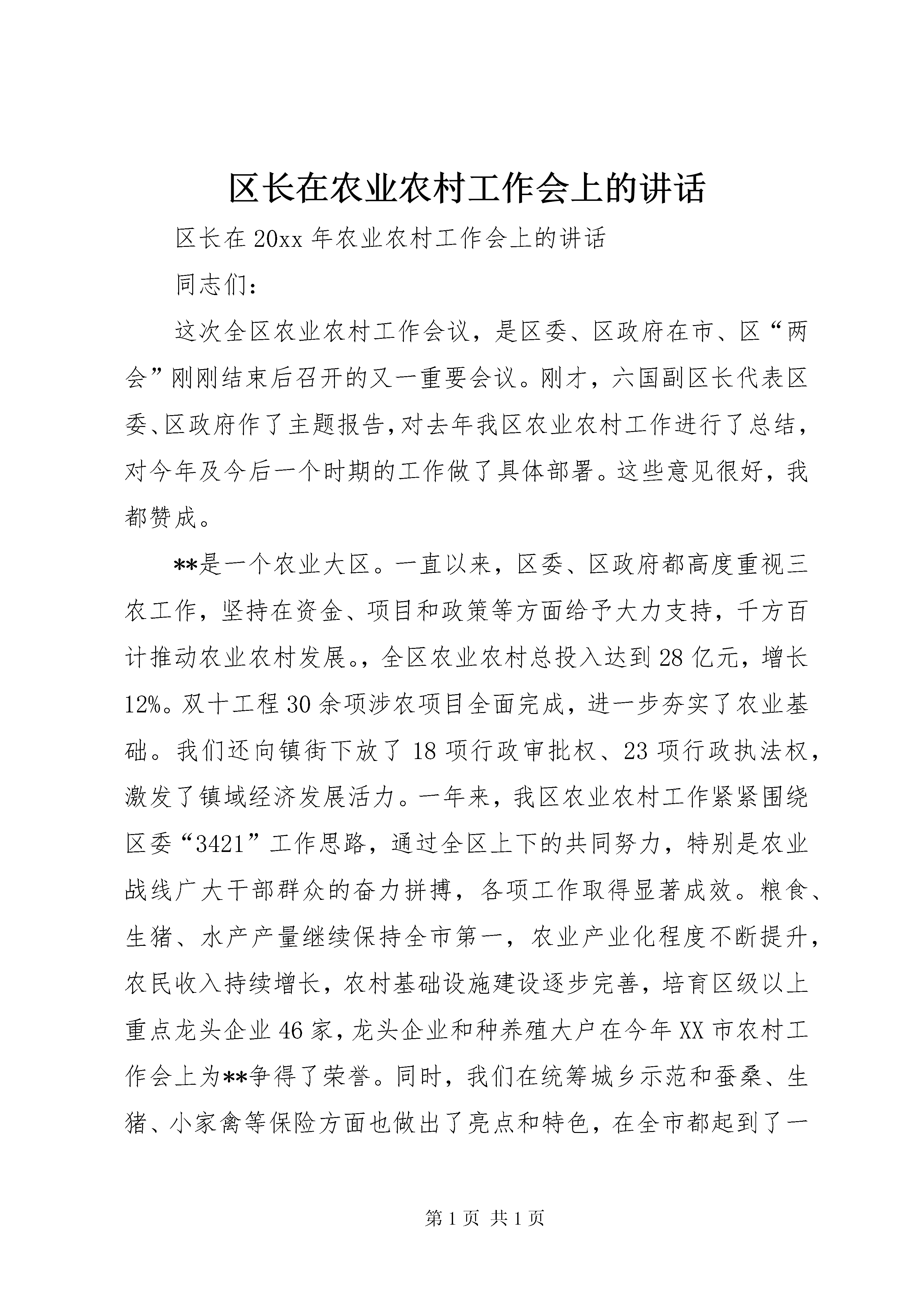 区长在农业农村工作会上的讲话区长在20xx年农业农村工作会上的讲话同志们:这次全区农业农村工作会议,是区委、区政府在市、区“两会”刚刚结束后召开的又一重要会议。刚才,六国副区长代表区委、区政府作了主题报告,对去年我区农业农村工作进行了总结,对今年及今后一个时期的工作做了具体部署。这些意见很好,我都赞成。**是一个农业大区。一直以来,区委、区政府都高度重视三农工作,坚持在资金、项目和政策等方面给予大力支持,千方百计推动农业农村发展。,全区农业农村总投入达到28亿元,增长12%。双十工程30余项涉农项目全面完成,进一步夯实了农业基础。我们还向镇街下放了18项行政审批权、23项行政执法权,激发了镇域经济发展活力。一年来,我区农业农村工作紧紧围绕区委“3421”工作思路,通过全区上下的共同努力,特别是农业战线广大干部群众的奋力拼搏,各项工作取得显著成效。粮食、生猪、水产产量继续保持全市第一,农业产业化程度不断提升,农民收入持续增长,农村基础设施建设逐步完善,培育区级以上重点龙头企业46家,龙头企业和种养殖大户在今年XX市农村工作会上为**争得了荣誉。同时,我们在统筹城乡示范和蚕桑、生猪、小家禽等保险方面也做出了亮点和特色,在全市都起到了一定的示范效应。借此机会,我代表区委、区政府对获得市级、区级表彰的企业和个人表示热烈地祝贺,向一直辛勤耕耘在农村第一线的广大农村工作者表示崇高的敬意和衷心地感谢。下面,我讲三个方面的意见。一、把握形势,抢抓机遇,坚定加速农村发展的信心目前,**正处于转型发展、创新发展和跨越发展的关键时期,农业发展也迎来了新的机遇。从世界范围看,我国是农业大国,中央高度重视农业农村工作,连续7年下发的一号文件都是关于农村发展;从全国范围看,重庆是国家统筹城乡综合配套改革试验区,“314”总体部署、“国发3号文件”以及“五个重庆”建设都全面助推了农业发展;从全市范围看,**农业在全市占有举足轻重的地位,粮食、生猪、水产等多项农业指标长期保持全市第一,农业农村经济发展的势头强劲,潜力巨大。同时,我们更要清楚地认识到,在世界金融危机大背景下,影响和制约我区农业农村经济发展的不确定性因素依然存在,保持农业持续增长、农民持续增收、农村和谐稳定的任务仍然艰巨而繁重。从农业外部发展环境看,面临三个不确定性因素:国际、国内宏观经济发展对农业的影响不确定,农产品价格走势不确定,自然灾害以及农作物病虫的发生不确定。从内部看,面临三个难度加大:一是现有基数高、基础设施薄弱,继续保持农业稳定发展的难度加大;二是就业形势严峻、农业比较效益低,保持农民持续增收的难度加大;三是投入需求大、政府财力紧张,保持农村公共事业快速发展的难度加大。面对新形势,如何变压力为动力,变危机为机遇,在金融危机的重新洗牌过程中,改革创新,脱颖而出,实现腾飞,是我们面临的重大考验。我们必须进一步提高认识,抢抓机遇,按照“稳粮保供给、增收惠民生、改革促统筹、强基增后劲”的要求,努力推动农业农村工作实现新跨越。二、突出重点,统筹兼顾,切实做好当前农村工作20xx年,是“十一五”计划的收官之年,也是我区践行“3421”工作思路,推进现代农业发展,加快农村改革的关键之年,做好今年农业农村工作,关系全局,意义重大。我们要重点抓好六个方面的工作:(一)推进产业全面发展。要着力转变农业发展方式,调整和优化产业结构,加快推进农业转型升级,提高农业综合生产能力和市场竞争力。在加强企业、大户和农民的利益联结机制方面开展探索,在这方面,我们鼓励各镇街“八仙过海、各显神通”。第二,加快推进镇域产业园建设。关于镇域产业园建设,区委十二届十二次全委会和20xx年《政府工作报告》都对这项工作提出了明确要求,这次会后,我们接着还要专门召开全区镇域产业园建设工作会,大家要按照相关要求抓好落实。第三,以二三产业发展助农增收。从近年来我区农民增收的情况看,工资性收入已经成为拉动农民人均纯收入增长的重要因素。我区农民工资性收入比重占49%,但这一比例仍然偏低,要通过发展二三产业,促进农民持续增收。要鼓励农民自主创业。加快破解农民工创业用地难、融资难问题。我区已经被国家发改委批准成为中国西部农民创业促进工程试点区,我们要以此为契机,启动草街农民返乡创业园3纵2横骨干道路等基础设施建设,全面开展招商。各镇街要认真落实区委、区政府下达的《中国西部农民创业促进工程(**)试点区建设工作任务分解表》的要求,将镇域产业园建设与农民工返乡创业集中区建设结合起来,形成以区级示范园为主导,镇级集中区为依托,各类集约化种养殖基地和大户为补充的创业体系。力争通过3至5年的努力,把**建成西部地区农民创业促进工程示范区。要加快发展乡村旅游和农村服务业。大力发展农技推广、农资供应、农产品收购等生产性服务,积极发