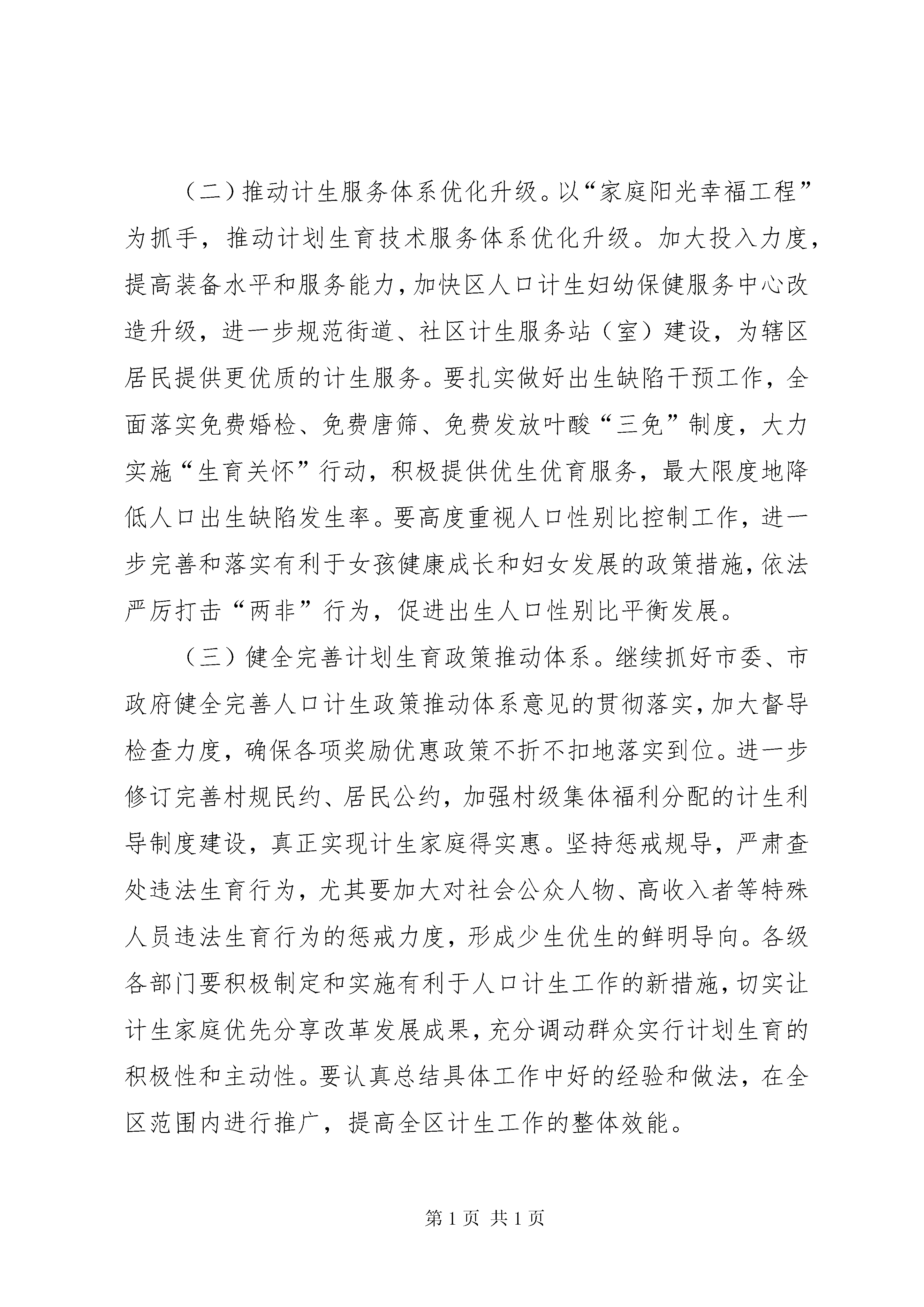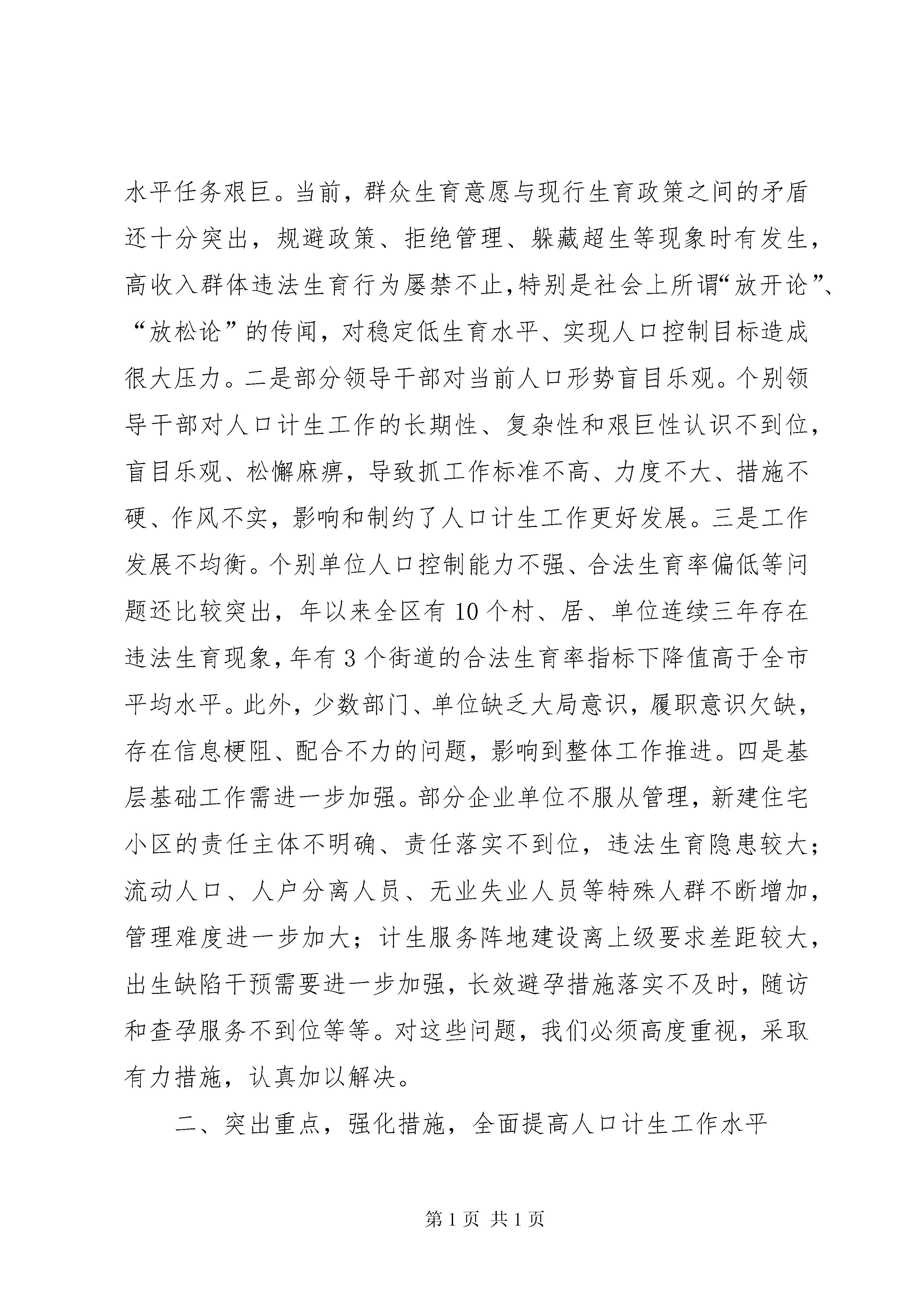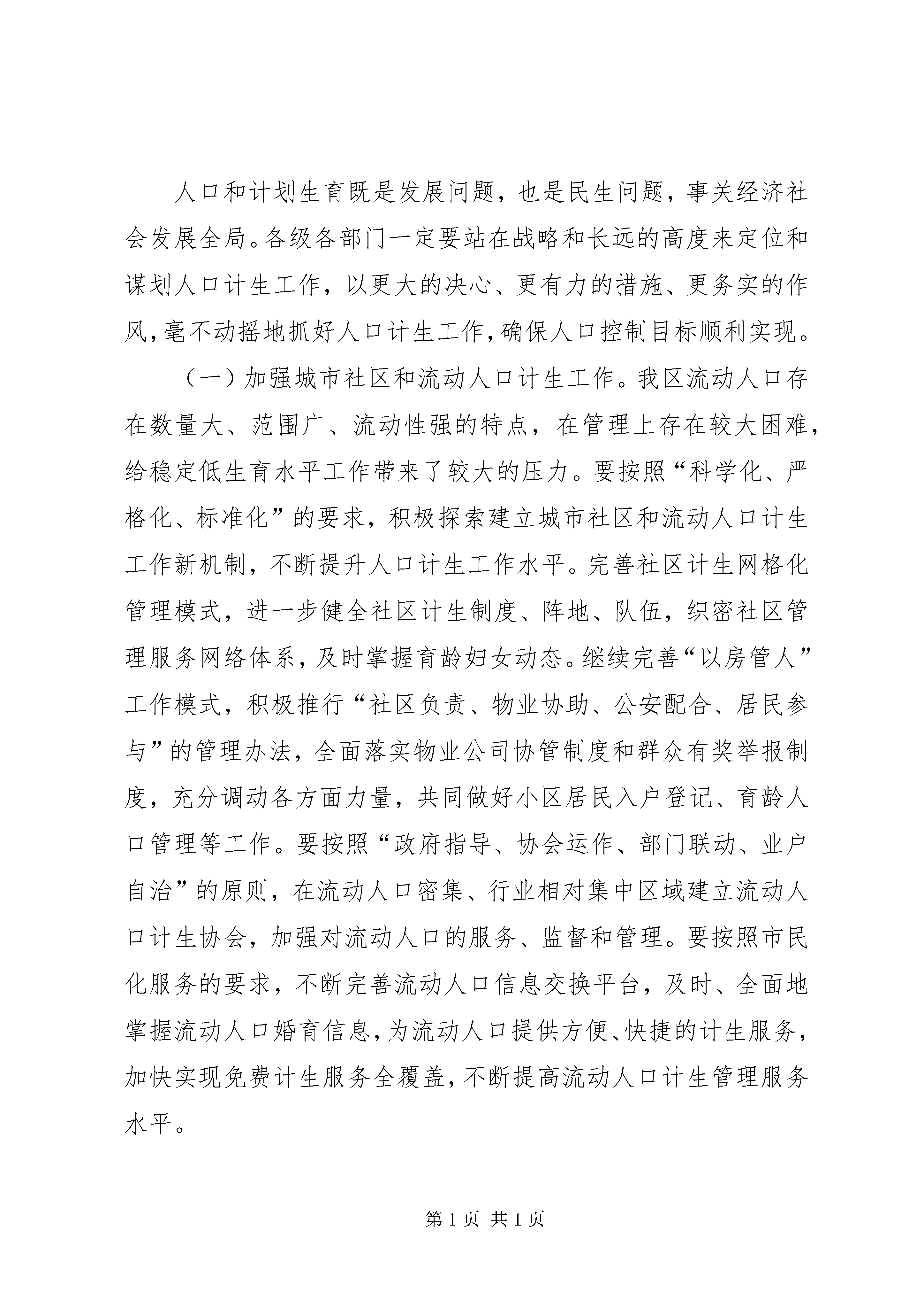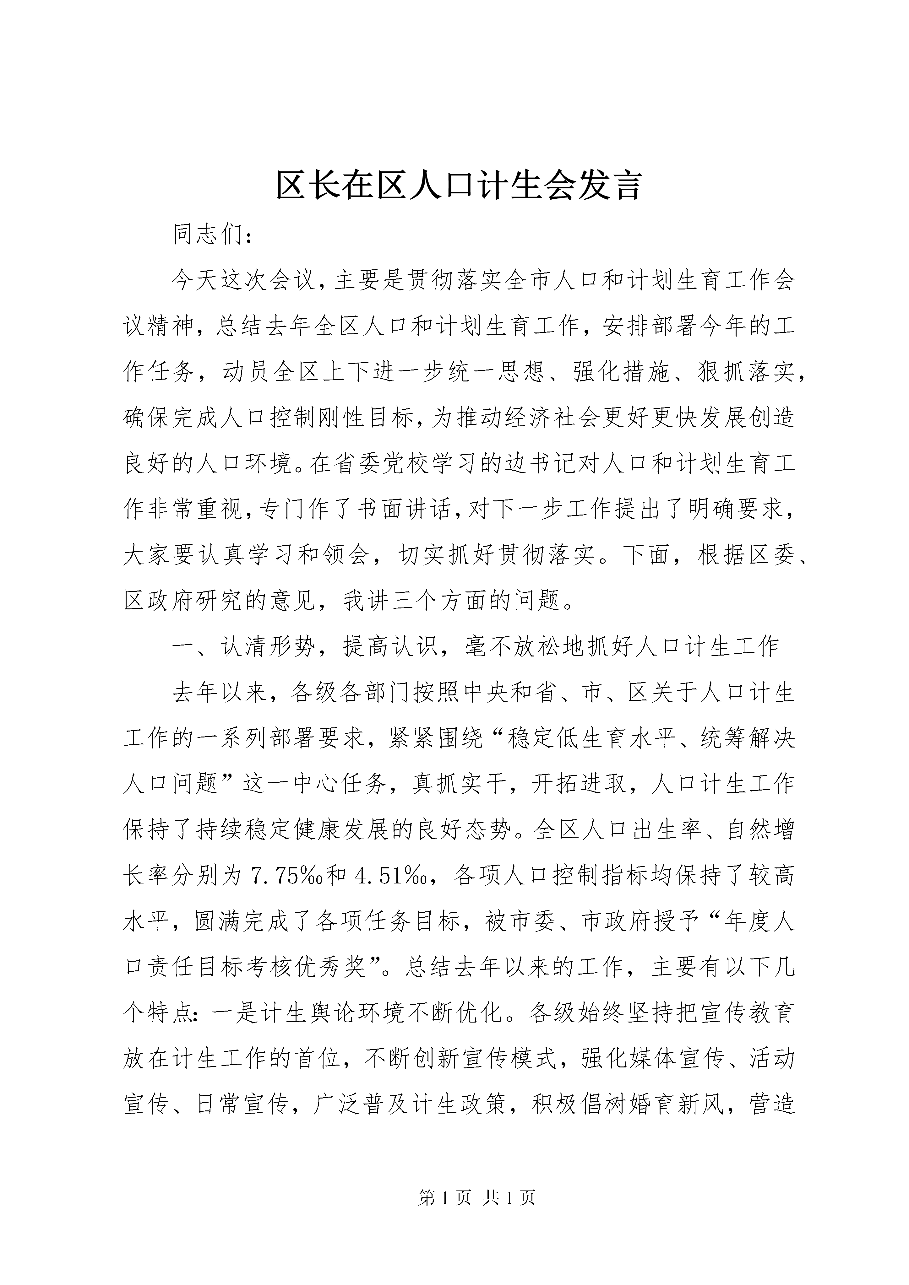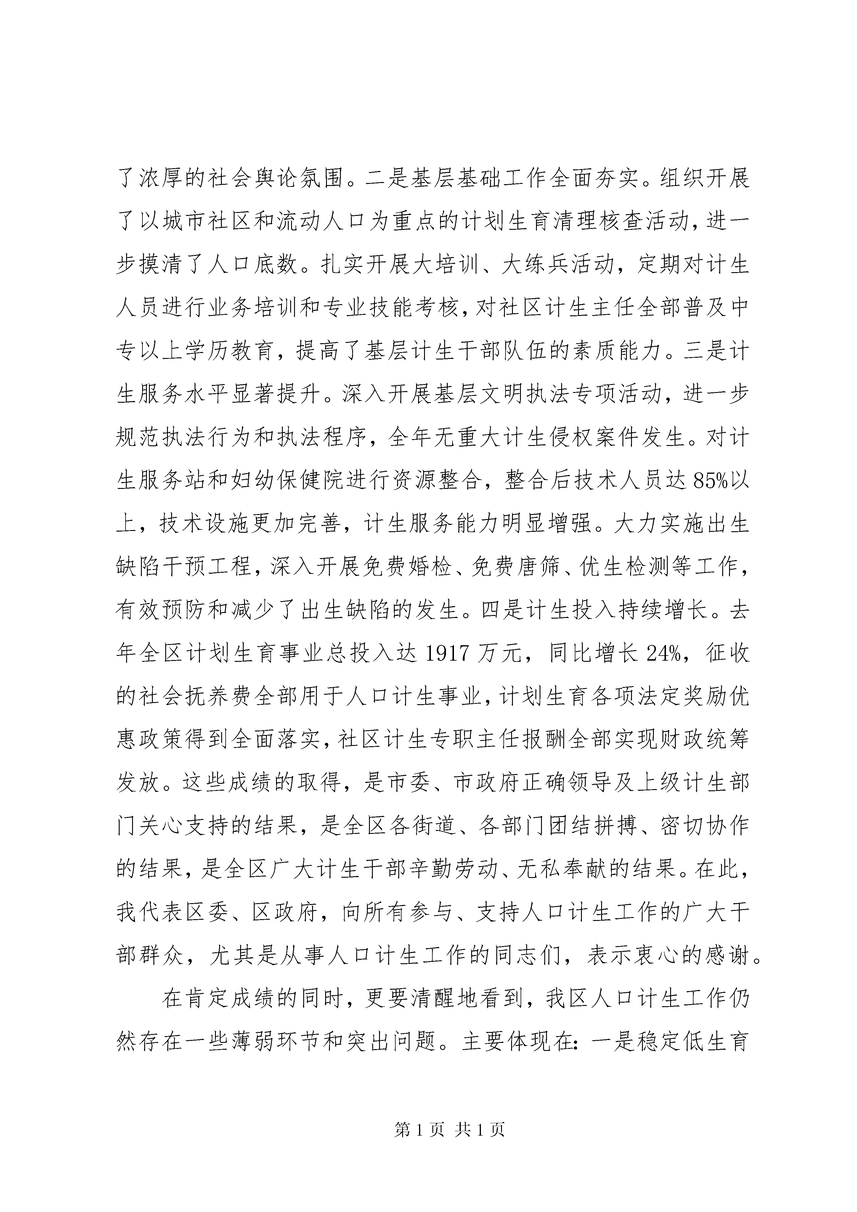区长在区人口计生会发言同志们:今天这次会议,主要是贯彻落实全市人口和计划生育工作会议精神,总结去年全区人口和计划生育工作,安排部署今年的工作任务,动员全区上下进一步统一思想、强化措施、狠抓落实,确保完成人口控制刚性目标,为推动经济社会更好更快发展创造良好的人口环境。在省委党校学习的边书记对人口和计划生育工作非常重视,专门作了书面讲话,对下一步工作提出了明确要求,大家要认真学习和领会,切实抓好贯彻落实。下面,根据区委、区政府研究的意见,我讲三个方面的问题。一、认清形势,提高认识,毫不放松地抓好人口计生工作去年以来,各级各部门按照中央和省、市、区关于人口计生工作的一系列部署要求,紧紧围绕“稳定低生育水平、统筹解决人口问题”这一中心任务,真抓实干,开拓进取,人口计生工作保持了持续稳定健康发展的良好态势。全区人口出生率、自然增长率分别为7.75‰和4.51‰,各项人口控制指标均保持了较高水平,圆满完成了各项任务目标,被市委、市政府授予“年度人口责任目标考核优秀奖”。总结去年以来的工作,主要有以下几个特点:一是计生舆论环境不断优化。各级始终坚持把宣传教育放在计生工作的首位,不断创新宣传模式,强化媒体宣传、活动宣传、日常宣传,广泛普及计生政策,积极倡树婚育新风,营造了浓厚的社会舆论氛围。二是基层基础工作全面夯实。组织开展了以城市社区和流动人口为重点的计划生育清理核查活动,进一步摸清了人口底数。扎实开展大培训、大练兵活动,定期对计生人员进行业务培训和专业技能考核,对社区计生主任全部普及中专以上学历教育,提高了基层计生干部队伍的素质能力。三是计生服务水平显著提升。深入开展基层文明执法专项活动,进一步规范执法行为和执法程序,全年无重大计生侵权案件发生。对计生服务站和妇幼保健院进行资源整合,整合后技术人员达85%以上,技术设施更加完善,计生服务能力明显增强。大力实施出生缺陷干预工程,深入开展免费婚检、免费唐筛、优生检测等工作,有效预防和减少了出生缺陷的发生。四是计生投入持续增长。去年全区计划生育事业总投入达1917万元,同比增长24%,征收的社会抚养费全部用于人口计生事业,计划生育各项法定奖励优惠政策得到全面落实,社区计生专职主任报酬全部实现财政统筹发放。这些成绩的取得,是市委、市政府正确领导及上级计生部门关心支持的结果,是全区各街道、各部门团结拼搏、密切协作的结果,是全区广大计生干部辛勤劳动、无私奉献的结果。在此,我代表区委、区政府,向所有参与、支持人口计生工作的广大干部群众,尤其是从事人口计生工作的同志们,表示衷心的感谢。在肯定成绩的同时,更要清醒地看到,我区人口计生工作仍然存在一些薄弱环节和突出问题。主要体现在:一是稳定低生育水平任务艰巨。当前,群众生育意愿与现行生育政策之间的矛盾还十分突出,规避政策、拒绝管理、躲藏超生等现象时有发生,高收入群体违法生育行为屡禁不止,特别是社会上所谓“放开论”、“放松论”的传闻,对稳定低生育水平、实现人口控制目标造成很大压力。二是部分领导干部对当前人口形势盲目乐观。个别领导干部对人口计生工作的长期性、复杂性和艰巨性认识不到位,盲目乐观、松懈麻痹,导致抓工作标准不高、力度不大、措施不硬、作风不实,影响和制约了人口计生工作更好发展。三是工作发展不均衡。个别单位人口控制能力不强、合法生育率偏低等问题还比较突出,年以来全区有10个村、居、单位连续三年存在违法生育现象,年有3个街道的合法生育率指标下降值高于全市平均水平。此外,少数部门、单位缺乏大局意识,履职意识欠缺,存在信息梗阻、配合不力的问题,影响到整体工作推进。四是基层基础工作需进一步加强。部分企业单位不服从管理,新建住宅小区的责任主体不明确、责任落实不到位,违法生育隐患较大;流动人口、人户分离人员、无业失业人员等特殊人群不断增加,管理难度进一步加大;计生服务阵地建设离上级要求差距较大,出生缺陷干预需要进一步加强,长效避孕措施落实不及时,随访和查孕服务不到位等等。对这些问题,我们必须高度重视,采取有力措施,认真加以解决。二、突出重点,强化措施,全面提高人口计生工作水平人口和计划生育既是发展问题,也是民生问题,事关经济社会发展全局。各级各部门一定要站在战略和长远的高度来定位和谋划人口计生工作,以更大的决心、更有力的措施、更务实的作风,毫不动摇地抓好人口计生工作,确保人口控制目标顺利实现。(一)加强城市社区和流动人口计生工作。我区流动人口存在数量大、范围广、流动性强的特点,在管理上存在较大困难,给稳定低生育水平工作带来了较大的压力。要按照“科学化、严格化、标准化”的要求,积极探索建立城市社区和流动人口计生工作新机制,不断提升人口计生工作水平。完善社区计生网格化管理模式,进一步健全社区计生制度、阵地、队伍,织密社区管理服务网络体系,及时掌握育