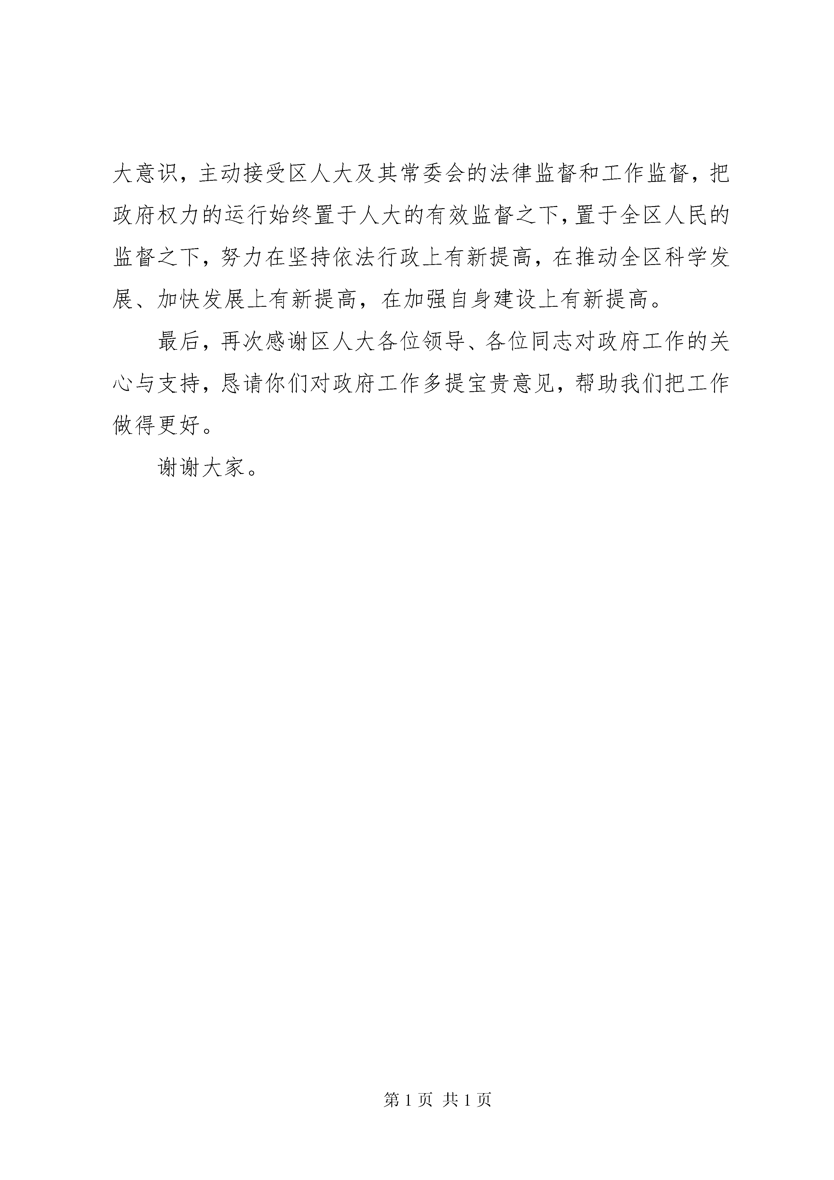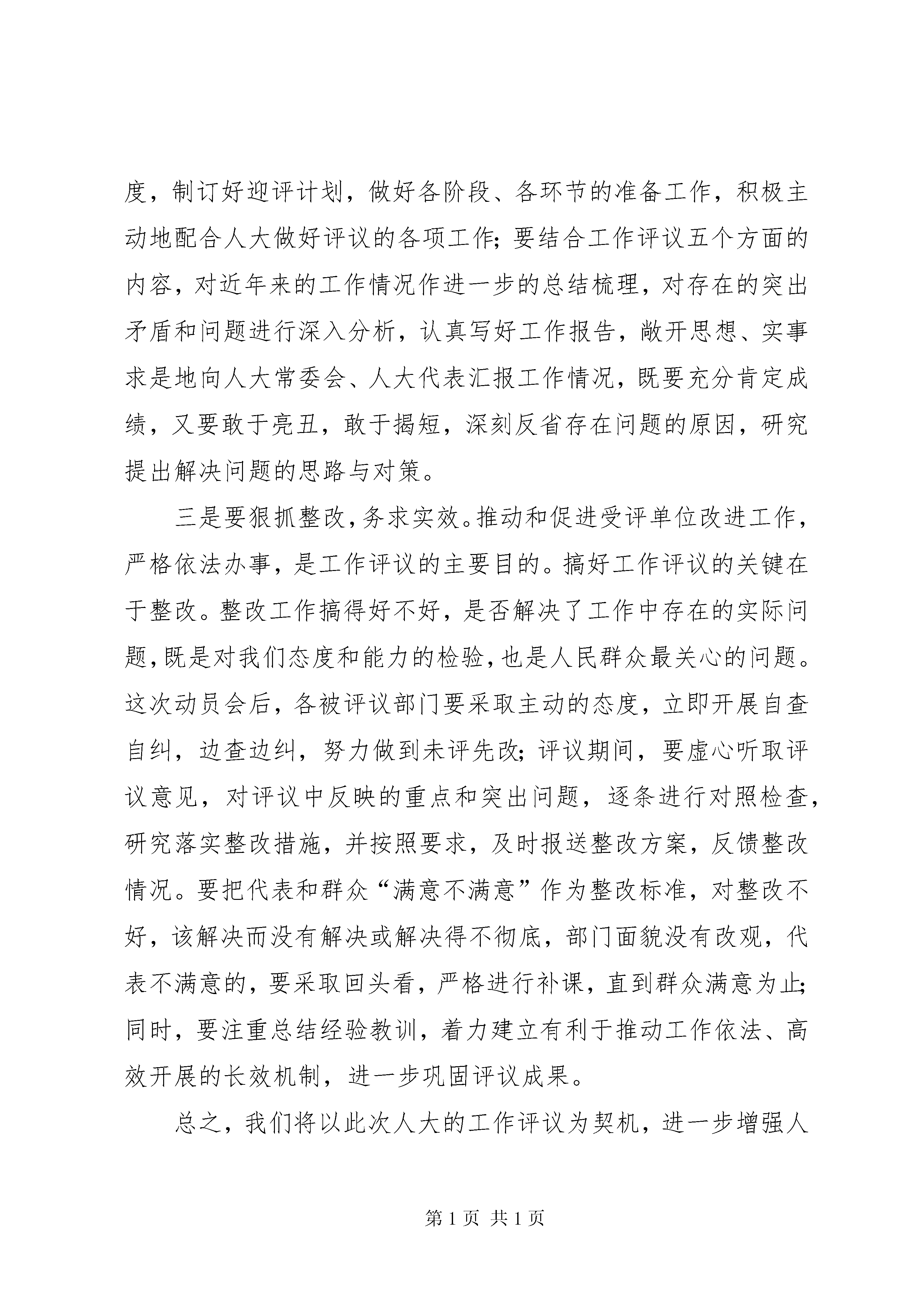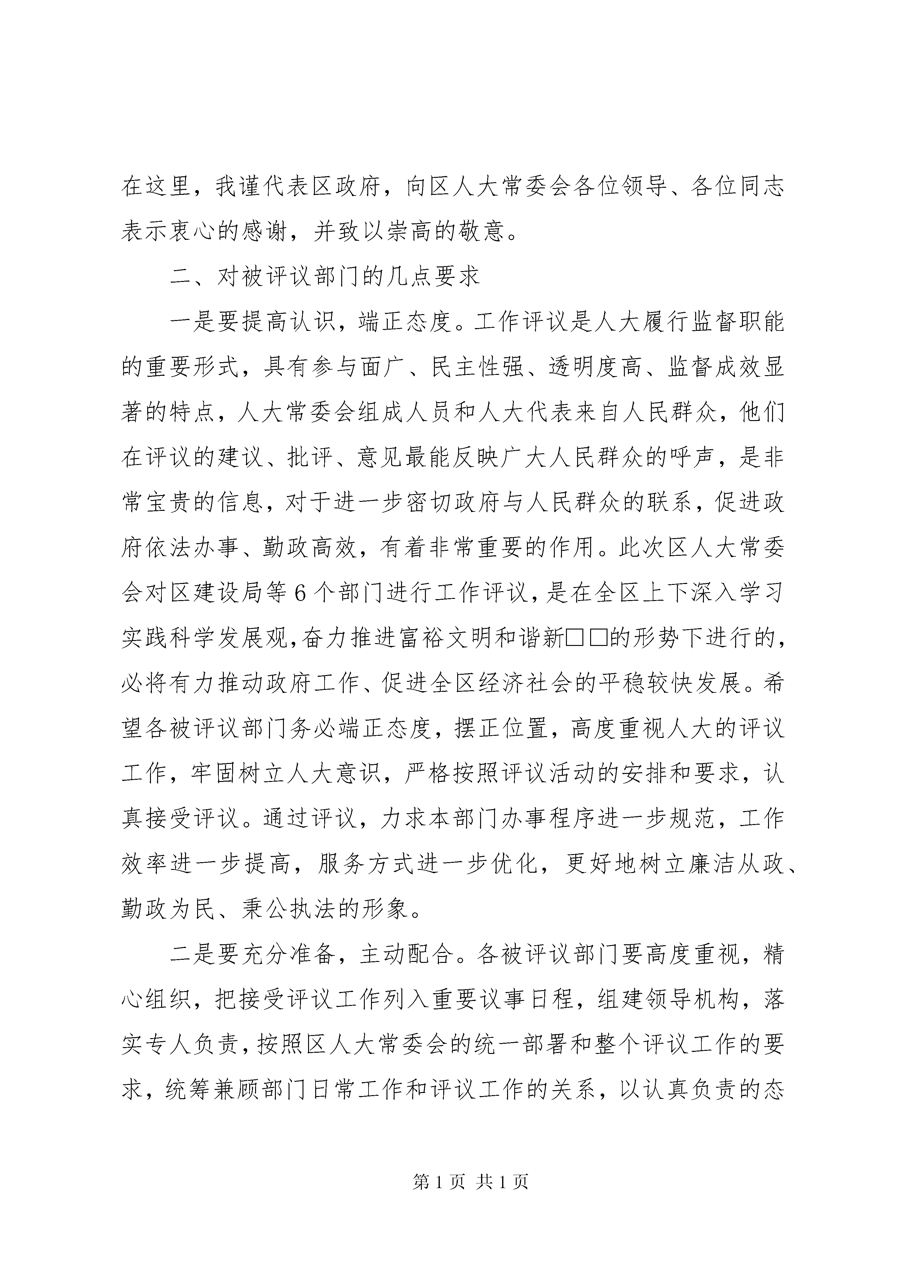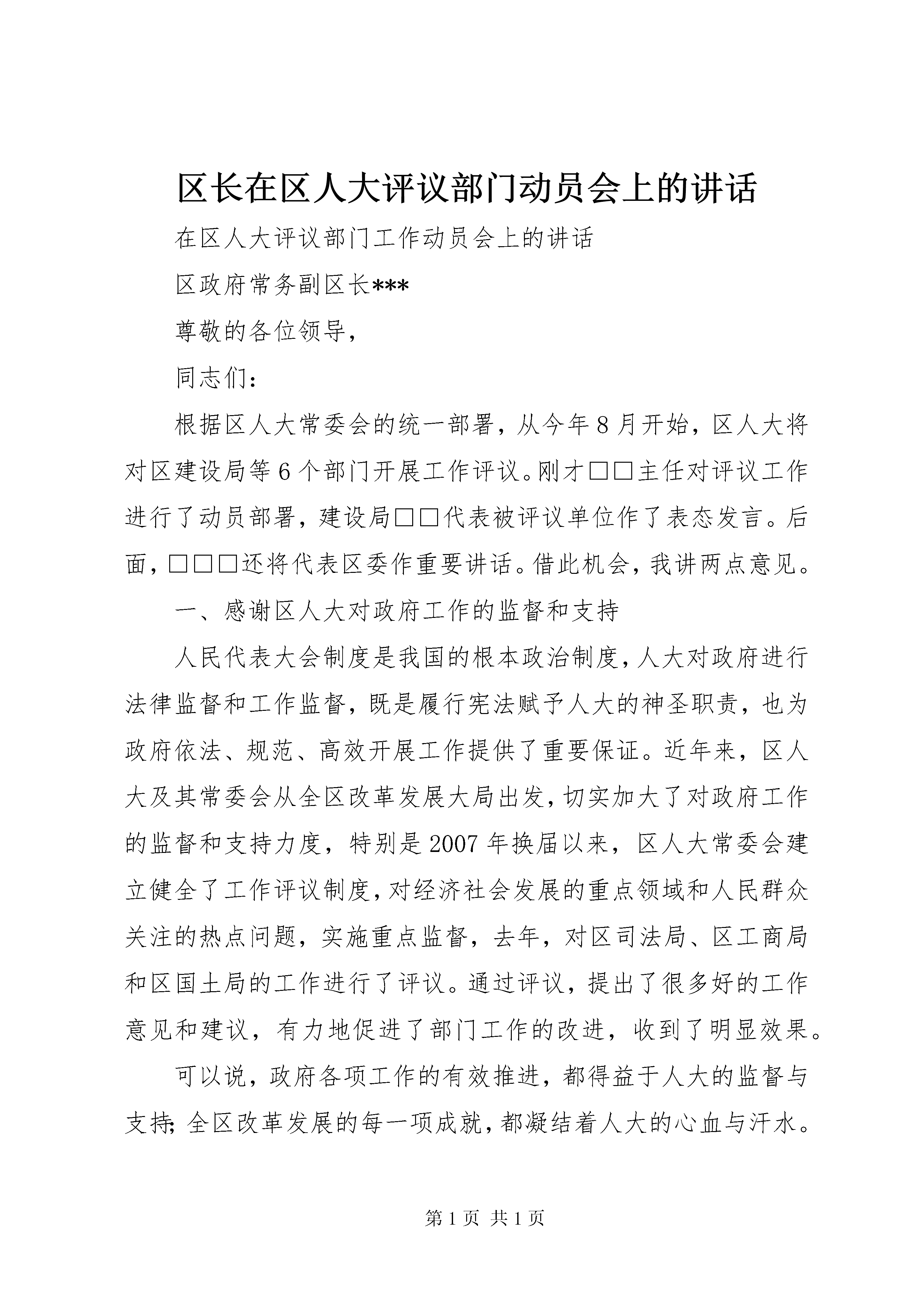 区长在区人大评议部门动员会上的讲话在区人大评议部门工作动员会上的讲话区政府常务副区长***尊敬的各位领导,同志们:根据区人大常委会的统一部署,从今年8月开始,区人大将对区建设局等6个部门开展工作评议。刚才□□主任对评议工作进行了动员部署,建设局□□代表被评议单位作了表态发言。后面,□□□还将代表区委作重要讲话。借此机会,我讲两点意见。一、感谢区人大对政府工作的监督和支持人民代表大会制度是我国的根本政治制度,人大对政府进行法律监督和工作监督,既是履行宪法赋予人大的神圣职责,也为政府依法、规范、高效开展工作提供了重要保证。近年来,区人大及其常委会从全区改革发展大局出发,切实加大了对政府工作的监督和支持力度,特别是2007年换届以来,区人大常委会建立健全了工作评议制度,对经济社会发展的重点领域和人民群众关注的热点问题,实施重点监督,去年,对区司法局、区工商局和区国土局的工作进行了评议。通过评议,提出了很多好的工作意见和建议,有力地促进了部门工作的改进,收到了明显效果。可以说,政府各项工作的有效推进,都得益于人大的监督与支持;全区改革发展的每一项成就,都凝结着人大的心血与汗水。在这里,我谨代表区政府,向区人大常委会各位领导、各位同志表示衷心的感谢,并致以崇高的敬意。二、对被评议部门的几点要求一是要提高认识,端正态度。工作评议是人大履行监督职能的重要形式,具有参与面广、民主性强、透明度高、监督成效显著的特点,人大常委会组成人员和人大代表来自人民群众,他们在评议的建议、批评、意见最能反映广大人民群众的呼声,是非常宝贵的信息,对于进一步密切政府与人民群众的联系,促进政府依法办事、勤政高效,有着非常重要的作用。此次区人大常委会对区建设局等6个部门进行工作评议,是在全区上下深入学习实践科学发展观,奋力推进富裕文明和谐新□□的形势下进行的,必将有力推动政府工作、促进全区经济社会的平稳较快发展。希望各被评议部门务必端正态度,摆正位置,高度重视人大的评议工作,牢固树立人大意识,严格按照评议活动的安排和要求,认真接受评议。通过评议,力求本部门办事程序进一步规范,工作效率进一步提高,服务方式进一步优化,更好地树立廉洁从政、勤政为民、秉公执法的形象。二是要充分准备,主动配合。各被评议部门要高度重视,精心组织,把接受评议工作列入重要议事日程,组建领导机构,落实专人负责,按照区人大常委会的统一部署和整个评议工作的要求,统筹兼顾部门日常工作和评议工作的关系,以认真负责的态度,制订好迎评计划,做好各阶段、各环节的准备工作,积极主动地配合人大做好评议的各项工作;要结合工作评议五个方面的内容,对近年来的工作情况作进一步的总结梳理,对存在的突出矛盾和问题进行深入分析,认真写好工作报告,敞开思想、实事求是地向人大常委会、人大代表汇报工作情况,既要充分肯定成绩,又要敢于亮丑,敢于揭短,深刻反省存在问题的原因,研究提出解决问题的思路与对策。三是要狠抓整改,务求实效。推动和促进受评单位改进工作,严格依法办事,是工作评议的主要目的。搞好工作评议的关键在于整改。整改工作搞得好不好,是否解决了工作中存在的实际问题,既是对我们态度和能力的检验,也是人民群众最关心的问题。这次动员会后,各被评议部门要采取主动的态度,立即开展自查自纠,边查边纠,努力做到未评先改;评议期间,要虚心听取评议意见,对评议中反映的重点和突出问题,逐条进行对照检查,研究落实整改措施,并按照要求,及时报送整改方案,反馈整改情况。要把代表和群众“满意不满意”作为整改标准,对整改不好,该解决而没有解决或解决得不彻底,部门面貌没有改观,代表不满意的,要采取回头看,严格进行补课,直到群众满意为止;同时,要注重总结经验教训,着力建立有利于推动工作依法、高效开展的长效机制,进一步巩固评议成果。总之,我们将以此次人大的工作评议为契机,进一步增强人大意识,主动接受区人大及其常委会的法律监督和工作监督,把政府权力的运行始终置于人大的有效监督之下,置于全区人民的监督之下,努力在坚持依法行政上有新提高,在推动全区科学发展、加快发展上有新提高,在加强自身建设上有新提高。最后,再次感谢区人大各位领导、各位同志对政府工作的关心与支持,恳请你们对政府工作多提宝贵意见,帮助我们把工作做得更好。谢谢大家。