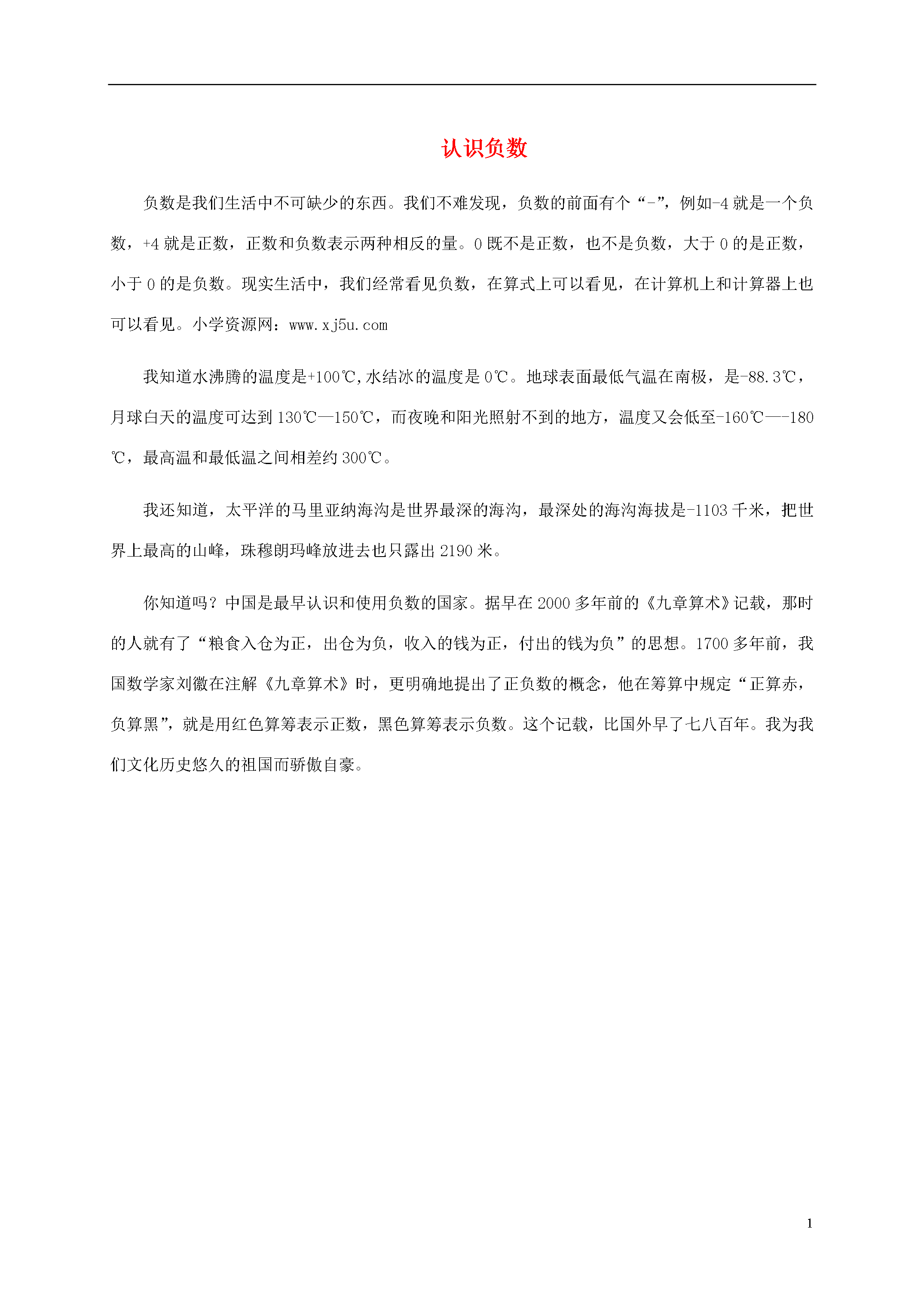 1认识负数负数是我们生活中不可缺少的东西。我们不难发现,负数的前面有个“-”,例如-4就是一个负数,+4就是正数,正数和负数表示两种相反的量。0既不是正数,也不是负数,大于0的是正数,小于0的是负数。现实生活中,我们经常看见负数,在算式上可以看见,在计算机上和计算器上也可以看见。小学资源网:www.xj5u.com我知道水沸腾的温度是+100℃,水结冰的温度是0℃。地球表面最低气温在南极,是-88.3℃,月球白天的温度可达到130℃—150℃,而夜晚和阳光照射不到的地方,温度又会低至-160℃—-180℃,最高温和最低温之间相差约300℃。我还知道,太平洋的马里亚纳海沟是世界最深的海沟,最深处的海沟海拔是-1103千米,把世界上最高的山峰,珠穆朗玛峰放进去也只露出2190米。你知道吗?中国是最早认识和使用负数的国家。据早在2000多年前的《九章算术》记载,那时的人就有了“粮食入仓为正,出仓为负,收入的钱为正,付出的钱为负”的思想。1700多年前,我国数学家刘徽在注解《九章算术》时,更明确地提出了正负数的概念,他在筹算中规定“正算赤,负算黑”,就是用红色算筹表示正数,黑色算筹表示负数。这个记载,比国外早了七八百年。我为我们文化历史悠久的祖国而骄傲自豪。