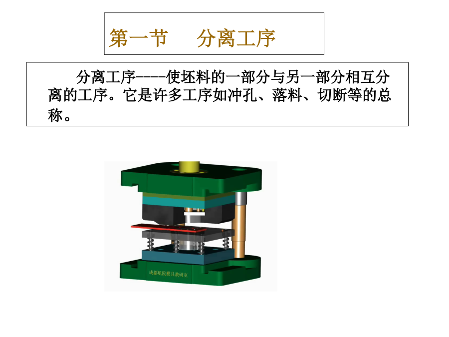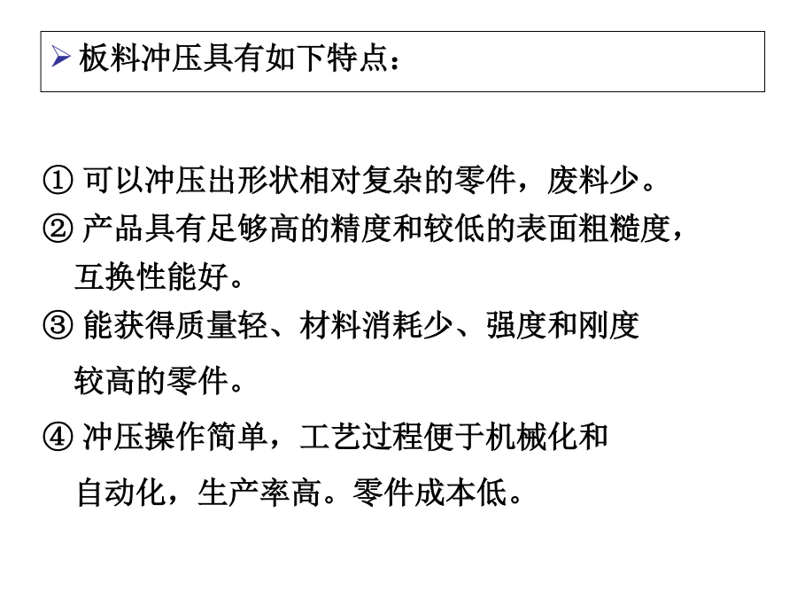 冲压工艺的基础知识和详细介绍板料冲压具有如下特点: 第一节分离工序一.落料及冲孔(冲裁) 1.冲裁变形过程 弹性变形塑性变形断裂阶段冲裁2、凸凹模间隙 凹模间隙c的确定:间隙不能过大,也不能过小。 间隙合适间隙过大间隙过小凸凹模间隙对冲裁件质量的影响2、凸凹模间隙 凹模间隙c的确定:间隙不能过大,也不能过小。 按材料种类及厚度 选择间隙3、凸凹模刃口尺寸的确定: 落料模:取凹模作为设计基准 凹模刃口尺寸=工件要求尺寸(小尺寸); 凸模刃口尺寸=凹模刃口尺寸-间隙值 冲孔模:取凸模作为设计基准 凸模刃口尺寸=工件要求尺寸(大尺寸); 凹模刃口尺寸=凸模刃口尺寸+间隙值 落料件尺寸随凹模刃口磨损而增大,冲孔件尺寸随凸模磨损而减小,所以4、冲裁力的计算: 5、冲裁件的排样: 不同排样方式材料消耗对比二修整三切断 切断---用剪刃或冲模将板料沿不封闭轮廓进行分离的工序。 此外还有切舌(如图所示)、切边、剖切等工序。 第二节变形工序拉深(2)拉深中的废品 。拉裂起皱正确选择拉伸系数避免起皱的工艺方法(3)旋压:用旋压法制作拉深件 二、弯曲 是坯料的一部分相对于另一部分弯曲成一定曲率或角度的工序。 二、弯曲 是坯料的一部分相对于另一部分弯曲成一定曲率或角度的工序。 回弹3翻边 翻边 圆孔翻边举例 4、成型 利用局部变形使坯料或使半成品改变形状的工序。多工序成型零件 落料后; 三次拉深; 冲孔; 翻边; 冲缺。5冲模的分类和构造简单冲模: 在冲床的一次冲程中只完成一个工序的冲模。 连续冲模: 在冲床的一次冲程中,在模具的不同部位同时完成数道工序的模具。 复合冲模: 在冲床的一次冲程中,在模具的同一部位同时完成数道工序的模具。凸、凹模做成一体6冲压件的结构工艺性不合理的落料外形②对弯曲件的要求: 弯曲件形状应尽量对称,弯曲半径不能小于材料允许的最小弯曲半径,并应考虑材料的纤维方向; 弯曲边过短不易成形,H>2s如图所示; 弯曲带孔件时,为避免孔的变形,应注意孔的位置,L>(1.5—2)s.如图所示 弯曲时有时可事先钻出止裂孔,如图所示; 空心零件不易过高、过深,如图所示; 图3.3.19弯曲边高 图3.3.20带孔弯曲件③对拉深件的要求: 拉深件外形应简单、对称,且高度不宜太大,以便减少拉伸次数; 拉深件的最小许可半径如图所示;(3)拉深件的要求 拉深件最小允许半径(2)、改进结构可以简化工艺及节省材料 采用冲焊结构。如图所示. 采用冲口工艺,以减少组合件数量。 在保证使用功能的条件下,应尽量简化构件结,以减少工序、节省材料. 改进结构和简化工艺 图冲压焊接结构零件 图冲口工艺的应用八道 工序