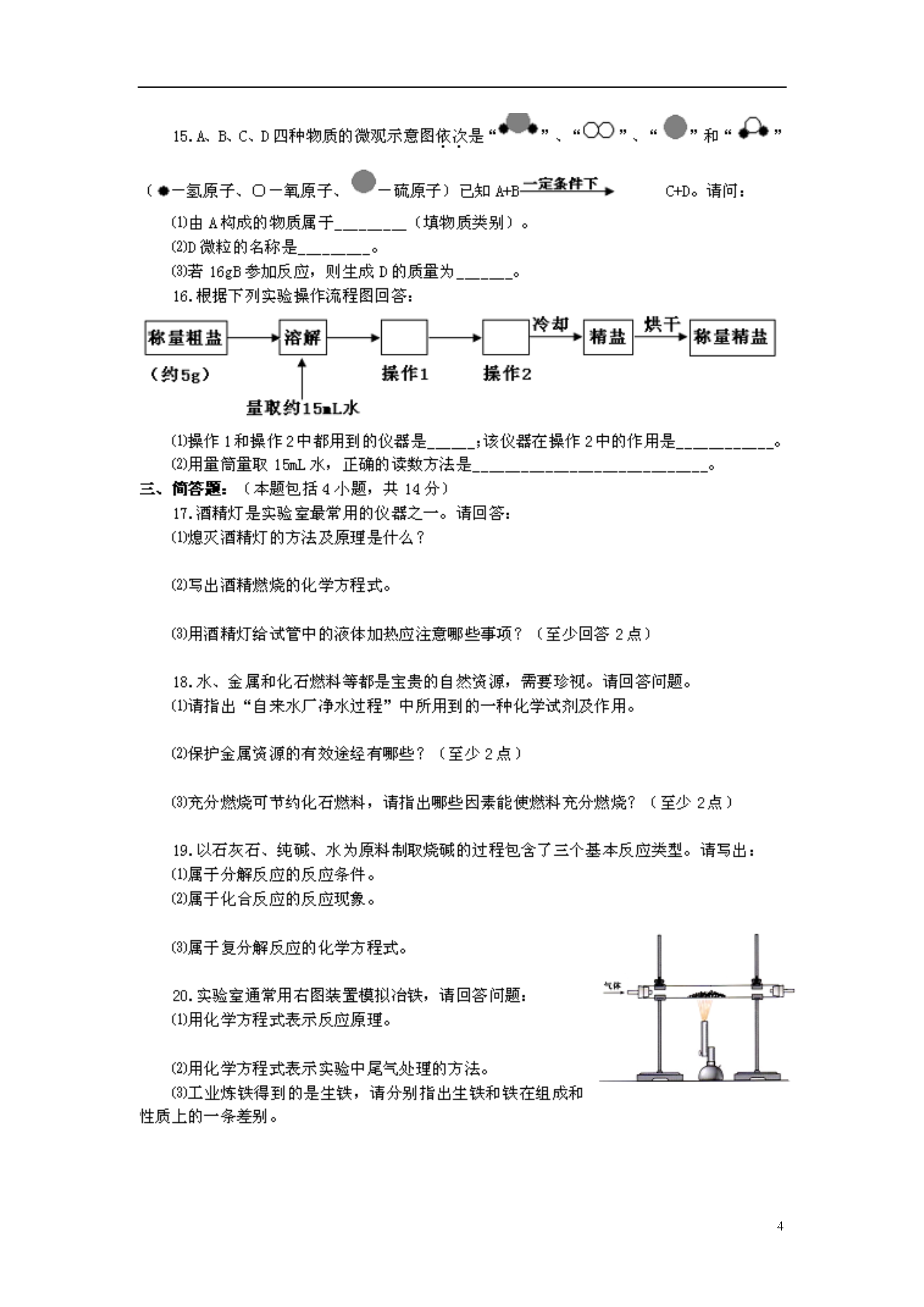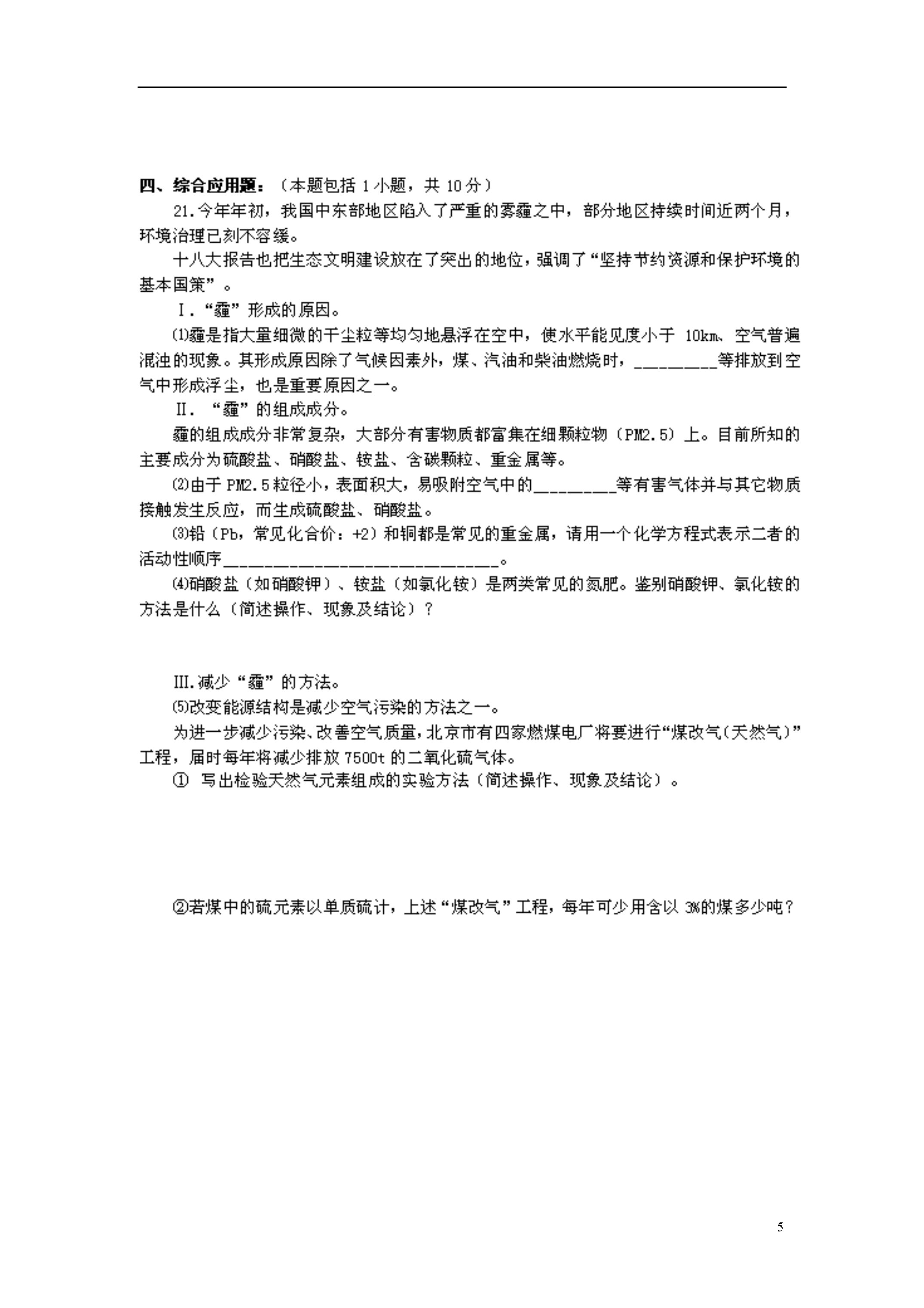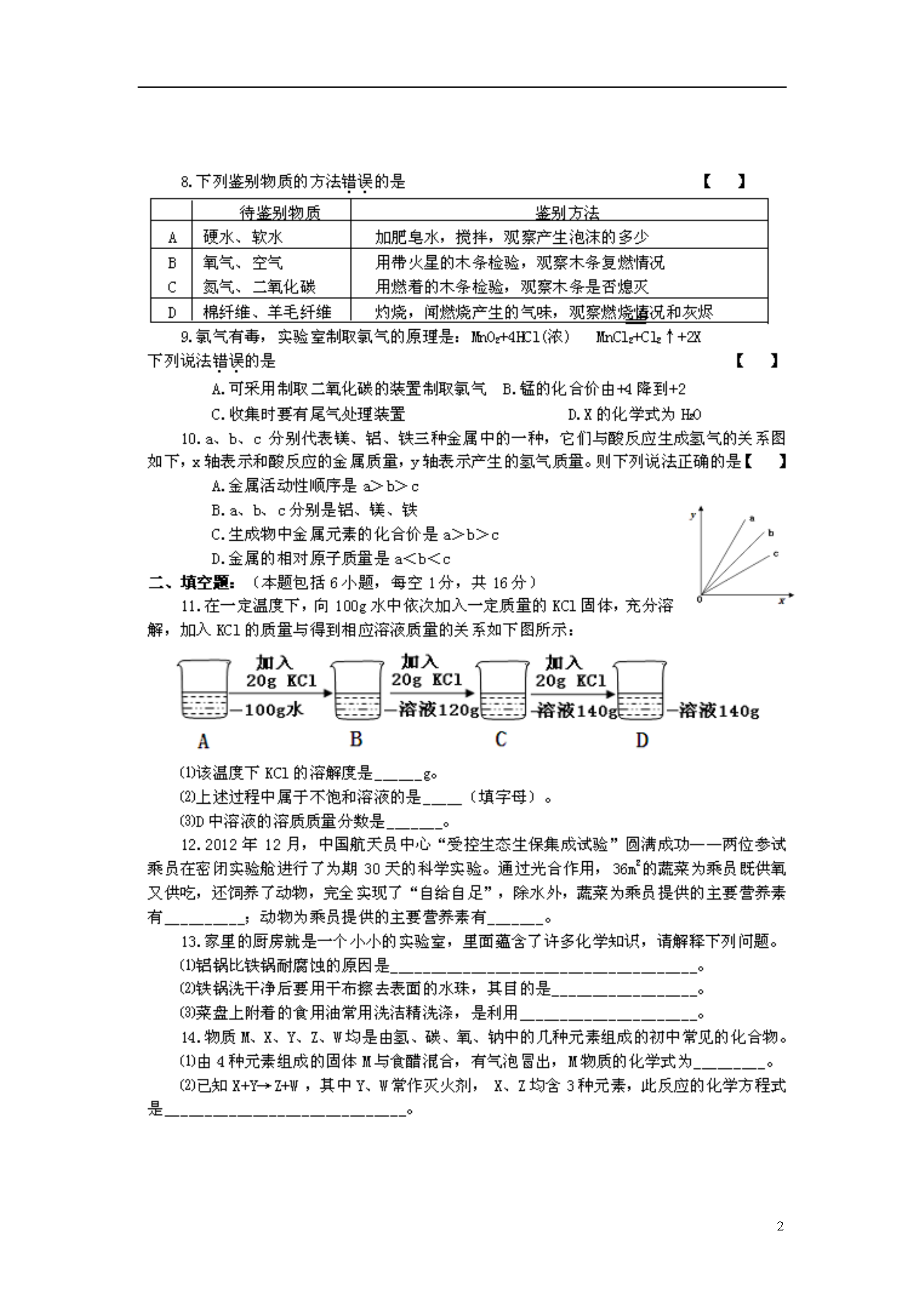 6河南省郑州市2013届九年级化学第二次质量预测卷试题(扫描版)2013年九年级第二次质量预测化学参考答案一、选择题(本题包括10小题,每题1分,共10分。)1.A2.B3.D4.C5.B6.A7.C8.C9.A10.B二、填空题(本题包括6小题,每空1分,共16分。)11.(3分)(1)40(2)B(3)28.6%12.(2分)维生素;蛋白质、油脂13.(3分)(1)铝表面能形成一层致密的氧化铝保护膜而铁不能(2)防止铁锅生锈(3)洗洁精能够乳化油污形成乳浊液14.(2分)(1)NaHCO3(2)CO2+2NaOH===Na2CO3+H2O15.(3分)(1)化合物(或纯净物)(2)水分子(3)1816.(3分)(1)玻璃棒;不断搅拌,防止因局部温度过高,造成液滴飞溅(2)视线、15mL刻度线与量筒内液体凹液面的最低处成水平状态。三、简答题(本题包括4小题,共14分。)17.(4分)(1)用灯帽盖灭,隔绝空气(2)C2H5OH+3O22CO2+3H2O(3)试管外壁应该干燥,试管里的液体不应超过试管容积的1/3;用试管夹夹持试管时,应由试管底部套上、取下;加热时,应先使试管底部均匀受热,然后用酒精灯的外焰固定加热;试管口不要对着自己或他人;加热后的试管,不能立即接触冷水或用冷水冲洗。(少于2点不给分)18.(3分)(1)絮凝剂,使杂质沉降(或活性炭,吸附杂质或氯气,消毒)。(2)防止金属腐蚀、回收废旧金属、有计划合理地开采矿物、寻找金属的代用品(3)燃烧时要有足够的空气,燃料与空气要有足够大的接触面积19.(3分)(1)高温(2)放出大量热(3)Na2CO3+Ca(OH)2===CaCO3+2NaOH点燃20.(4分)(1)3CO+Fe2O32Fe+3CO2(2)2CO+O22CO2(3)纯铁是纯净物,生铁中含有碳、硅、锰等;纯铁较软,生铁比纯铁的硬度大;纯铁的熔点比生铁高。四、综合应用题(本题包括1小题,共10分。)21.(10分)Ⅰ.(1)炭粒(或“尘粒”、“未燃烧的碳氢化合物”);Ⅱ.(2)二氧化硫、二氧化氮(次序错误不给分)(3)Pb+Cu(NO3)2===Pb(NO3)2+Cu(或Pb+2HCl===PbCl2+H2等其它合理答案)(4)(2分)取样,加熟石灰粉末研磨,有刺激性气味的是铵盐,没有的是硝酸盐。Ⅲ.(5)①点燃从导管放出的甲烷,在火焰上方罩一个冷而干燥的烧杯,过一会儿,观察到烧杯壁上有水雾出现,证明甲烷中含有氢元素;(1分)迅速把烧杯倒过来,向烧杯内注入少量澄清石灰水,振荡,观察到石灰水变浑浊,证明甲烷中含有碳元素。(1分)②(3分)7500t×EQ\F(32,64)÷3%==125000t(算式正确2分,结果正确1分)(或其它合理答案,按化学方程式计算不扣分)