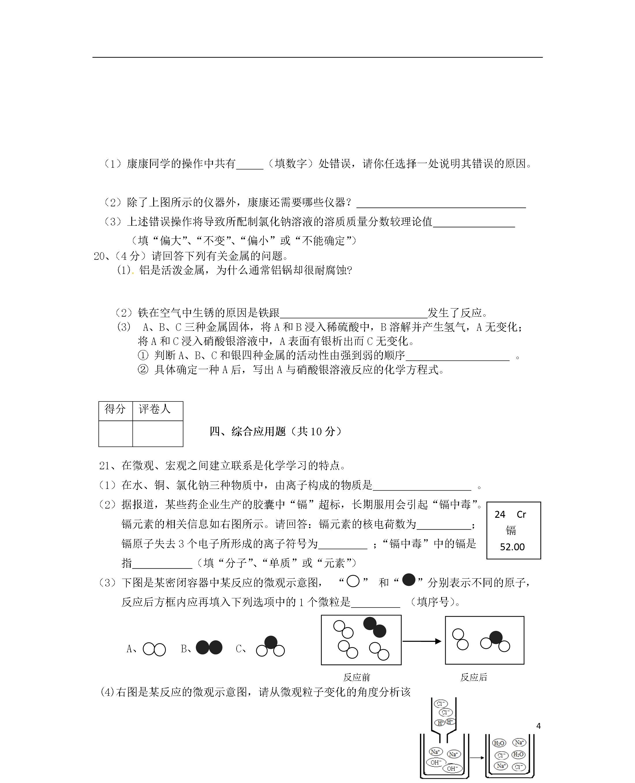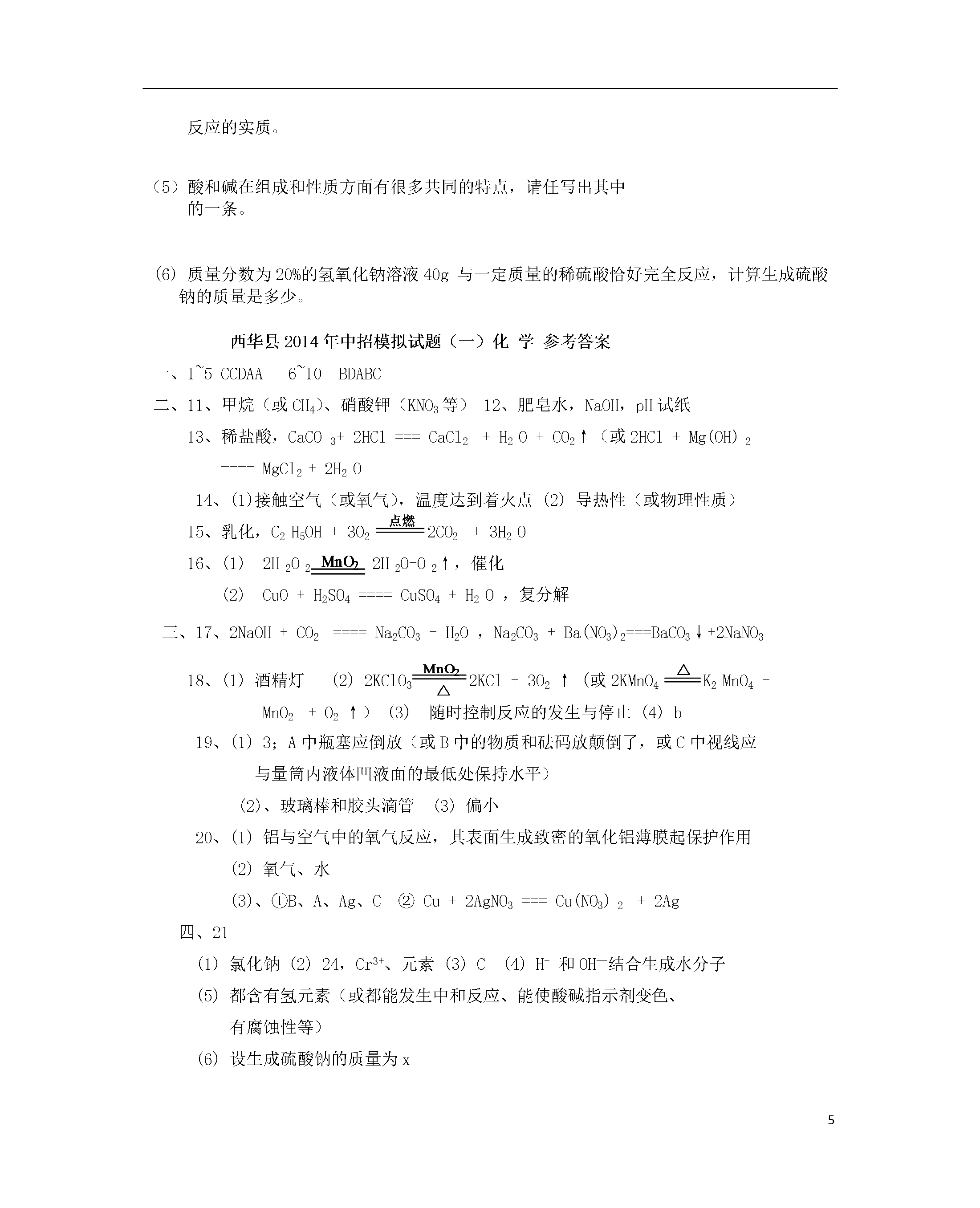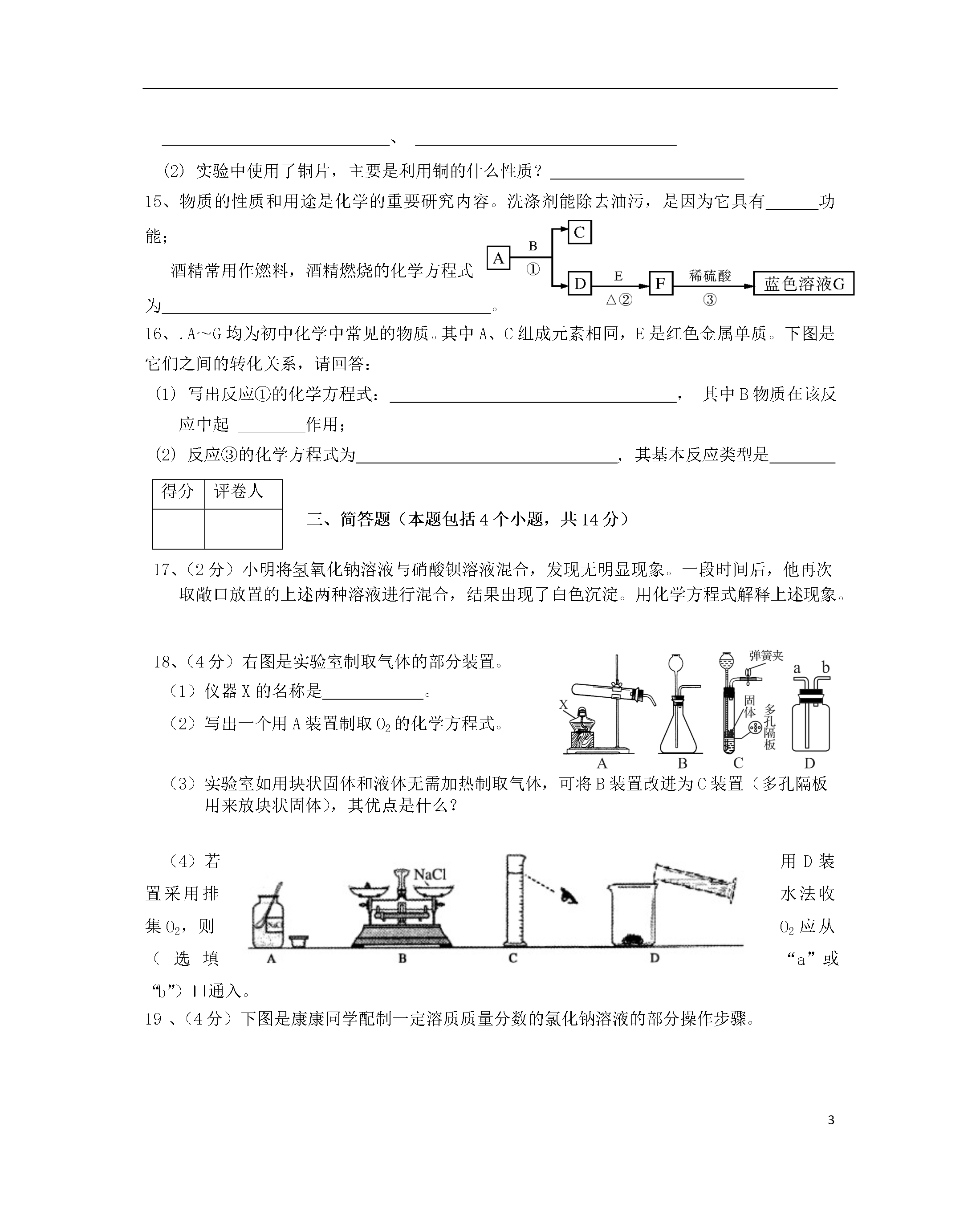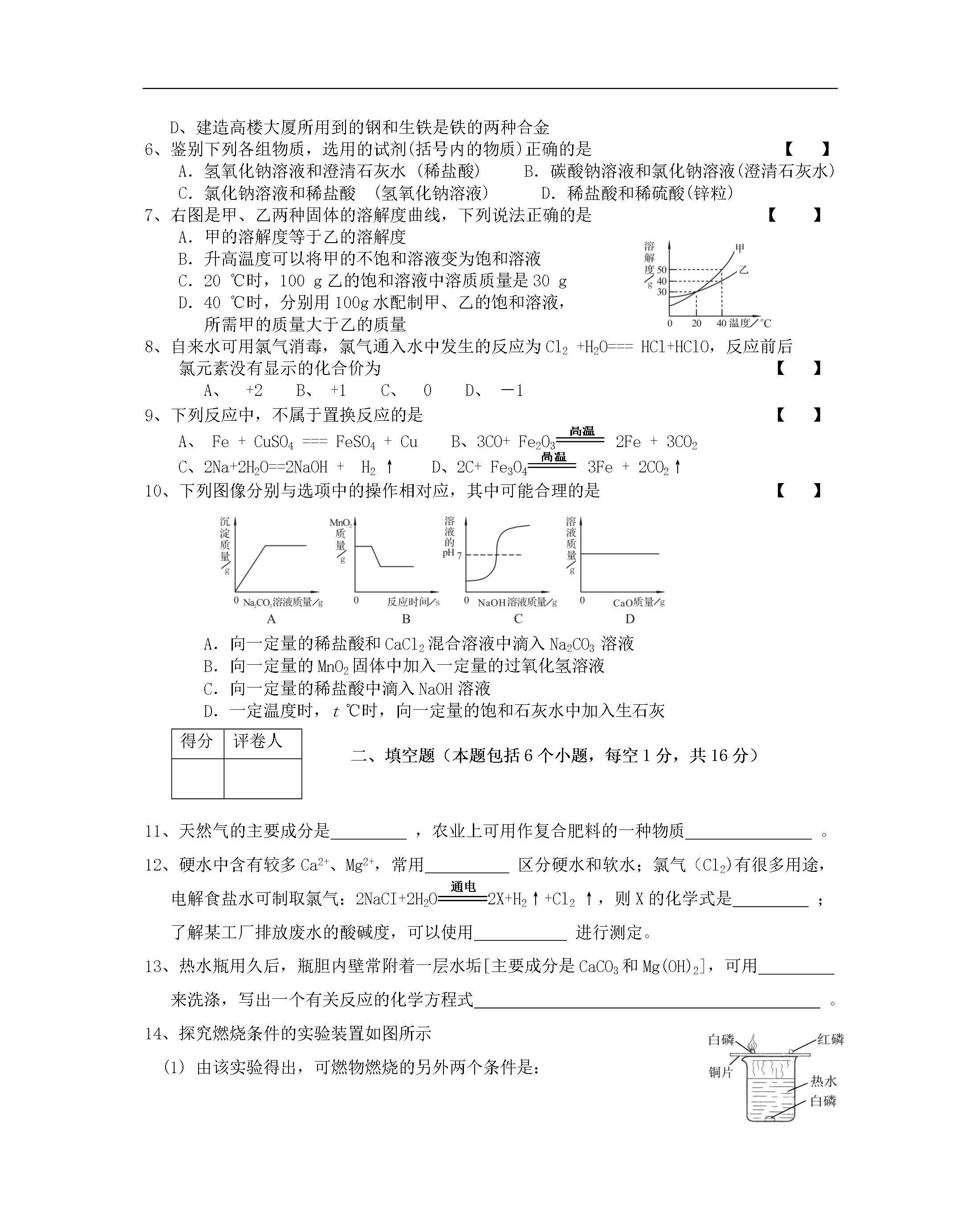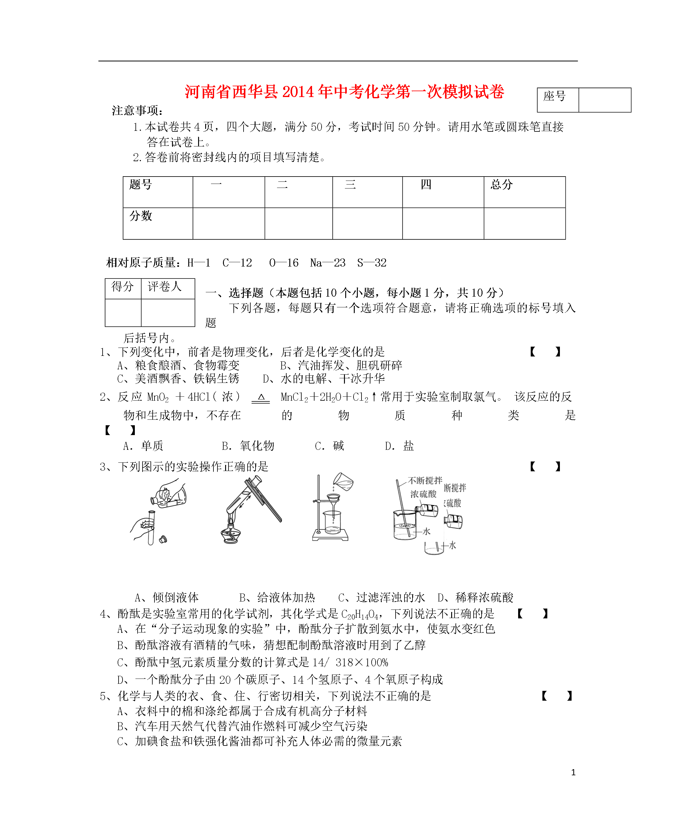 6河南省西华县2014年中考化学第一次模拟试卷座号注意事项:本试卷,四个大题,满分50分,考试时间50分钟。请用水笔或圆珠笔直接答在试卷上。2.答卷前将密封线内的项目填写清楚。题号一二三四总分分数相对原子质量:H—1C—12O—16Na—23S—32得分评卷人一、选择题(本题包括10个小题,每小题1分,共10分)下列各题,每题只有一个选项符合题意,请将正确选项的标号填入题后括号内。下列变化中,前者是物理变化,后者是化学变化的是【】A、粮食酿酒、食物霉变B、汽油挥发、胆矾研碎C、美酒飘香、铁锅生锈D、水的电解、干冰升华反应MnO2+4HCl(浓)MnCl2+2H2O+Cl2↑常用于实验室制取氯气。该反应的反物和生成物中,不存在的物质种类是【】A.单质B.氧化物C.碱D.盐3、下列图示的实验操作正确的是【】A、倾倒液体B、给液体加热C、过滤浑浊的水D、稀释浓硫酸4、酚酞是实验室常用的化学试剂,其化学式是C20H14O4,下列说法不正确的是【】A、在“分子运动现象的实验”中,酚酞分子扩散到氨水中,使氨水变红色B、酚酞溶液有酒精的气味,猜想配制酚酞溶液时用到了乙醇C、酚酞中氢元素质量分数的计算式是14/318×100%D、一个酚酞分子由20个碳原子、14个氢原子、4个氧原子构成5、化学与人类的衣、食、住、行密切相关,下列说法不正确的是【】A、衣料中的棉和涤纶都属于合成有机高分子材料B、汽车用天然气代替汽油作燃料可减少空气污染C、加碘食盐和铁强化酱油都可补充人体必需的微量元素D、建造高楼大厦所用到的钢和生铁是铁的两种合金6、鉴别下列各组物质,选用的试剂(括号内的物质)正确的是【】A.氢氧化钠溶液和澄清石灰水(稀盐酸)B.碳酸钠溶液和氯化钠溶液(澄清石灰水)C.氯化钠溶液和稀盐酸(氢氧化钠溶液)D.稀盐酸和稀硫酸(锌粒)7、右图是甲、乙两种固体的溶解度曲线,下列说法正确的是【】A.甲的溶解度等于乙的溶解度B.升高温度可以将甲的不饱和溶液变为饱和溶液C.20℃时,100g乙的饱和溶液中溶质质量是30gD.40℃时,分别用100g水配制甲、乙的饱和溶液,所需甲的质量大于乙的质量8、自来水可用氯气消毒,氯气通入水中发生的反应为Cl2+H2O===HCl+HClO,反应前后氯元素没有显示的化合价为【】A、+2B、+1C、0D、-1下列反应中,不属于置换反应的是【】A、Fe+CuSO4===FeSO4+CuB、3CO+Fe2O32Fe+3CO2C、2Na+2H2O==2NaOH+H2↑D、2C+Fe3O43Fe+2CO2↑10、下列图像分别与选项中的操作相对应,其中可能合理的是【】A.向一定量的稀盐酸和CaCl2混合溶液中滴入Na2CO3溶液B.向一定量的MnO2固体中加入一定量的过氧化氢溶液C.向一定量的稀盐酸中滴入NaOH溶液D.一定温度时,t℃时,向一定量的饱和石灰水中加入生石灰得分评卷人二、填空题(本题包括6个小题,每空1分,共16分)11、天然气的主要成分是,农业上可用作复合肥料的一种物质。12、硬水中含有较多Ca2+、Mg2+,常用区分硬水和软水;氯气(Cl2)有很多用途,电解食盐水可制取氯气:2NaCI+2H2O2X+H2↑+Cl2↑,则X的化学式是;了解某工厂排放废水的酸碱度,可以使用进行测定。13、热水瓶用久后,瓶胆内壁常附着一层水垢[主要成分是CaCO3和Mg(OH)2],可用来洗涤,写出一个有关反应的化学方程式。14、探究燃烧条件的实验装置如图所示(1)由该实验得出,可燃物燃烧的另外两个条件是:、(2)实验中使用了铜片,主要是利用铜的什么性质?15、物质的性质和用途是化学的重要研究内容。洗涤剂能除去油污,是因为它具有功能;酒精常用作燃料,酒精燃烧的化学方程式为。16、.A~G均为初中化学中常见的物质。其中A、C组成元素相同,E是红色金属单质。下图是它们之间的转化关系,请回答:(1)写出反应①的化学方程式:,其中B物质在该反应中起________作用;(2)反应③的化学方程式为,其基本反应类型是得分评卷人三、简答题(本题包括4个小题,共14分)17、(2分)小明将氢氧化钠溶液与硝酸钡溶液混合,发现无明显现象。一段时间后,他再次取敞口放置的上述两种溶液进行混合,结果出现了白色沉淀。用化学方程式解释上述现象。18、(4分)右图是实验室制取气体的部分装置。(1)仪器X的名称是。(2)写出一个用A装置制取O2的化学方程式。(3)实验室如用块状固体和液体无需加热制取气体,可将B装置改进为C装置(多孔隔板用来放块状固体),其优点是什么?(4)若用D装置采用排水法收集O2,则O2应从(选填“a”或“b”)口通入。19、(4分)下图是康康同学配制一定溶质质量分数的氯化钠溶液的部分操作步骤。(1)康康同学的操作中共有(填数字)处错误,请你任选择一
