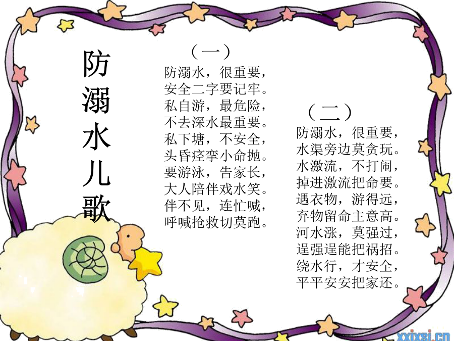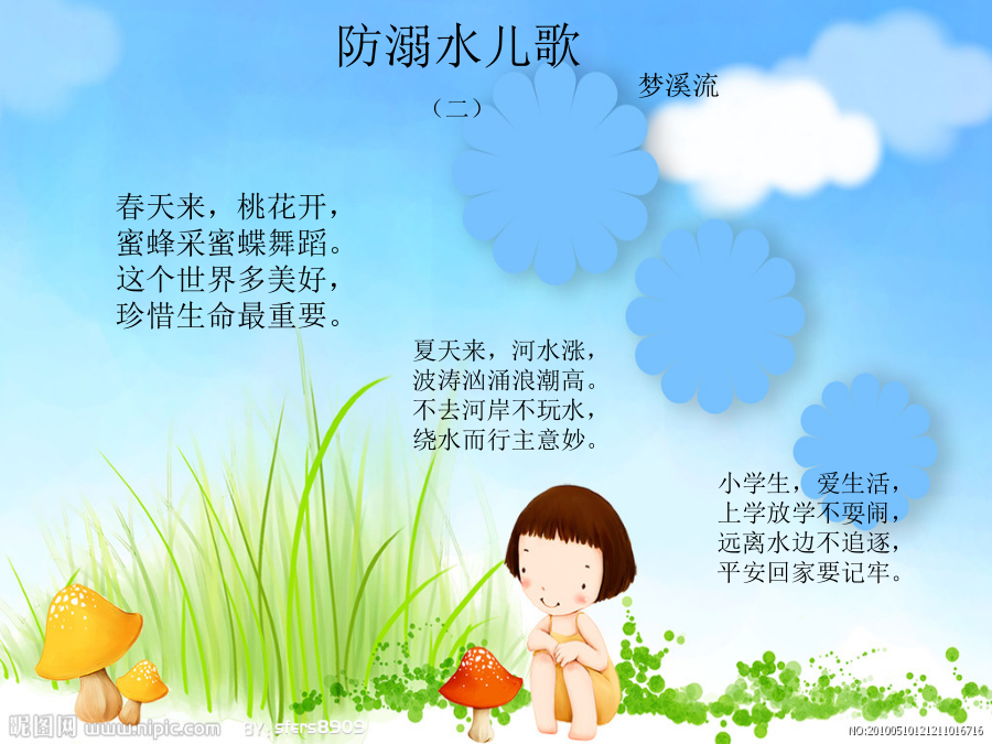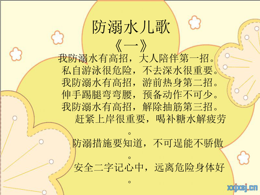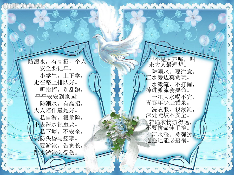 防溺水儿歌防溺水儿歌 防溺水儿歌 梦溪流防溺水,有高招,个人安全要记牢。小学生,上下学,走在路上排队好。听指挥,别乱跑,平平安安到家园;防溺水,有高招,大人陪伴最是好。私自游,很危险,不去深水很重要。私下塘,不安全,要防头昏与痉挛。要游泳,告家长,跳水潜泳会受伤。防溺水儿歌《一》防溺水安全知识防溺水安全知识防溺水儿歌