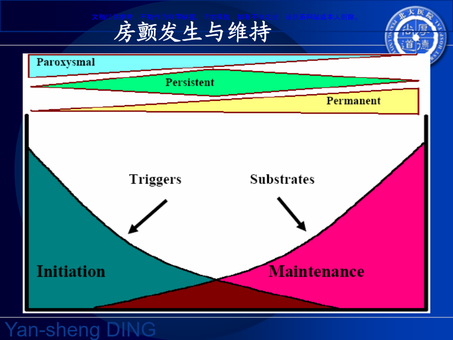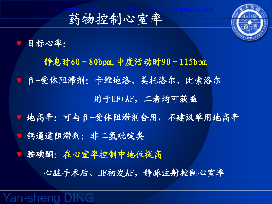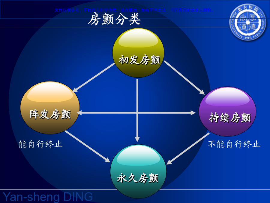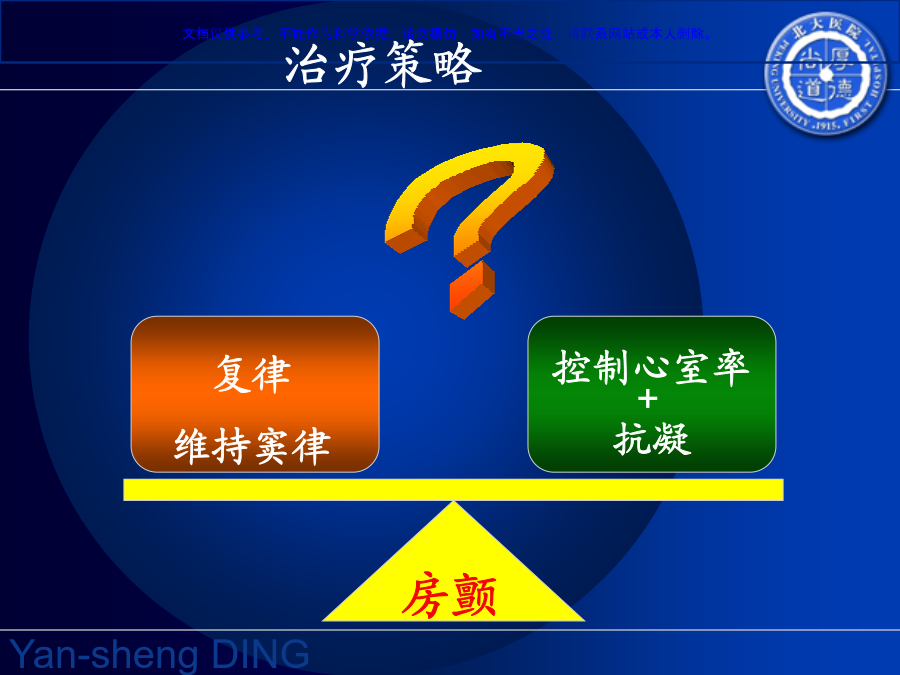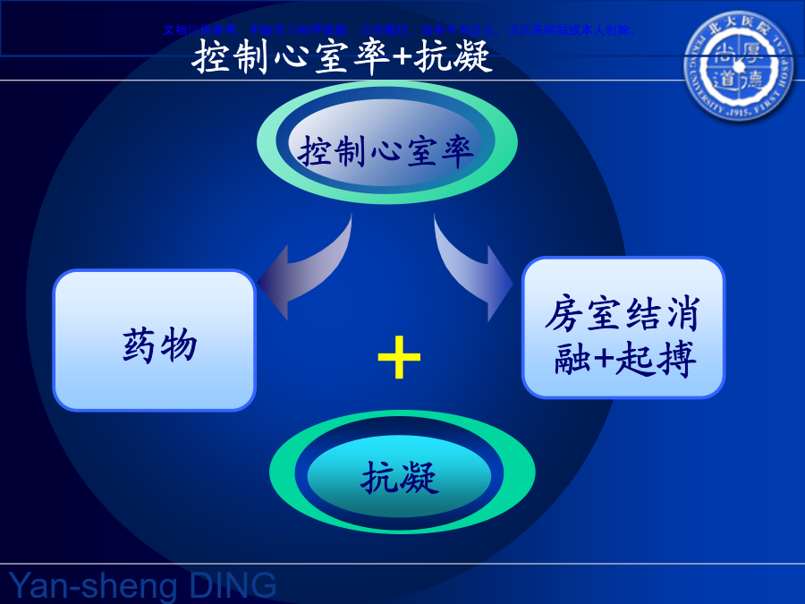 房颤分类房颤发生与维持复律 维持窦律控制心室率+抗凝药物控制心室率房颤是一种良性的心律失常?房颤危害房颤的发生率“一生”发生房颤的风险(%)Framingham心脏研究房颤卒中的严重程度卒中1年死亡率:有房颤者>无房颤者无症状脑栓塞(潜在危害?)房颤治疗的目标中国流调研究发病率抗凝治疗率近期心衰史CHF 高血压病史HP ≥75岁AGE 糖尿病DM 脑卒中TIAStroke JAMA2003;290:1049-1056Hartetal.AnnInternMed1999;131:492–501Hartetal.AnnInternMed1999;131:492–501Hartetal.AnnInternMed1999;131:492–501房颤抗凝治疗ACC/AHA/ESC2001版2006更新阿司匹林与华法林抗凝作用机制比较ACC/AHA/ESC制定的房颤抗凝治疗的指南对抗凝药物的选择应个体化,对每例患者评估其发生脑卒中和出血的风险,并评估风险-效益比例。 除非有禁忌症,对有脑卒中高危因素的患者,应长期口服抗凝药物,并调整剂量,使INR在2到3之间。 ACC/AHA/ESC房颤2006年指南与2001年指南抗凝原则比较2006年ACC/AHA/ESC房颤指南—卒中危险因素2006年房颤:目前的认识和治疗建议预防房颤血栓形成药物2006年ACC/AHA/ESC房颤指南—抗凝药物选择抗凝治疗强度与血栓和出血事件房颤中风危险分层房颤时间心律转复与抗凝研究概况严重出血判定与停用华法令原因CHADS2风险评估与卒中入选患者基线情况年龄、抗凝与出血并发症出血风险增高的因素不同年龄抗凝治疗的出血情况CHADS2评分与因出血而停用华法令华法令一高令患者应注意抗凝治疗小结ThankYou!