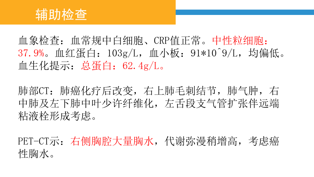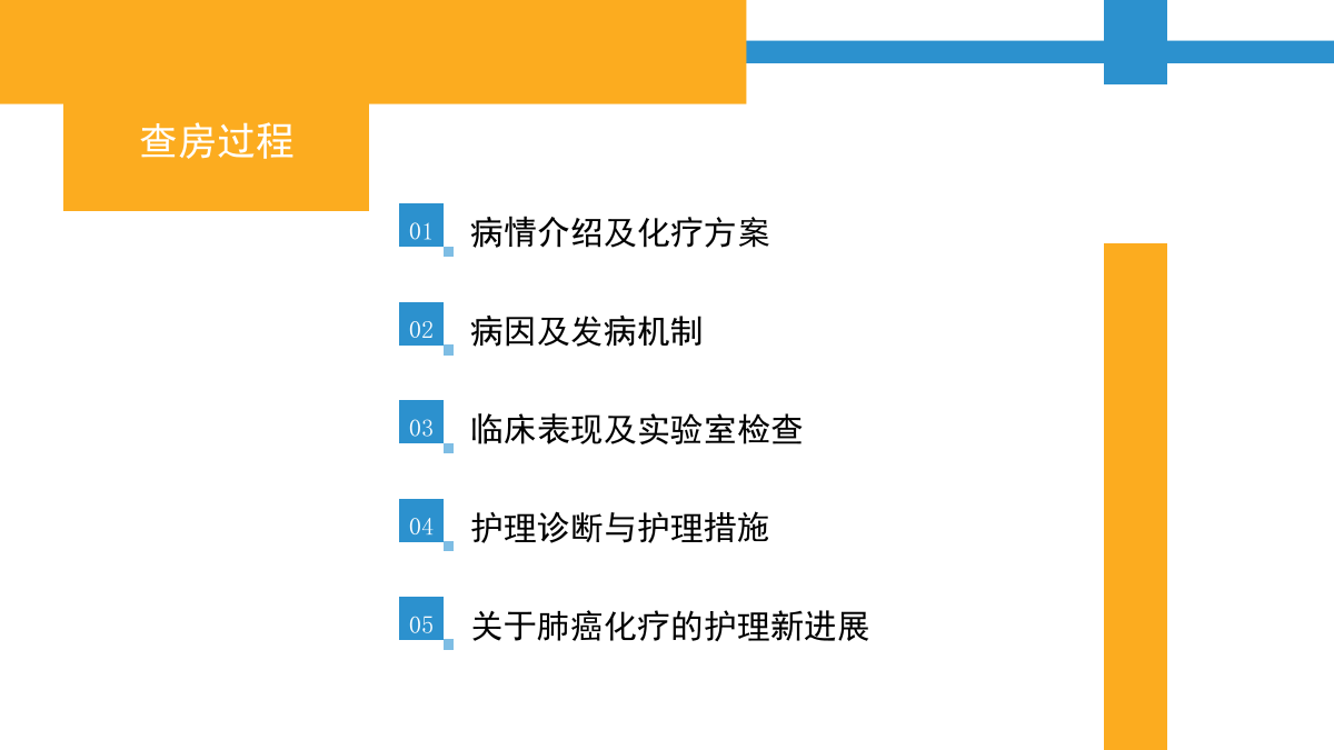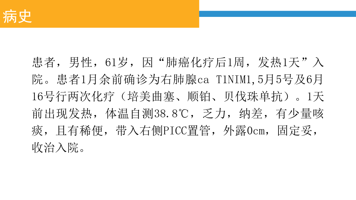 肺癌的医疗护理查房病史入院体检辅助检查肺癌常用化疗方案化疗方案原发性肺癌相关知识病因2、职业致癌因子 3、空气污染 4、电离辐射 5、饮食与营养 6、遗传与基因改变病理和分类肺癌外侵和转移症状2、上腔静脉综合症 是由于腔静脉被附近肿大的转移性淋巴结压迫或右上肺的原发肺癌侵犯,以及静脉内肺栓阻塞静脉回流引起,表现为头颈部水肿,颈静脉扩张,在前胸壁可见扩张的静脉侧支循环。 3、Horner综合症 肺尖部的肺癌易压迫颈部交感神经,引起病侧眼睑下垂,瞳孔缩小,眼球内陷,同侧额部和胸壁少汗和无汗。 4、消化道转移 表现为食欲减退、肝区疼痛等。查体时可发现肝脏肿大,质硬、结节感。 5、肾脏转移 表现为腰痛及肾功能不全。 6、骨转移 常见转移部位有肋骨,髂骨、股骨等,表现为局部为疼痛并有压痛、叩击痛。 7、中枢神经转移 可表现为颅内高压的症状如头疼,呕吐、精神异常。 临床表现针对该患者该提出哪些护理问题和护理措施呢?体温过高:与感染有关 1.可告知患者多饮水,温水擦浴 2.体温39℃以上,可选用物理降温或药物降温,可遵医嘱对病人进行消炎痛栓塞肛。行降温措施后30分钟后应测量体温。 3.每日测量体温4次,高热时每4小时测量1次,密切观察患者生命体征。 4.嘱患者多休息,补充营养和水分。 营养低于机体消耗量:与疾病消耗有关 1·评估患者的营养状况(皮脂厚度,总蛋白偏低情况等),制定合理的饮食计划。 2·饮食护理:指导高热量、高蛋白质、高维生素、易消化饮食,多吃蔬菜水果,避免刺激性饮食。 3·每周称体重,关注体重变化,遵医嘱定期检测血清白蛋白、血红蛋白等水平,以了解患者的营养状态。 4·关注患者有无化疗后恶心呕吐等反应,必要时遵医嘱使用护胃药、止吐药等 5·创造良好的进食环境,挑选符合患者口味的食物,增加食欲。 6·必要时遵医嘱静脉输注营养物质活动无耐力:与患者消耗性疾病有关。 1.鼓励患者适当活动,注意避免劳累,多休息。 2.化疗间歇期,要注意营养的摄入,多食高能量,高营养,易消化的食物,提高机体的抵抗力。化疗期间,鼓励患者多食清淡易消化的食物。 3、患者活动时,要预防跌倒,加强跌倒的健康宣教,告知家属或保姆阿姨24小时陪护。存在感染的危险:与化疗有关 1·严格执行无菌操作,接触病人前后应洗手 2·及时更换PICC敷料,保证无菌操作,密切观察针眼及周围皮肤情况。 3·及时关注炎症指标,遵医嘱使用合适的抗生素, 4·限制探视,尽量不要去人群密集处 有导管滑脱的危险处理措施: 根据脱落导管的原因采取相应的措施,查找原因,做好记录和交接班,防止再次脱管。 1导管部分脱出:观察导管脱出的长度,用无菌注射器抽回血,如无回血,报告医师,遵医嘱用尿激酶通管,如导管不通畅则拔管;如有回血,用生理盐水冲管保持通畅,重新固定,严禁将脱出的导管回送。 2导管完全脱出:测量导管长度,观察导管有无损伤或断裂;评估穿刺部位是否有血肿及渗血,用无菌棉签压迫穿刺部位,直到完全止血;消毒穿刺点,用无菌敷贴覆盖;评估渗出液性状、量;根据需要重新置管。 3导管断裂:如为体外部分断裂,可修复导管或拔管。如为体内部分断裂,立即报告医师并用止血带扎于上臂;如导管尖端已漂移置心室,应制动患者,协助医师在线透视下确定导管位置,以介入手术取出导管。 最后,院内网上报不良事件——护士长组织、讨论、分析——提出整改措施。最重要的还是要以预防为主。新进展爱朋全自动注药泵的使用故障处理故障处理使用时的注意事项