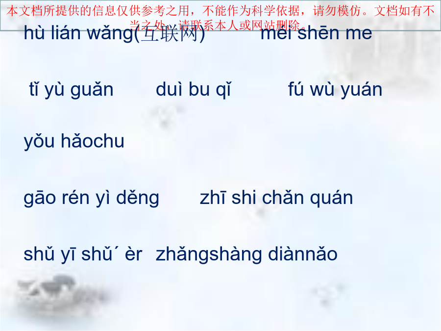 一、听后跟读hùliánwǎng(互联网) méishēnme tǐyùguǎn duìbuqǐ fúwùyuán yǒuhǎochu gāorényìděng zhīshichǎnquán shǔyīshǔˊèr zhǎngshàngdiànnǎo P31二lóu楼tǐyùɡuǎn体育馆chāoshì超市yínhánɡ银行shānɡchǎnɡ商场shítánɡ食堂túshūɡuǎn图书馆yóujú邮局