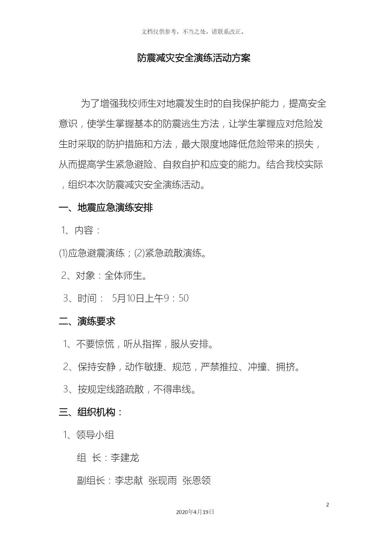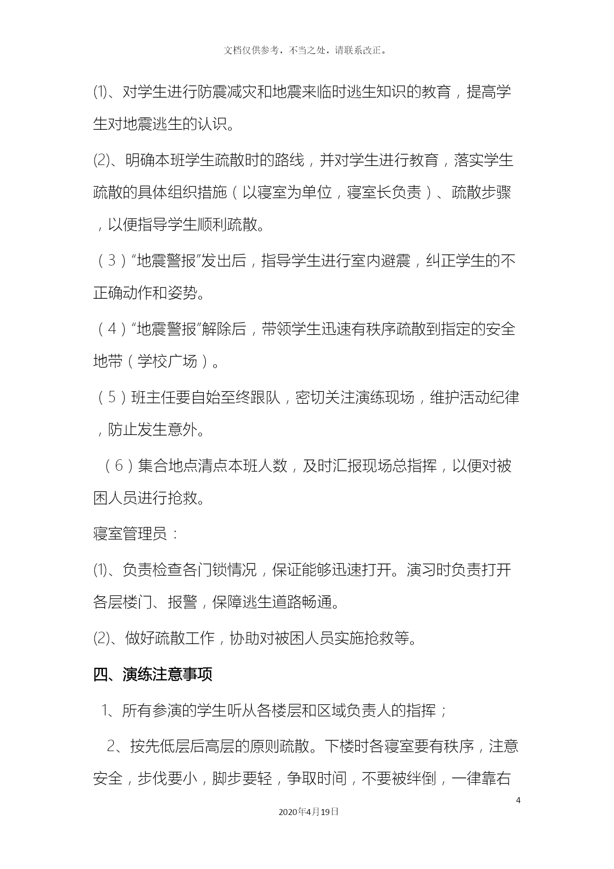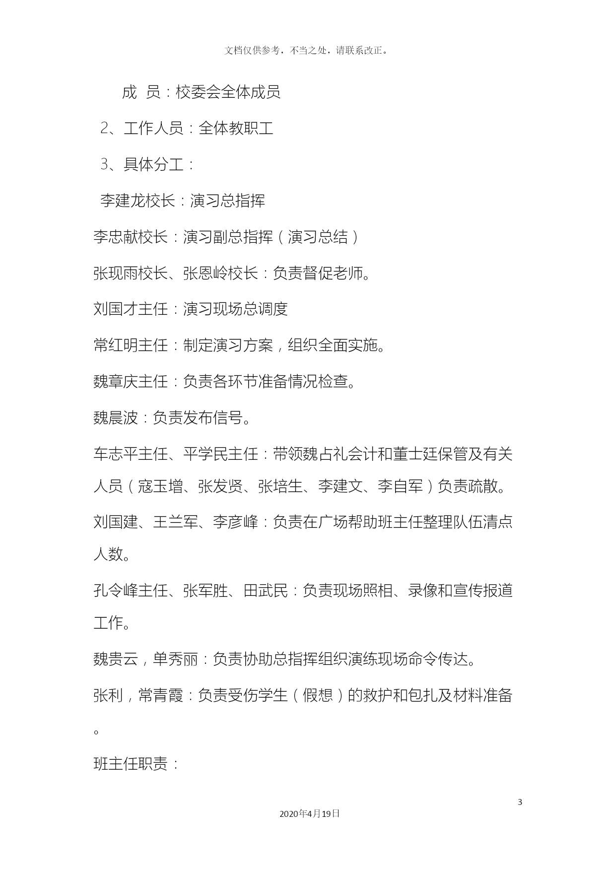 PAGE\*MERGEFORMAT9 2020年4月19日 防震减灾安全演练活动方案 文档仅供参考,不当之处,请联系改正。 防震减灾安全演练活动方案 为了增强我校师生对地震发生时的自我保护能力,提高安全意识,使学生掌握基本的防震逃生方法,让学生掌握应对危险发生时采取的防护措施和方法,最大限度地降低危险带来的损失,从而提高学生紧急避险、自救自护和应变的能力。结合我校实际,组织本次防震减灾安全演练活动。 一、地震应急演练安排 1、内容: (1)应急避震演练;(2)紧急疏散演练。 2、对象:全体师生。 3、时间:5月10日上午9:50 二、演练要求 1、不要惊慌,听从指挥,服从安排。 2、保持安静,动作敏捷、规范,严禁推拉、冲撞、拥挤。 3、按规定线路疏散,不得串线。 三、组织机构: 1、领导小组 组长:李建龙 副组长:李忠献张现雨张恩领 成员:校委会全体成员 2、工作人员:全体教职工 3、具体分工: 李建龙校长:演习总指挥 李忠献校长:演习副总指挥(演习总结) 张现雨校长、张恩岭校长:负责督促老师。 刘国才主任:演习现场总调度 常红明主任:制定演习方案,组织全面实施。 魏章庆主任:负责各环节准备情况检查。 魏晨波:负责发布信号。 车志平主任、平学民主任:带领魏占礼会计和董士廷保管及有关人员(寇玉增、张发贤、张培生、李建文、李自军)负责疏散。 刘国建、王兰军、李彦峰:负责在广场帮助班主任整理队伍清点人数。 孔令峰主任、张军胜、田武民:负责现场照相、录像和宣传报道工作。 魏贵云,单秀丽:负责协助总指挥组织演练现场命令传达。 张利,常青霞:负责受伤学生(假想)的救护和包扎及材料准备。 班主任职责: (1)、对学生进行防震减灾和地震来临时逃生知识的教育,提高学生对地震逃生的认识。 (2)、明确本班学生疏散时的路线,并对学生进行教育,落实学生疏散的具体组织措施(以寝室为单位,寝室长负责)、疏散步骤,以便指导学生顺利疏散。 (3)“地震警报”发出后,指导学生进行室内避震,纠正学生的不正确动作和姿势。 (4)“地震警报”解除后,带领学生迅速有秩序疏散到指定的安全地带(学校广场)。 (5)班主任要自始至终跟队,密切关注演练现场,维护活动纪律,防止发生意外。 (6)集合地点清点本班人数,及时汇报现场总指挥,以便对被困人员进行抢救。 寝室管理员: (1)、负责检查各门锁情况,保证能够迅速打开。演习时负责打开各层楼门、报警,保障逃生道路畅通。 (2)、做好疏散工作,协助对被困人员实施抢救等。 四、演练注意事项 1、所有参演的学生听从各楼层和区域负责人的指挥; 2、按先低层后高层的原则疏散。下楼时各寝室要有秩序,注意安全,步伐要小,脚步要轻,争取时间,不要被绊倒,一律靠右走,防止拥挤和慌乱。所有疏散的寝室撤离宿舍楼后,到广场集合。 3、楼层疏导老师要逐个寝室下达撤离指令,指导学生疏散方向,并控制合理密度,防止在走廊楼梯口等部位发生拥挤、踩踏事故。 4、参加演练的学生不准乱跑、乱喊,不准打闹拥挤,以免造成恐慌和混乱局面。 5、疏散组织人员应了解参加演习的学生可能存在的逃生本能心理反应,及时采取措施,防止意外发生。 五、演习前准备工作: 1、每班班主任掌握本班学生名单,明确本班学生每个寝室疏散路线和疏散方向。 2、后勤准备救护物品(工具和药品)。 3、全体教师明白自己位置和职责。 4、手提喇叭交由魏贵云,单秀丽。 六、演练程序 (一)启动程序(总指挥经过学校广播):各位老师、各位同学,王庄镇初级中学地震应急疏散演练马上就要开始,请大家做好准备,各就各位。班主任带领本班学生到各自宿舍。(5分钟) (二)教室内应急避震演练(演练时间为1分钟) 1、信号员发出“地震警报”信号(拉响警报:第一次演练警报声持续时间1分钟,以后,警报声逐步缩短至十多秒,接近6级左右地震发生时的实际震动持续时间)。 2、寝室管理员马上打开寝室扩音器,转而成为寝室演练负责人,立即告知学生“地震来了,不要慌惊,马上避险。”并指挥学生迅速抱头、闭眼,躲在各自的床下或墙角,尽量蜷曲身体,降低身体重心,并尽可能用被子保护头部,将一个胳膊弯起来保护眼睛不让碎玻璃击中,另一只手用力抓紧床腿。在墙角躲避时,把双手交叉放在脖子后面保护自己的头部和颈部,闭上眼睛和嘴,用鼻子呼吸。在寝室的班主任逐个寝室查看。 3、1分钟后,信号员发出解除“地震警报”信号(关掉警报声或变更警报声)。 4、寝室管理员迅速告知学生:“地震已过,现在撤离寝室,紧急疏散演练”。楼层疏导员转而告知各寝室。 (三)紧急疏散演练(疏散演练时间3─5分钟) 1、当信号员发出解除“地震警报”信号(关掉警报声或变更警报声)后,学生在班主任带领下有秩序从寝室向下撤离,班主任控制疏散速度,人员密度,并按照预定的疏散路线,迅速