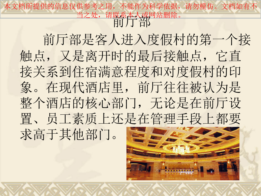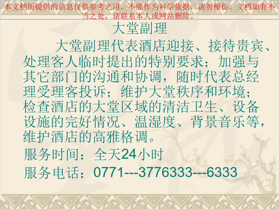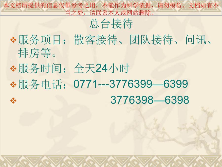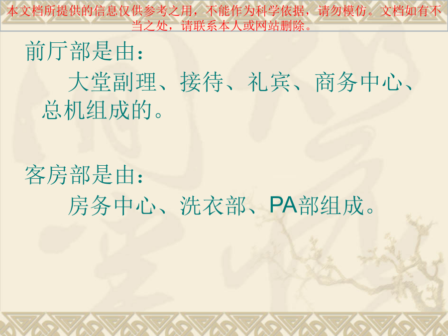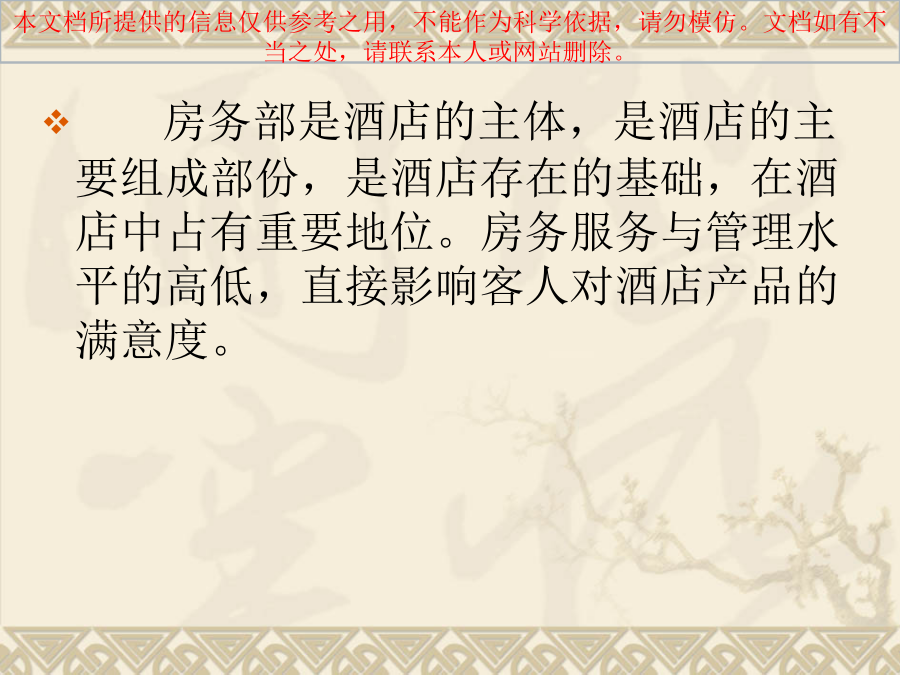 前厅部是由: 大堂副理、接待、礼宾、商务中心、总机组成的。 客房部是由: 房务中心、洗衣部、PA部组成。 房务部是酒店的主体,是酒店的主要组成部份,是酒店存在的基础,在酒店中占有重要地位。房务服务与管理水平的高低,直接影响客人对酒店产品的满意度。 前厅部 前厅部是客人进入度假村的第一个接触点,又是离开时的最后接触点,它直接关系到住宿满意程度和对度假村的印象。在现代酒店里,前厅往往被认为是整个酒店的核心部门,无论是在前厅设置、员工素质上还是在管理手段上都要求高于其他部门。 大堂副理 大堂副理代表酒店迎接、接待贵宾、处理客人临时提出的特别要求;加强与其它部门的沟通和协调,随时代表总经理受理客投诉;维护大堂秩序和环境;检查酒店的大堂区域的清洁卫生、设备设施的完好情况、温湿度、背景音乐等,维护酒店的高雅格调。 服务时间:全天24小时 服务电话:0771---3776333---6333总台接待 服务项目:散客接待、团队接待、问讯、排房等。 服务时间:全天24小时 服务电话:0771---3776399—6399 3776398—6398礼宾部 服务项目:行李接待、问讯服务、订车服务、印制名片、订花服务、冲洗胶卷、接站服务、其他委托代办。 服务时间:全天24小时 服务电话:0771---3776392---6392总机 服务项目:转接电话、代挂外线、叫醒服务、留言服务、免打扰服务、开关机服务、提供各种问询、转告紧急通知、对骚扰电话的监督与控制。 服务时间:24小时 服务电话:0771---3776888---0商务中心 服务项目:旅游预订、订票服务、邮寄服务、复印、打印、传真、上网、拨打DDD/IDD长途电话服务等及客户、会场、餐饮预订。 服务时间:8:00___24:00 服务电话:0771---3776393---6393客房部 客房是由主楼和别墅(二期)组成,主楼共有客房128间,其中豪华套房9间,豪华单人房53间,高级双人房66间;总床位194个。客房格调高雅,设施设备齐全先进,提供免费宽带上网服务,所有房间均可拨打国内外长途电话; 房务中心 作为对客服务信息的收发中心,服务指令、重要信息及时准确地传递。提供鲜花服务(需提前6小时预订)、洗衣服务、失物招领、免费擦鞋及提供婴儿床服务、客房用品、手机充电器、常用药品服务等。 服务时间:全天24小时 服务电话:0771—3776202---6666 3776203---5555洗衣部 洗衣部负责度假村所有布草和员工制服的洗涤熨烫工作,配备了先进的水洗、烘干、熨烫等专业设备,能为客人提供高质量的干洗、湿洗、除渍、熨烫等服务。 PA部 PA部负责整个度假村的清洁工作和玻璃、地毯、大理石等设备设施的日常保养工作,公共卫生间及度假村所有公共区域的维护保养工作。一、房务部的地位和作用2、客房是酒店的主体 按客房和餐位的一般比例,在酒店建筑面积中,客房占70%-80%,酒店的固定资产也绝大部份在客房,酒店经营活动所必需的各种物质设备和物料用品,也大部份在客房,所以说客房是酒店的主要组成部分。 3、酒店的等级水平主要是由客房水平决定的 因为人们衡量酒店的等级水平,主要依据酒店的设备和服务。设备无论从外观、数量或是使用来说,都主要体现在客房,旅客在客房的时间较长,因而客房的设施设备和服务常常被人们当做衡量酒店等级水平的标准。客房服务水平包括两个方面:硬件服务和软件服务。硬件设备如:家具、电器、墙壁和地面装饰等。软件是指服务人员的工作态度,服务技巧和服务方法等。4、是度假村经济收入的重要来源。5、客房服务质量是酒店服务质量的重要标志6、客房是带动酒店一切经济活动的枢纽二、房务管理的主要任务2、为酒店创造清洁优雅的环境3、为各部门提供洁净美观的棉织品 客房部设有布草房和洗衣房,负责整个酒店各部门的布件和员工制服的选购、洗涤、保管发放、缝补熨烫等,为全酒店的对客服务提供保障。三、房务部的业务特点2、复杂性 客房部的工作范围广,涉及内容复杂,除了要保持客房的清洁安全外,还要对整个酒店的环境卫生、装饰绿化、设备保养、布草制服的洗涤保管等。客房部拥有的员工数量、管理的物质设备比酒店其他部门多,因此管理起来相当复杂。另外客房的服务对象是来自世界各地的千差万别的客人,要使他们在住店的时间内保持满意困难度相当大,因此,客房管理是一件相当复杂的事情。3、不易控制性 客房部管辖的人、财、物及工作岗位之多在酒店是位居首位的。首先是大多数工作人员的工作环境具有相对的独立性,不利于管理人员的督察;所以客房部加强对员工素质和自我管理的培训是很重要的。