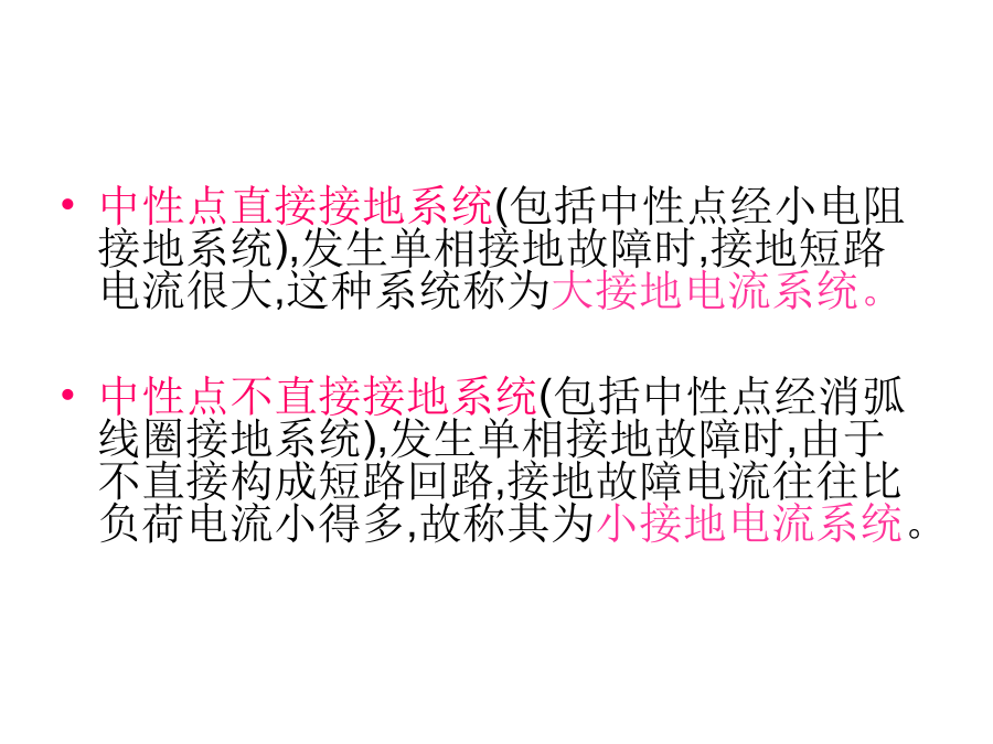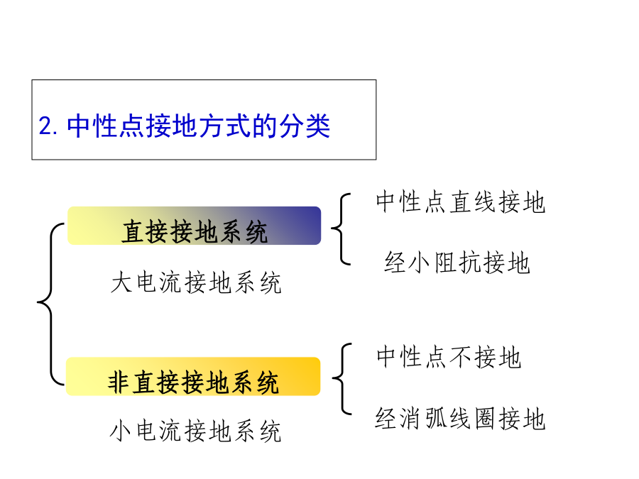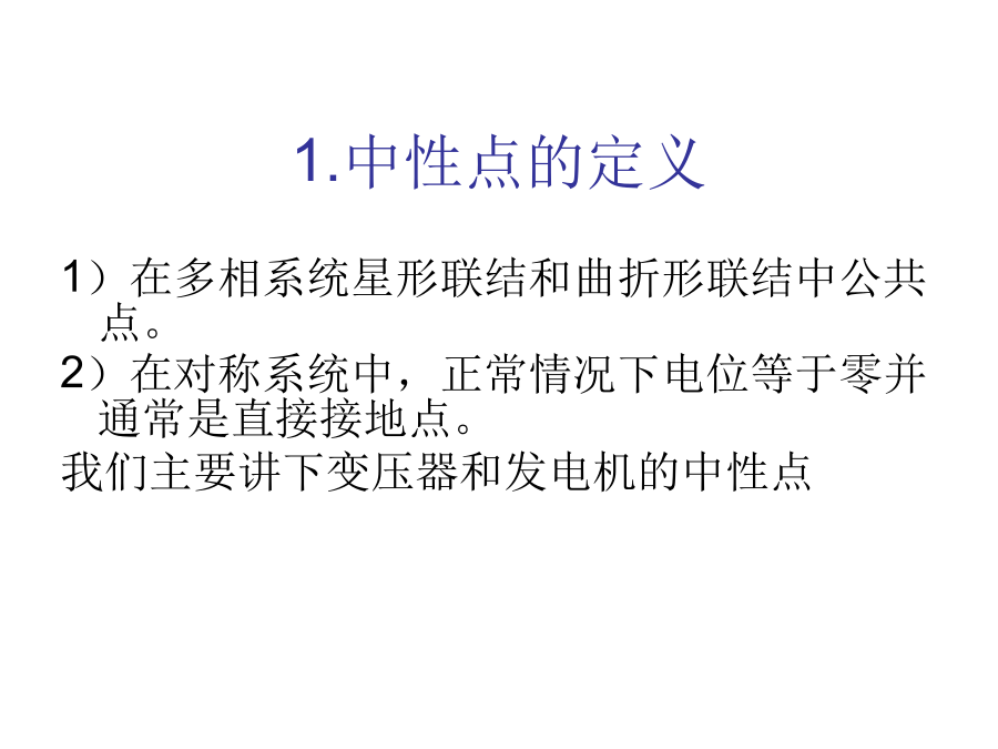 发电机和变压器的中性点1.中性点的定义中性点直接接地系统(包括中性点经小电阻接地系统),发生单相接地故障时,接地短路电流很大,这种系统称为大接地电流系统。 中性点不直接接地系统(包括中性点经消弧线圈接地系统),发生单相接地故障时,由于不直接构成短路回路,接地故障电流往往比负荷电流小得多,故称其为小接地电流系统。 非直接接地系统两中接地方式在单相接地故障时的区别大电流接地系统中单相接地故障的电压变化各接地方式的特点: 1)中性点直接接地 2)中性点不接地 3)中性点经消弧线圈接地 4)中性点经电阻接地1)中性点直接接地2)中性点不接地2)中性点不接地3)中性点经消弧线圈接地4)中性点经电阻接地各个电压等级变压器中性点接地方式 我厂变压器中性点的接地方式#1#2主变 我厂主变高压侧是220KV,从上图中也可以看出我厂主变中性点是经接地刀闸直接接地#01启备变 我厂启备变高压侧是220KV,低压侧是6.6KV.从图中可看出我厂启备变高压侧中性点是直接接地,低压侧中性点是经高阻接地。高厂变低厂变变压器中性点保护3、零序电流保护、间隙零序保护避雷器保护的关系中性点接地闸刀操作注意事项两台变压器运行有一个中性点接地原因?几台变压器能不能用一根中线接地?几台变压器能不能用一根中线接地?变压器中性点直接接地时,为什么要在接地点加一组接地开关,它的作用是什么?为什么#1主变高压侧中性点装有接地刀闸的同时还安装有放电间隙?220KV、10KV、6KV、400V系统接地保护是怎么配置的?并说出各接地保护的动作结果?③6KV系统为中性点经高电阻接地系统,各馈线上装有零序过流保护,动作于发信;母线上还装有发信的零序过电压保护。 ④400V系统为中性点直接接地系统,装有零序过流保护,只发信,不跳闸。 发电机中性点运行方式发电机中性点采用不同接地方式的原因和目的 发电机中性点接地方式1.高电阻接地另一种是采用配电变压器接地,在变压器二次线圈串接电阻器,由于变压器的作用,实际选用二次侧电阻值可以很小,转换到一次侧相当于高电阻接地,当配电变接在发电机主引出回路,需三台单相变压器,一次绕组接成星形与发电机相联,二次侧和电阻接成串联回路;当配电变接在发电机中性点回路,仅需一台单相配电变压器,这种形式接地即通常所称的配电变压器高阻接地方式,应用较多。 高阻接地的第一种类型,存在一定的问题。在电压互感器上可能反映整个回路任何部位的接地故障,包括互感器的低压绕组、连接线、发电机绕组,作用跳闸或报警,可能因此失去应有的选择性。另一方面,高压系统的过电压也可能作用于电压互感器,有引起接地故障指示的危险。高压侧接地故障引起的部分零序电压,经升压变压器的电容效应,分压传递到低压侧,其数值的大小取决于变压器变比、高压侧接地方式、故障点位置、变压器中性点接地与否、发电机及变压器的电容量等因素。第二种高阻接地类型发电机中性点经高阻接地柜发电机中性点不接地和直接接地发电机中性点不接地和直接接地3、中性点经单相电压互感器接地中性点经单相电压互感器接地