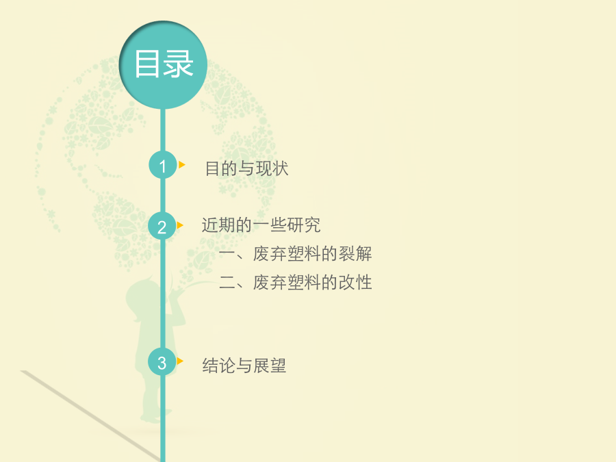 废弃塑料的低温裂解-目前塑料垃圾的处理方法一、废弃塑料的裂解(一)单品塑料的裂解:LDPE1、LDPE裂解后的装置图2、不同工艺参数的影响(2)反应器搅拌速度3、LDPE裂解实验的结论(二)多种废弃塑料混合的裂解:PET+PS1、实验分析2、实验数据及总结2、PET+PS混合物降解的实验结论二、废弃材料的改性(一)多种塑料的PP+PE1、实验分析2、有无添加剂和增溶剂的比较无增溶剂和添加剂有增溶剂和添加剂3、增溶剂与添加剂的作用