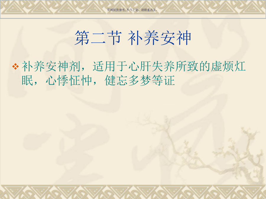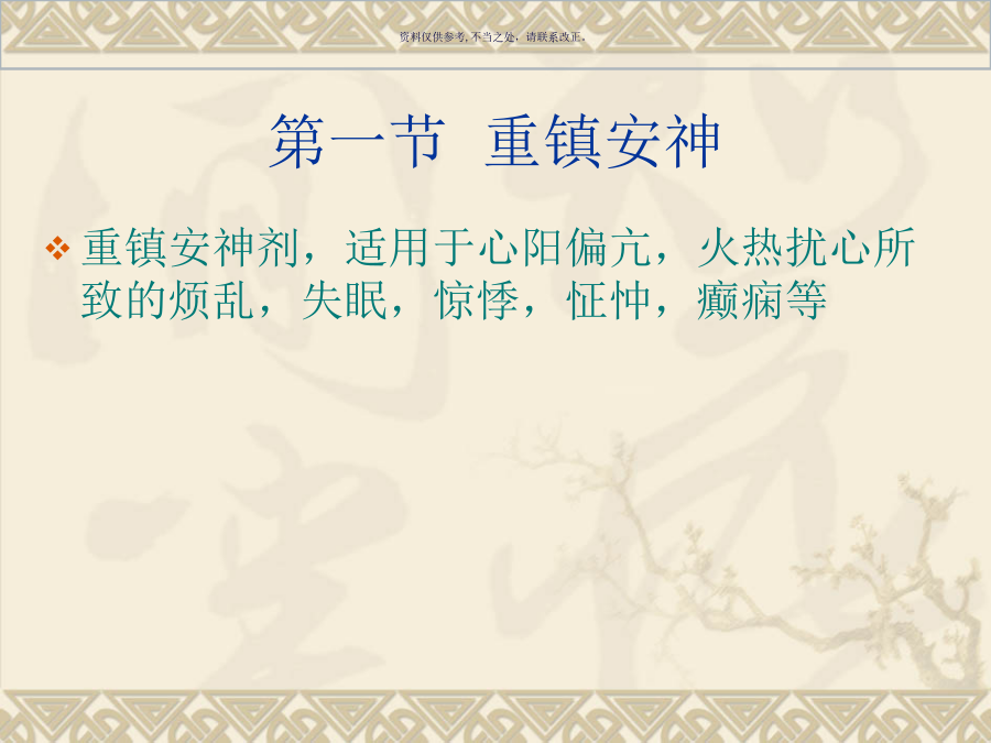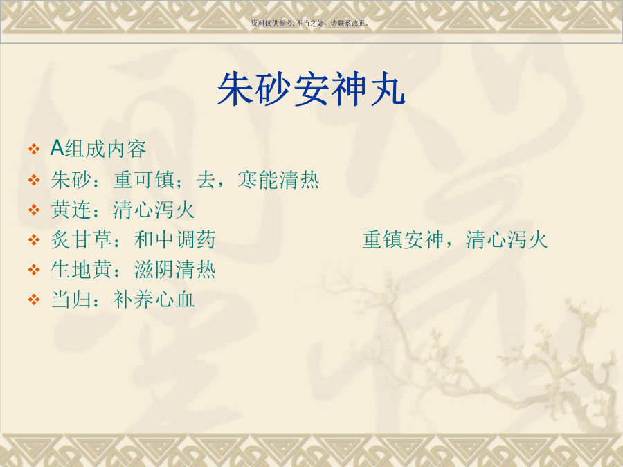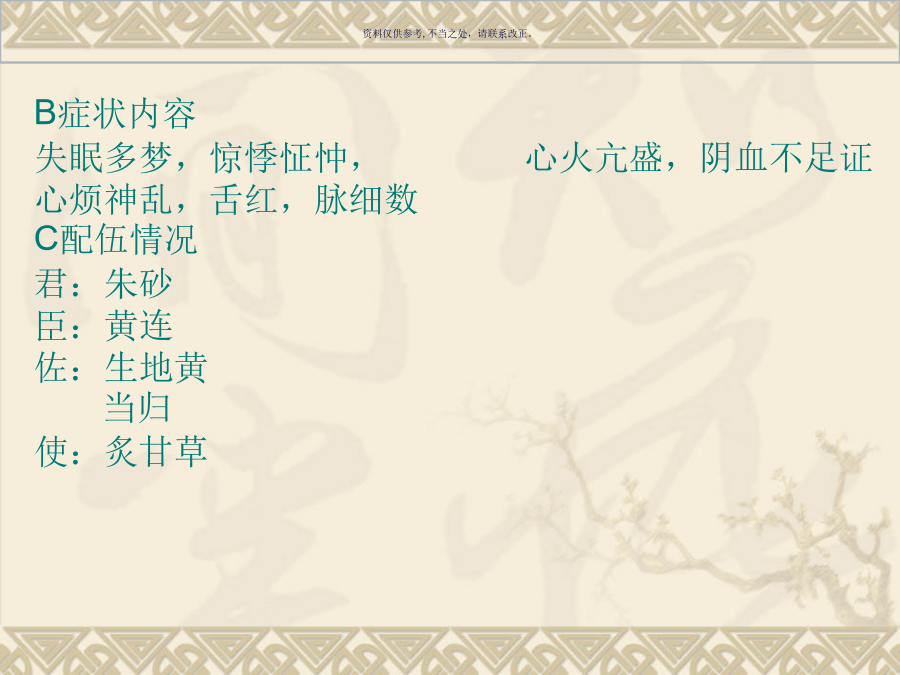 第十三章安神剂第一节重镇安神朱砂安神丸B症状内容 失眠多梦,惊悸怔忡,心火亢盛,阴血不足证 心烦神乱,舌红,脉细数 C配伍情况 君:朱砂 臣:黄连 佐:生地黄 当归 使:炙甘草第二节补养安神天王补心丹B症状内容 心悸失眠,虚烦神疲,梦遗健忘, 手足心热,口舌生疮,舌红少苔,阴虚血少,神志不安证 脉细而数 C配伍情况 君:生地黄 臣:天门冬 麦门冬 酸枣仁 柏子仁 当归身 佐:人参 五味子 白茯苓 远志 玄参 丹参 使:桔梗 【方歌】 天王补心柏枣仁,二冬生地与归身; 三参桔梗朱砂味,远志茯苓共养神酸枣仁汤B症状内容 失眠心悸,虚烦不安, 头目眩晕,咽干口燥,虚烦不眠证 舌红,脉弦细 C配伍情况 君:酸枣仁 臣:茯苓 知母 佐:川芎 使:甘草甘麦大枣汤B症状内容 精神恍惚,常悲伤欲哭, 不能自主,心中烦乱,脏躁 睡眠不安,其则言行失常, 呵欠频作,舌淡红苔少,脉细微数 C配伍情况 君:小麦 臣:甘草 佐:大枣