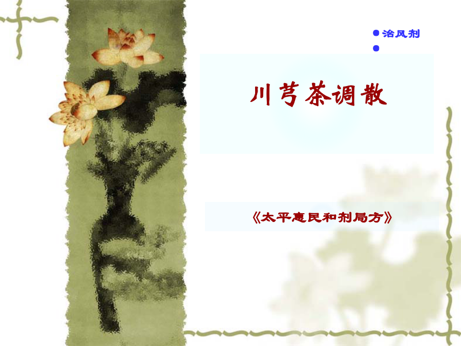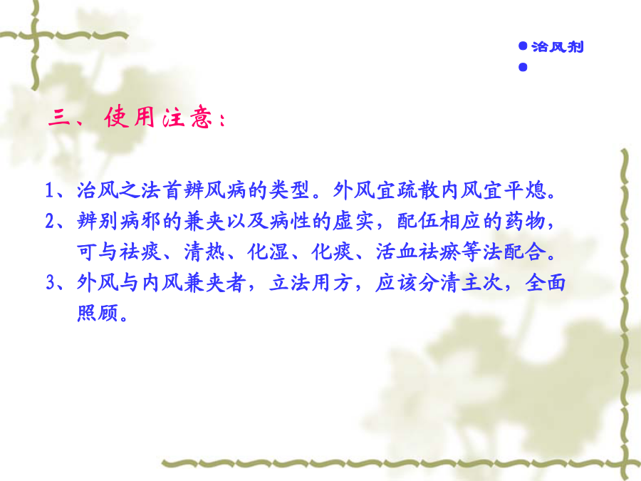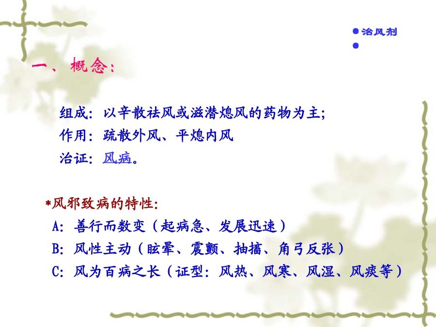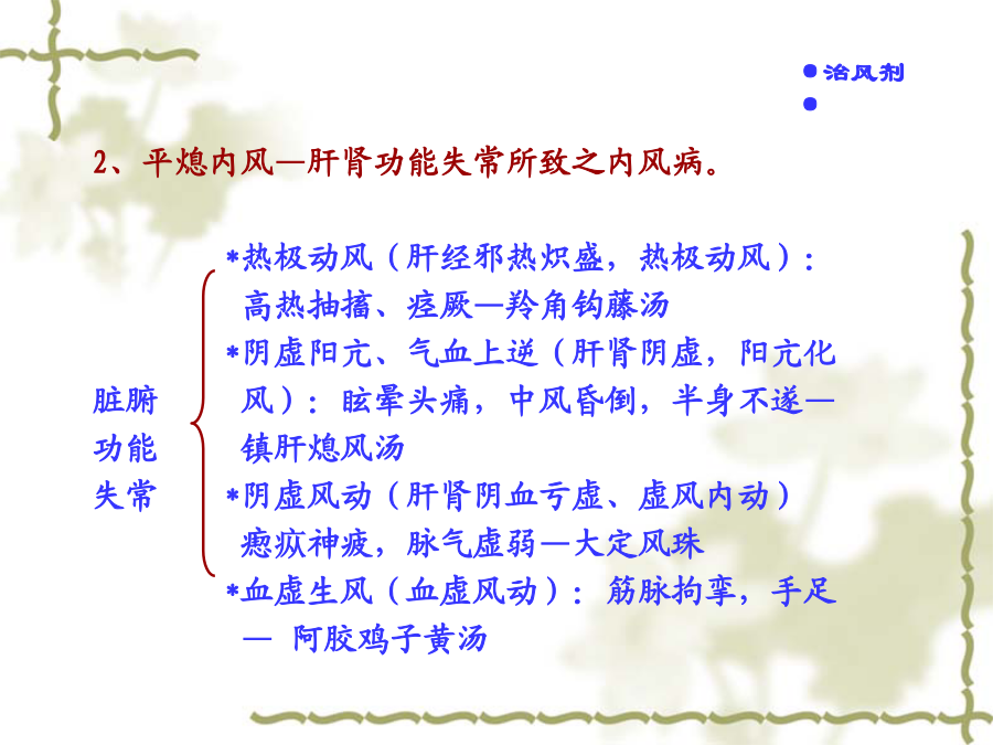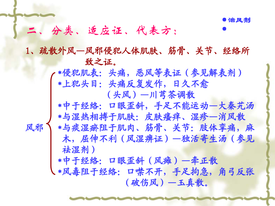 一、概念:组成:以辛散祛风或滋潜熄风的药物为主;作用:疏散外风、平熄内风治证:风病。*风邪致病的特性:A:善行而数变(起病急、发展迅速)B:风性主动(眩晕、震颤、抽搐、角弓反张)C:风为百病之长(证型:风热、风寒、风湿、风痰等)二、分类、适应证、代表方: 1、疏散外风—风邪侵犯人体肌肤、筋骨、关节、经络所 致之证。 *侵犯肌表:头痛,恶风等表证(参见解表剂) *上犯头目:头痛反复发作,日久不愈 (头风)—川芎茶调散 *中于经络:口眼歪斜,手足不能运动—大秦艽汤 *与湿热相搏于肌肤:皮肤瘙痒、湿疹—消风散 风邪*与痰湿瘀阻于肌肉、筋骨、关节:肢体挛痛,麻 木,屈伸不利(风湿痹证)—独活寄生汤(参见 祛湿剂) *中于经络:口眼歪斜(风瘫)—牵正散 *风毒阻于经络:口噤不开,手足拘急,角弓反张 (破伤风)—玉真散。 2、平熄内风—肝肾功能失常所致之内风病。 *热极动风(肝经邪热炽盛,热极动风): 高热抽搐、痉厥—羚角钩藤汤 *阴虚阳亢、气血上逆(肝肾阴虚,阳亢化 脏腑风):眩晕头痛,中风昏倒,半身不遂— 功能镇肝熄风汤 失常*阴虚风动(肝肾阴血亏虚、虚风内动) 瘛疭神疲,脉气虚弱—大定风珠 *血虚生风(血虚风动):筋脉拘挛,手足 —阿胶鸡子黄汤三、使用注意: 1、治风之法首辨风病的类型。外风宜疏散内风宜平熄。 2、辨别病邪的兼夹以及病性的虚实,配伍相应的药物, 可与祛痰、清热、化湿、化痰、活血祛瘀等法配合。 3、外风与内风兼夹者,立法用方,应该分清主次,全面 照顾。 川芎茶调散 【主治】外感风邪头痛证或头风头痛证。 循经上犯头目:偏正头痛,或巅顶作痛; 袭表,邪正交争:恶寒发热,目眩,鼻塞; 风邪外袭之征:舌苔薄白,脉浮。 【病机】风邪循经上犯头目,阻遏清阳。 【治法】疏风止痛。 【方解】 君:川芎—祛风活血,通络止痛。尤善治 少阳、厥阴经头痛。 臣:羌活—祛风止痛;善治太阳经头痛。 白芷—祛风止痛;善治阳明经头痛。 佐:细辛—辛散搜风,散寒止痛,通鼻窍, 并治少阴经头痛。 薄荷—辛散疏风,清利头目。 荆芥、防风—疏风止痛。 清茶—苦寒清上降下,清利头目,且 制约诸祛风药之温燥、升散。 使:甘草—调和诸药。【临床应用】 1、本方为治疗外感风邪头痛的常用方。*《名医论方》 2、辨证要点:头痛,鼻塞,脉浮等。 3、临证加减: 若头痛属风寒者,可重用川芎,并酌加苏叶、生姜等以加强祛风散寒之功; 若头痛久而不愈者,可加全蝎、僵蚕、桃仁、红花等以搜风活血止痛。 4、现代运用:血管神经性头痛、慢性鼻炎、鼻窦炎所引起的头痛,属风邪上犯者。 5、现代研究:本方具有镇痛、镇静、抗炎、解热、抗缺氧能力等作用。 大秦艽汤【组成】 秦艽(三两)川芎独活 当归白芍石膏 甘草(各二两)羌活防风 白芷黄芩白术 茯苓生地熟地(各一两) 细辛(半两) 【用法】【主治】风邪初中经络证。 气血痹阻,筋脉失养:口眼歪斜,舌 络脉空虚强不能言语,手足不能运动; 正邪相争,营卫不和:恶寒发热,肢 风邪入中节疼痛; 风邪郁而化热:苔黄。 【病机】正气不足,络脉空虚,风邪乘虚入中经络。 【治法】祛风清热,养血活血。 【方解】 君:秦艽—祛风清热,通经活络。 臣:羌活、独活 防风、白芷、细辛 佐:当归、白芍 熟地、川芎 白术、茯苓—益气健脾以化生气血,寓扶正御风。 生地、石膏、黄芩—清泄郁热,制祛风药之温燥。 使(兼):甘草—和中、调药。【临床应用】 1、本方适用于风邪初中经络之证。*《名医论方》 2、辨证要点: 口眼歪斜,舌强不语,手足不能运动等病程较短,并兼有表证。 3、临证加减: 若无内热,可去黄芩、石膏、生地等清热之品; 若夹痰湿,去生地、石膏、加陈皮、胆南星 若阴天,多湿气,故加生姜以祛风散湿; 若心下痞属于气滞者,加枳实以行气消痞。 4、现代运用: 面神经麻痹、脑血栓形成、脑血管痉挛、脑出血性中风、脑缺血性中风、类风湿性关节炎等属风中经络者。消风散 【主治】风疹、湿疹。 *有谓:风性“善行而数变”、“风胜则动”、“痒自来”。 毒湿郁于肌肤、腠理之间:皮肤斑疹色红,瘙痒; 湿热浸淫:斑疹抓破后渗出津水,或遍身云片斑点; 病邪尚浅:舌苔白或黄,脉浮数有力。 【病机】风毒与湿热相搏,浸淫血脉, 郁于肌肤腠理。 【治法】疏风养血,清热除湿。 【方解】 君:荆芥、防风疏风散邪而止痒。 牛蒡子、蝉蜕(止痒必先疏风) 臣:苍术—祛风燥湿 苦参—清热燥湿除湿清热 木通—渗利湿热 佐:石膏、知母—清热泻火。 当归、生地、胡麻仁—滋阴润燥,养血活血; (“治风先治血,血行风自灭”)。 使:生甘草—清热解毒,调和诸药。 【临床应用】 1、本方是治疗风疹、湿疹的常用方剂。 2、辨证要点: 皮肤疹出色红,瘙痒,或抓破渗出