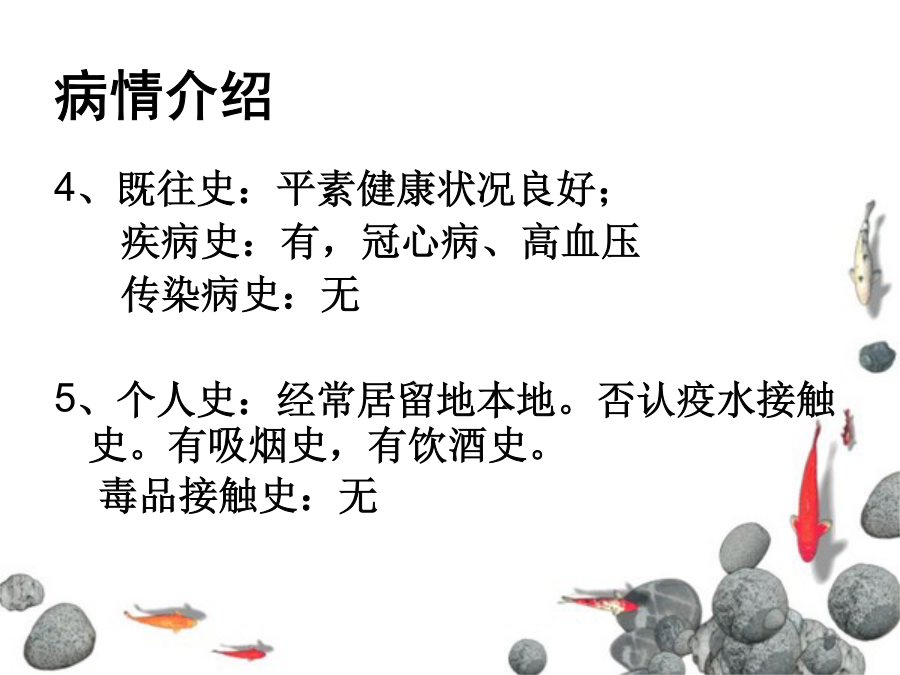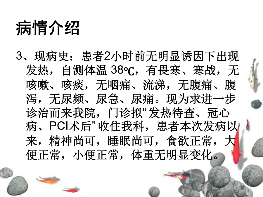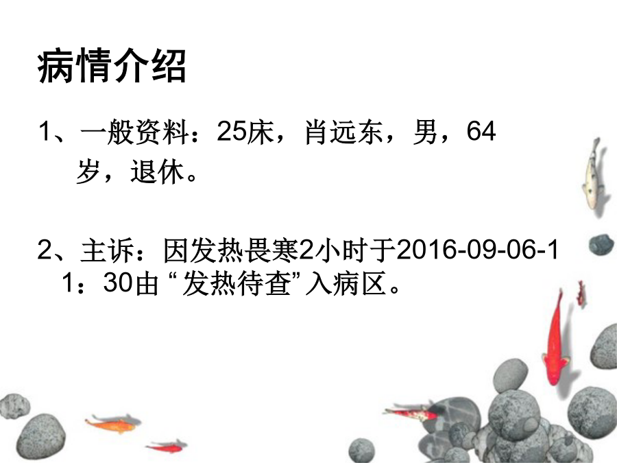 发热病人的医疗护理查房病情介绍病情介绍病情介绍病情介绍病情介绍——体格检查病情介绍——辅助检查病情介绍——入院治疗入院护理诊断护理措施住院治疗简要过程相关知识学习定义分类——发热程度分类——常见热型发热的分期发热治疗体温测量注意事项分期护理要点护理要点护理要点护理谢谢聆听!