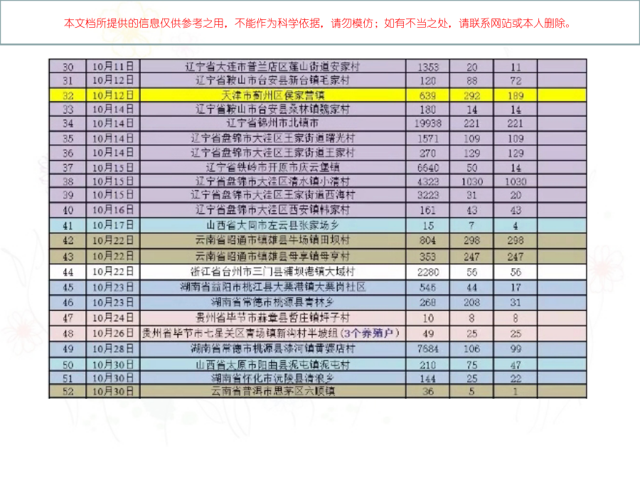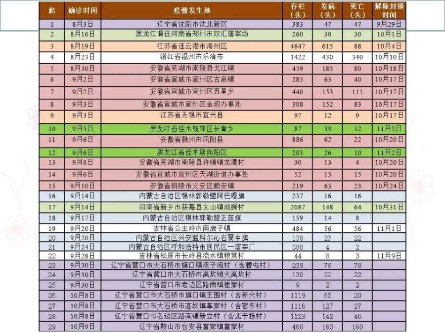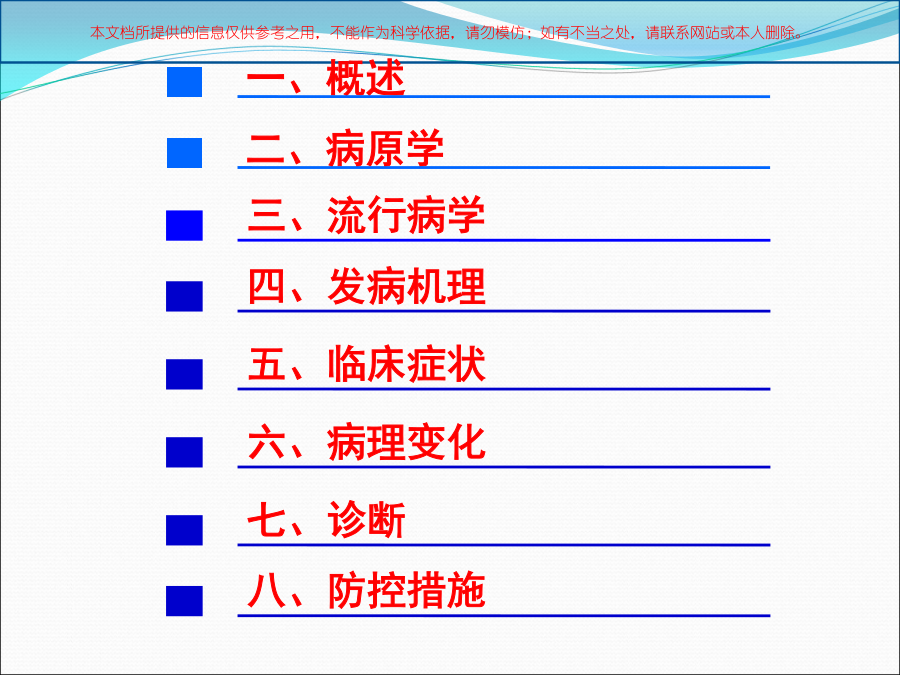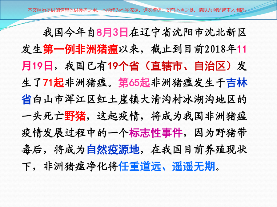 一、概述一、概述我国今年自8月3日在辽宁省沈阳市沈北新区发生第一例非洲猪瘟以来,截止到目前2018年11月19日,我国已有19个省(直辖市、自治区)发生了71起非洲猪瘟。第65起非洲猪瘟发生于吉林省白山市浑江区红土崖镇大清沟村冰湖沟地区的一头死亡野猪,这起疫情,将成为我国非洲猪瘟疫情发展过程中的一个标志性事件,因为野猪带毒后,将成为自然疫源地,在我国目前养殖现状下,非洲猪瘟净化将任重道远、遥遥无期。猪科动物和蜱(钝缘蜱)是ASFV的易感动物,家猪和欧洲野猪高度易感,死亡率100%,无明显的品种、年龄和性别差异。疣猪、薮猪等非洲本土野猪感染后无临床症状,可作为ASFV的储存宿主使病毒在自然界长期存在。蜱类是重要的储存宿主和传播媒介。钝缘蜱非洲猪瘟全球分布图1921年:东部非洲的肯尼亚首次确认非洲猪瘟疫情。 2001年前:发生ASF的国家37个(非洲27、欧洲8、美洲2)。 2001年后:发生ASF的国家28个(非洲23、欧洲5)(俄罗斯、意大利、阿塞拜疆、格鲁吉亚、亚美尼亚)。 2007年:东欧—格鲁吉亚、亚美尼亚、俄罗斯。全球疫情形势严峻非洲猪瘟病毒科中唯一成员。 ASFV只有1个血清型,是唯一一种节肢动物—以蜱作为传播媒介的核酸为DNA的病毒。ASFV是一种在胞浆内复制的有囊膜的双股DNA病毒,分类地位属非洲猪瘟病毒科(Asfarviridae),非洲猪瘟病毒属(Asfivirus)成员,而且是其中的唯一成员。粘病毒特点一:基因组大:170-190kb。特点二:基因多变。目前有24种基因型,其中基因Ⅰ型和Ⅱ型在ASF疫情中作用重大。北非为I型,东欧、高加索为II型,俄罗斯和中国目前爆发的ASFV为II型。乙醚、氯仿等脂溶剂可破坏囊膜使其失活特点四:鸡胚卵黄囊培养繁殖,PKl5、BHK21、Vero传代细胞上增殖,并产生明显的细胞病变和红细胞吸附现象,这种吸附现象可被同型的抗血清所抑制。而猪瘟病毒无此吸附作用,可以区别。病毒粒子含有直径70~100nm的核芯,外周是直径172~191nm二十面体的衣壳和含类脂的囊膜。衣壳呈二十面体对称,对应有1892~2172个壳粒,中心有一孔,呈六棱镜状,壳粒间的距离为74~81nm。三、流行病学野猪—发病猪和带毒猪是ASFV的主要传染源,发病猪组织和体液中含有高滴度的病毒; —被污染的饲料、泔水、栏舍、车辆、器具和衣物也能够使健康猪感染; —感染的猪肉和肉制品是ASFV重要的传染源; —野猪和软蜱是ASFV的储存宿主。28个省存在117个种的蜱,其中软蜱包括锐缘蜱属7个种,钝缘蜱属2个种(特突钝缘蜱(O.tartakovskyi)和乳突钝缘蜱(O.tholozani或O.papilipes))。 特突钝缘蜱主要分布在我国新疆,宿主为刺猬和大沙鼠。 乳突钝缘蜱主要分布在我国新疆和山西,主要寄生于狐、野兔、野鼠、刺猬等野生动物,有时也在绵羊、犬等家畜体上发现,也侵袭人。 拉合尔钝缘蜱在我国也有分布,主要分布在新疆、甘肃和西藏等地,主要寄生在绵羊和其他牲畜。ASFV主要经呼吸道和消化道途径侵入猪体。接触传播、经食物传播和软蜱叮咬传播是ASFV的主要传播途径。ASF在野生动物之间、野生动物与家养动物之间以及在家养动物之间的传播方式主要为接触传播和虫媒传播。—猪与野猪对ASFV自然易感,各品种及个不同年龄的猪 群同样是易感的。 —野猪可自然感染ASFV,非洲猪瘟的自然宿主为非洲的 野猪,尤其是疣猪(phacochoerusafricanus)、薮猪 (Potamochoerusporcus)、巨林猪(GiantForest hog,Hylochoerusmeinertzhangeni),而广泛分布于 欧亚大陆的野猪(Susscrofa)也对ASF高度易感。 —钝缘蜱是ASFV的自然宿主,钝缘蜱通过吸食感染 ASFV猪的血液将病毒吸入体内。地域性; 虫媒传染; 流行形式多样化: 四、发病机理五、临床症状2、发病率:通常100%。 3、致死率:高毒力毒株100%死亡;中等毒力毒株60%~70%。慢性型ASF导致病猪消瘦腹泻有些猪扎堆慢性ASF皮肤坏死六、病理变化七、诊断急性型:典型症状为发烧、食欲减退或厌食、不愿活动、局部皮肤变红或变蓝色、腹泻、呕吐、呼吸困难,也可发生流产。死亡率高,多数感染猪几天内死亡。亚急性型:中等毒力毒株感染引起,症状表现温和,常导致流产。有些病猪自然康复,但仍有30%~70%死亡率。康复猪在感染后6周内可通过排泄物排毒。流产:各种毒力的毒株均可导致流产。 ◆胎儿可能全身水肿。 ◆可能在胎盘、皮肤、心肌或肝脏有淤血点。慢性型:消瘦、偶见体温升高多处皮肤局部红斑。耳部、腹部、大腿内侧可能凸起或坏死、皮肤溃疡。易继发感染,如继发引起肺炎和关节炎。死亡率往往低于30%。肿大 易碎 暗红