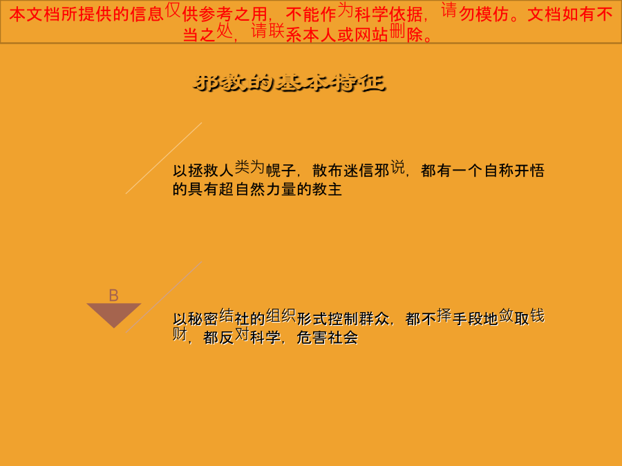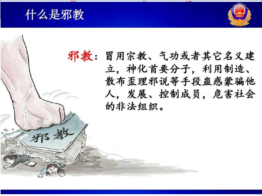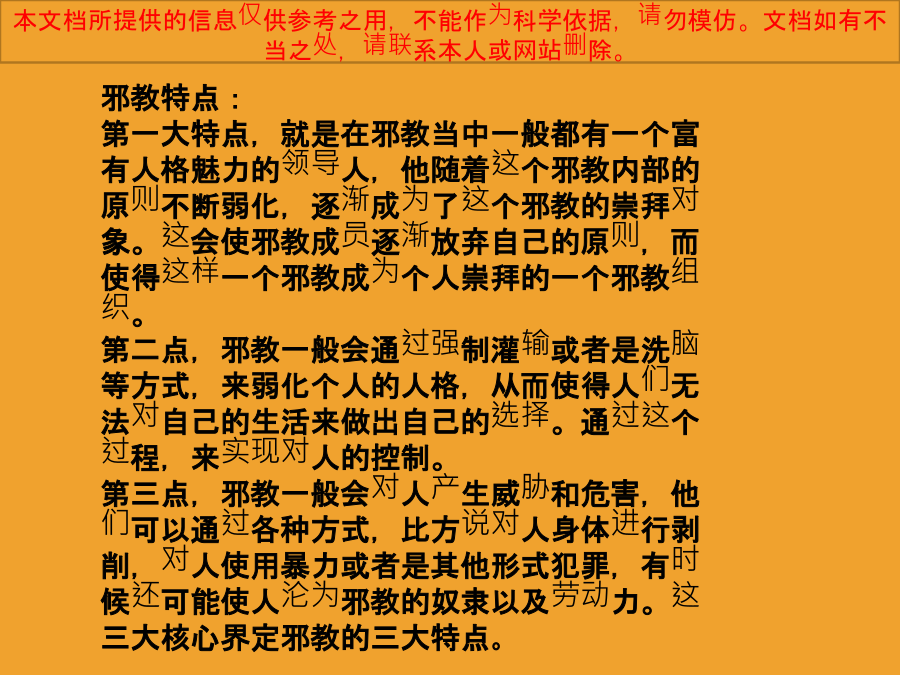 邪教是人类社会的一大公害,是当今世界各国政府面领的一个严重问题,已经成为构建社会的最不安全的因素之一,为此广大师生要了解“法轮功”等邪教组织带来的危害。一、邪教及其基本特征邪教的基本特征邪教特点: 第一大特点,就是在邪教当中一般都有一个富有人格魅力的领导人,他随着这个邪教内部的原则不断弱化,逐渐成为了这个邪教的崇拜对象。这会使邪教成员逐渐放弃自己的原则,而使得这样一个邪教成为个人崇拜的一个邪教组织。 第二点,邪教一般会通过强制灌输或者是洗脑等方式,来弱化个人的人格,从而使得人们无法对自己的生活来做出自己的选择。通过这个过程,来实现对人的控制。 第三点,邪教一般会对人产生威胁和危害,他们可以通过各种方式,比方说对人身体进行剥削,对人使用暴力或者是其他形式犯罪,有时候还可能使人沦为邪教的奴隶以及劳动力。这三大核心界定邪教的三大特点。互联网确实存在这样一种可能性,就是帮助邪教在网上进行成员招募,而且这样一个活动可以触及到地球上任何一个人,他们可以在网上发布一些视频,同时也可以通过网络大会的形式与成员进行沟通,也可以通过一些其他的社交手段与全体成员进行联络。 如果是在与邪教沟通的话,那么他们在家中就可以进行。 比方说现在的伊斯兰国,他们就是通过这样一种线上的形式,完成了对成员的招募。然后再将这些成员输送到叙利亚,在那里的营地对他们进行洗脑和灌输。一般来讲,这些邪教还主要通过在网上以一种欺骗的形式对人进行洗脑和招募。二、邪教的骗人手法14三、邪教的危害1.残害群众生命2.骗取群众的血汗钱3.破坏生产、生活秩序4.煽动闹事,扰乱治安秩序有的邪教组织还以绑架、伤害等手段威胁信徒不得背叛组织,否则就予以断手脚、割耳朵、坐地牢、毒死等报复,严重扰乱了社会治安秩序。东北就有两名农民,因为想退出邪教组织“实际神”,结果被该组织派人残忍的杀害。在邪教组织内部,因争权夺利、利益不均引发的争斗也时有发生,有的甚至致死人命。某省“被立王”骨干董先保为了争夺权位,在跟随另一个比他职位高的骨干吴远南传教途中,趁其不备,用事先准备好的菜刀对吴连砍数十刀,最后把他的头砍了下来。董先保因此被依法判处死刑,在当地引起很大反响。5.危害国家政权更为严重的是一些邪教组织已经在我们基层设立组织、任命骨干,妄图取代基层政权。他们有目的地拉拢党员团员和基层于部,使一些地方的基层党政组织被侵蚀。如在一些邪教活动突出的地方,邪教的基层骨干替代了基层干部,我们的干部召集群众开会需要事先经过邪教的同意,甚至有的村包括党员干部,全都参加邪教的聚会,问题非常严重。“实际神”也开始关注村级选举,鼓动一些群众将选票投给这些邪教分子“中意”的侯选人,企图逐步参与村级事务管理,扩大邪教的影响。在农村,还有一些地方,由于邪教操纵一定数量的群众,村干部担心选举时会失去选票,对邪教的非法活动睁一只眼闭一只眼,有的甚至为邪教组织的聚会活动提供场所,客观上助长了邪教发展蔓延的势头。四、邪教的受害者四川农民、“法轮功”修炼者汤志华迷信所谓“世界末日”的说教,1999年8月11日凌晨3点多钟,竟用菜刀将其两岁多的儿子的生殖器割下,然后又自残。经医院抢救,汤志华父子的病情已基本稳定,图为抢救手术现场。1月23日,正当人们准备喜迎蛇年春节的时候,7名来自河南省开封市的“法轮功”痴迷者却在李洪志妖言的蛊惑下,在北京天安门广场点火自焚,两人被及时发现制止,一人当场被烧死,4人严重灼伤,面目全非。图为自焚者之一,中央音乐学院19岁的学生陈果,自焚后的她已经面目全非。陈果的母亲郝惠君,参与了天安门广场自焚事件。刘思影,女,河南省开封市苹果园小学五年级学生。2001年元月23日下午,在痴迷“法轮功”的妈妈带领下,来到天安门广场点燃身上的汽油自焚。母亲刘春玲烧死,刘思影全身烧伤达40%。虽经北京积水潭医院全力抢救,终因伤势严重,刘思影于2001年3月17日不幸身亡。刘思影的母亲刘春玲,参与了天安门广场自焚事件。同学们,看了这么多,相信大家也对邪教有所了解了吧。邪教犯下了这么多罪行,遭到了许多人的厌恶和排斥。接下来,我们就来了解如何抵制邪教。五、邪教的预防方法六、我国处理邪教违法行为的法律依据A七、揭示现存的几大主要邪教种类一些国内外邪教组织:2001年农历除夕,正当千家万户欢欢喜喜迎接新世纪第一个春节的时候,几名“法轮功”痴迷者在李洪志“升天圆满”妖言的蛊惑下,在天安门广场制造了一起骇人听闻的自焚事件。14时41分,人民英雄纪念碑东北侧,一名50多岁男子面向西北方向,盘腿“打坐”,并将一个绿色塑料瓶中的液体不断往身上浇。随后,一团烈焰从这名男子身上喷出,窜起一道浓烟。烈焰中,这名男子声嘶力竭地叫喊:“宇宙大法是世人必经之法。”几分钟后,人民英雄纪念碑北面,4名相距不远的女子点燃了身上的汽油,火苗几乎同时窜起,借着冬日的寒