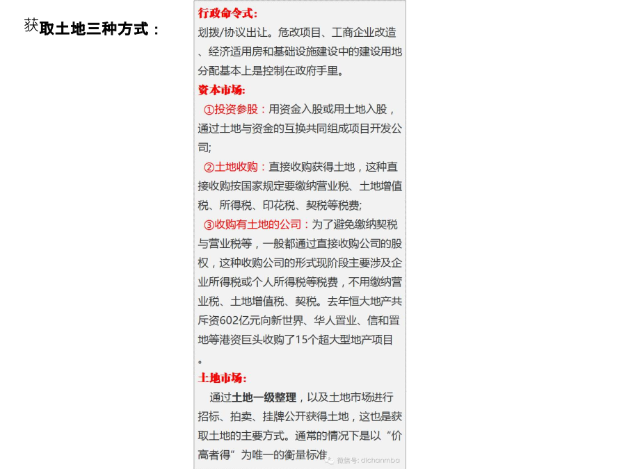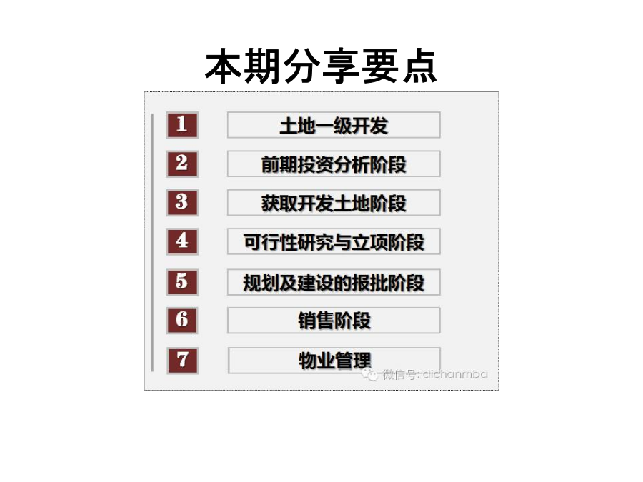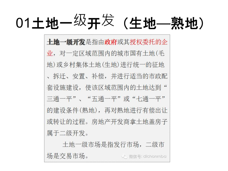 房地产全生命周期的开发流程(版)本期分享要点01土地一级开发(生地—熟地)获取土地三种方式:一、土地一级开发模式二、土地一级开发内容三、一级土地开发运作流程02前期投资分析阶段一、项目初步可行性调查二、项目投资分析及其作用03获取开发土地阶段土地取得方式土地取得方式:招标土地取得方式:拍卖土地取得方式:挂牌土地转让(收购)旧城改造变更宗地地籍调查04可行性研究与立项阶段(一)可行性研究的内容(二)可行性研究的作用对项目的批准文件立项阶段各部门职责:05规划及建设的报批阶段1、施工前准备阶段2、项目施工阶段3、项目竣工验收阶段五证之一: 《建设用地规划许可证》五证之二: 《国有土地使用权证》五证之三: 《建设工程规划许可证》五证之四: 《建设工程施工许可证》五证之五: 《商品房预售许可证》06销售阶段商品房销售的注意事项企业视角的销售关键节点控制企业视角的销售关键节点控制07物业管理一、物业管理法律程序二、物业管理阶段的相关税费房地产项目成本构成房地产项目成本构成房地产项目成本构成房地产项目成本构成房地产项目成本构成房地产项目成本构成房地产项目成本构成